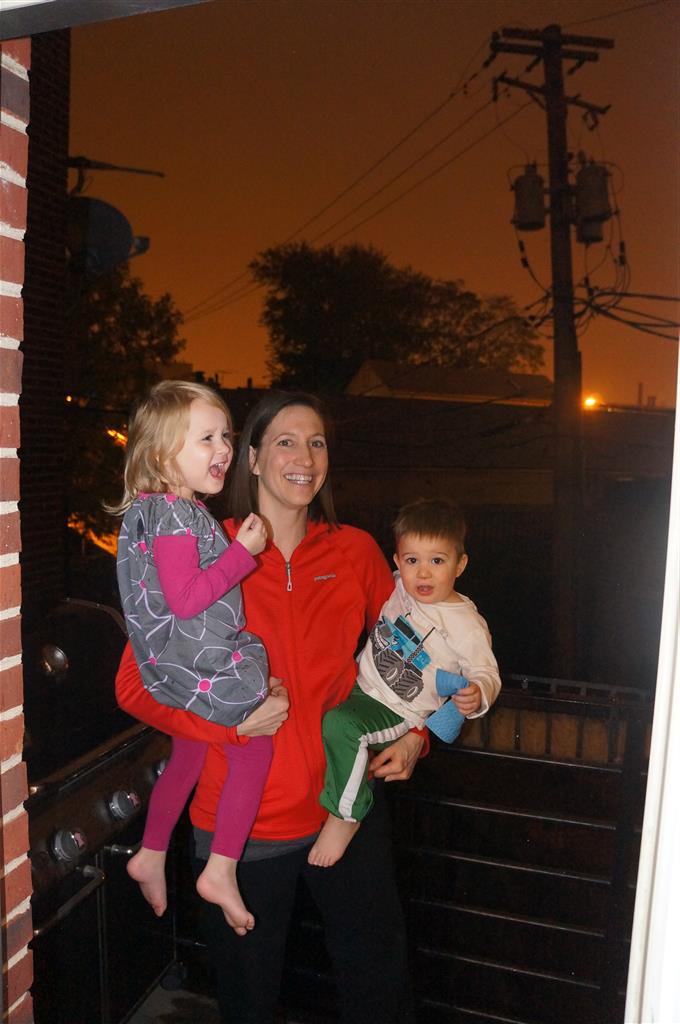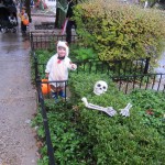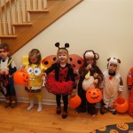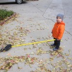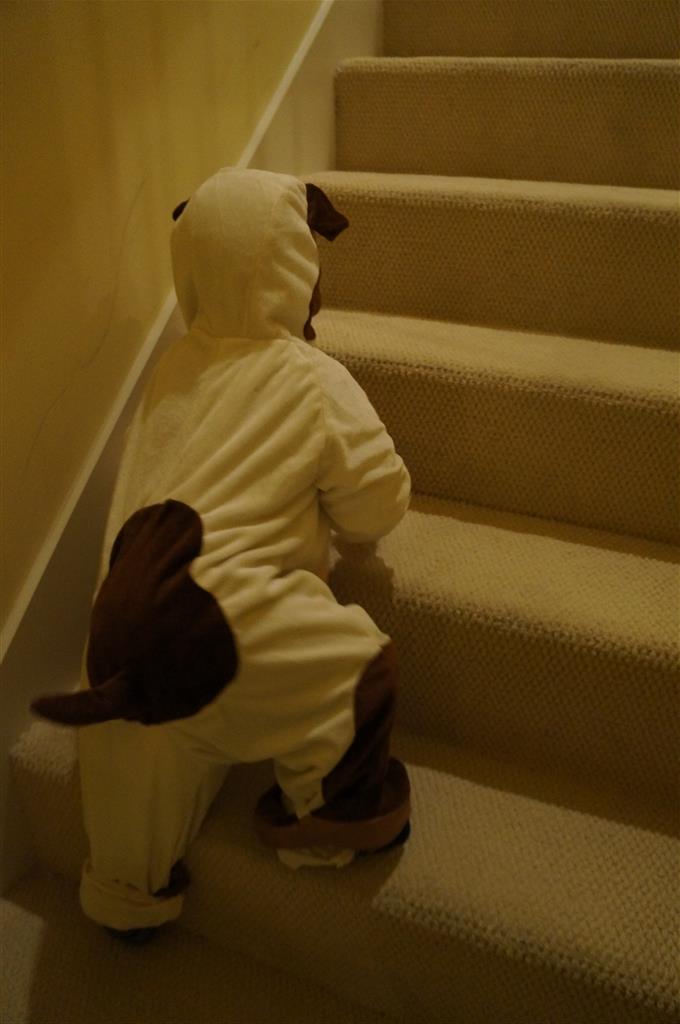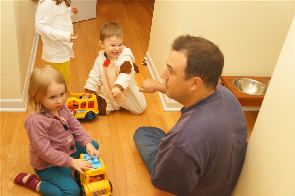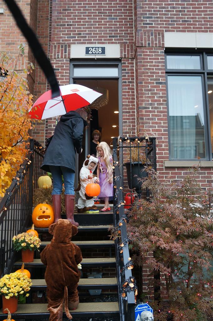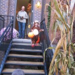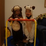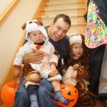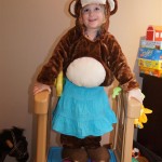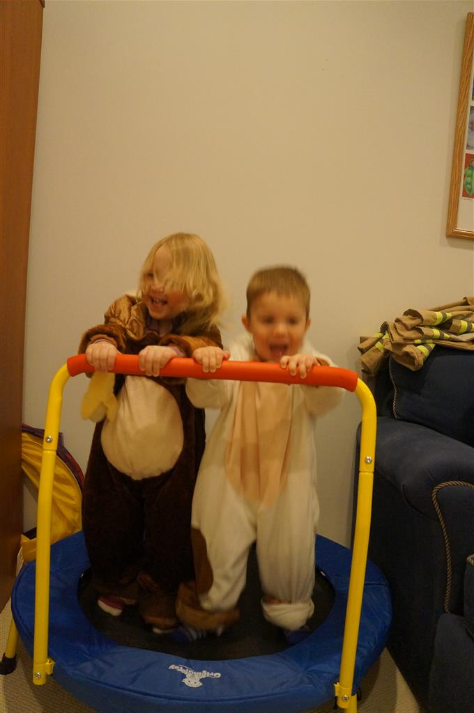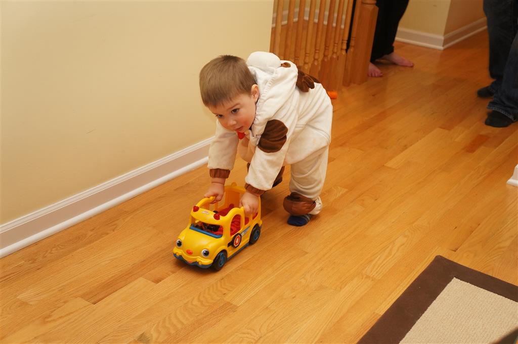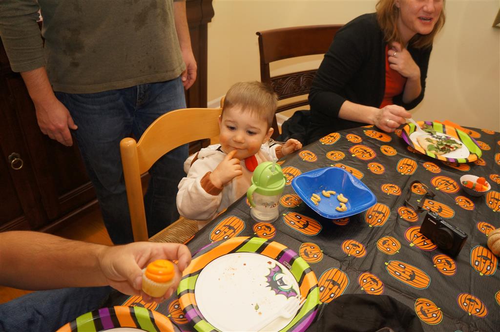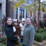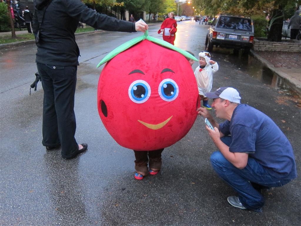 Eleanor and Henry had a great Halloween this week! They both dressed up to match their favorite stuffed friends – Eleanor a monkey and Henry a dog. Henry wasn’t sold on the whole costume at first, but the event grew on him. By the time we were actually trick or treating, he was having a blast walking in the rain and stomping in puddles. Going up to actual houses for candy was a side activity at best, and was eventually completely abandoned in favor of more puddle stomping. Eleanor had fun going up to houses for a little while, but the half flight of stairs up to each door eventually wore on her, and she lost interest as well. She did love Uncle B’s costume – and drew quite a crowd as she dragged it through the street. Who knew monkeys liked apples? Henry had quite the love hate relationship with the apple, he couldn’t stop looking at it while Uncle B was inside, but for every step that Uncle B took, Henry took one to maintain his distance, and much preferred to have Dad between the two.