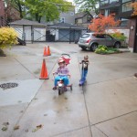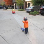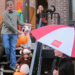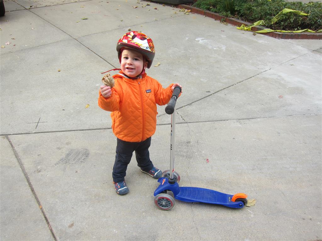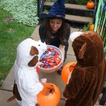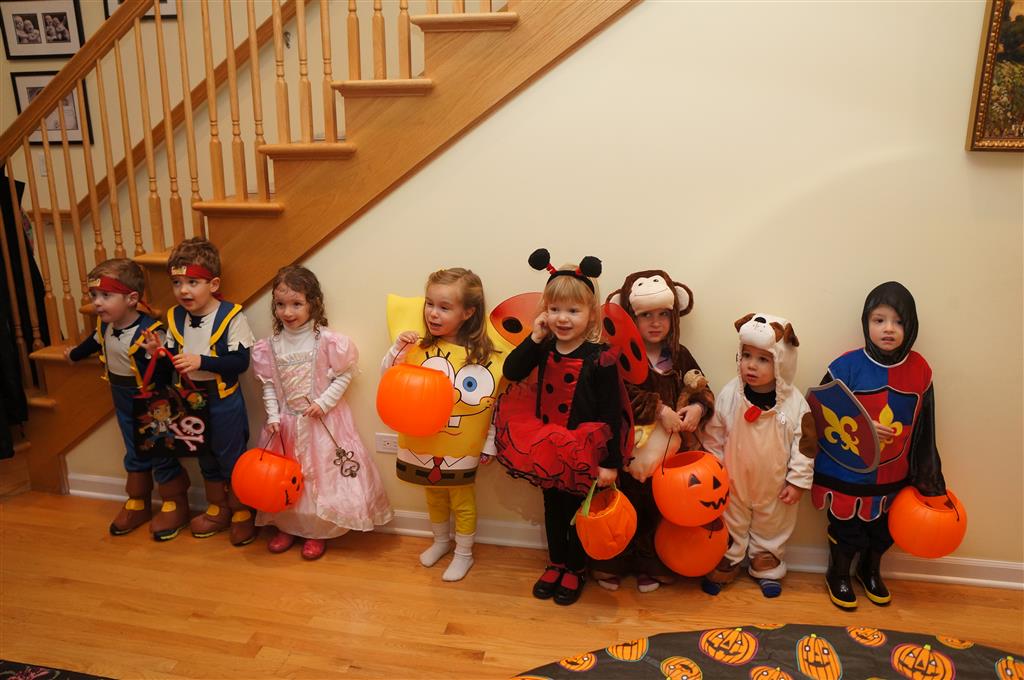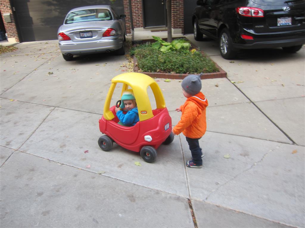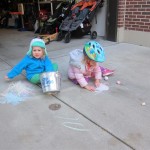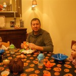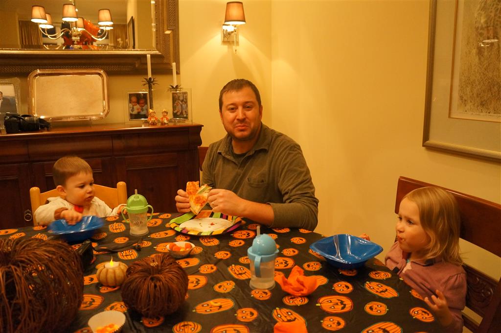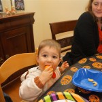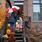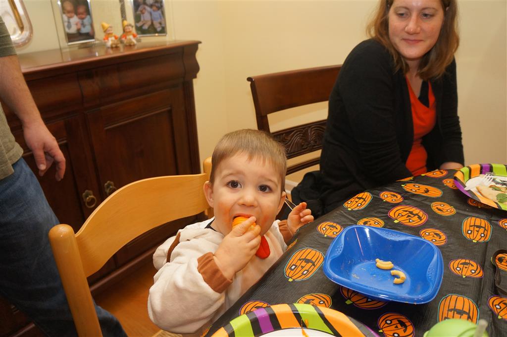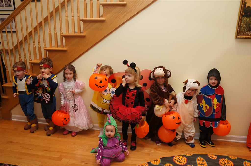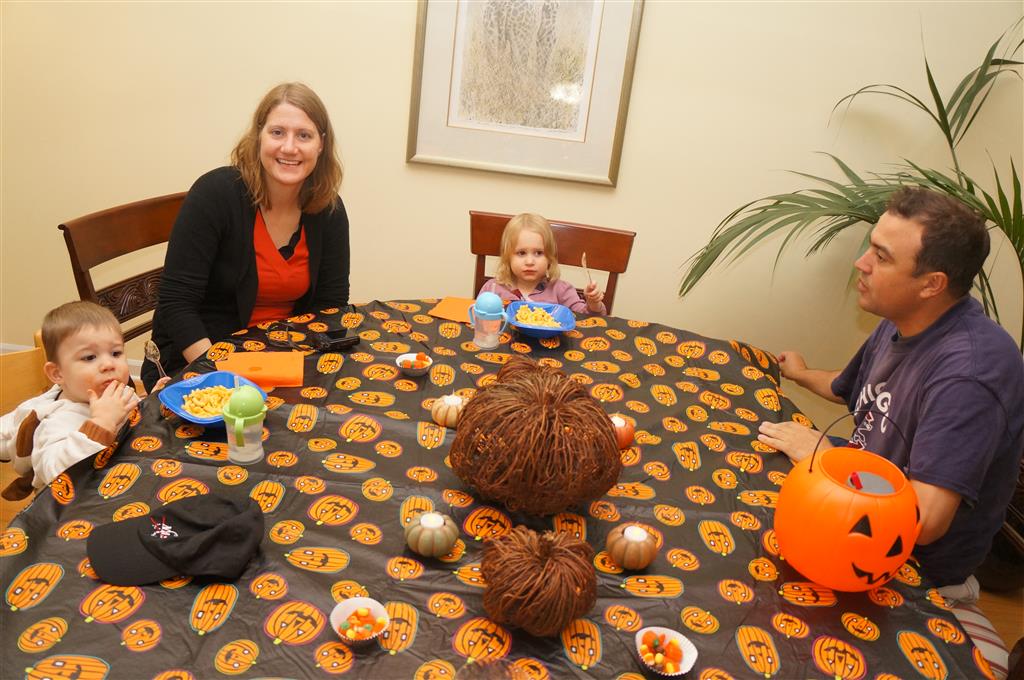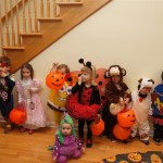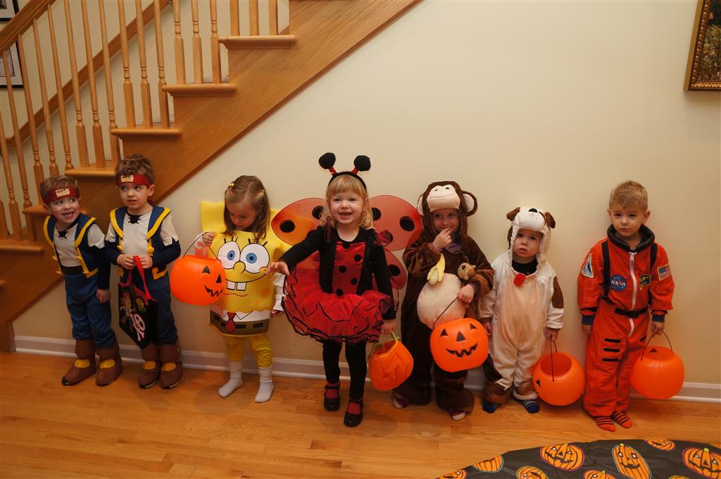 Eleanor and Henry had a great Halloween this week! They both dressed up to match their favorite stuffed friends – Eleanor a monkey and Henry a dog. Henry wasn’t sold on the whole costume at first, but the event grew on him. By the time we were actually trick or treating, he was having a blast walking in the rain and stomping in puddles. Going up to actual houses for candy was a side activity at best, and was eventually completely abandoned in favor of more puddle stomping. Eleanor had fun going up to houses for a little while, but the half flight of stairs up to each door eventually wore on her, and she lost interest as well. She did love Uncle B’s costume – and drew quite a crowd as she dragged it through the street. Who knew monkeys liked apples? Henry had quite the love hate relationship with the apple, he couldn’t stop looking at it while Uncle B was inside, but for every step that Uncle B took, Henry took one to maintain his distance, and much preferred to have Dad between the two.