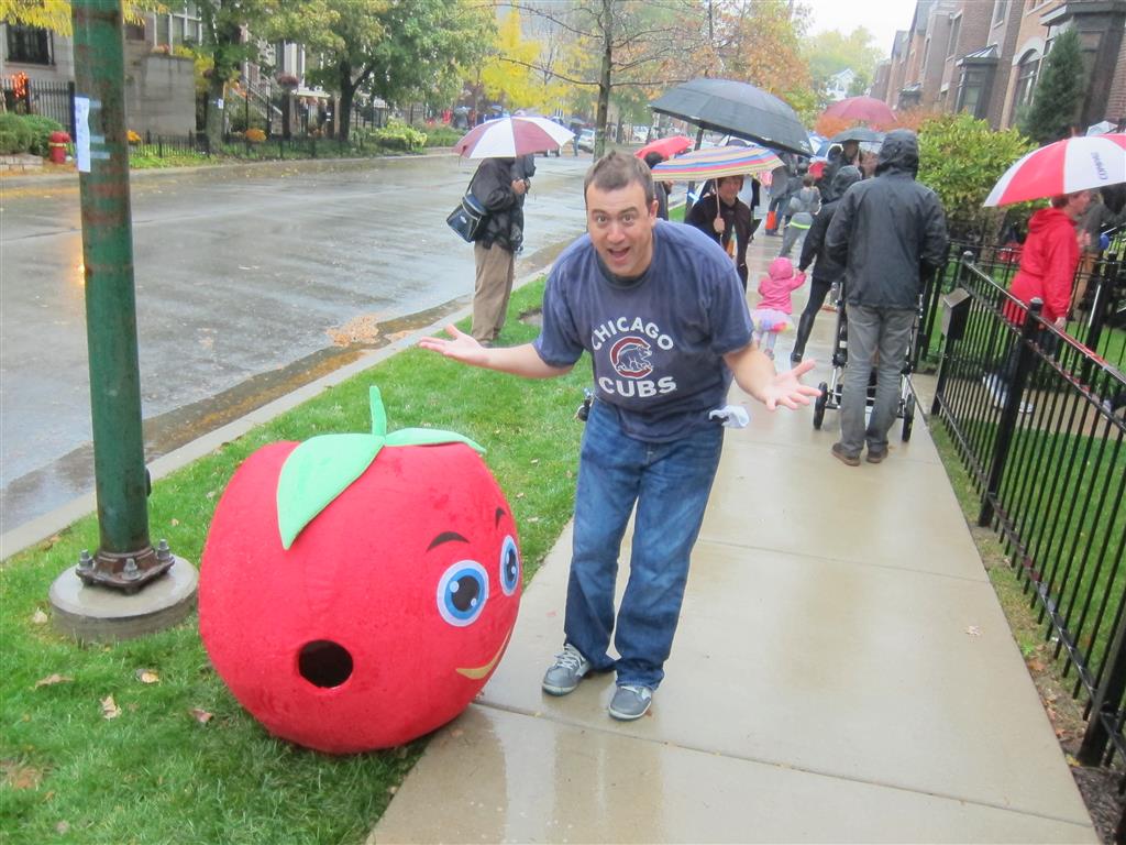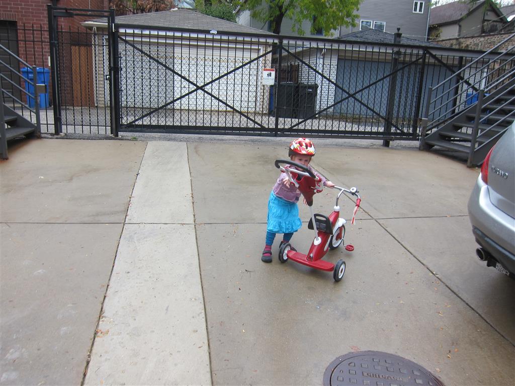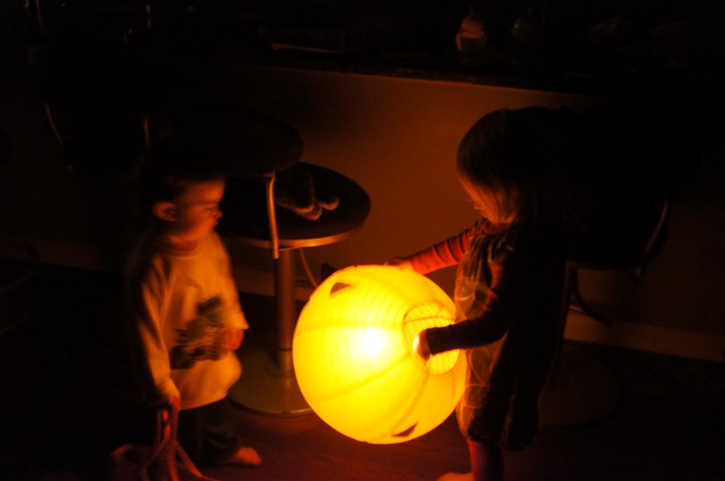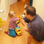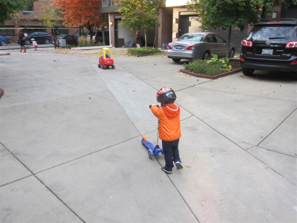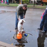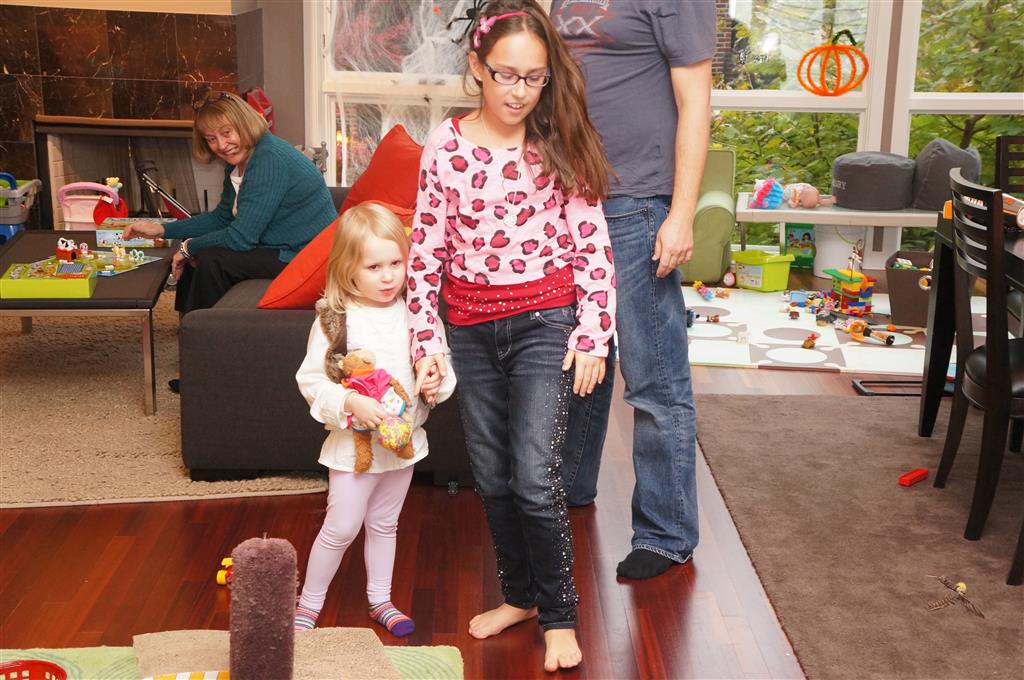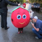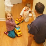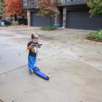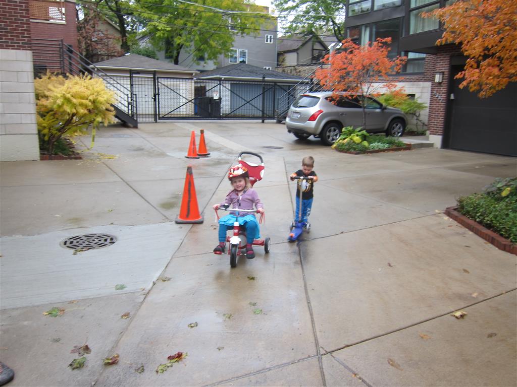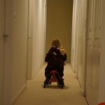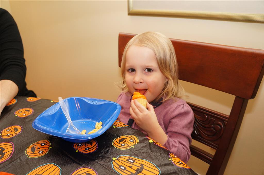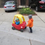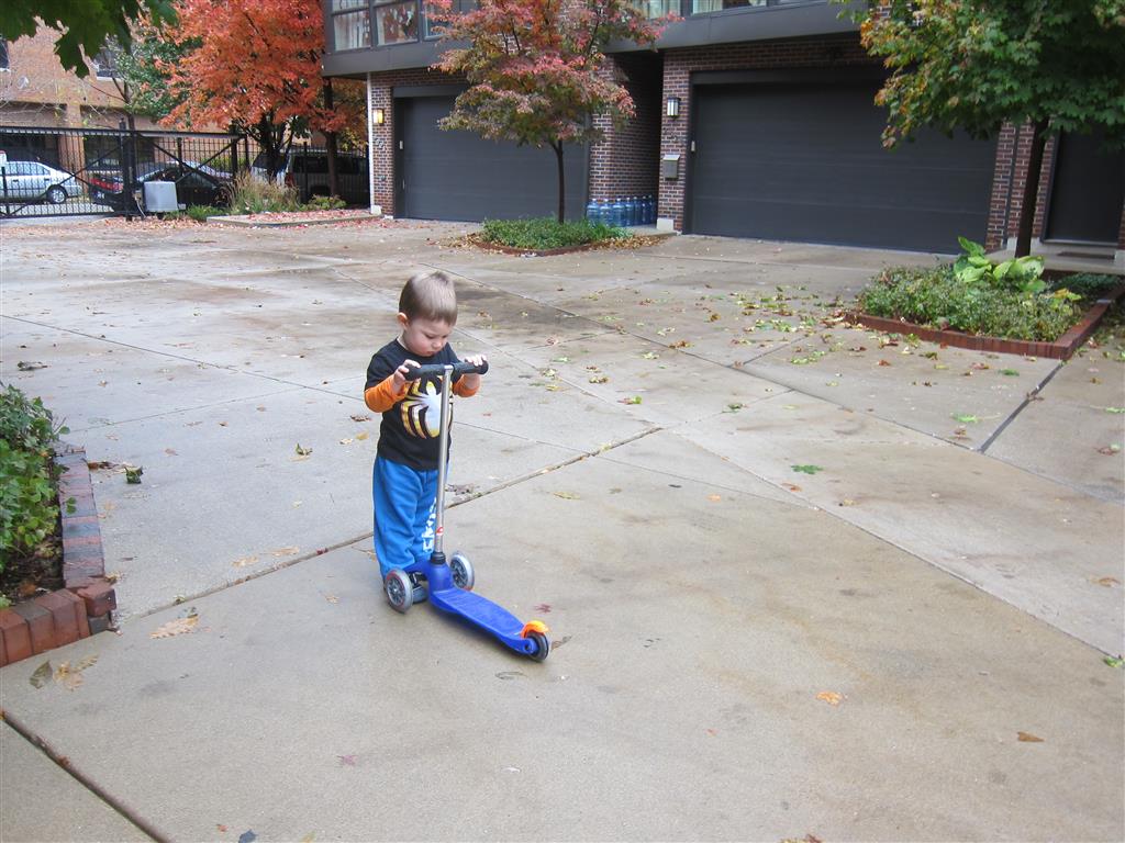 Eleanor and Henry had a great Halloween this week! They both dressed up to match their favorite stuffed friends – Eleanor a monkey and Henry a dog. Henry wasn’t sold on the whole costume at first, but the event grew on him. By the time we were actually trick or treating, he was having a blast walking in the rain and stomping in puddles. Going up to actual houses for candy was a side activity at best, and was eventually completely abandoned in favor of more puddle stomping. Eleanor had fun going up to houses for a little while, but the half flight of stairs up to each door eventually wore on her, and she lost interest as well. She did love Uncle B’s costume – and drew quite a crowd as she dragged it through the street. Who knew monkeys liked apples? Henry had quite the love hate relationship with the apple, he couldn’t stop looking at it while Uncle B was inside, but for every step that Uncle B took, Henry took one to maintain his distance, and much preferred to have Dad between the two.