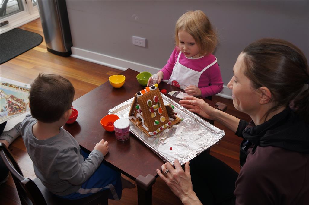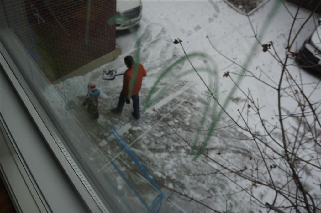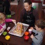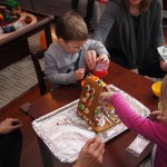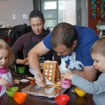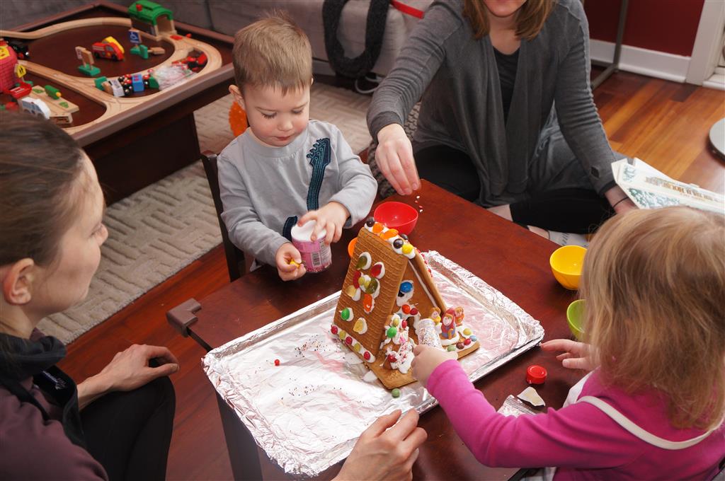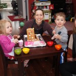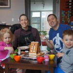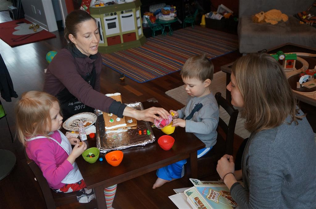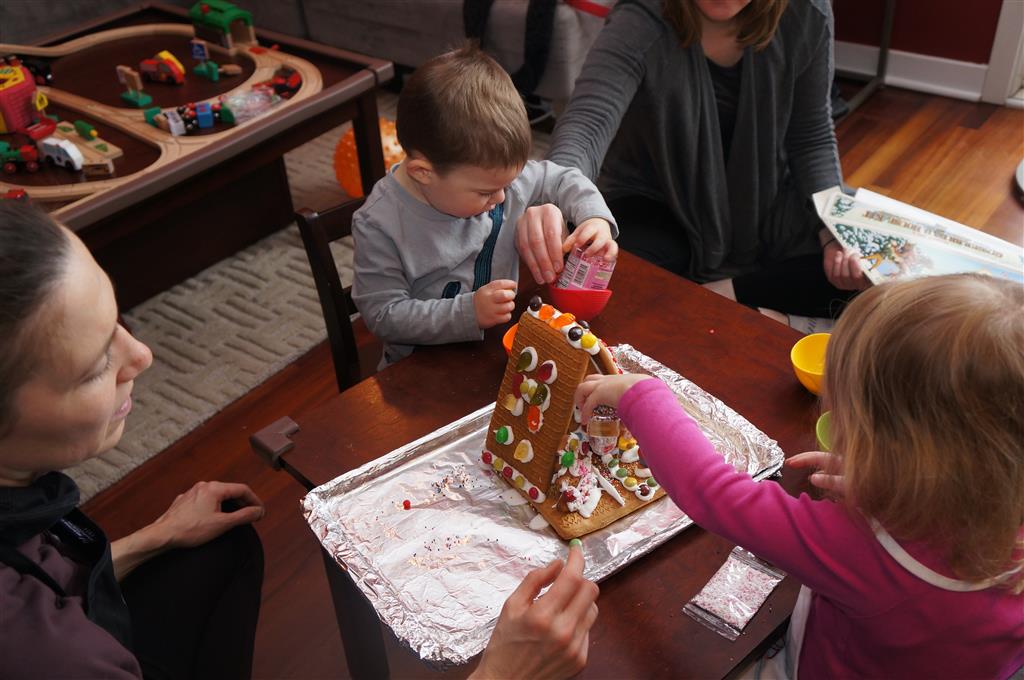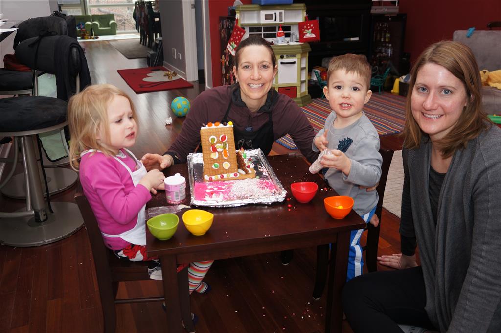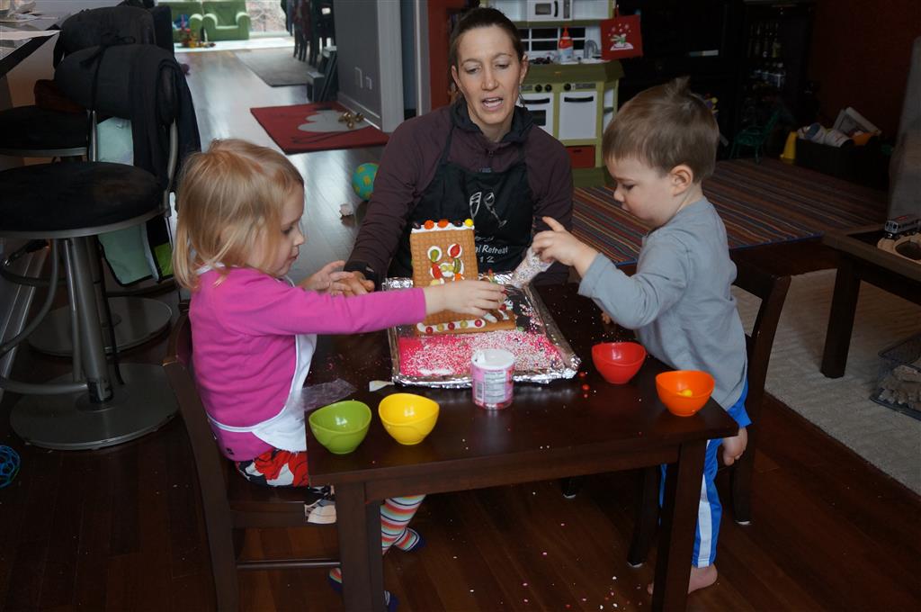 On Sunday Lala brought over a gingerbread house for us to build – and we were much more successful than last year! Mom got out some sprinkles left over from valentines day and Eleanor and Henry had a blast making a fantastic mess! We got some snow on Sunday afternoon, and Eleanor and Dad had fun recreating “Cat in the Hat Comes Back” on the driveway while Henry was napping.