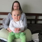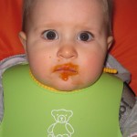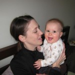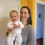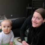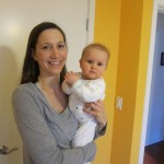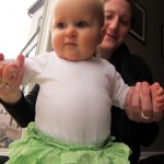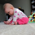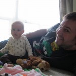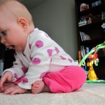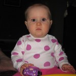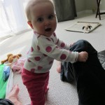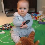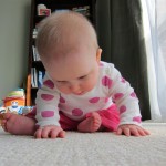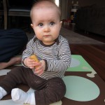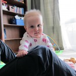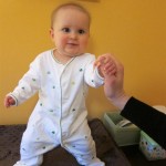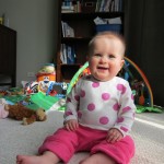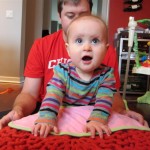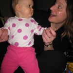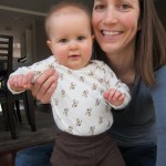 Amy and I decided to give Eleanor a “teething biscuit” on Friday – I’d never seen one before and upon inspection I would say it most resembles a dog biscuit. She loved it – wouldn’t let it go for fifteen minutes, and proceeded to completely soil her outfit with biscuit remnants (see photo evidence below). We have been working on our standing a lot this week – but so far we haven’t had more that a second or two of free standing. She is quite good at standing against the couch and then pushing back into Daddy’s lap. It seems sometimes falling is more fun than standing :)