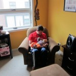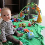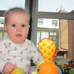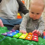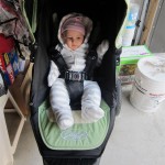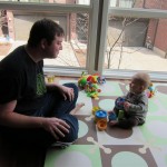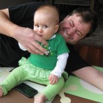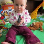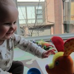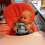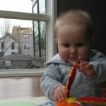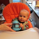 Eleanor has a few of new tricks that she has mastered this week. The first is clapping. Not only can she clap, but she will clap when you say the words “clap clap clap” (most of the time, anyway…) and received complements at music class for her clapping ability. Of course at playgroup after we bragged about this new skill she refused to clap at all the appropriate moments in the songs – but finally redeemed Amy and I by clapping for no particular reason at the end. She did come through on cue during both of her family “skypes”. Ellie has also mastered picking up a puff (a Cheerio type thing) from her high chair tray and navigating it into her mouth. The process takes 30-45 seconds and includes moving the puff from one hand to the other an average of 2.5 times before it is properly positioned for drop off (See video). Finally, we have learned to hold our sippy cup all by ourselves, and even tilt it up to the mouth for a drink.