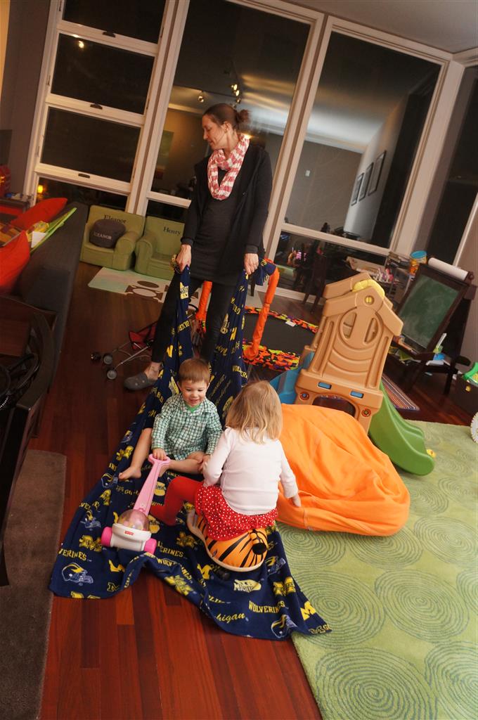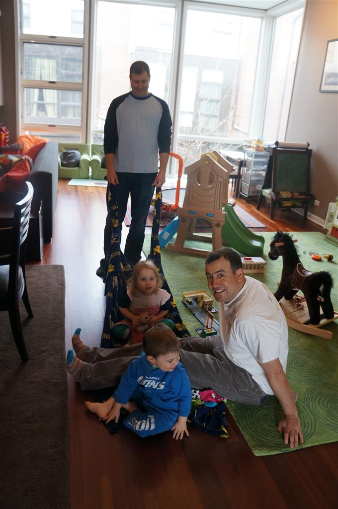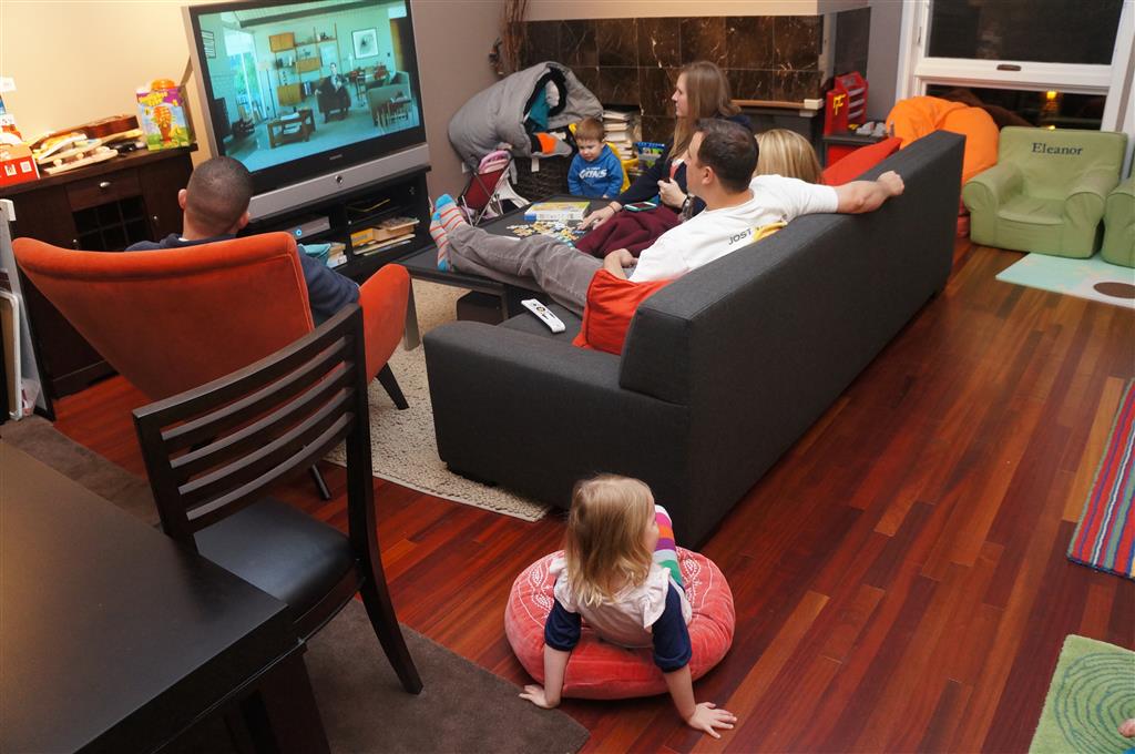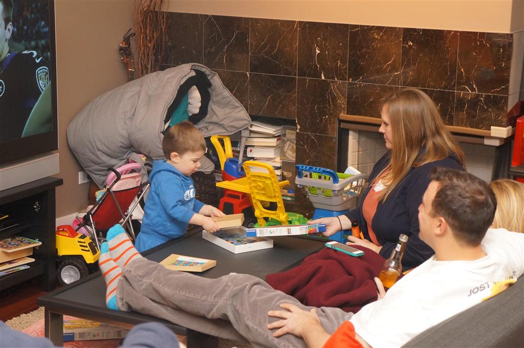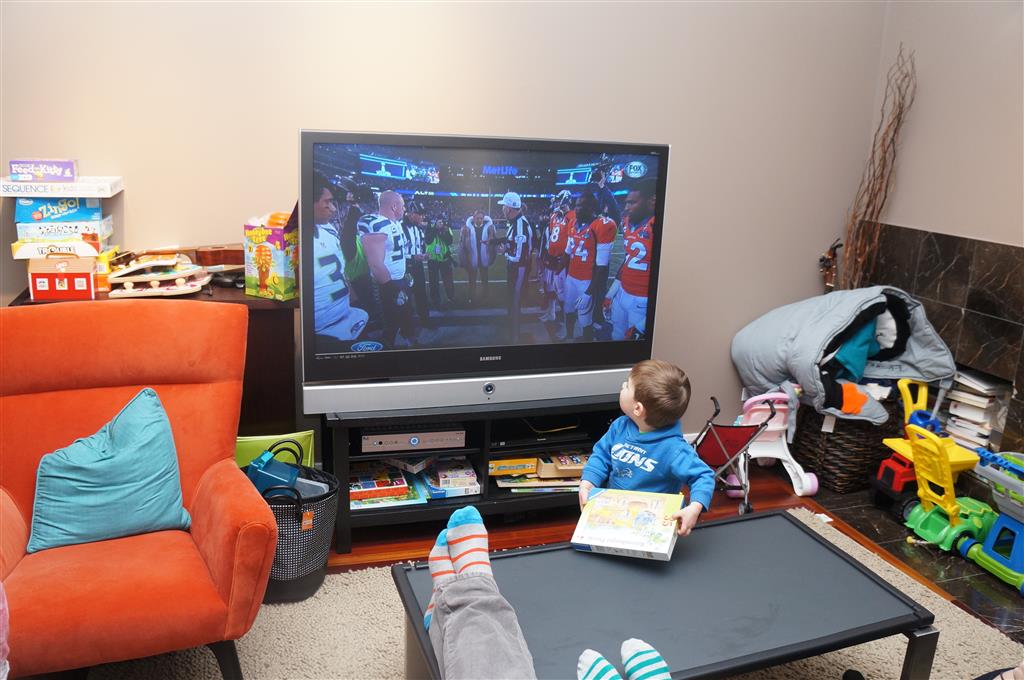 This week Eleanor and Henry hosted a Super Bowl party complete with three different kinds of chili. They were both very confused when we turned on the TVs and everyone started watching. Eleanor liked the fireworks during the team introductions but was confused as to why everyone was running. While watching the opening kickoff she shouted “Pushing…they are all pushing! We don’t do that.” Ha! I tried to explain that football was one exception to the pushing rule. During the first quarter she pronounced that she was “All done with football” and didn’t watch any more. While I was putting her to bed I told her that it was a once a year event, and she explained that she didn’t want to watch any more football ever. She did admit that she enjoyed all the fun food that went along with it. Henry was less interested in the game, and he mostly played with toys while stealing a quick glace at the game every now and again.