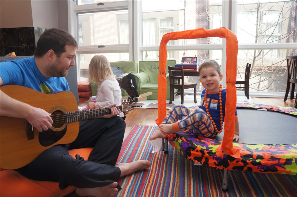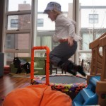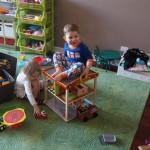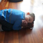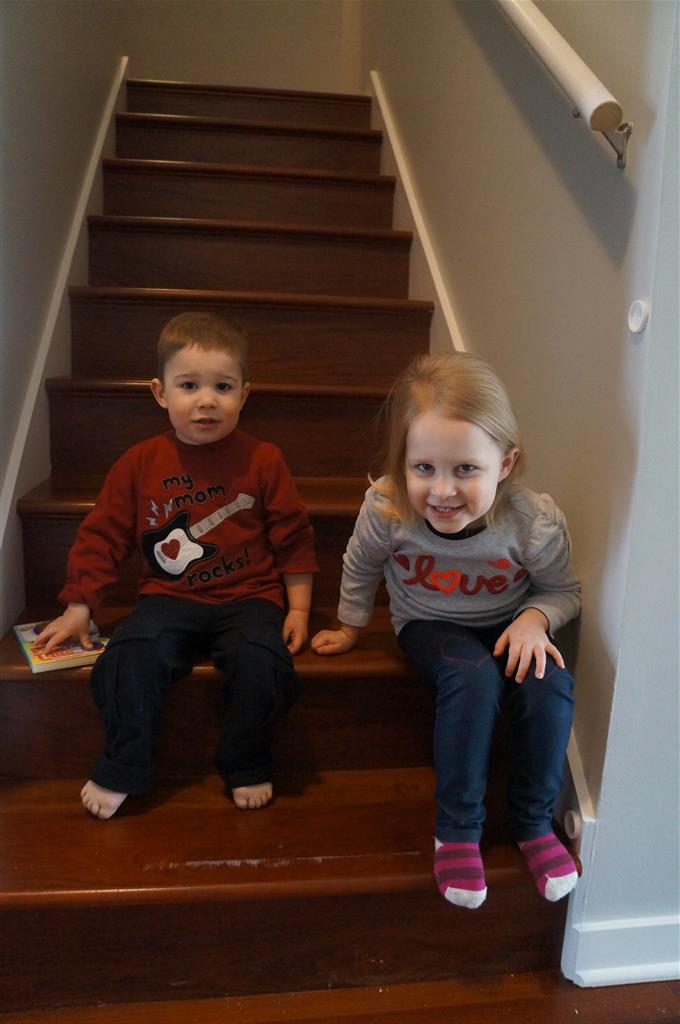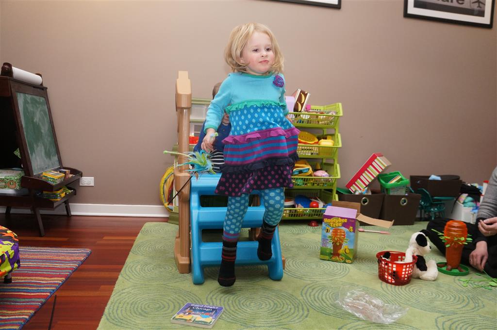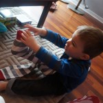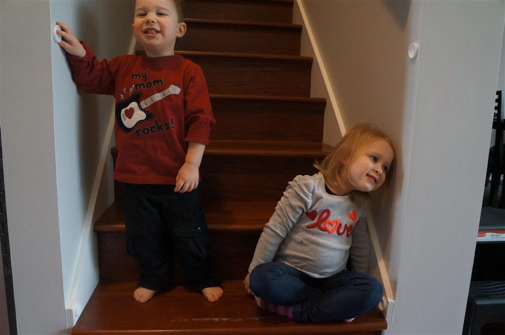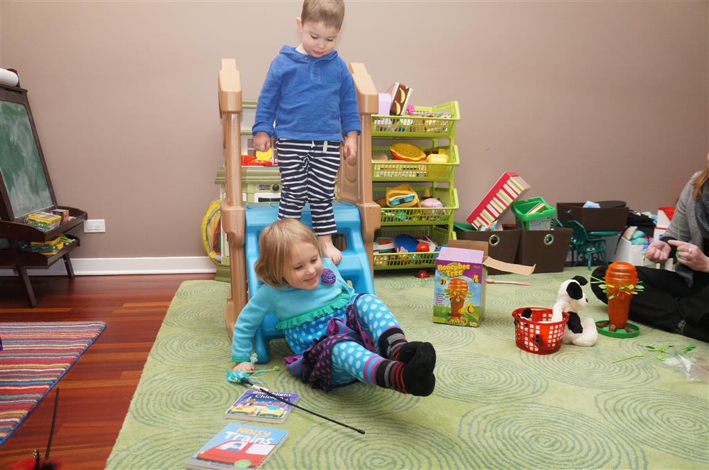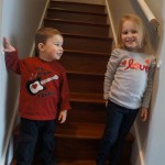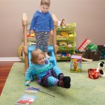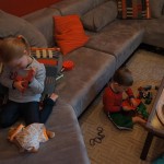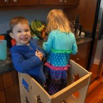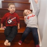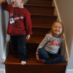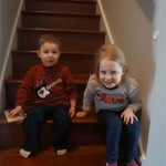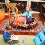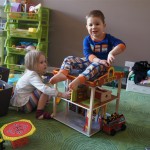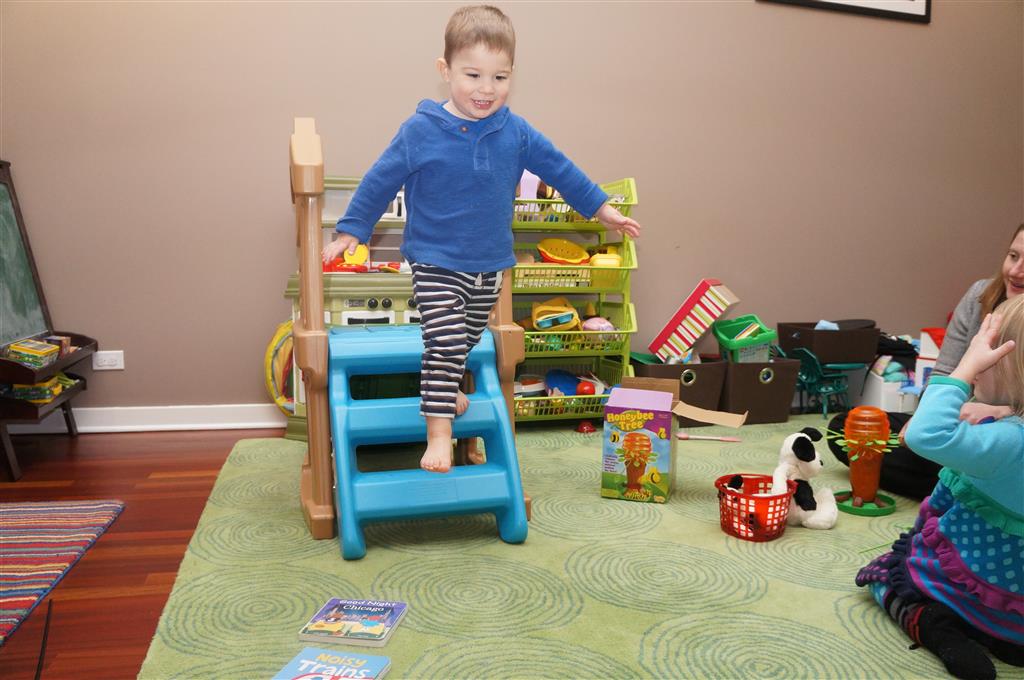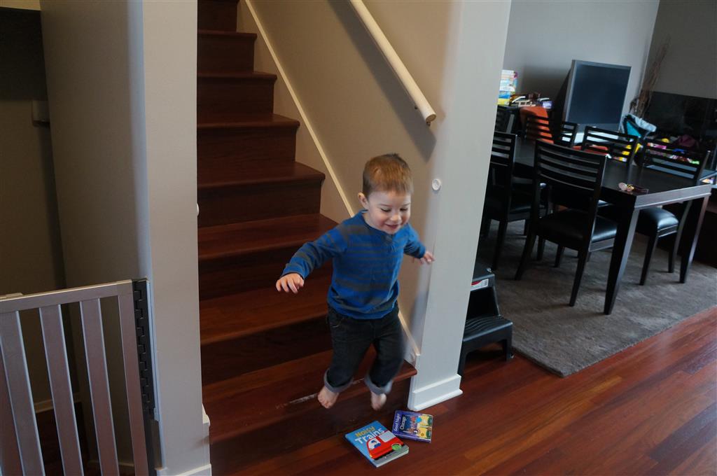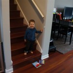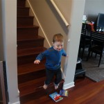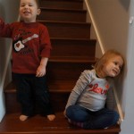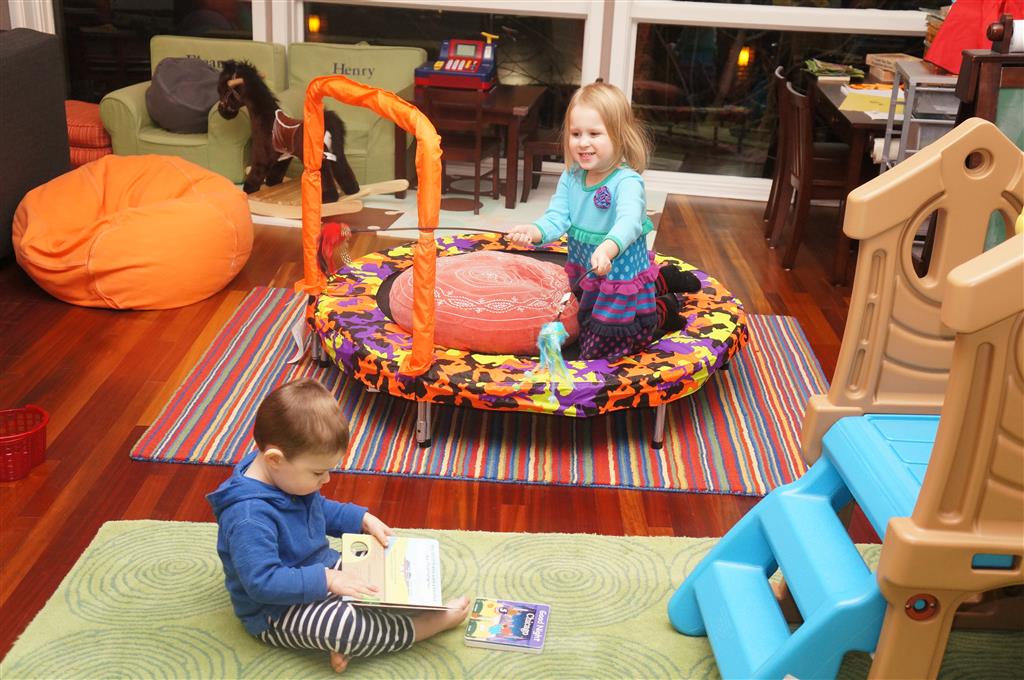 We took down the gate this week to the stairs going up to the top floor – and Henry and Eleanor have really been enjoying jumping off the bottom step. Ever since the trampoline arrived, both Eleanor and Henry have been very into jumping, and in addition to the bottom step they also jump off both sides of the slide. Eleanor was trying to work up the courage to jump off the top of the slide, and finally decided to pull the beanbag over and jump into that – Great Fun! Henry tried the big plunge off the top of the slide, but forgot to jump and had a bit of a face plant – poor guy. He was undeterred though, and continues to push the limits of his jumping abilities.