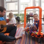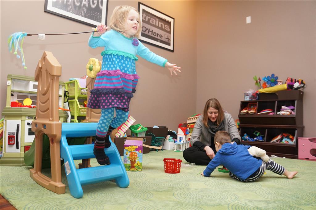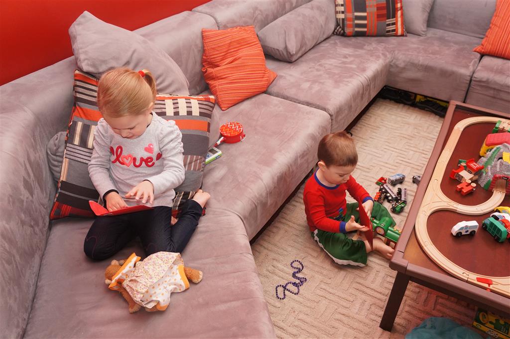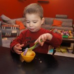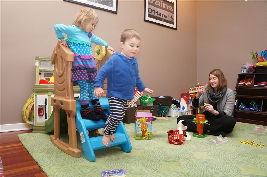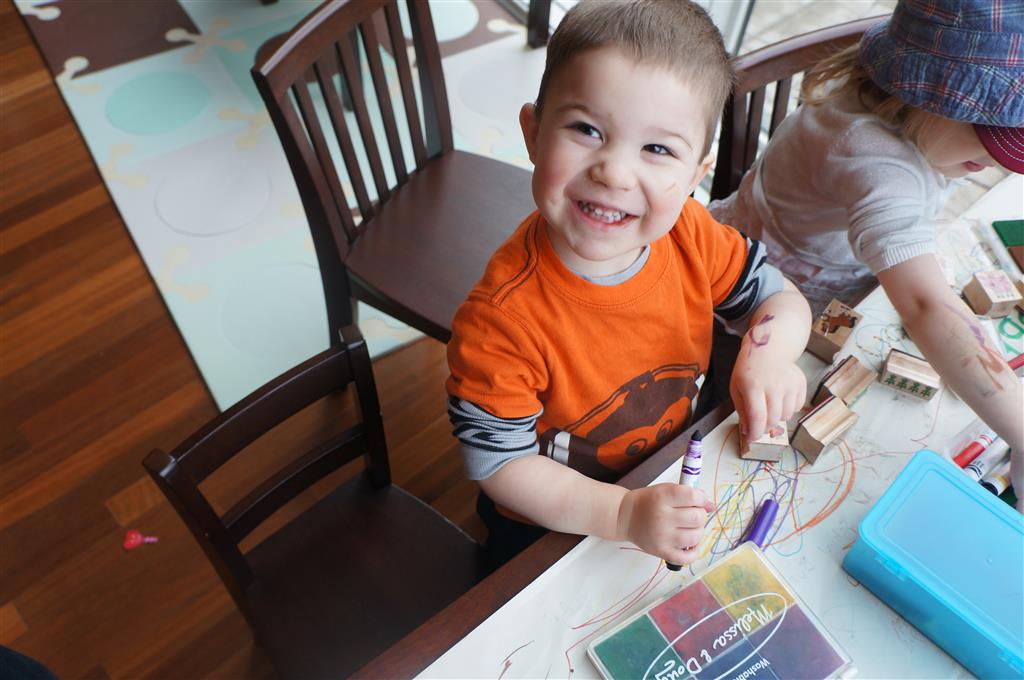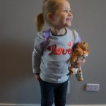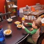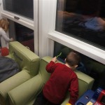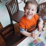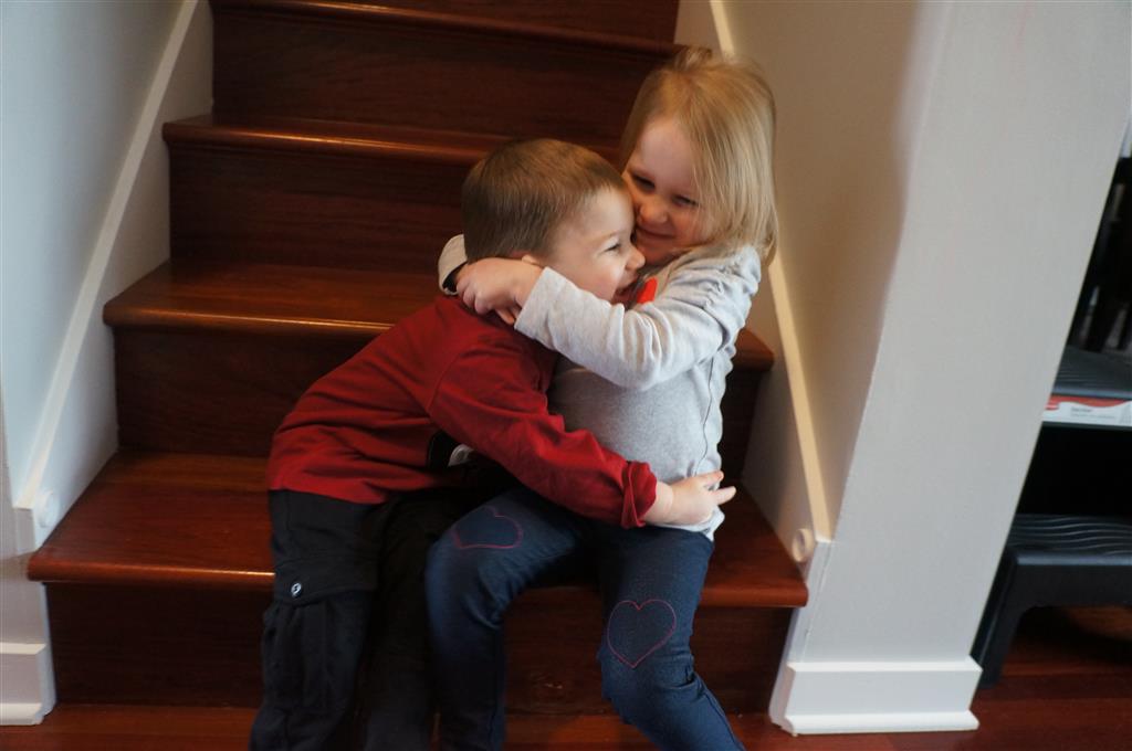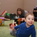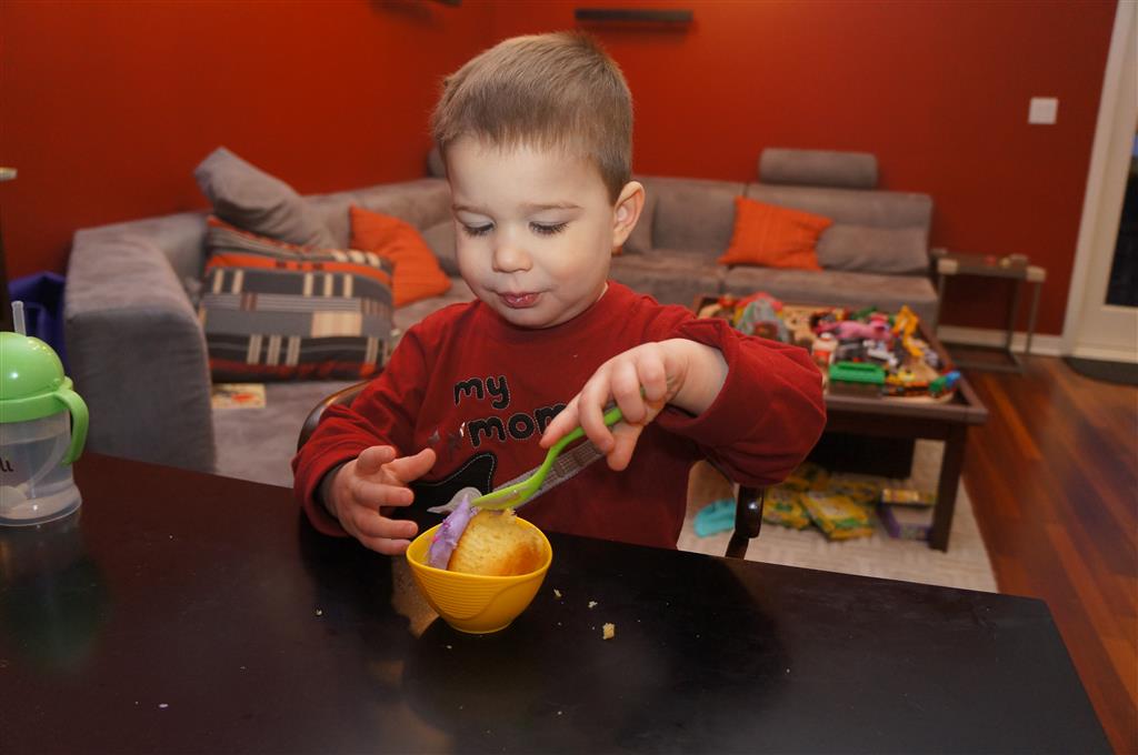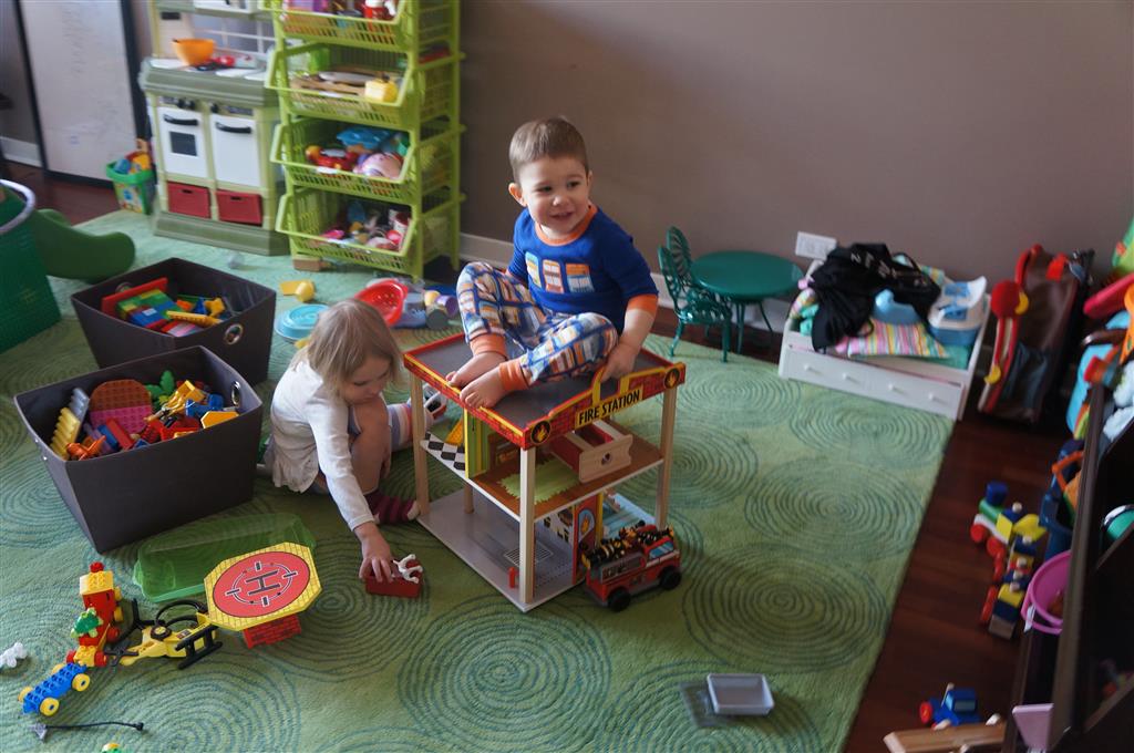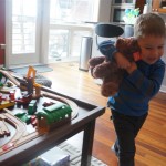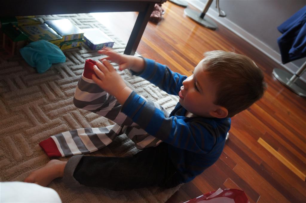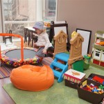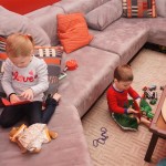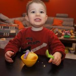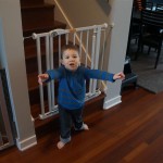 We took down the gate this week to the stairs going up to the top floor – and Henry and Eleanor have really been enjoying jumping off the bottom step. Ever since the trampoline arrived, both Eleanor and Henry have been very into jumping, and in addition to the bottom step they also jump off both sides of the slide. Eleanor was trying to work up the courage to jump off the top of the slide, and finally decided to pull the beanbag over and jump into that – Great Fun! Henry tried the big plunge off the top of the slide, but forgot to jump and had a bit of a face plant – poor guy. He was undeterred though, and continues to push the limits of his jumping abilities.