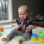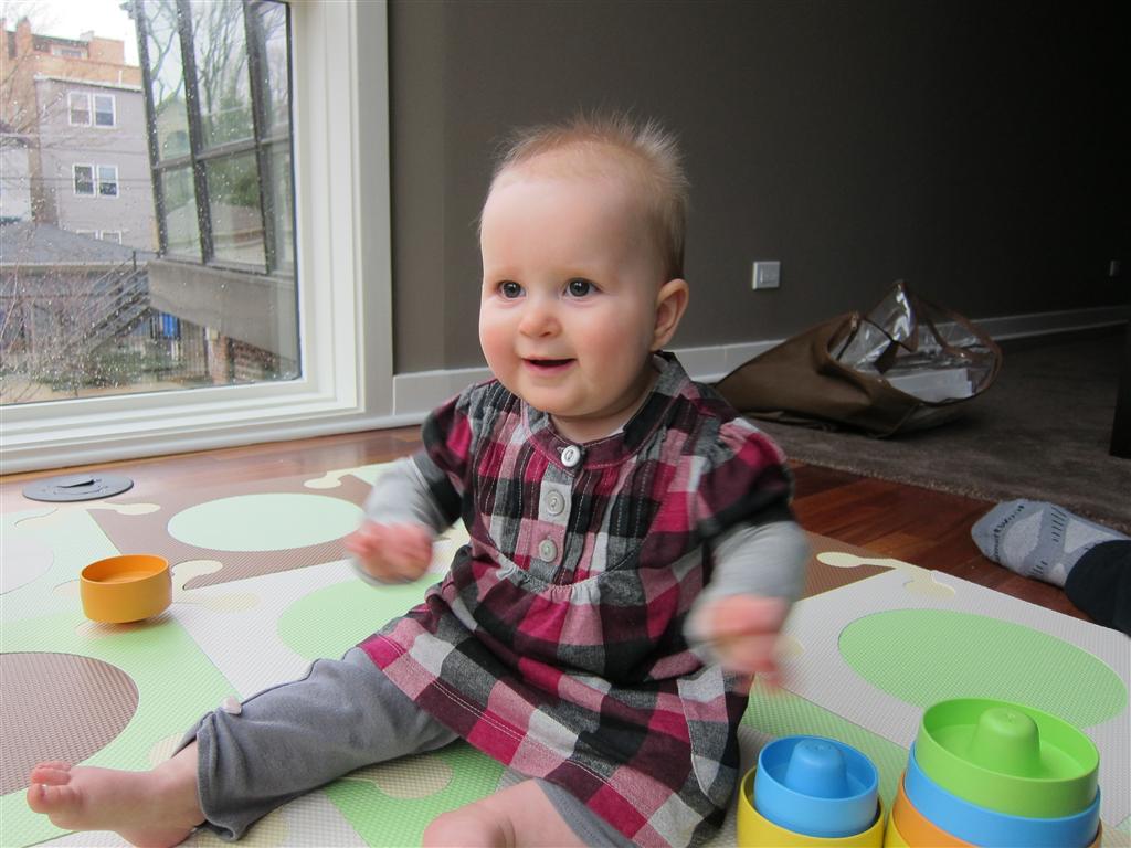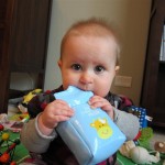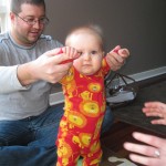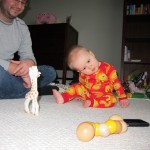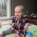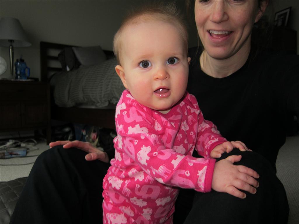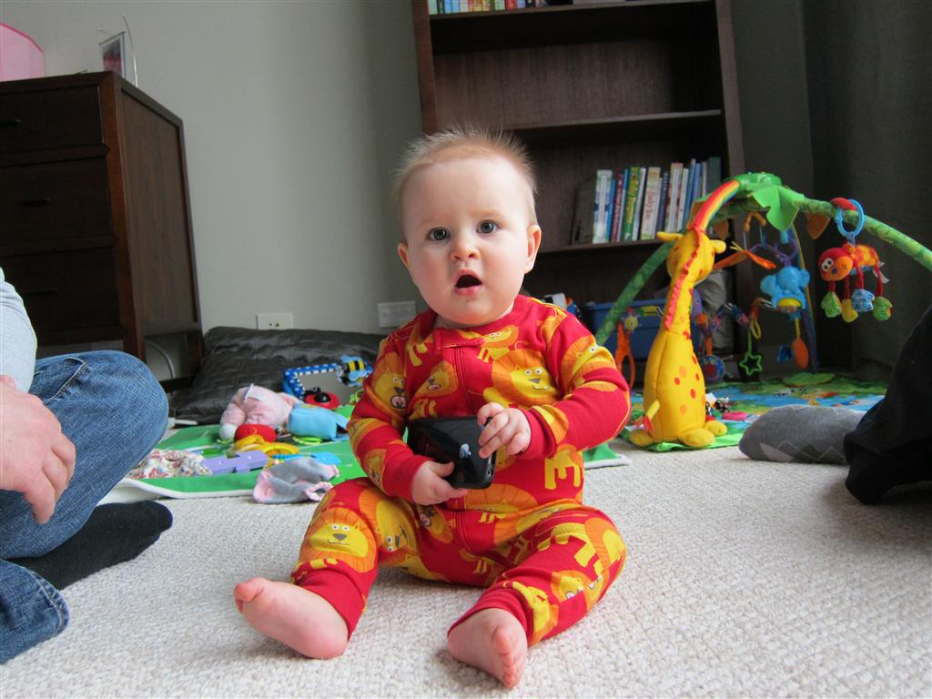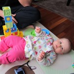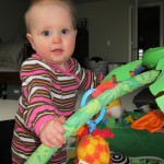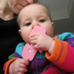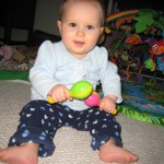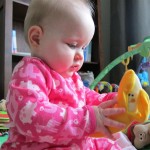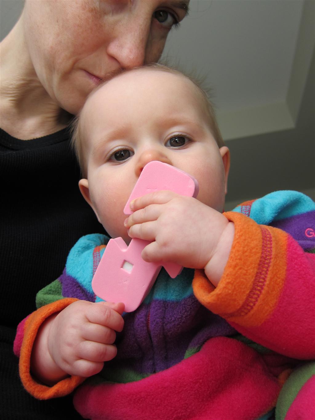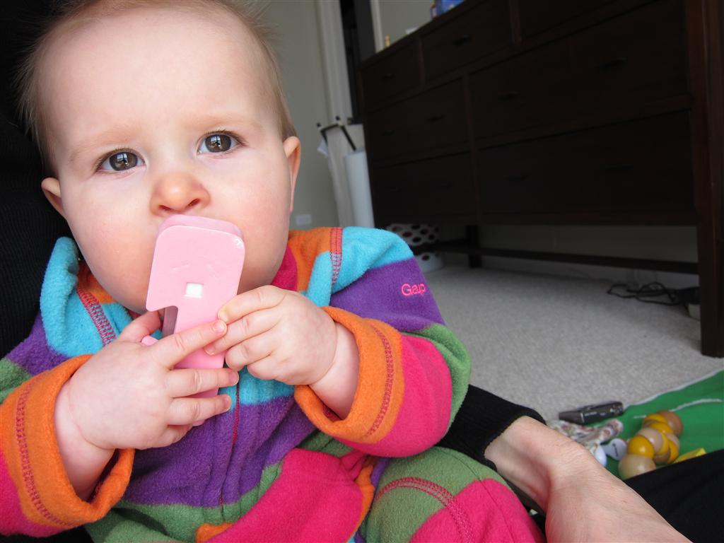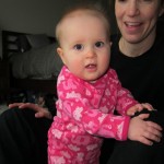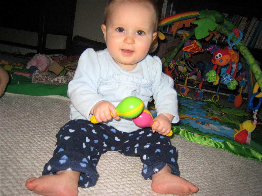 This week Eleanor is cutting two more teeth – up top next to her front two. Unfortunately, they are quite hard to see, so we don’t have any pictures to share, but maybe next week.   Eleanor has also been working on her musical talents with her new instruments, especially the maracas.  Her standing is also improving on a daily basis, with some stints of 8-10 seconds of “free standing”.  Not much progress on the crawling front – the only time Ellie willingly gets on her tummy is when the iPhone is within rolling distance.  Why do kids love phones?
