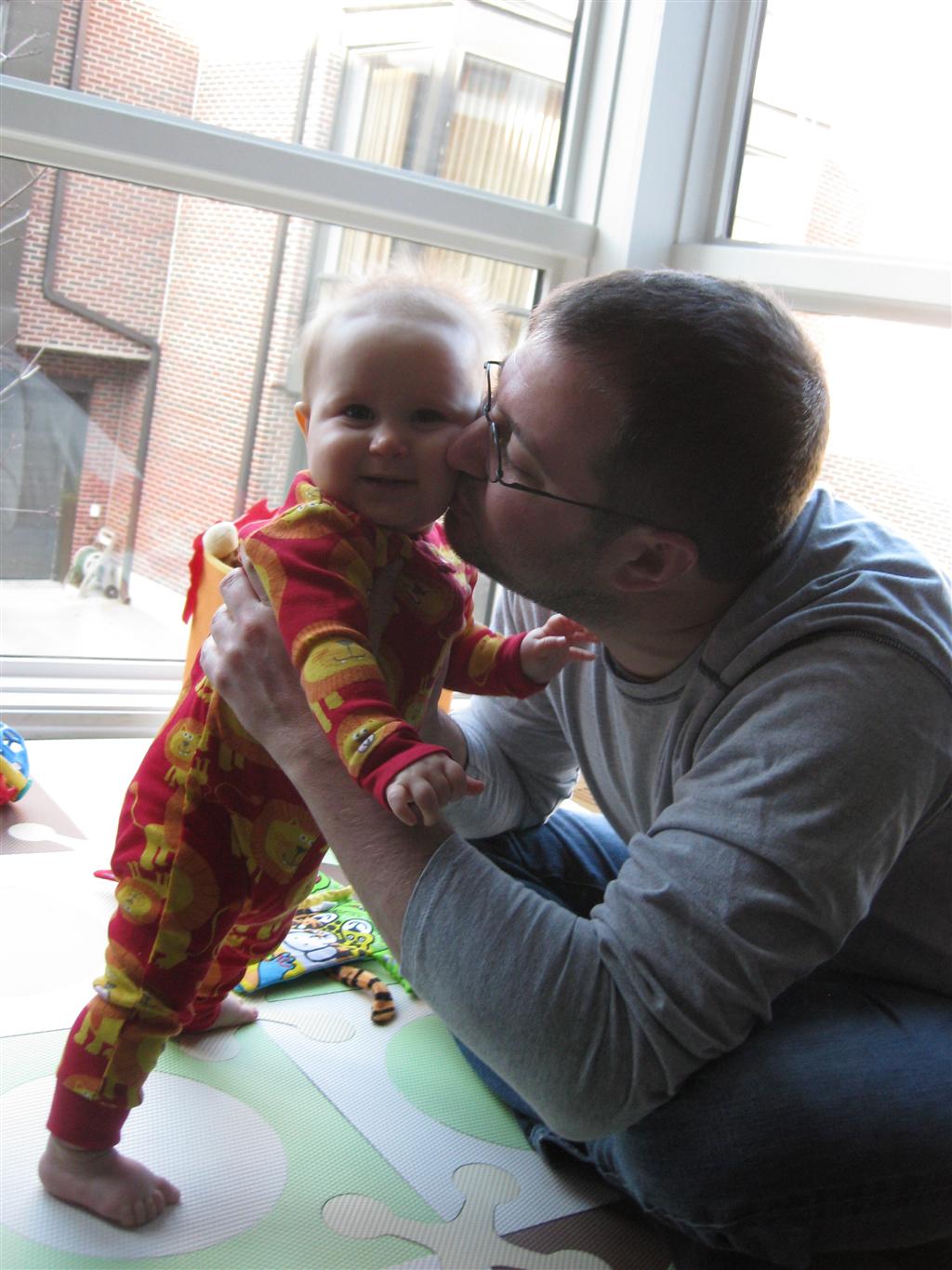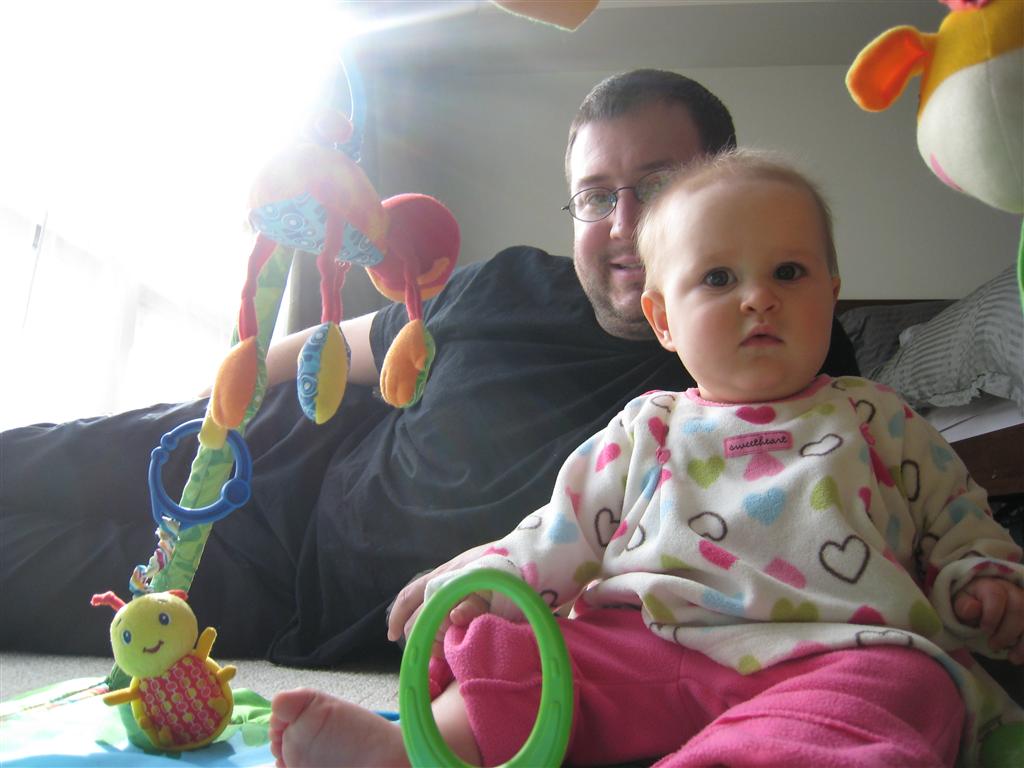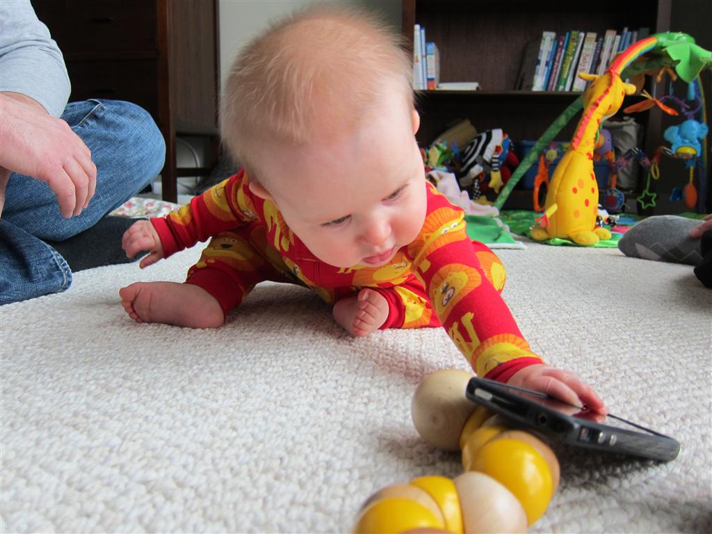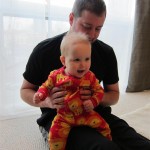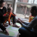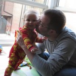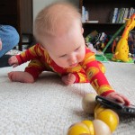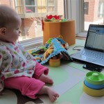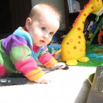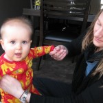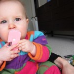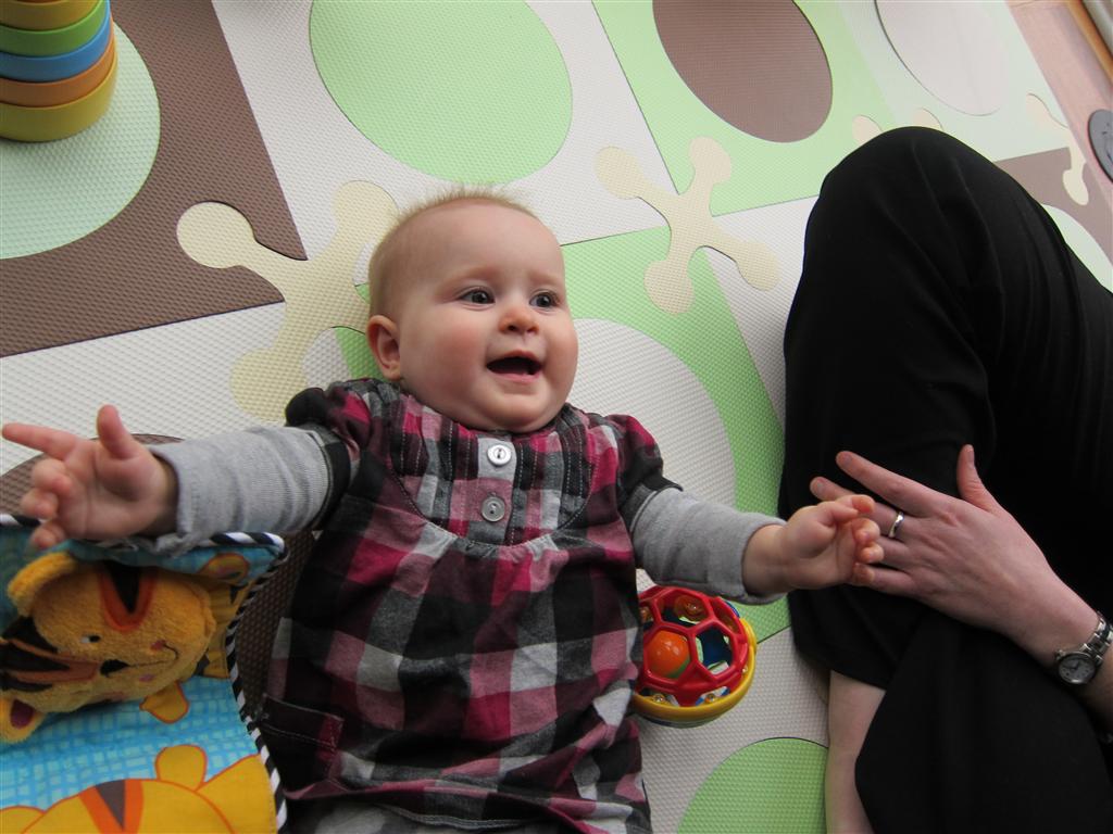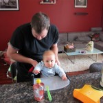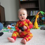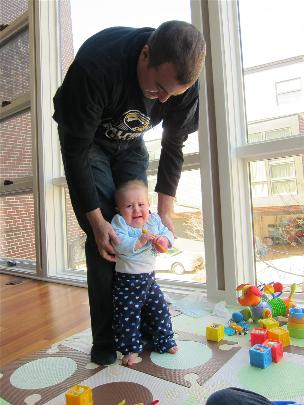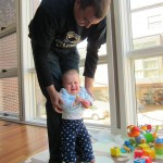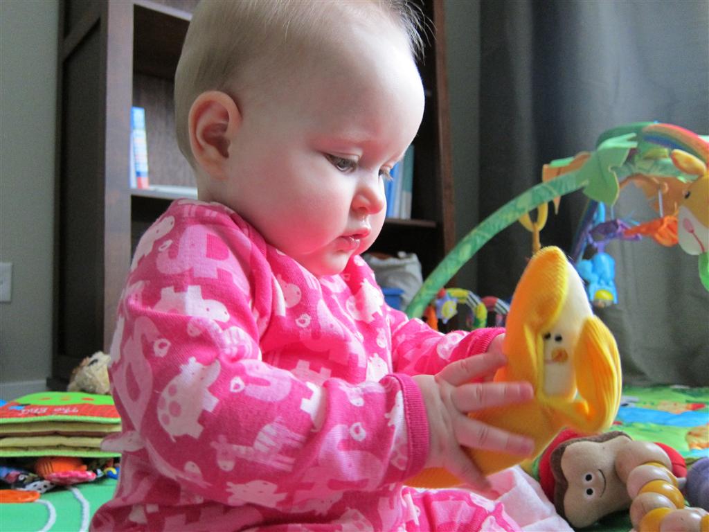 This week Eleanor is cutting two more teeth – up top next to her front two. Unfortunately, they are quite hard to see, so we don’t have any pictures to share, but maybe next week.   Eleanor has also been working on her musical talents with her new instruments, especially the maracas.  Her standing is also improving on a daily basis, with some stints of 8-10 seconds of “free standing”.  Not much progress on the crawling front – the only time Ellie willingly gets on her tummy is when the iPhone is within rolling distance.  Why do kids love phones?