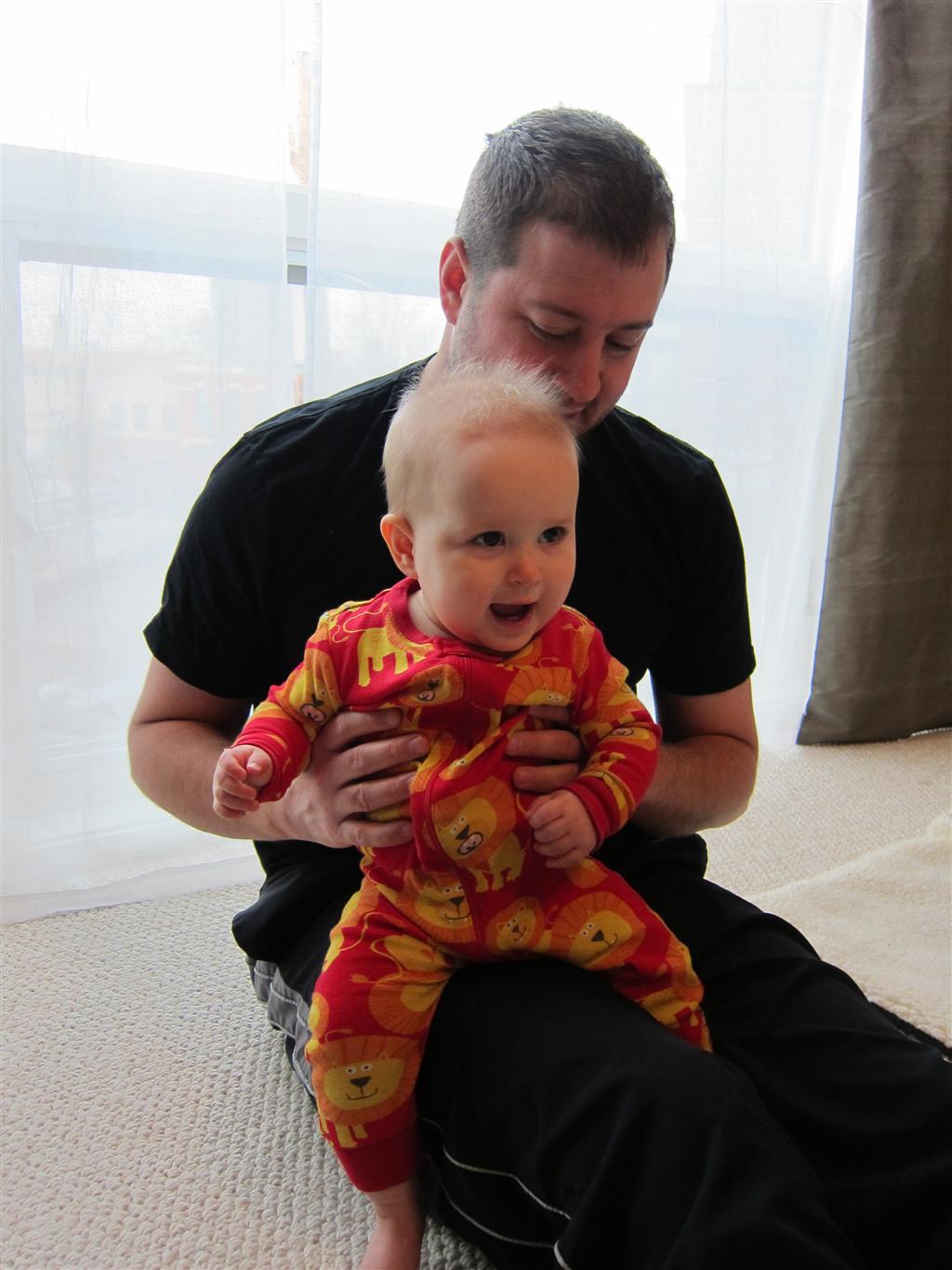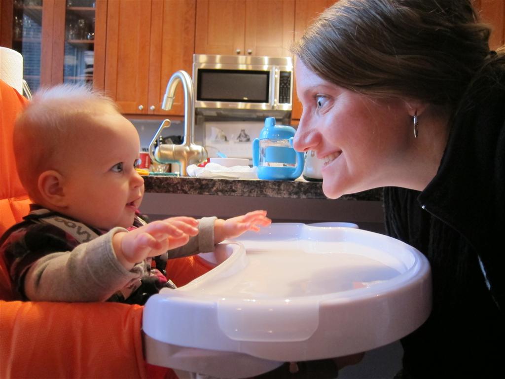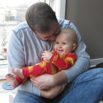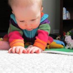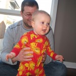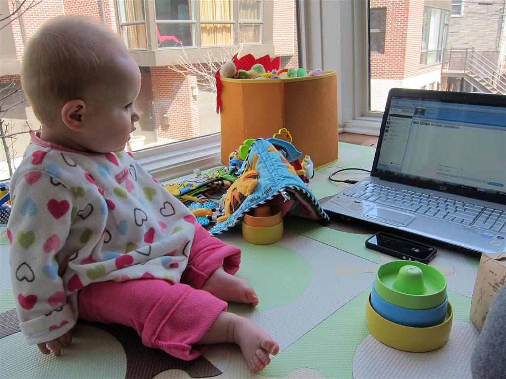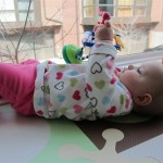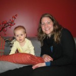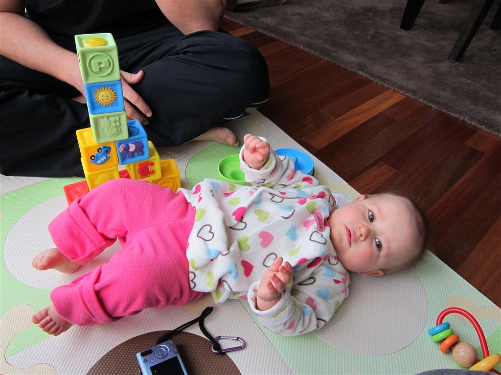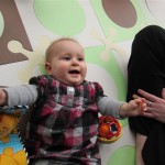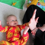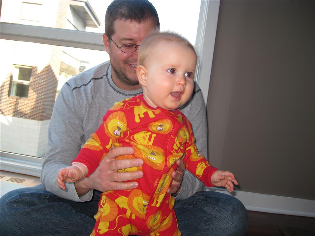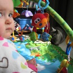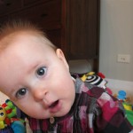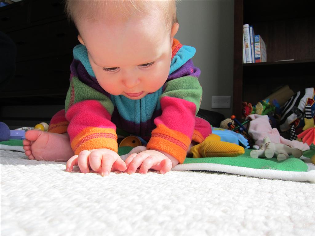This week Eleanor is cutting two more teeth – up top next to her front two. Unfortunately, they are quite hard to see, so we don’t have any pictures to share, but maybe next week.   Eleanor has also been working on her musical talents with her new instruments, especially the maracas.  Her standing is also improving on a daily basis, with some stints of 8-10 seconds of “free standing”.  Not much progress on the crawling front – the only time Ellie willingly gets on her tummy is when the iPhone is within rolling distance.  Why do kids love phones?