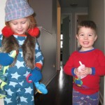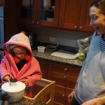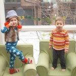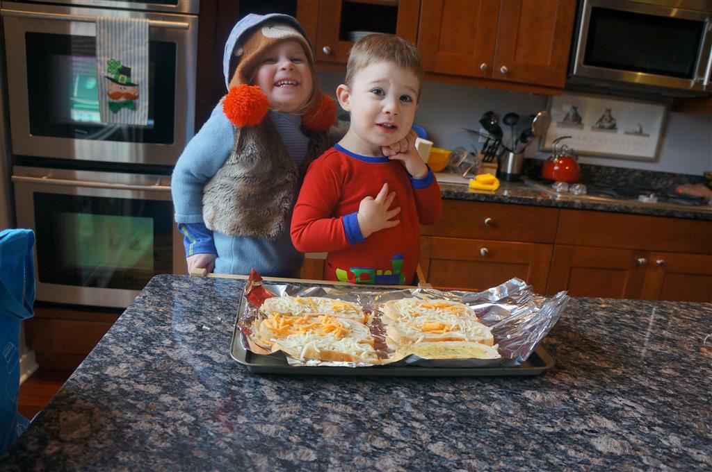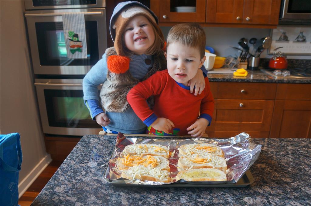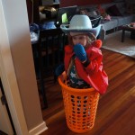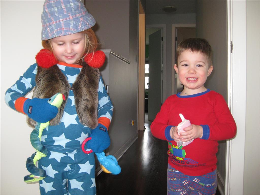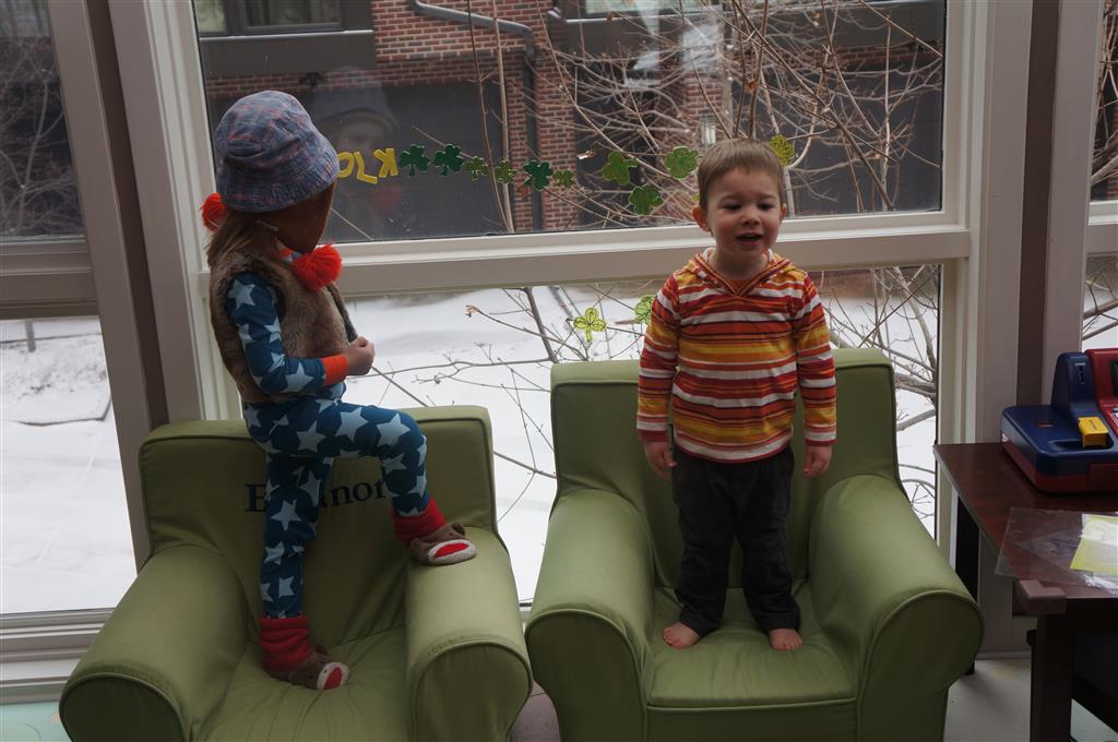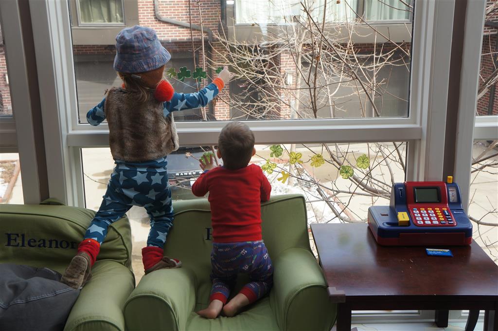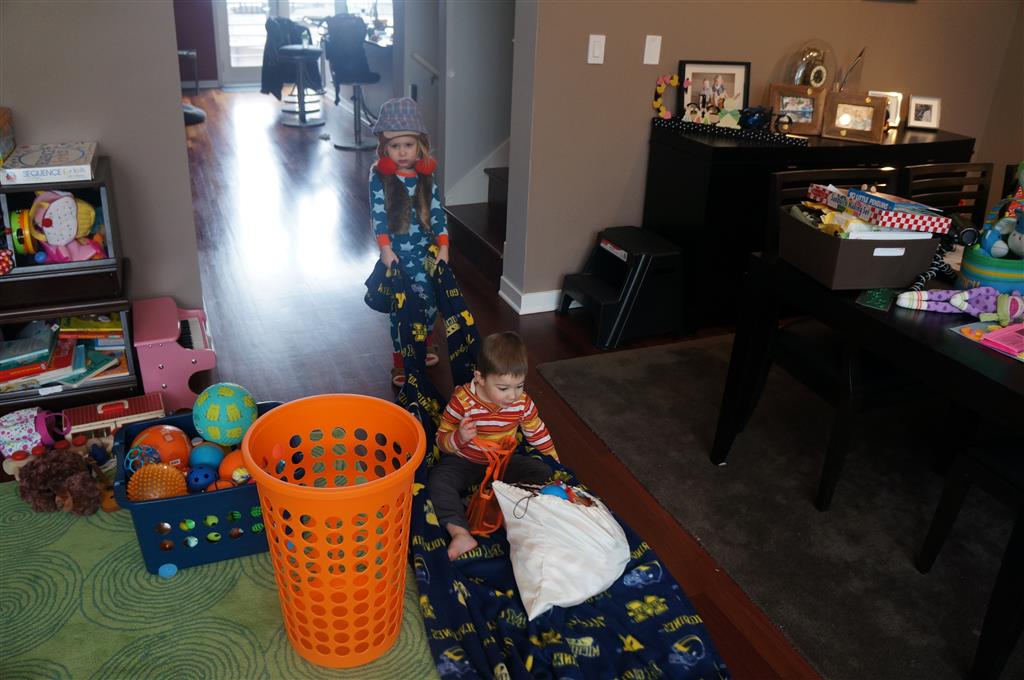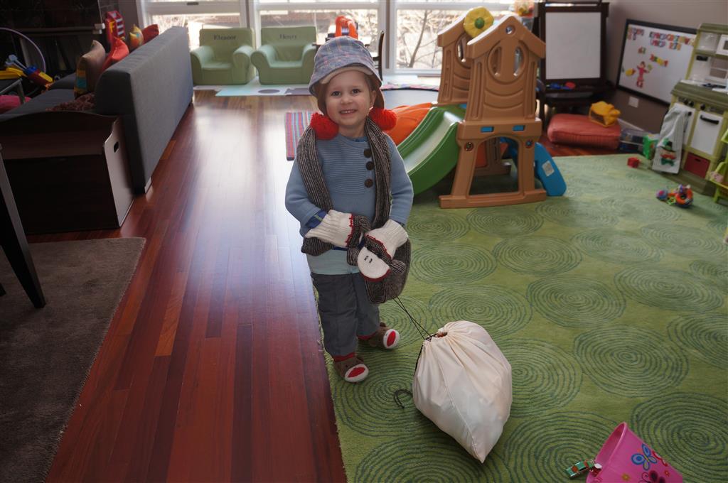 Eleanor and Henry have both begun to wonder what happened to walking to the park. It seems like forever ago that we had a nice warm day to head out. We have been having lots of fun with indoor activities, and this weekend we decided to start a family dinner Sunday tradition (move over taco Sunday!). We had the kids join in making dinner on Sunday night, complete with veggi chips and garlic bread. They were excited to get involved but we will see how long that lasts… Other fun activites this week were putting up some St Patrick’s Day themed gel jams (Thanks Grandma and Grandpa!) and lots of fun outfit designs from Eleanor. Eleanor has also been very into bags this week, and Monkey and lots of other friends have spent most of the week moving from bag to larger bag and the number of “favorite” items selected to be in the bag grows and grows. By Sunday night, the were occupying all of the Gray and Hobbes’ tent. Henry’s favorite thing to do this week is narrate life as it goes by. He loves to use his words to describe anything and everything that is going on – although a bit embarrassing when at Whole Foods for lunch he said “That woman make mamma’s taco” to the long haired man making tacos.:)