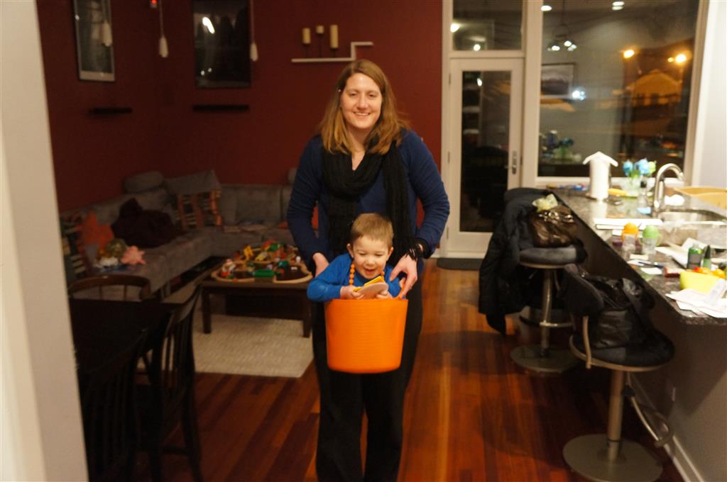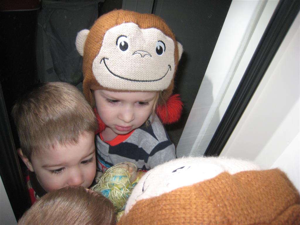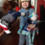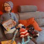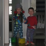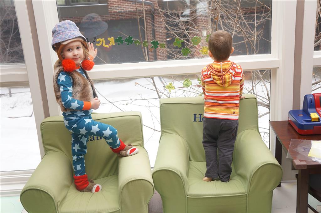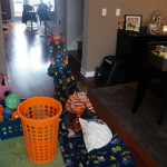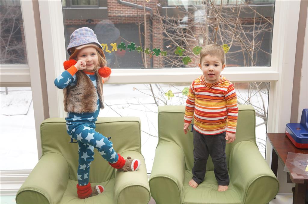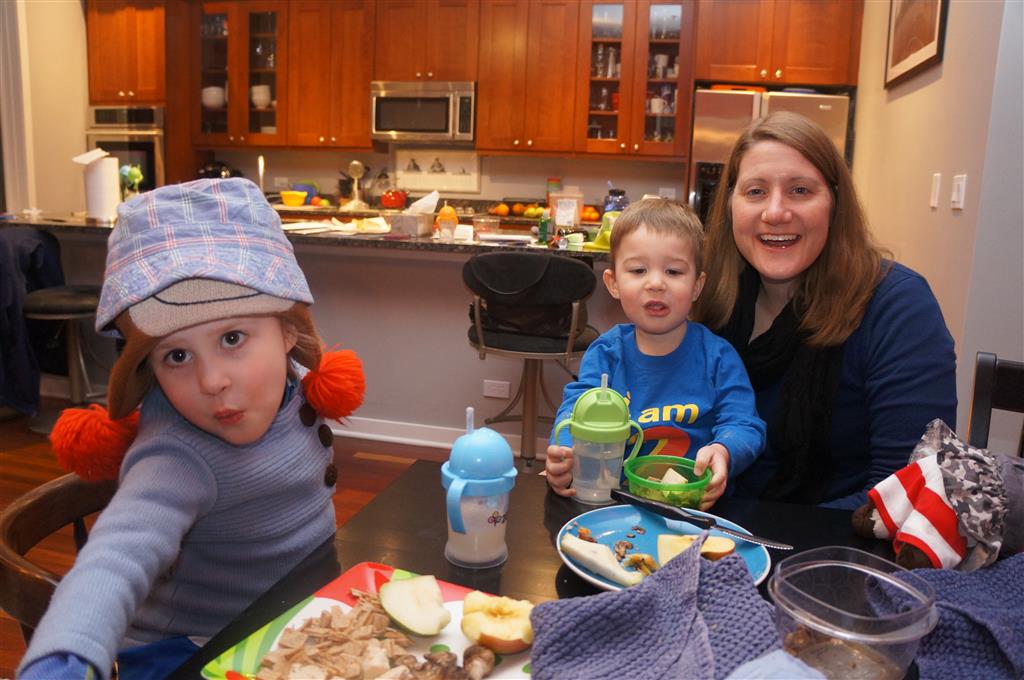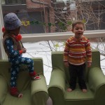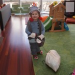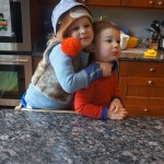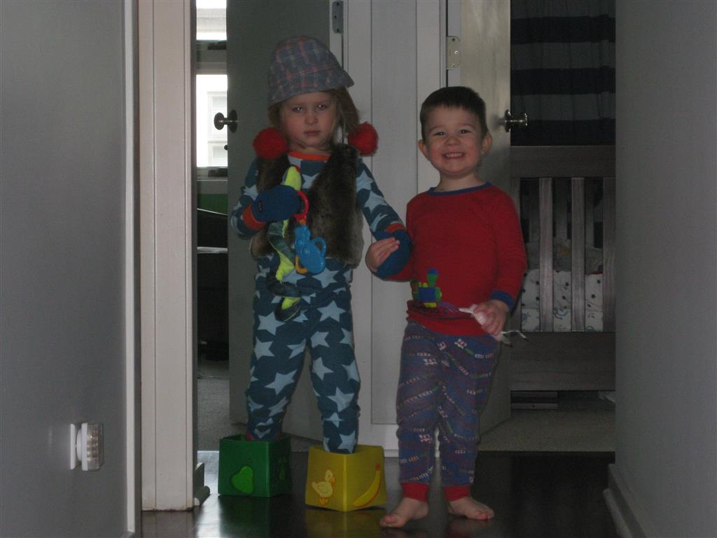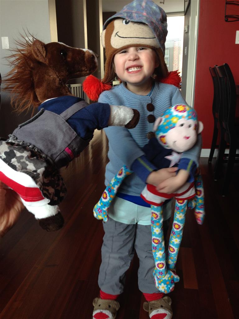 Eleanor and Henry have both begun to wonder what happened to walking to the park. It seems like forever ago that we had a nice warm day to head out. We have been having lots of fun with indoor activities, and this weekend we decided to start a family dinner Sunday tradition (move over taco Sunday!). We had the kids join in making dinner on Sunday night, complete with veggi chips and garlic bread. They were excited to get involved but we will see how long that lasts… Other fun activites this week were putting up some St Patrick’s Day themed gel jams (Thanks Grandma and Grandpa!) and lots of fun outfit designs from Eleanor. Eleanor has also been very into bags this week, and Monkey and lots of other friends have spent most of the week moving from bag to larger bag and the number of “favorite” items selected to be in the bag grows and grows. By Sunday night, the were occupying all of the Gray and Hobbes’ tent. Henry’s favorite thing to do this week is narrate life as it goes by. He loves to use his words to describe anything and everything that is going on – although a bit embarrassing when at Whole Foods for lunch he said “That woman make mamma’s taco” to the long haired man making tacos.:)