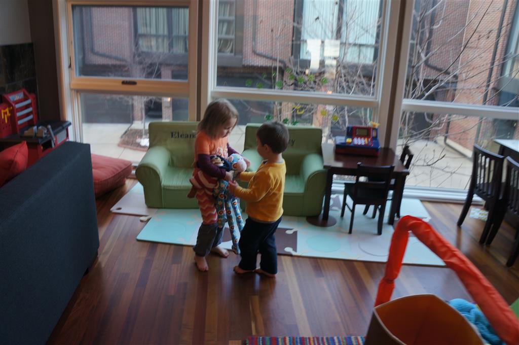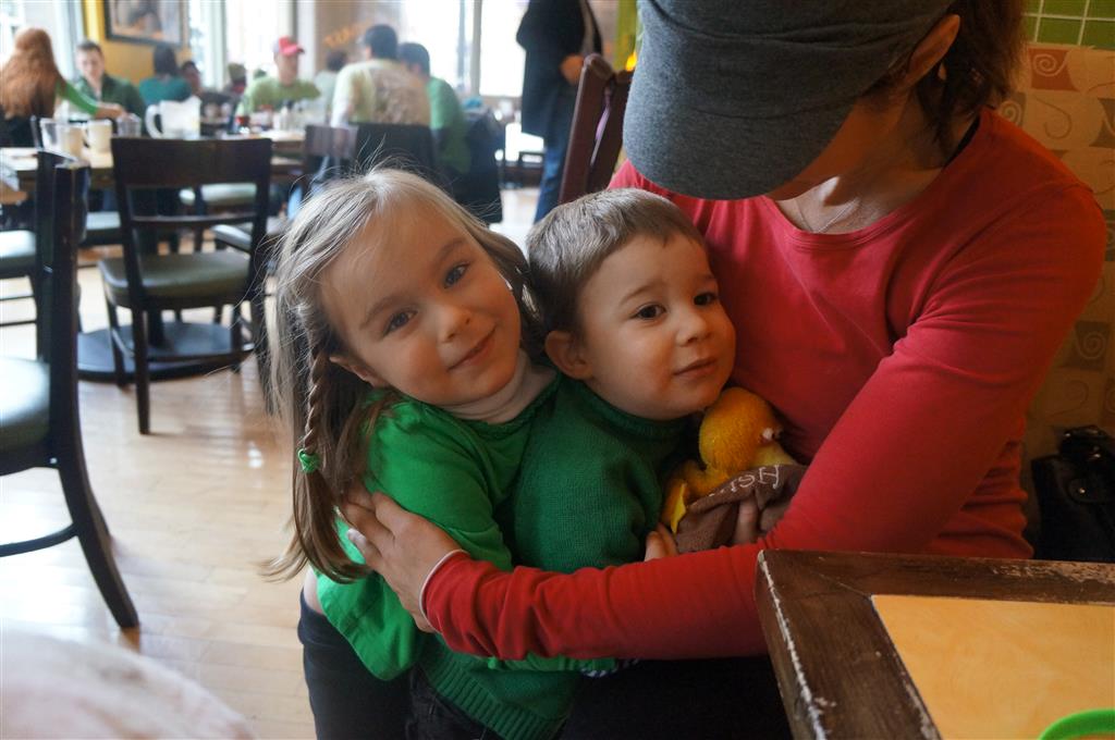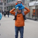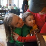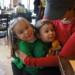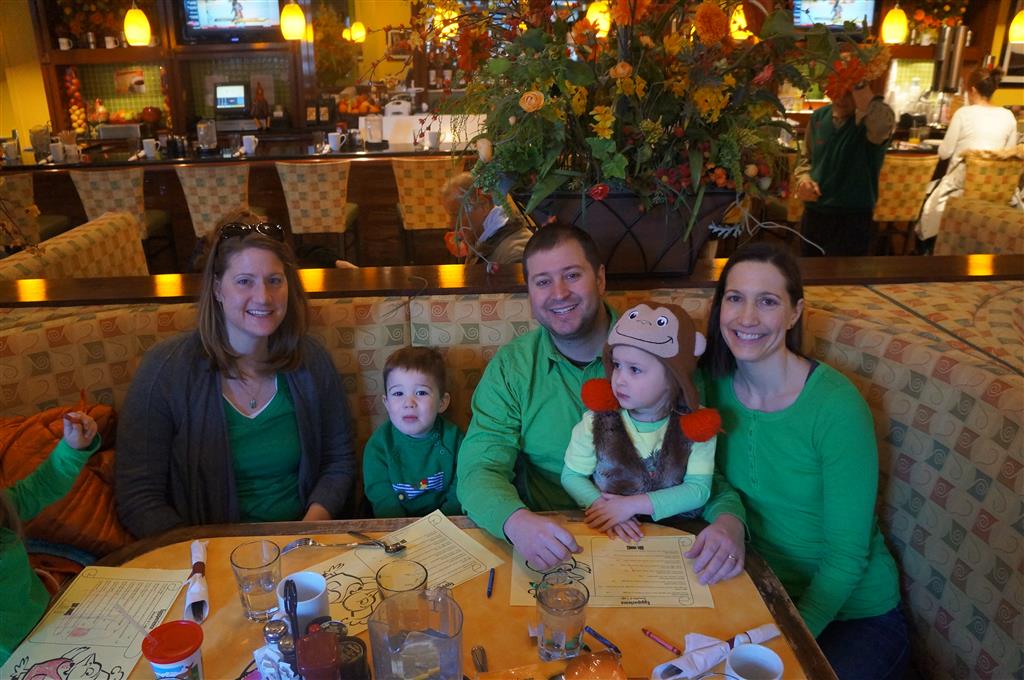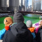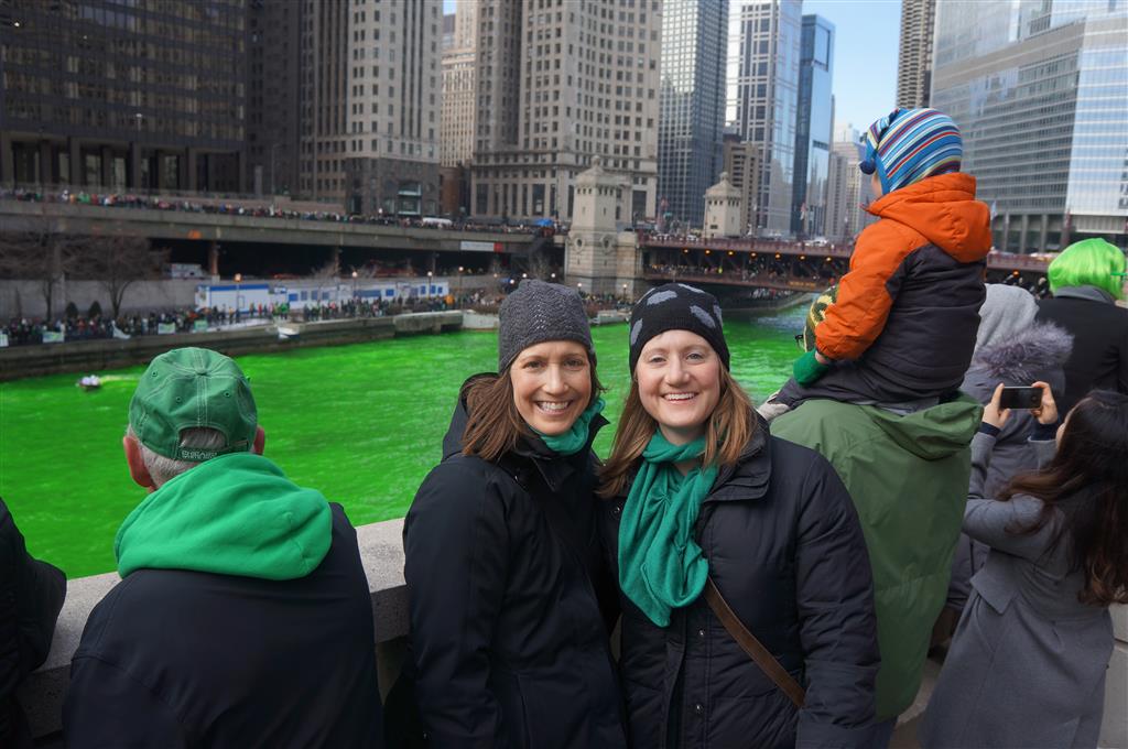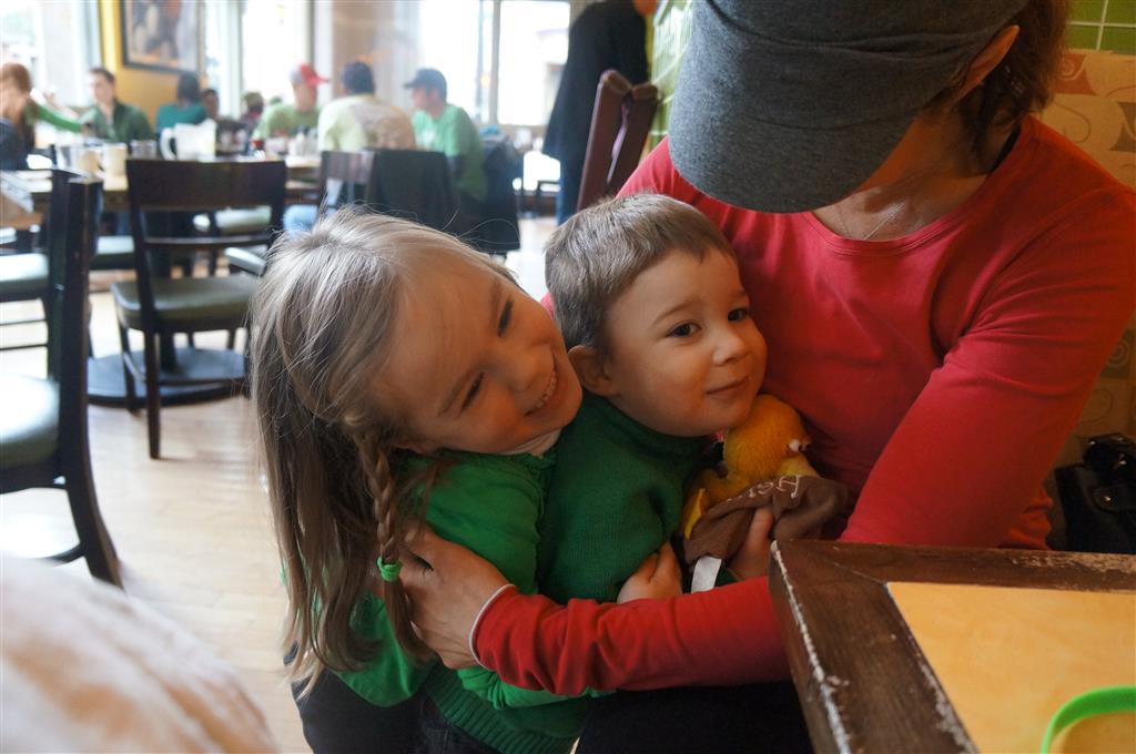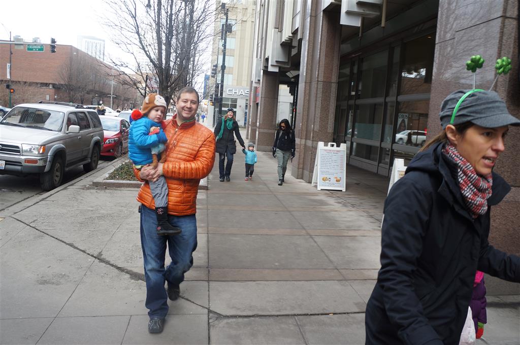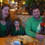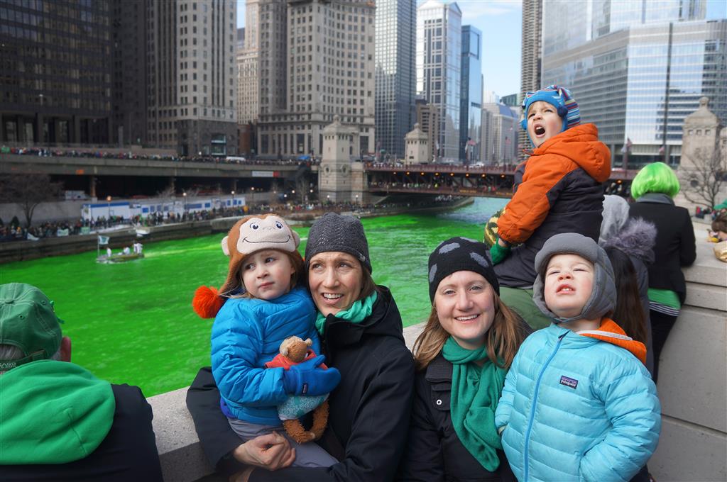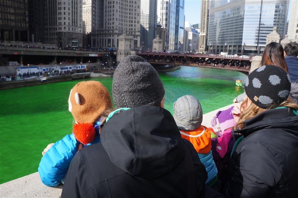 The whole family continued our Chicago tradition of visiting the dyeing of the river green this year. Henry and Eleanor were moderately impressed by the river, and more impressed by the police boat that drove by with its lights flashing. We had our traditional brunch out before hand, and then were stroller free for the walk to the river for the first time! It was a bit cold, but we had a fun time, and both kids loved to run around in the plaza a bit before heading home.