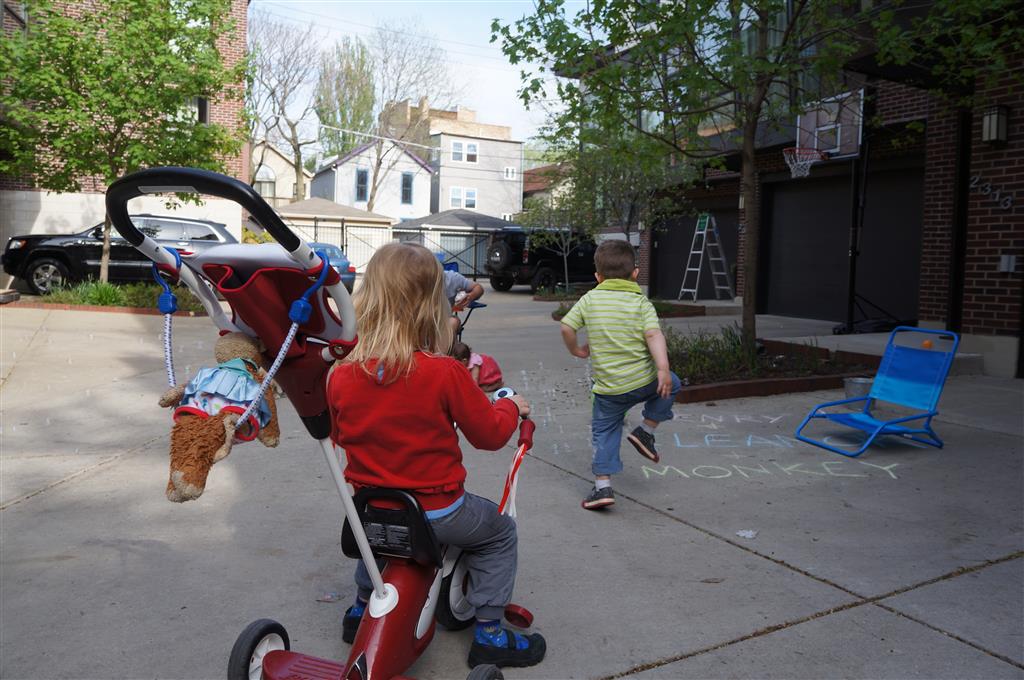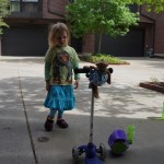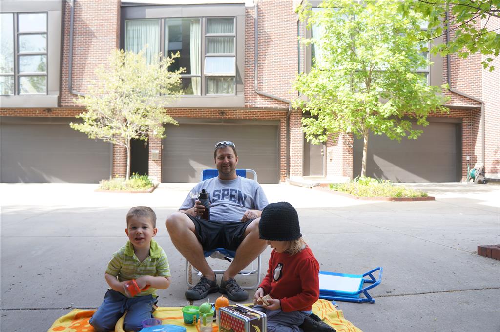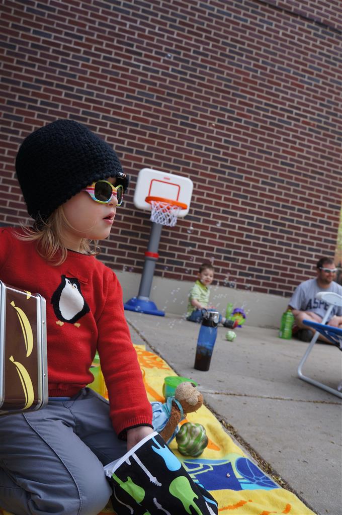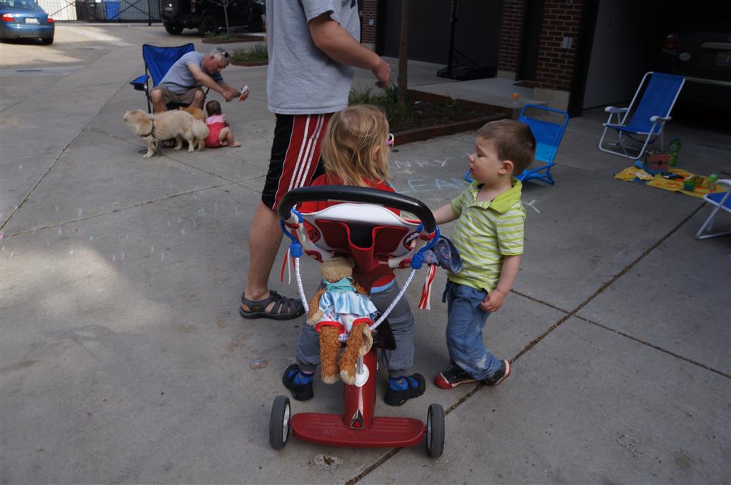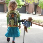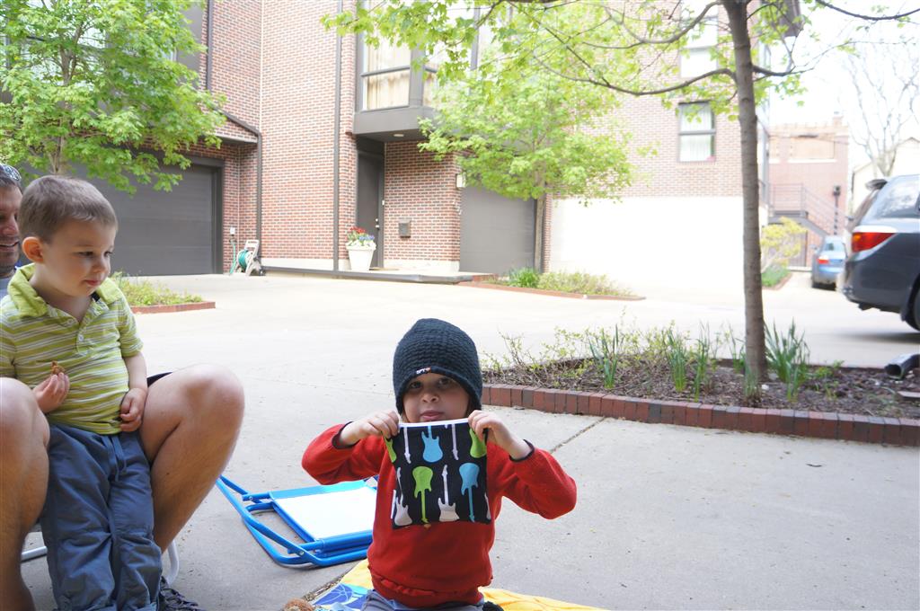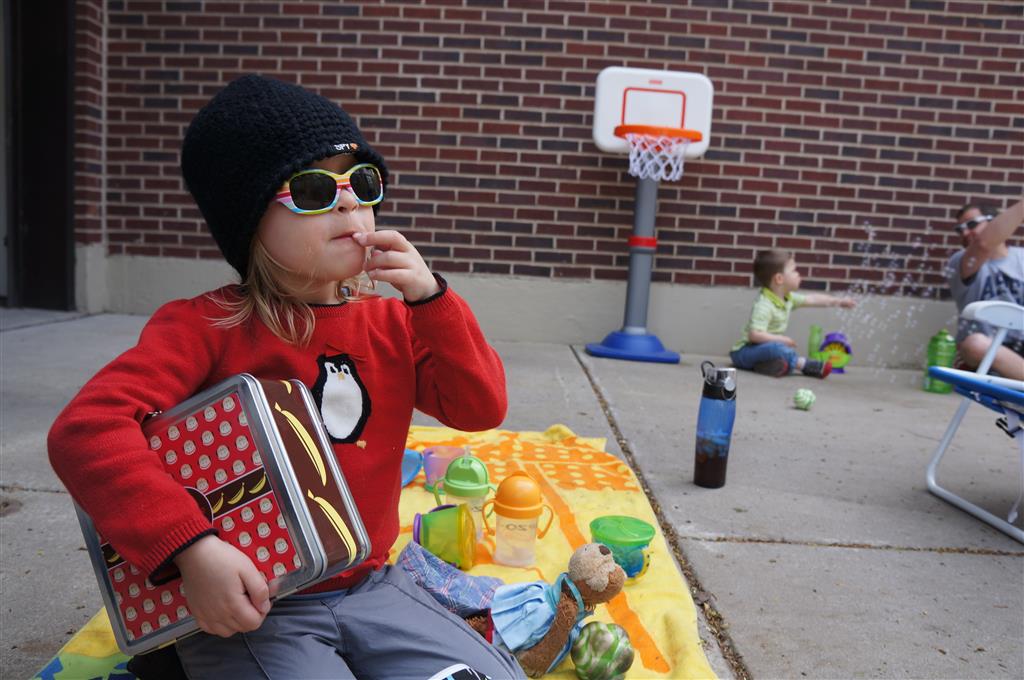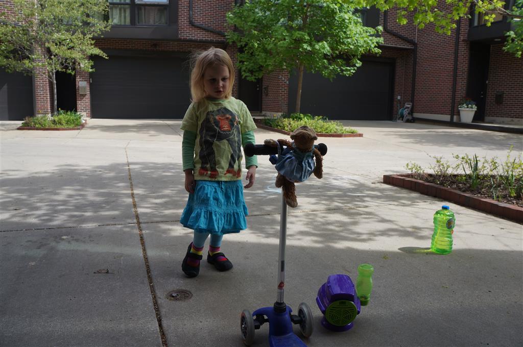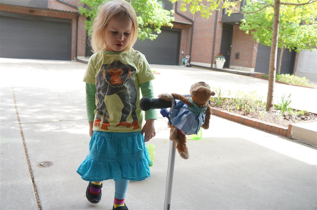We had lots of fun outdoor time this week as the summer weather rolled in, although you wouldn’t know it from Eleanor’s outfits. On Saturday she wore a sweater and my ski cap for our whole driveway picnic. I finally got Henry on the bike for a quick cycle or two around the driveway, but no luck with Eleanor yet. I even rigged up a bungee cord seatbelt so Monkey could ride with her, but she ended up putting that to use on the other vehicles.