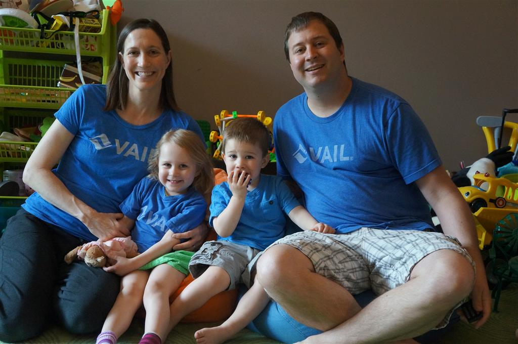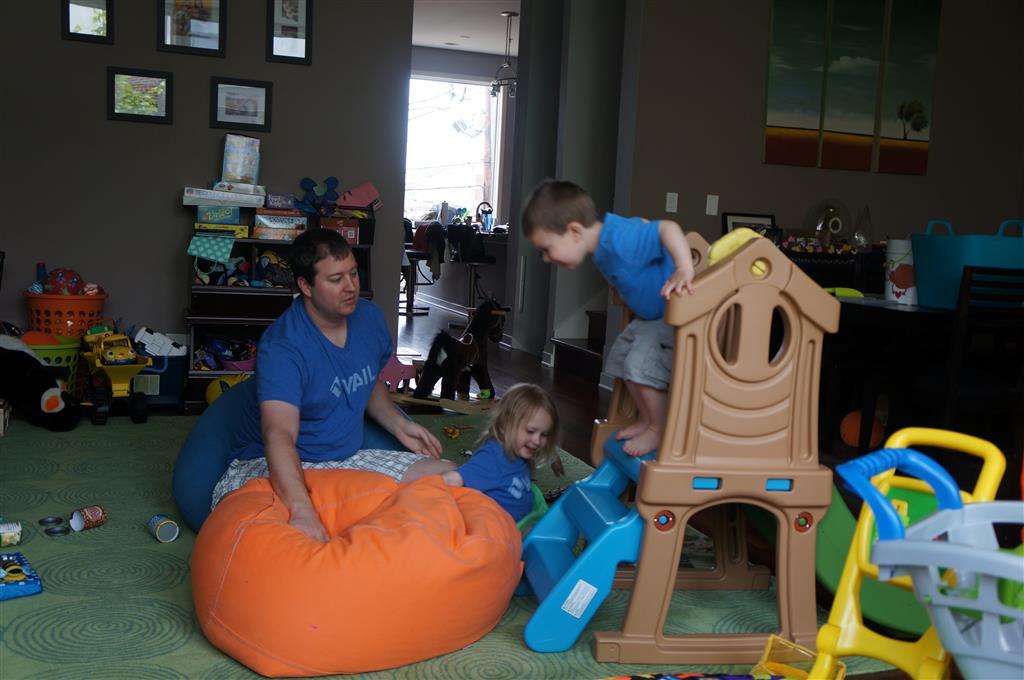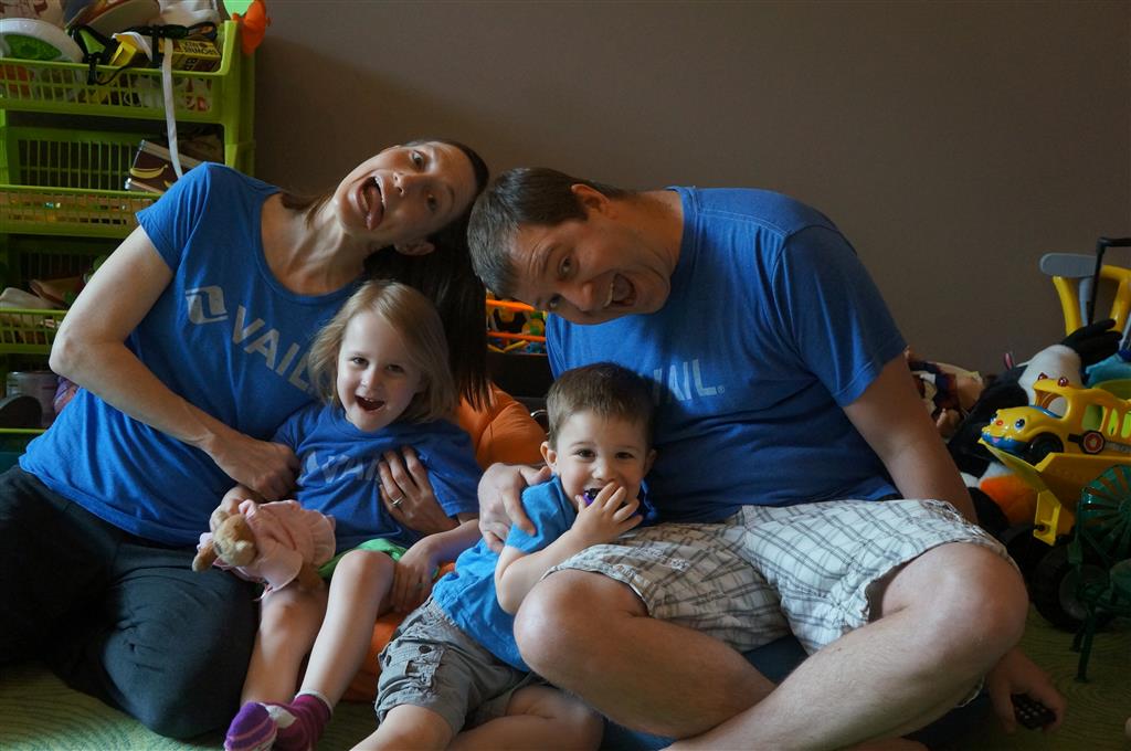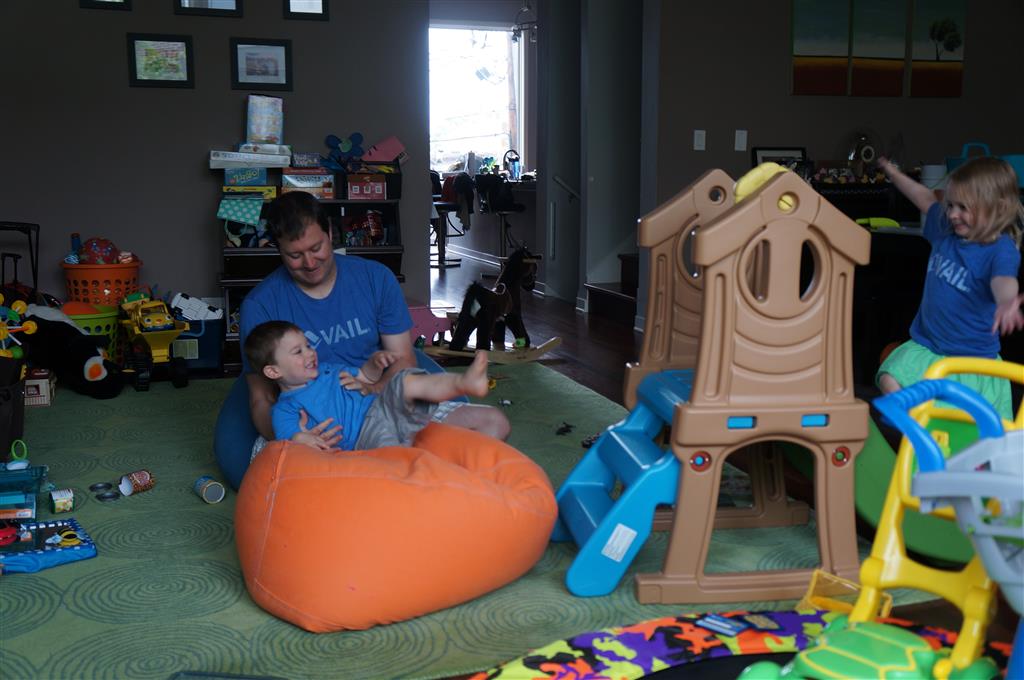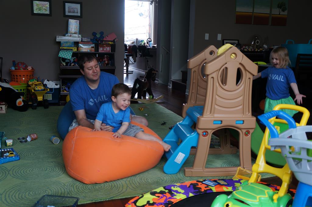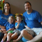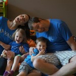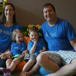 Mom and Dad coincidentally wore the same t-shirt on Sunday, so we dug up some matching blue ones for the kids and had a matching family picture. Too bad Monkey and Thomas the Train didn’t have t-shirts too!