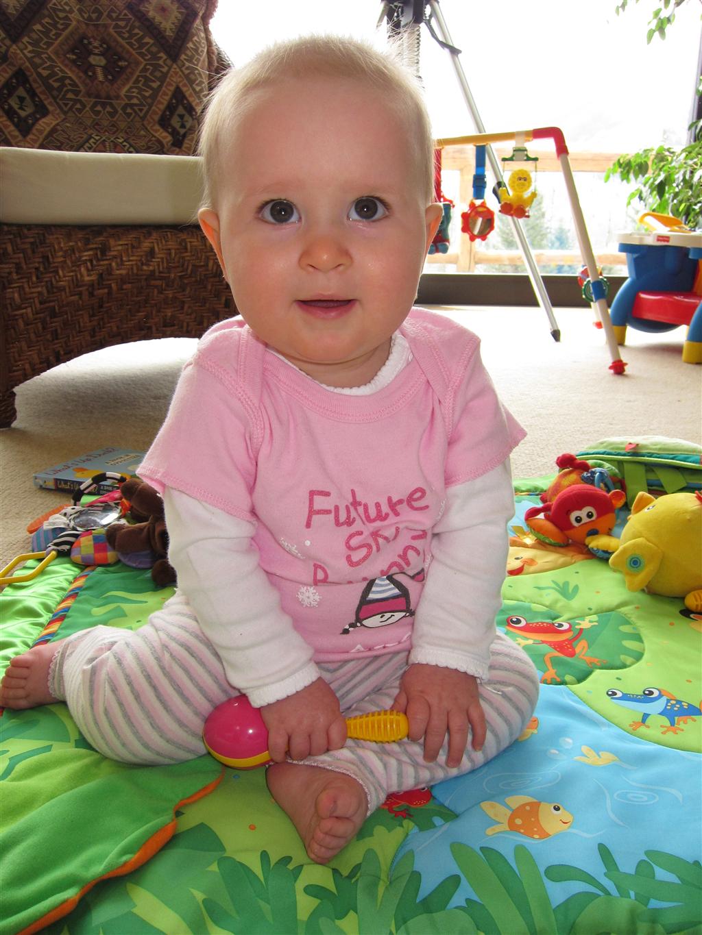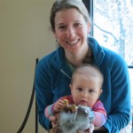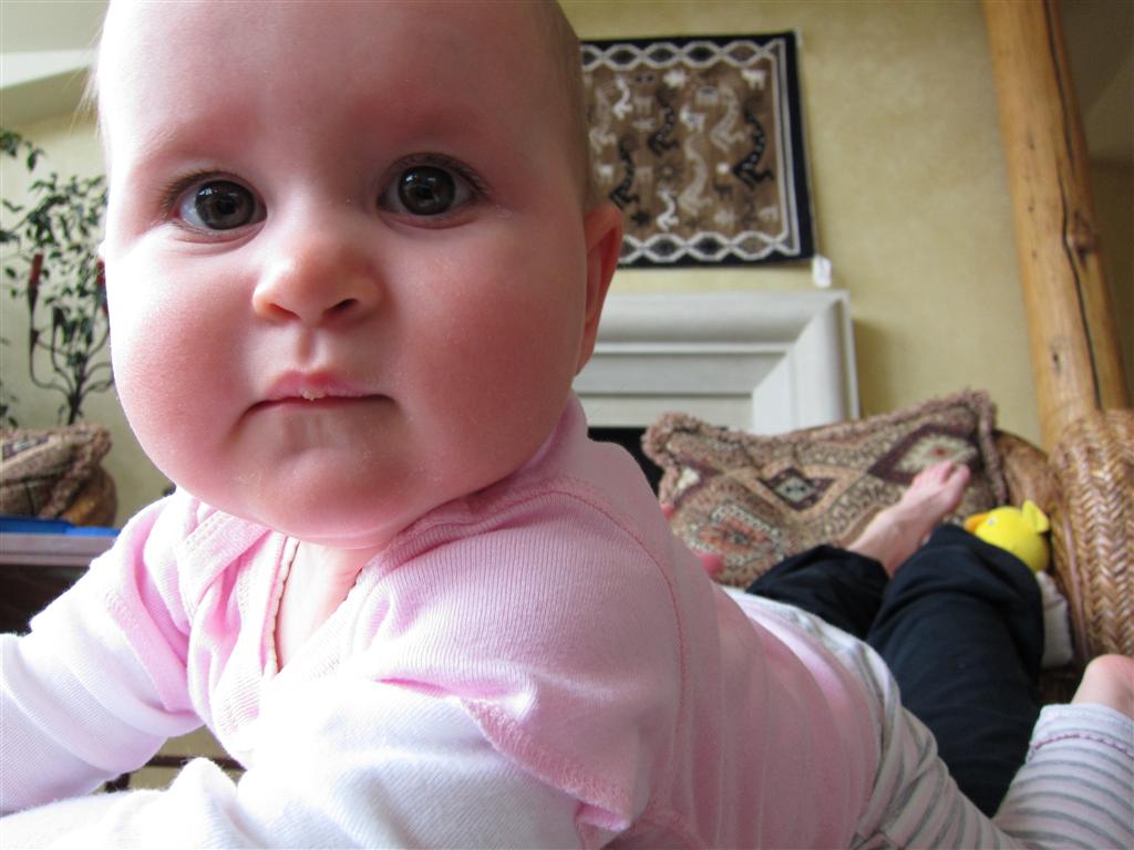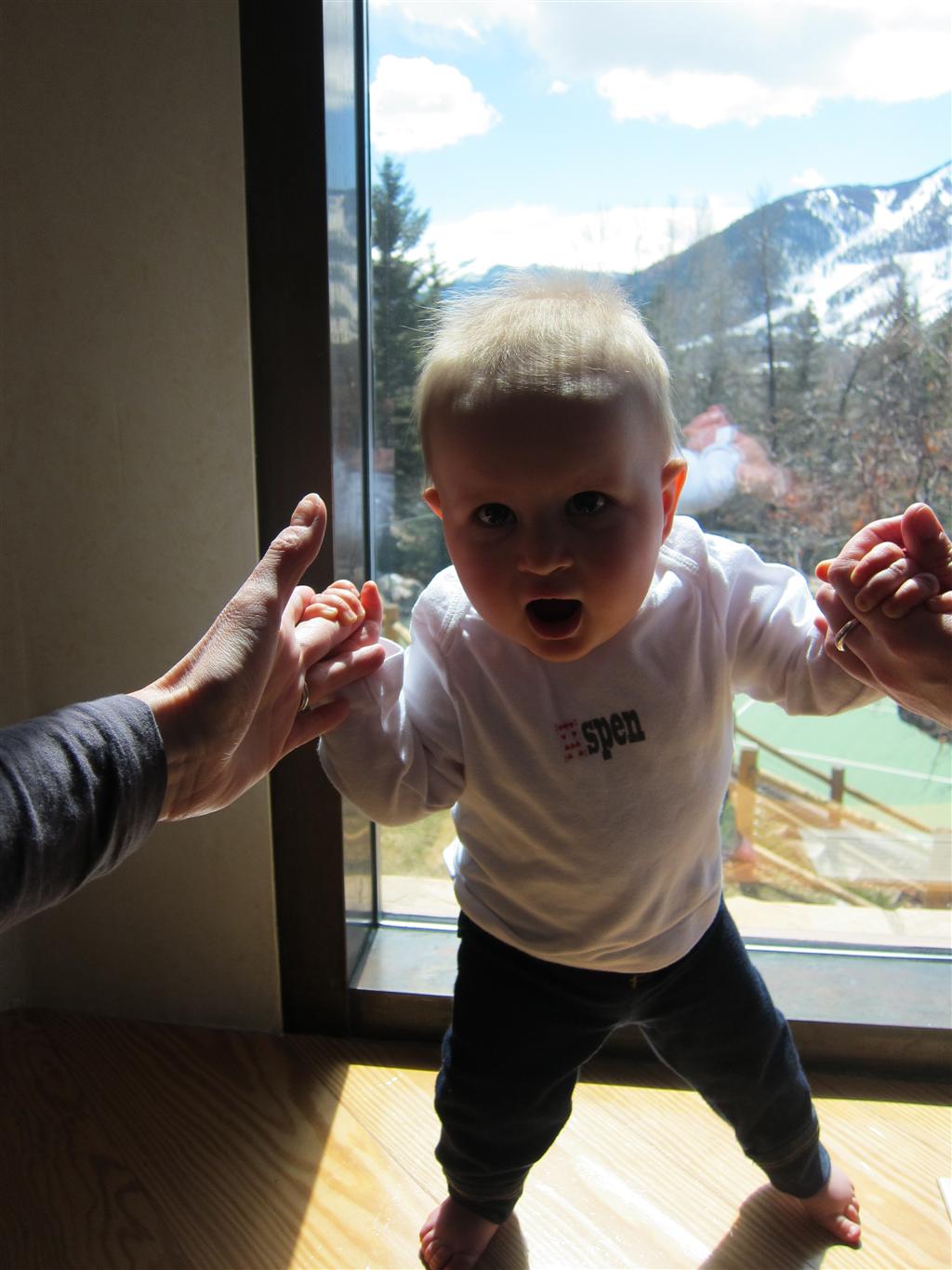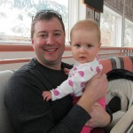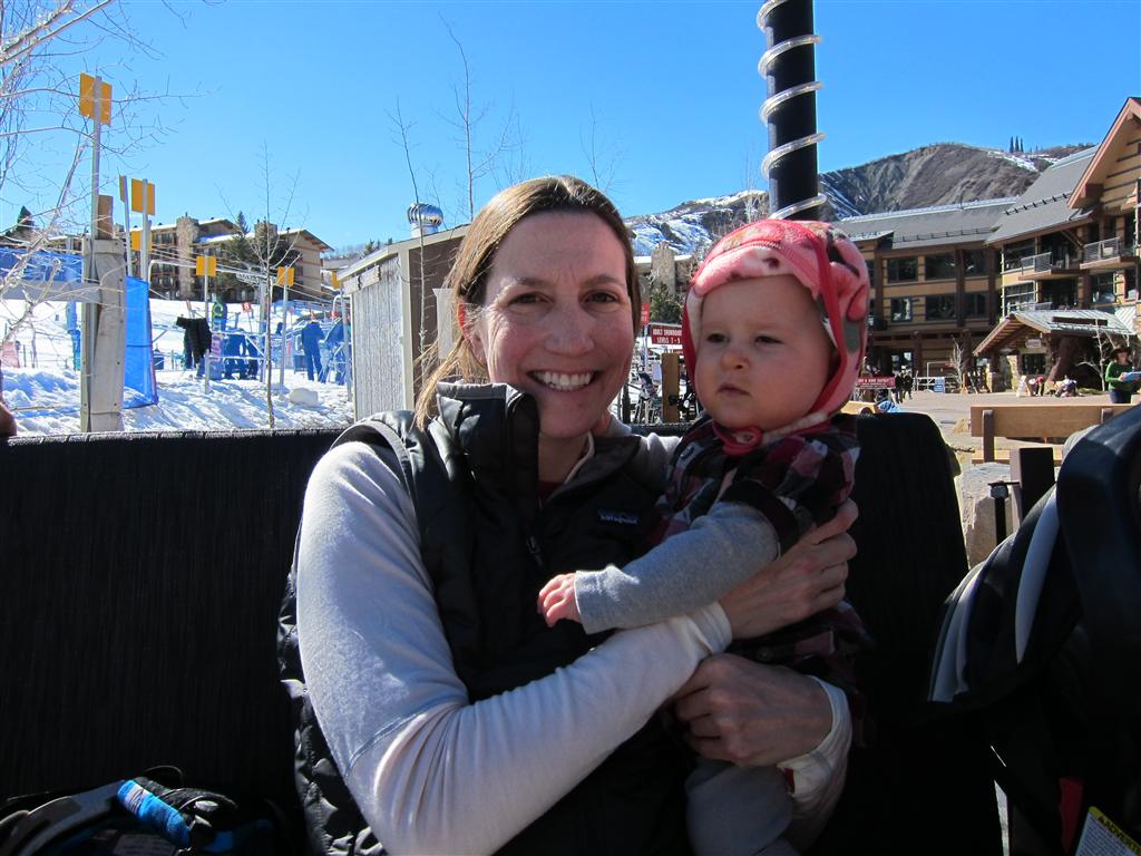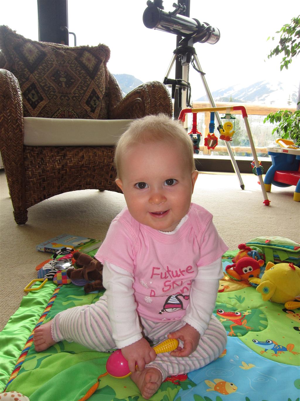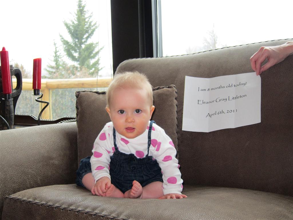 Eleanor turned eight months this week while in Aspen. Unfortunately, this means that the monthly family picture with Zapa will have to be delayed a few days (as Zapa doesn’t fly). Now that she is eight months old, Eleanor is doing a lot of new things. So many, in fact, that it was a bit hard to keep track of them all this week – so I made a little list below. Most significant is probably the first forward motion while “army” crawling – however Uncle B is the only witness to this event, so it is under dispute with Mama. Either way, Eleanor is definitely making progress towards a full fledged crawl. She definitely makes progress via multiple roll overs and “scoots”, inches backwards while on her tummy, and even lifts off the ground while on her back in a “crab walk” like motion. I’m pretty sure that she will figure out how to use her knees for propulsion very soon. Also very exciting are some new syllables that Eleanor can say, Da-Da-Da and Ga-Ga-Ga. She is so good at Da-Da now that all I have to do is say it once and she will repeat it back to me. I tried to convice Amy that this was her first word (Dada) but I was vetoed. Apparently it isn’t clear that Eleanor actually means Dada when she says Da-Da-Da. A fair point, and one that I successfully used when Eleanor used to say Uuummmmmaaaa Uummmmaaaa when she was a few months old. It sounded a lot like Mama, but both Amy and I agreed that it didn’t mean Mama, especially since Eleanor mostly said it while she was upset.