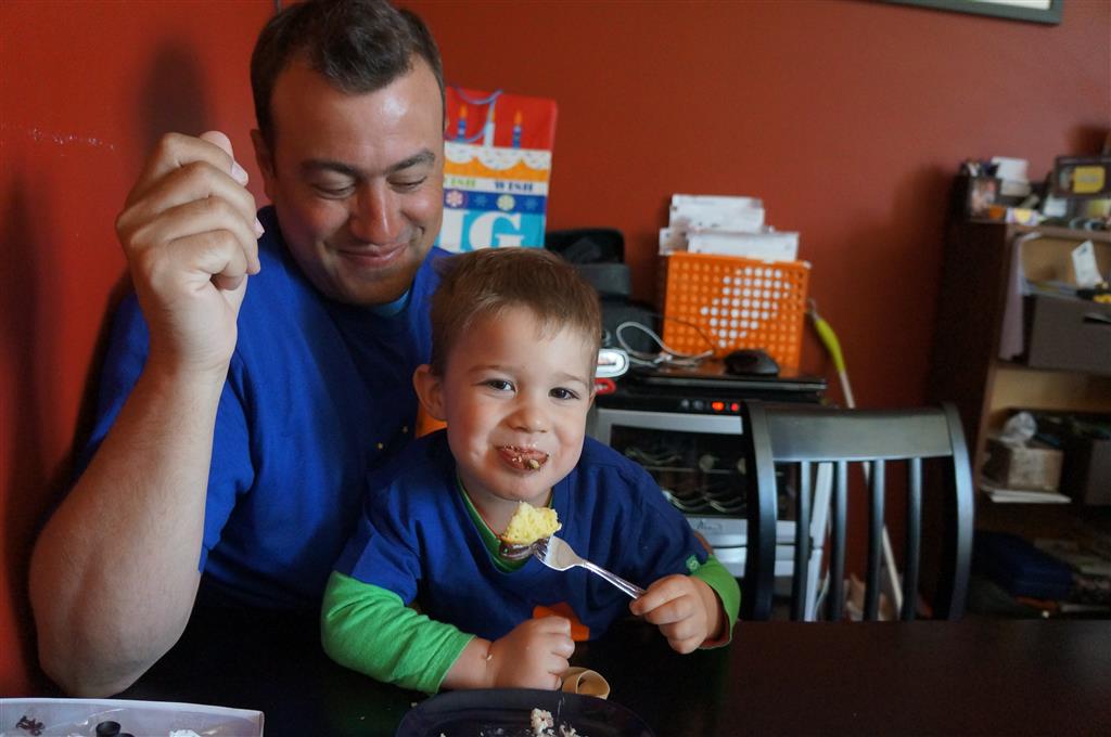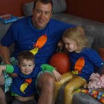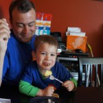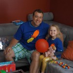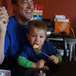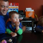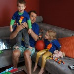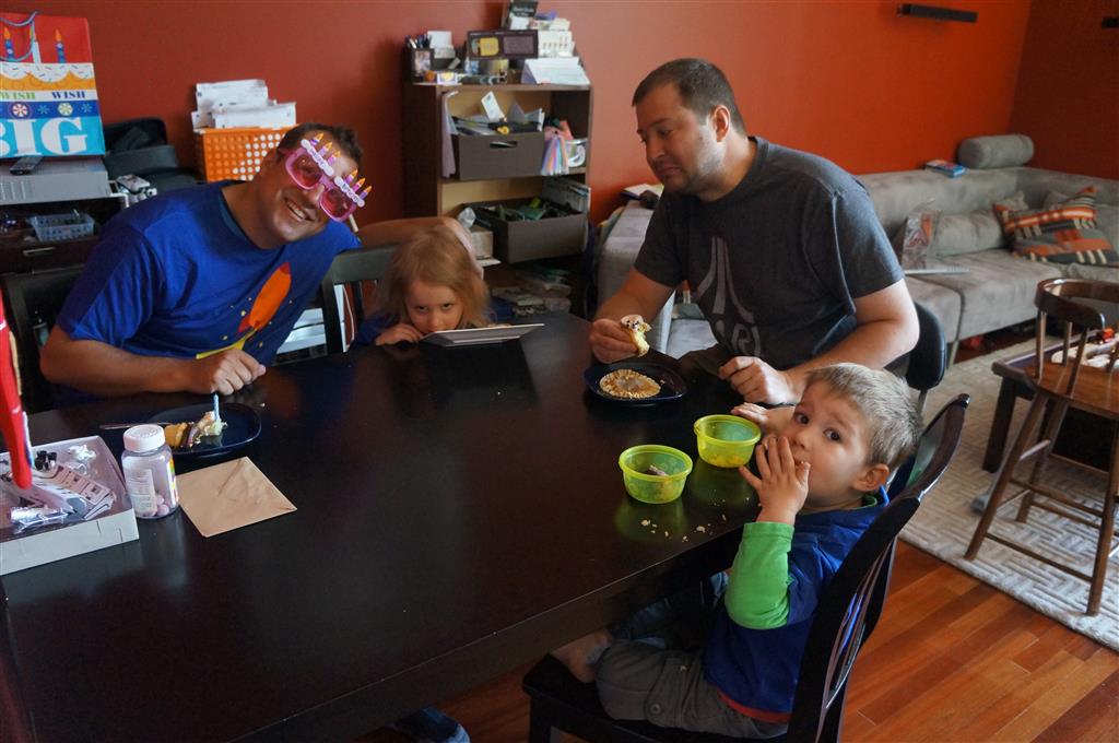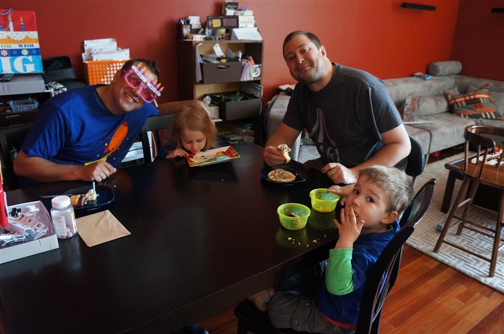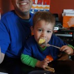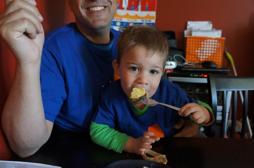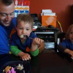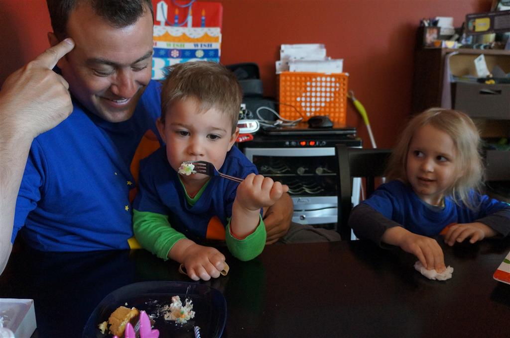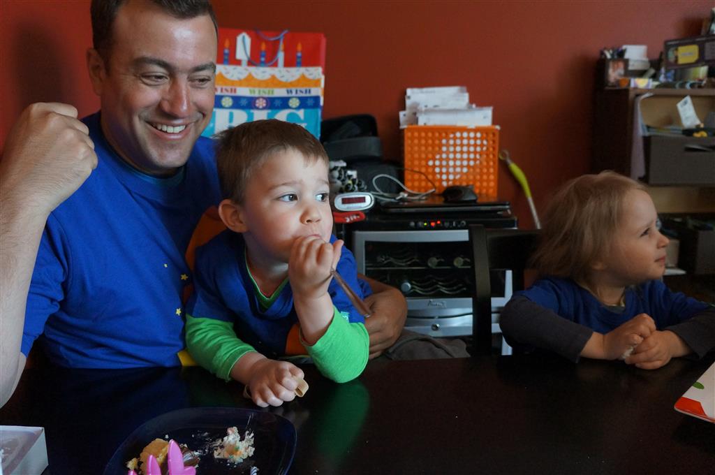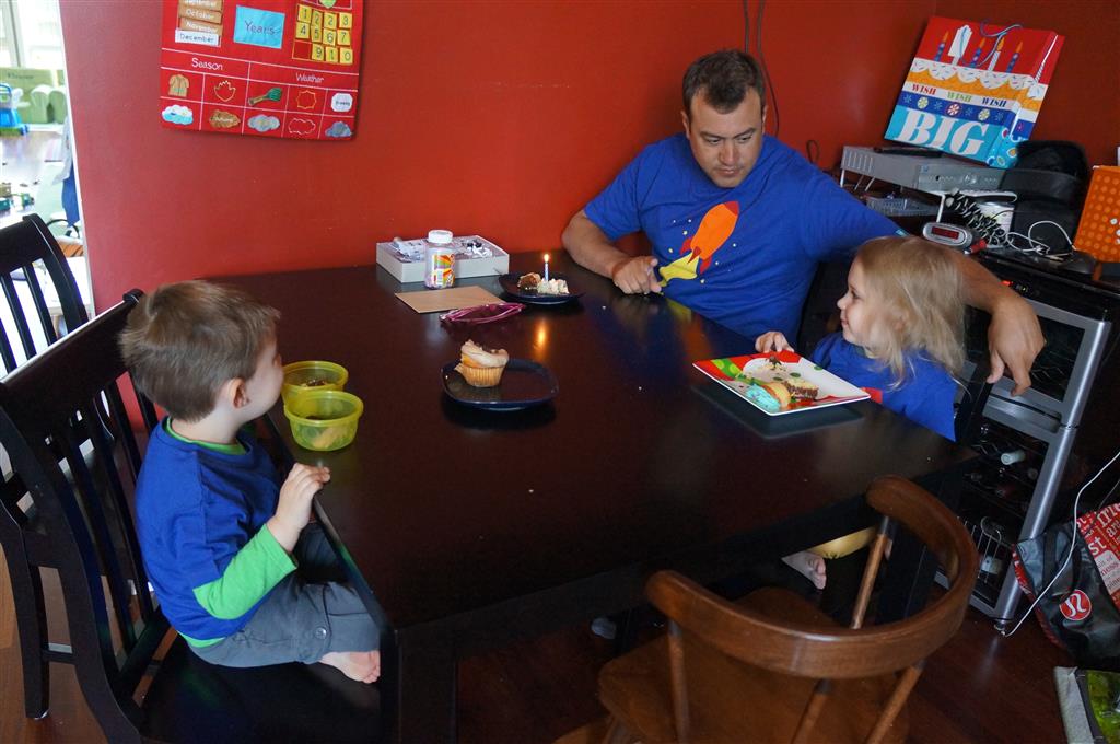 On Sunday, Uncle B came over and we celebrated his big birthday. Eleanor and Henry were really excited about the matching rocket ship shirts that they got for him. They were both also very excited about the birthday cupcakes. Showing incredible restraint, they both sang the entire Happy Birthday and watched Uncle B blow out the candle before they started into their cupcakes. After finishing his own, Henry cleverly went over and sat on Uncle B’s lap and then finished up Uncle B’s cupcake too!