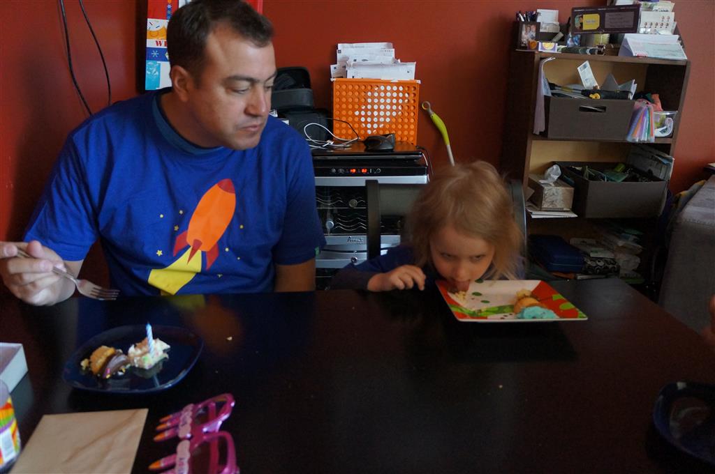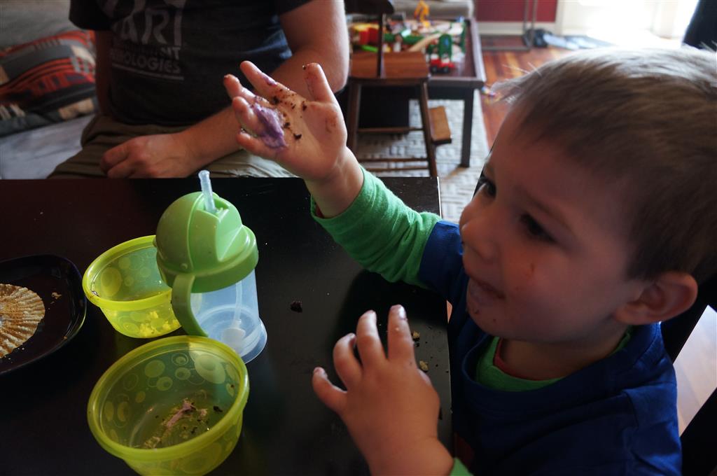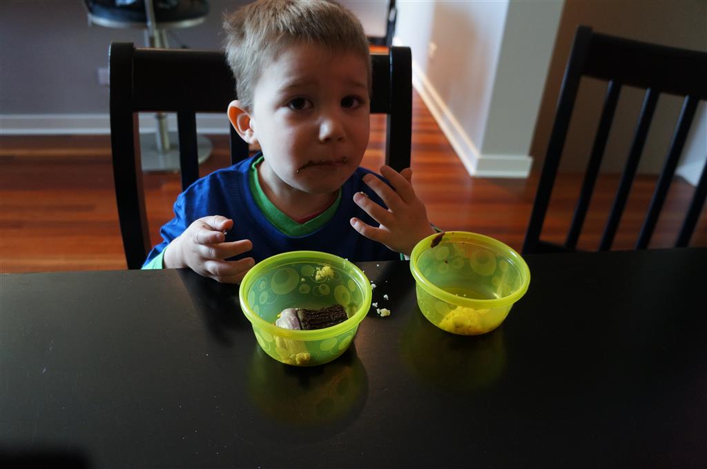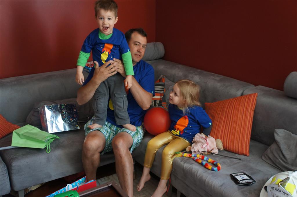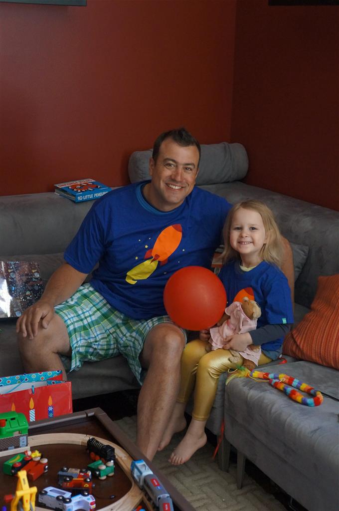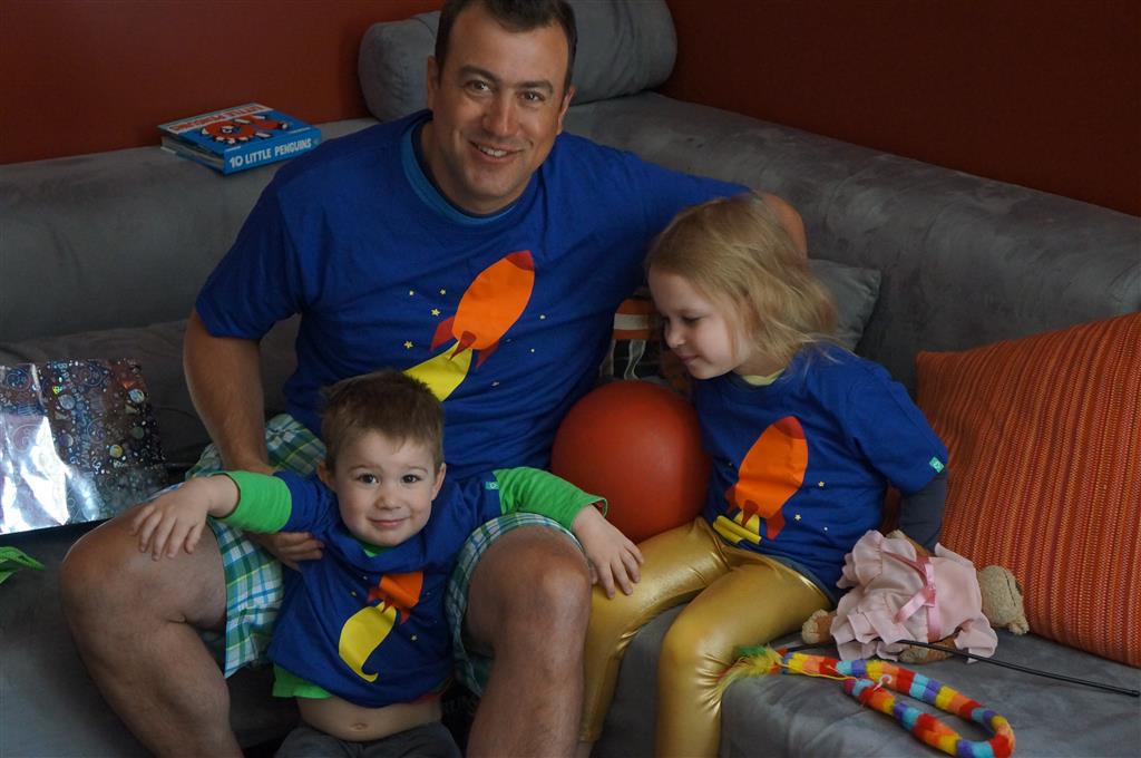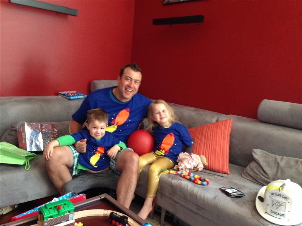 On Sunday, Uncle B came over and we celebrated his big birthday. Eleanor and Henry were really excited about the matching rocket ship shirts that they got for him. They were both also very excited about the birthday cupcakes. Showing incredible restraint, they both sang the entire Happy Birthday and watched Uncle B blow out the candle before they started into their cupcakes. After finishing his own, Henry cleverly went over and sat on Uncle B’s lap and then finished up Uncle B’s cupcake too!