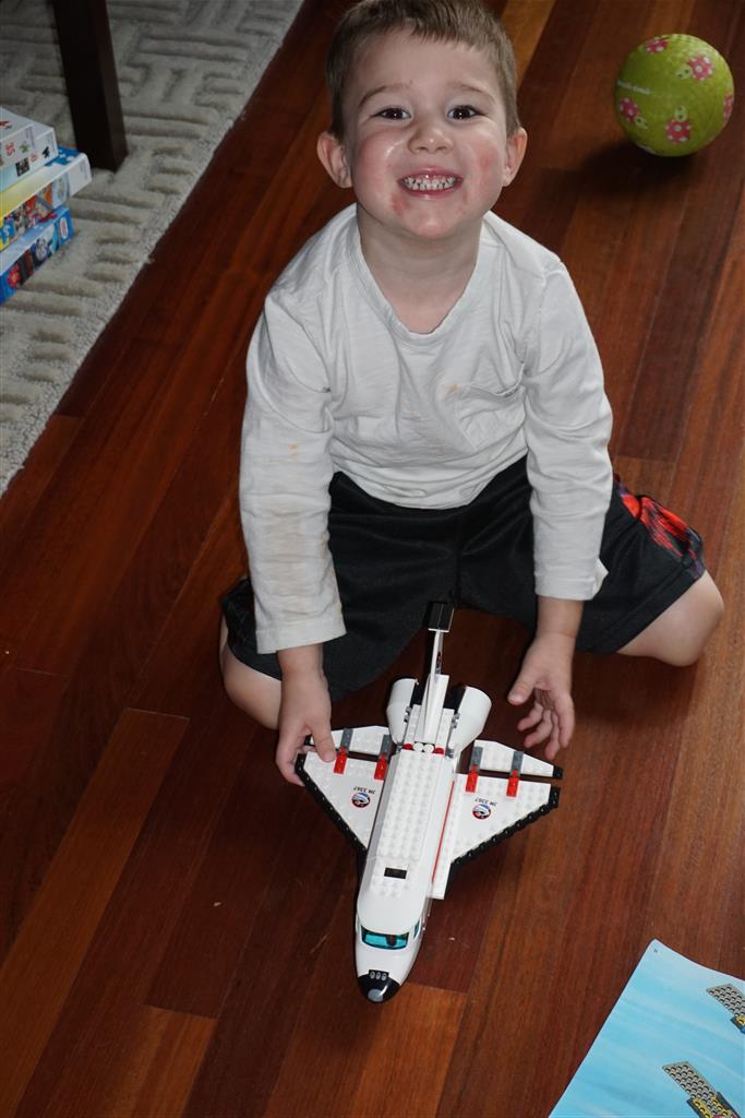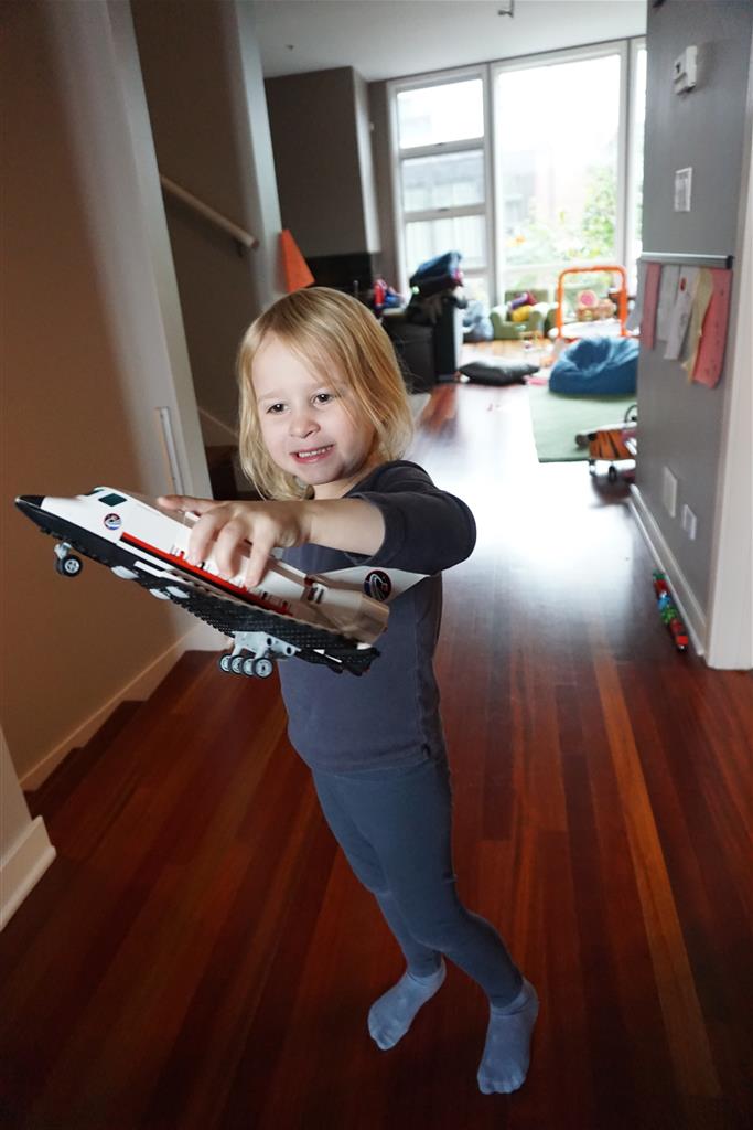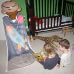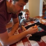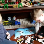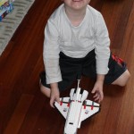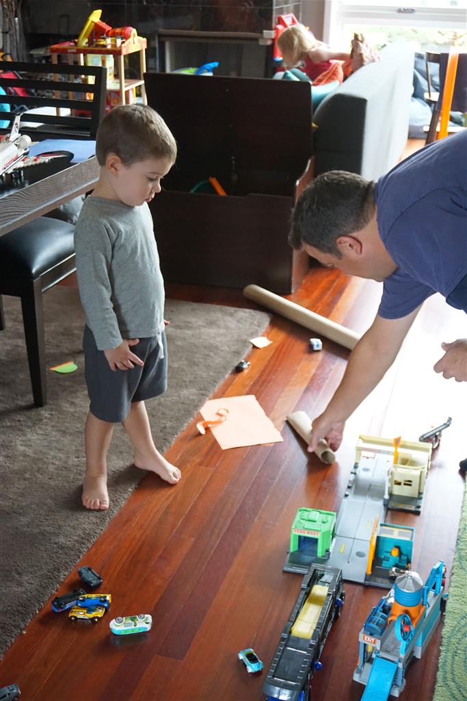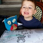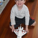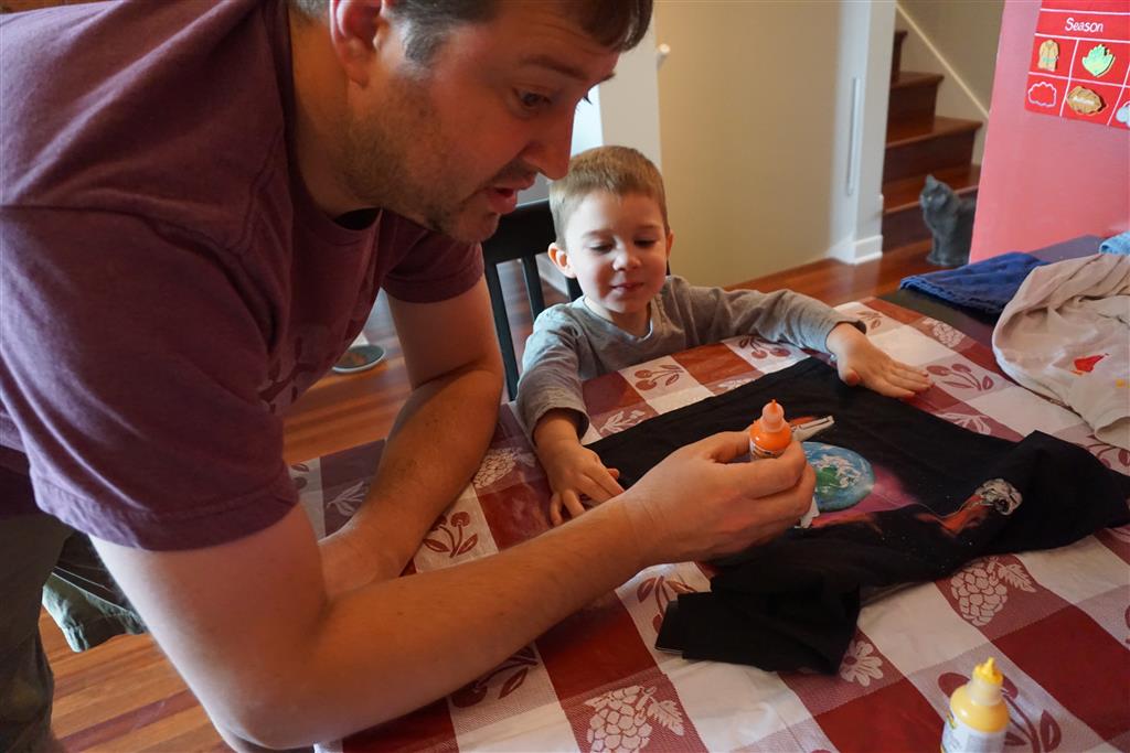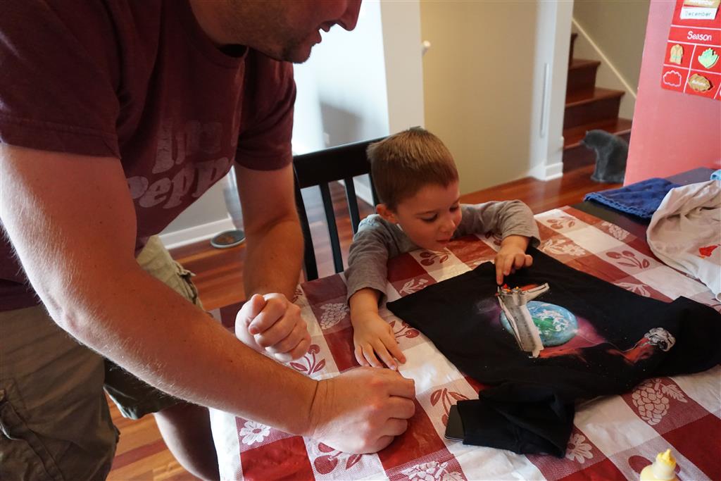 On Sunday Uncle B came over and set up an awesome matchbox car track, complete with launching ramp, tunnel, jump and landing zone. Grandma arrived in time for lunch and a trip to the bookstore, and then we added puffy paint fire to the space shuttle shirts that Grandma and Grandpa had given Eleanor and Henry. When she first got it, Eleanor had declared “I don’t like it because it doesn’t have fire” – hopefully the puffy paint will rectify that, but at any rate it was a fun art project.