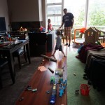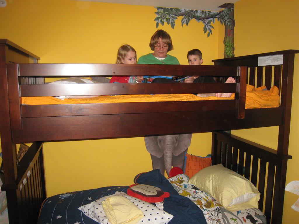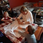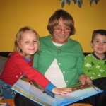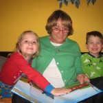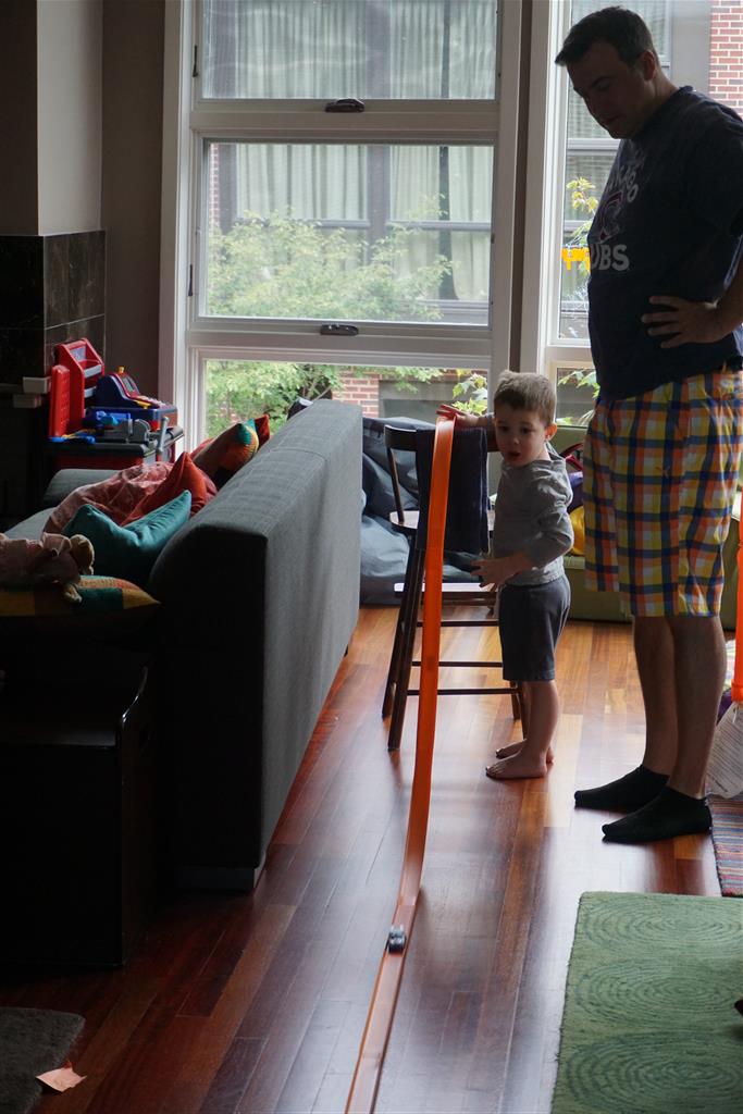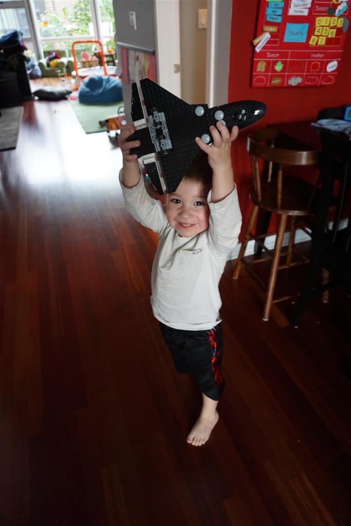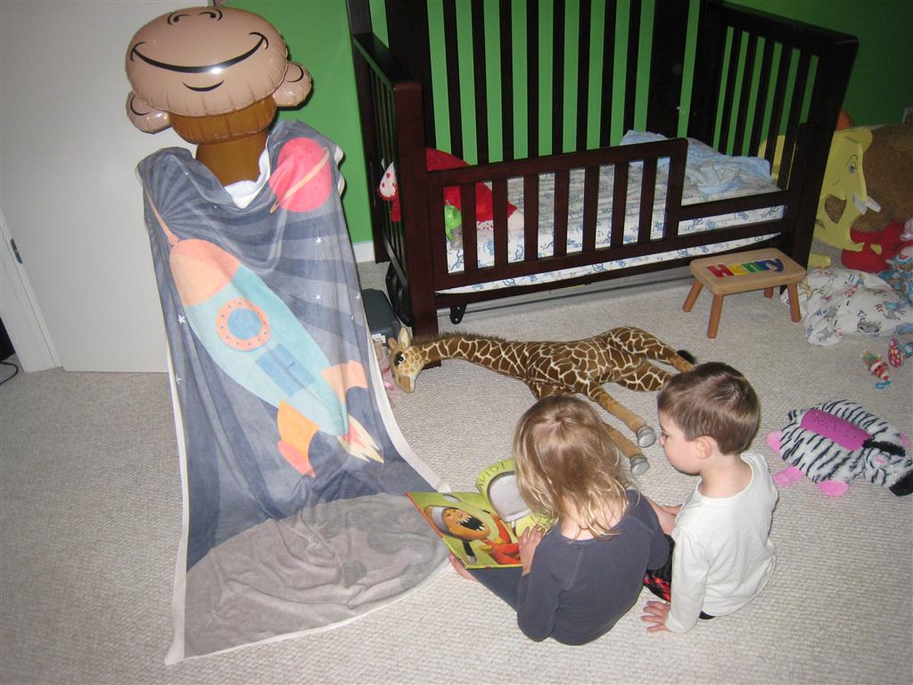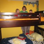 On Sunday Uncle B came over and set up an awesome matchbox car track, complete with launching ramp, tunnel, jump and landing zone. Grandma arrived in time for lunch and a trip to the bookstore, and then we added puffy paint fire to the space shuttle shirts that Grandma and Grandpa had given Eleanor and Henry. When she first got it, Eleanor had declared “I don’t like it because it doesn’t have fire” – hopefully the puffy paint will rectify that, but at any rate it was a fun art project.