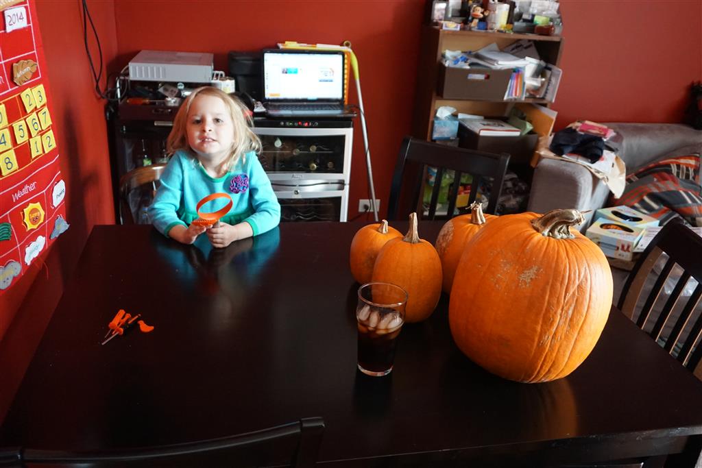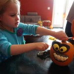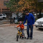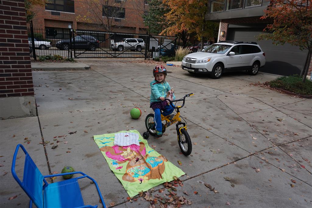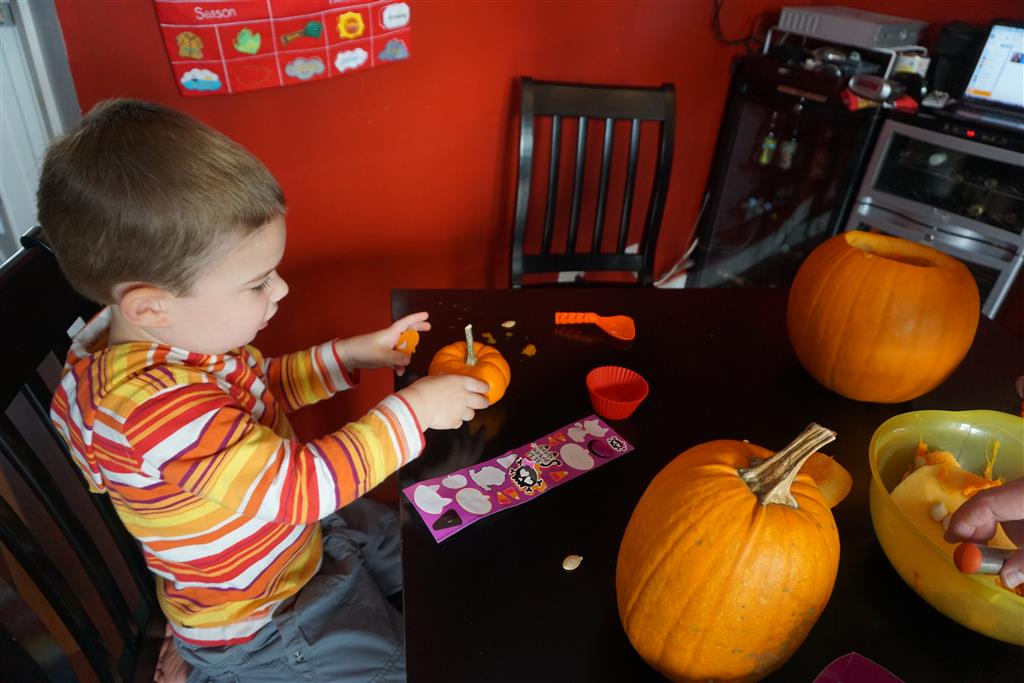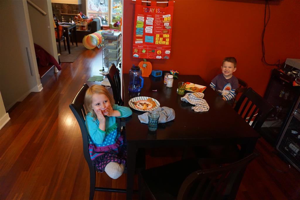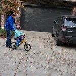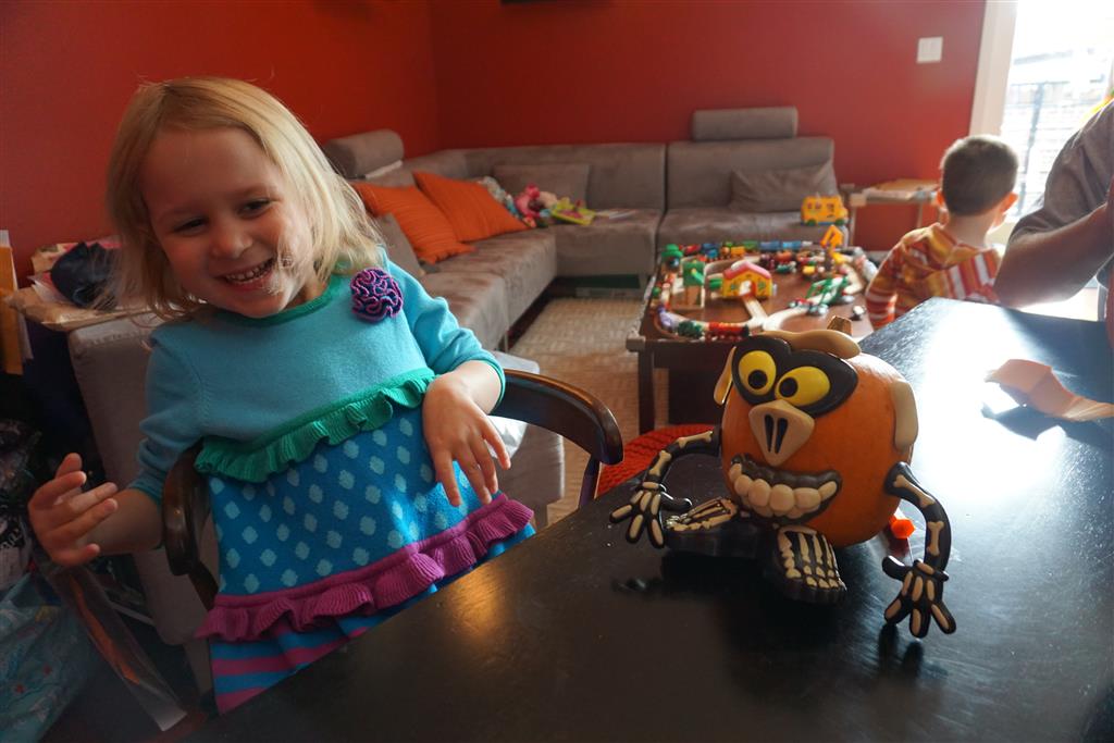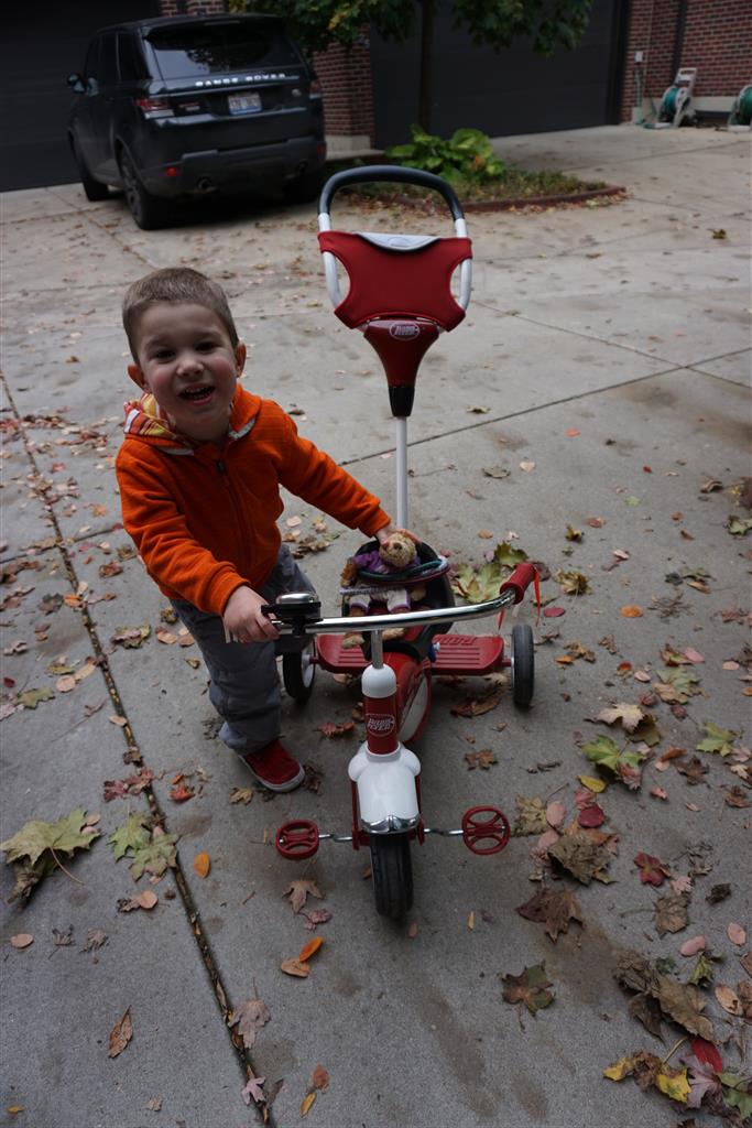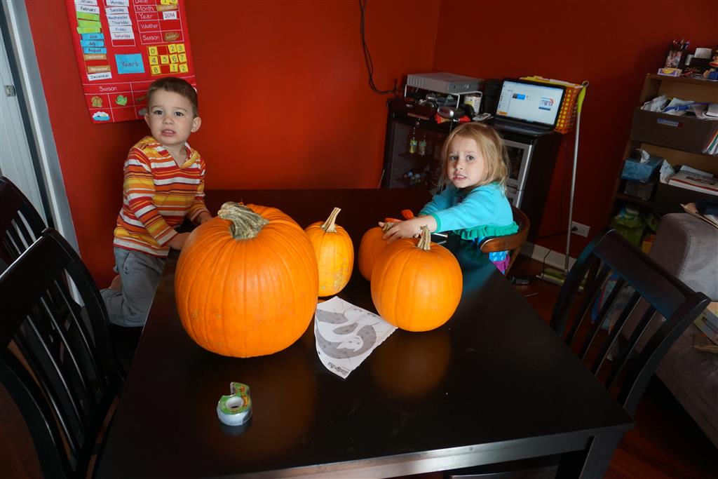 School and activities went really well this week, Eleanor and Henry really got back into the regular routine. Gymnastics class has really been a great addition, both kids love their respective days at the gym. This weekend Henry had his first birthday party for a classmate, at Pump It Up, of course. He had a blast, and it was really evident that attending so many of the parties for Eleanor’s classmates really helped him feel comfortable. On Sunday we carved up our pumpkins – Eleanor did the Mr. Potato Head decorations, Henry did stickers, Mom did a smiley face per both kids requests, and Dad tried a cat pattern that came with our pumpkin carving tool set. We also enjoyed some nice fall weather getting the bikes out in the driveway. Eleanor is starting to get a hang of the bike, and can get around the whole driveway all by herself except for the hill. Henry also likes to ride the bike, but prefers to hit the breaks and giggle when Dad is trying to push :) We also had a fun package arrive from Uncle B with space themed raincoat, umbrella and bath towel for Eleanor, and firefighter coat, umbrella and bath towel for Henry. Oh yeah – and Eleanor slept Friday night in her rocket ship tent!