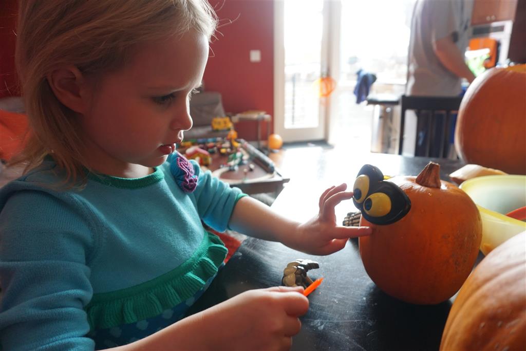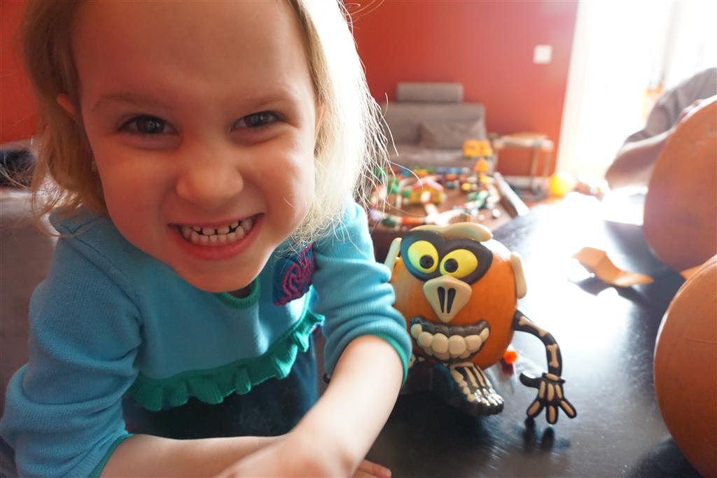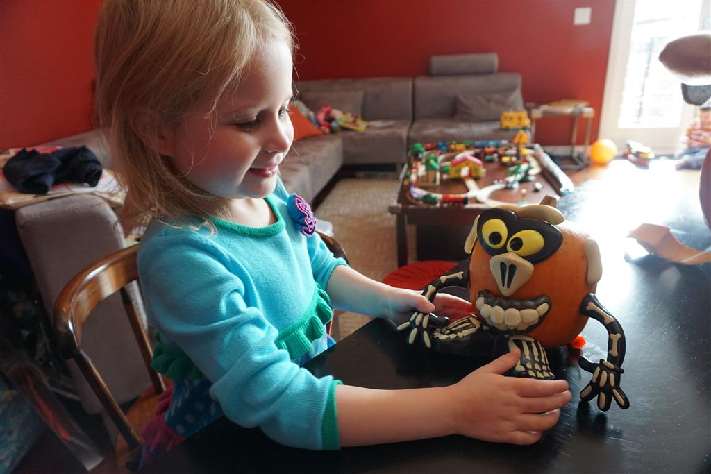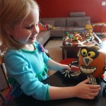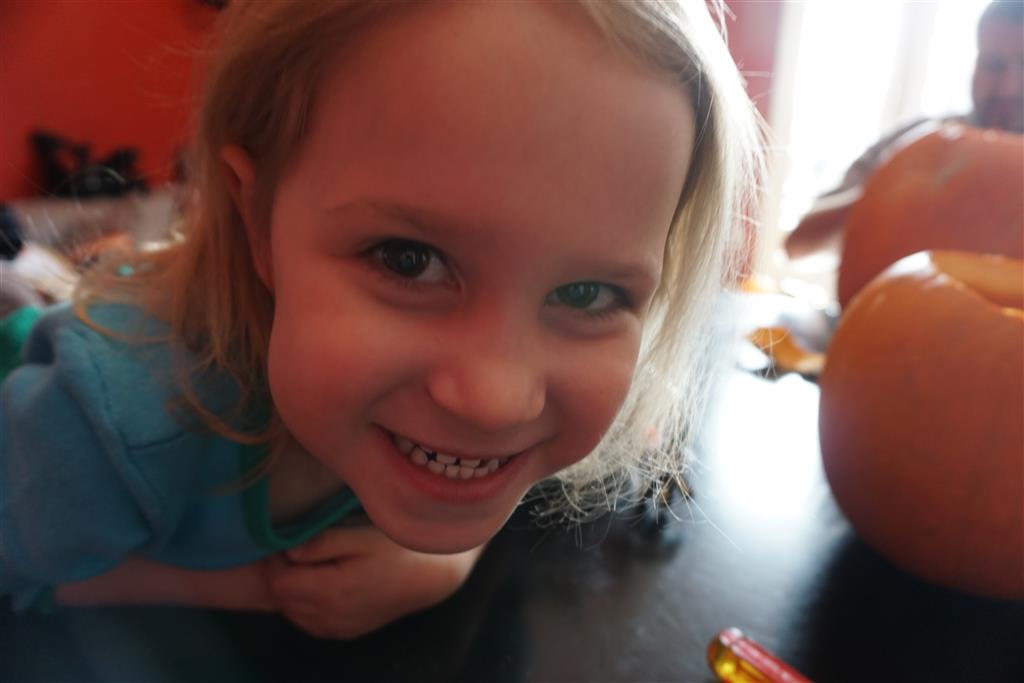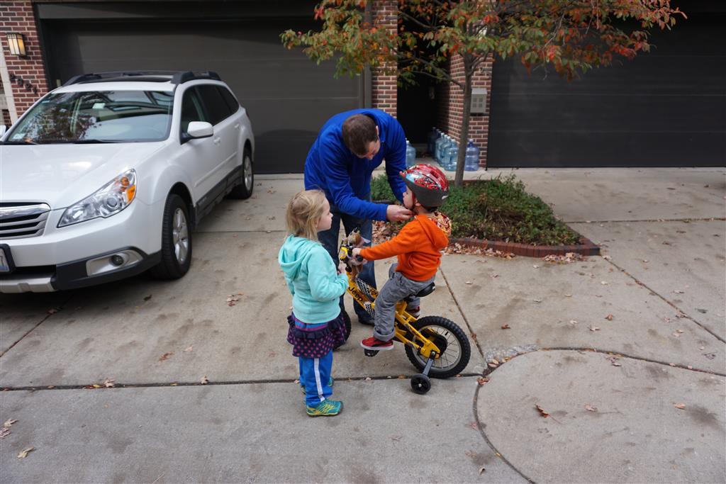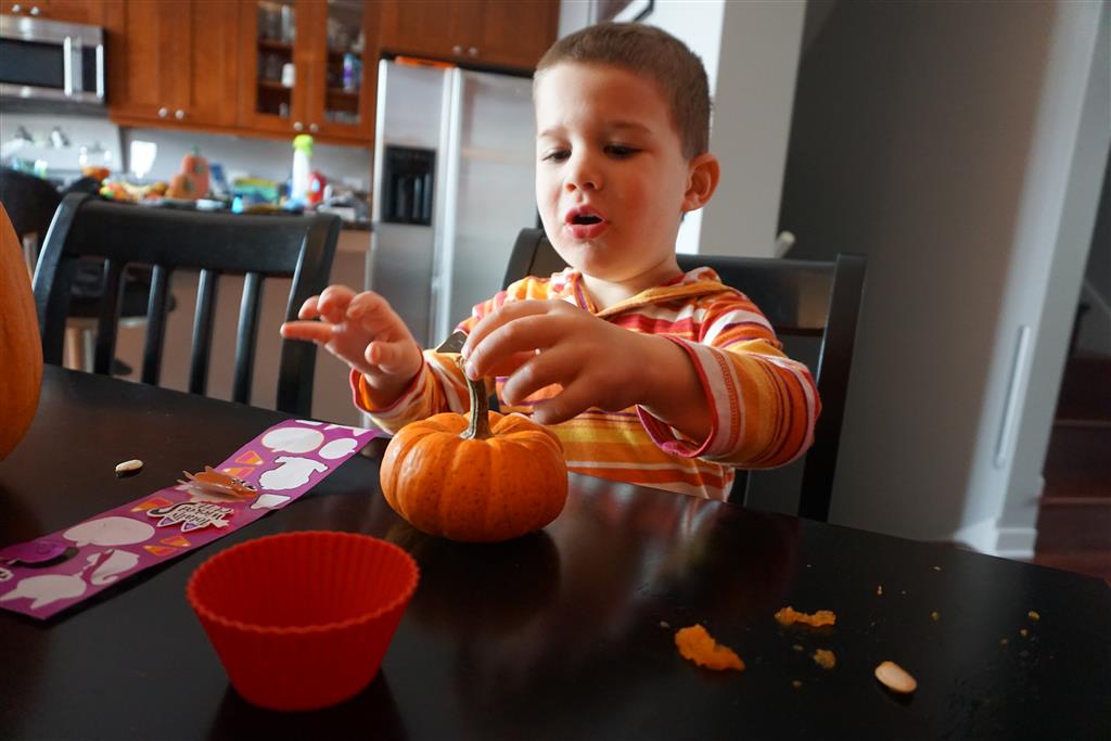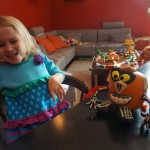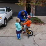 School and activities went really well this week, Eleanor and Henry really got back into the regular routine. Gymnastics class has really been a great addition, both kids love their respective days at the gym. This weekend Henry had his first birthday party for a classmate, at Pump It Up, of course. He had a blast, and it was really evident that attending so many of the parties for Eleanor’s classmates really helped him feel comfortable. On Sunday we carved up our pumpkins – Eleanor did the Mr. Potato Head decorations, Henry did stickers, Mom did a smiley face per both kids requests, and Dad tried a cat pattern that came with our pumpkin carving tool set. We also enjoyed some nice fall weather getting the bikes out in the driveway. Eleanor is starting to get a hang of the bike, and can get around the whole driveway all by herself except for the hill. Henry also likes to ride the bike, but prefers to hit the breaks and giggle when Dad is trying to push :) We also had a fun package arrive from Uncle B with space themed raincoat, umbrella and bath towel for Eleanor, and firefighter coat, umbrella and bath towel for Henry. Oh yeah – and Eleanor slept Friday night in her rocket ship tent!