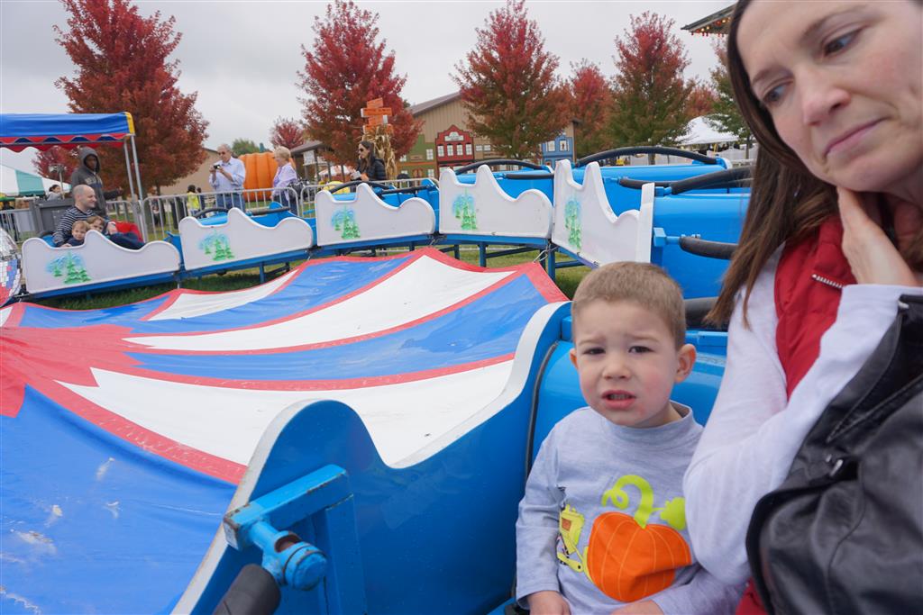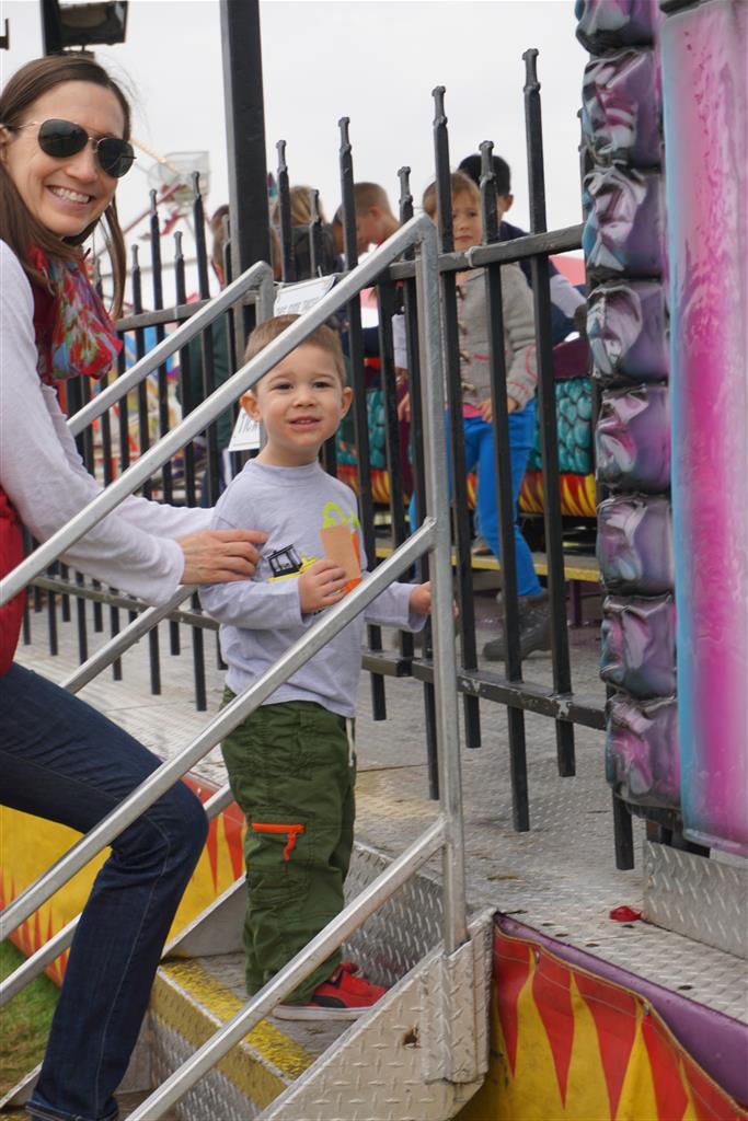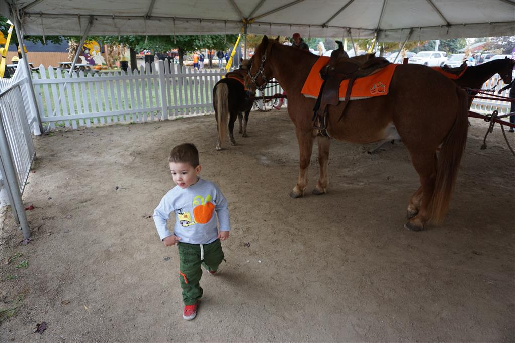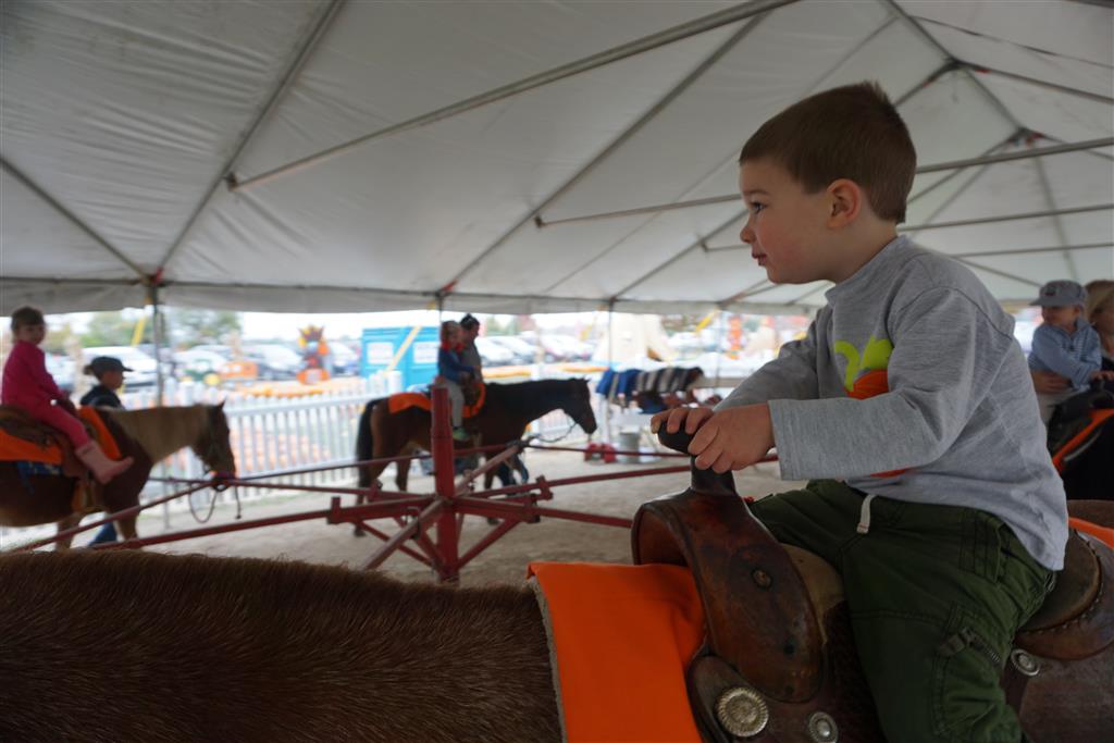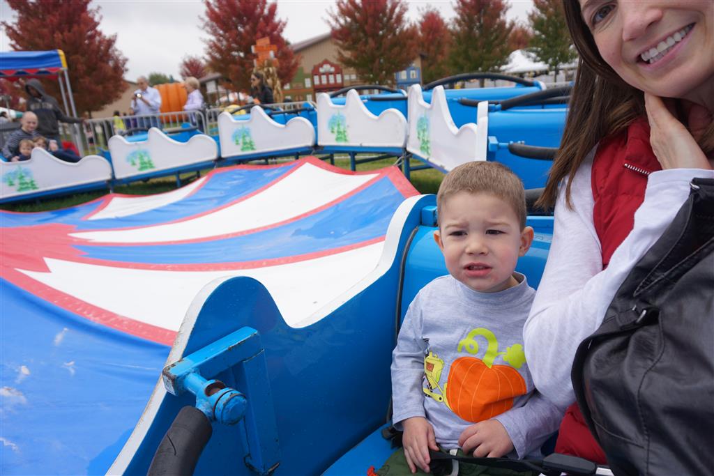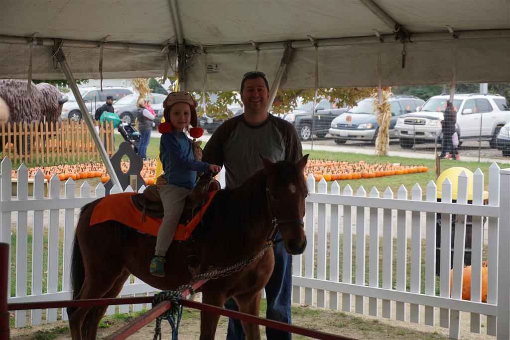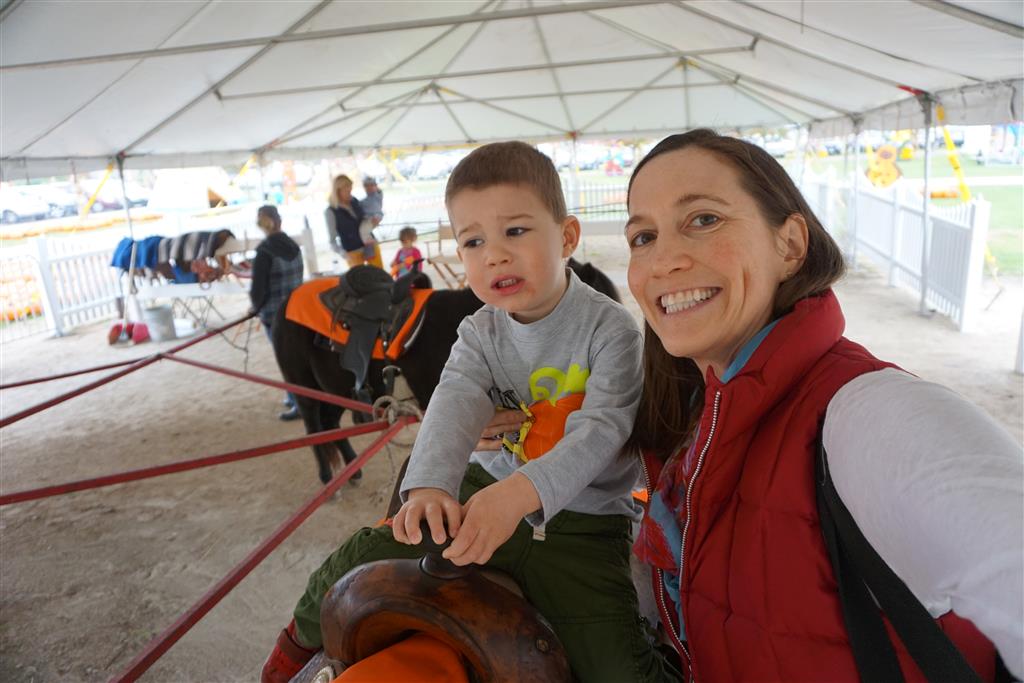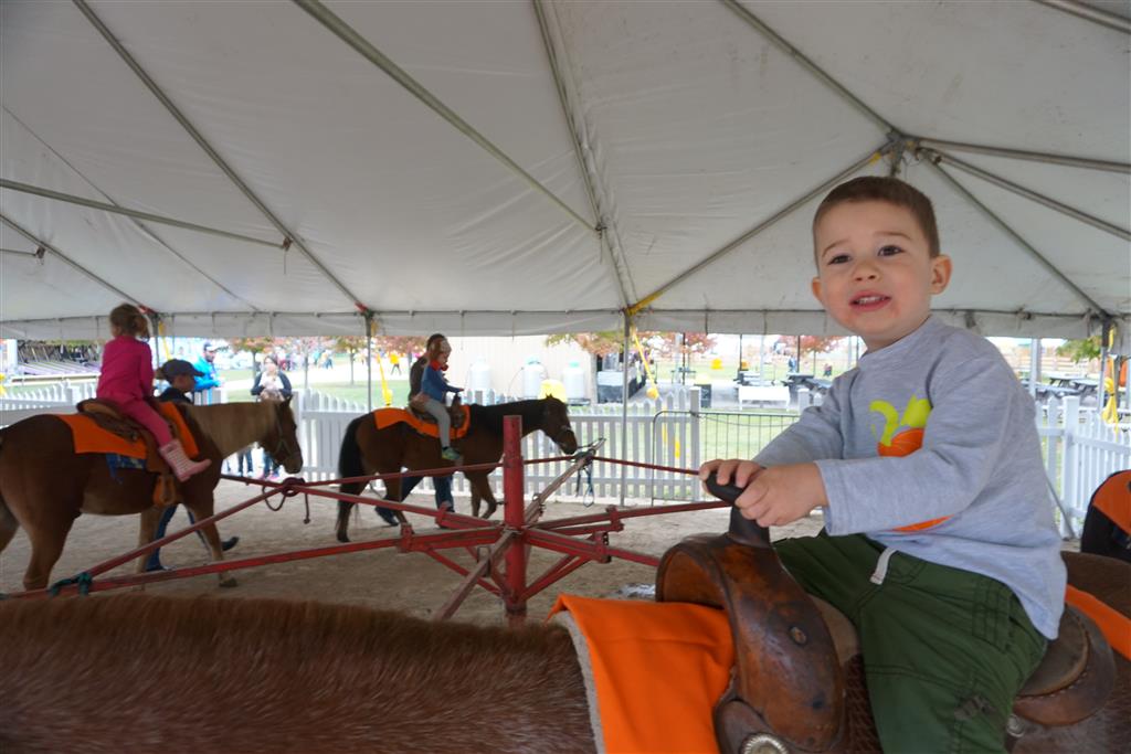 Eleanor and Henry started the week with our annual visit to the Dider Farms Pumpkin Festival. Both kids were super excited about the trip, they were looking forward to the pony rides and also to the train and rollercoaster. Henry got to ride on the same pony named “Jack” that he was so excited about last year, and Eleanor also picked the same pony “Jackson” that she rode last year. We also hit the super slide, the “Himalaya” ride, the strawberry ride, the circling cars, the train, the airplane ride, the tank ride, the frog ride, the rollercoaster, the funhouse and the camel ride. Eleanor didn’t want to do the rollercoaster again this year, but Henry was really excited about it. We were so proud of him as he bravely hoped on the ride all by himself and loved every loop. Eleanor hit the funhouse around ten times, which would have worked out to $30 worth of funhouse, but the woman working the door took a liking to Eleanor and sympathized with my ticket situation and gave us more than half of them for free. Eleanor declared the funhouse her favorite part, while Henry said the pony ride was his favorite. Henry’s least favorite was the frog ride – he was super excited to ride it with his big sis, but got a little scared – “the going down parts were a little scary” he said. He really wanted Eleanor to ride the rollercoaster with him, but Eleanor didn’t want to. The second ride that Eleanor wanted to do was the pumpkin shaped bouncy house, but when the operator told us Monkey would have to wait outside she got so sad and we ended up skipping it all together. All in all it was a great time though, and definitely worth it to see Henry’s proud smile as we let him carry the apple and pumpkin doughnuts out to the car.