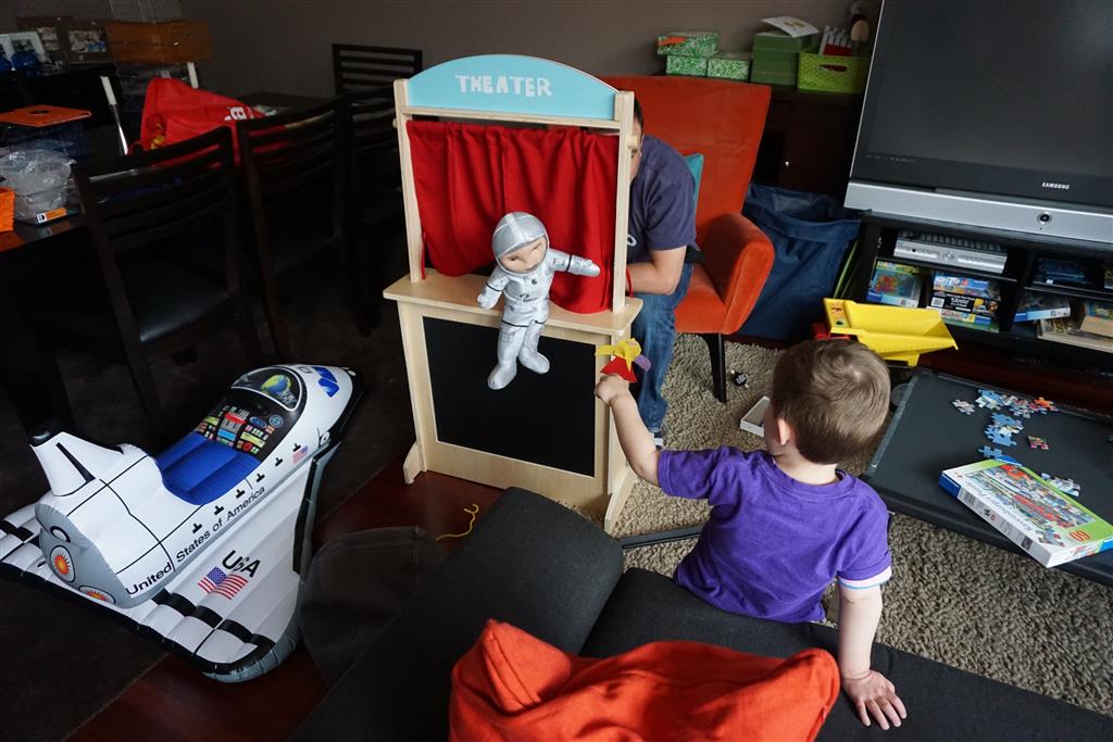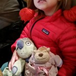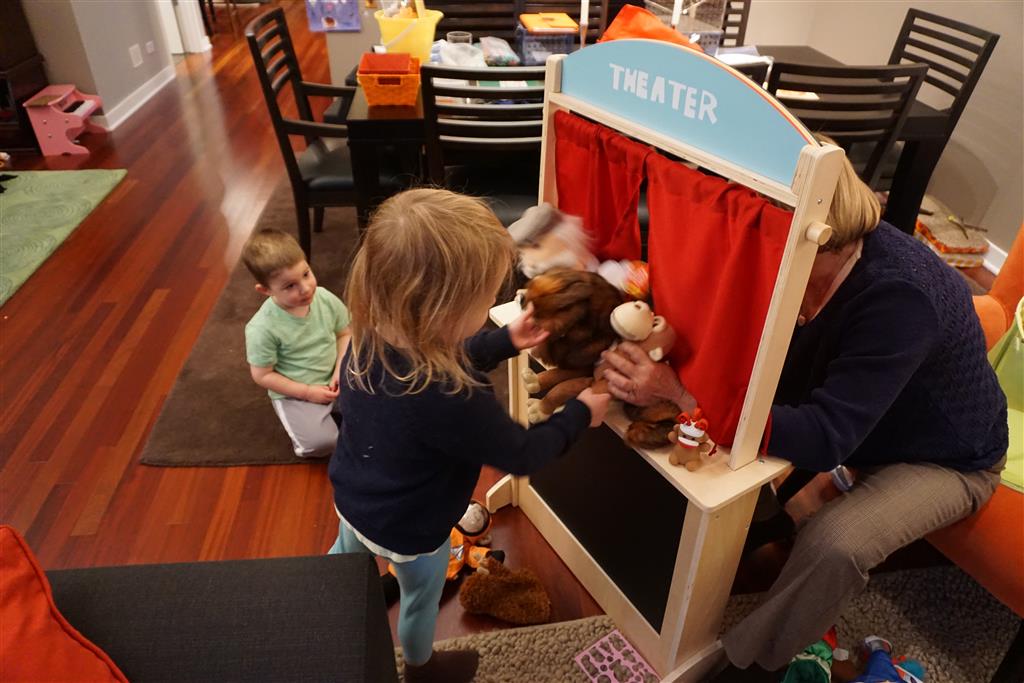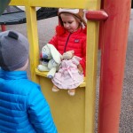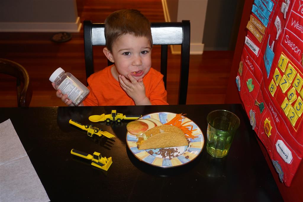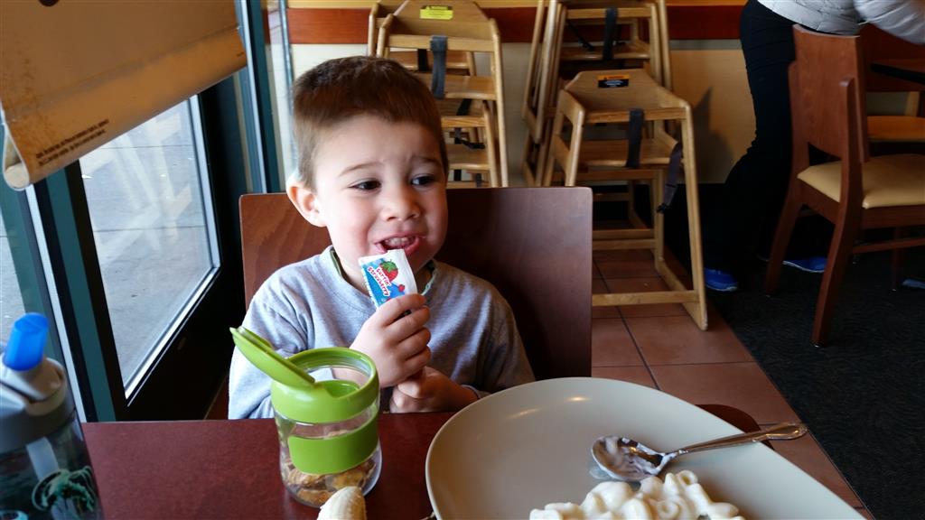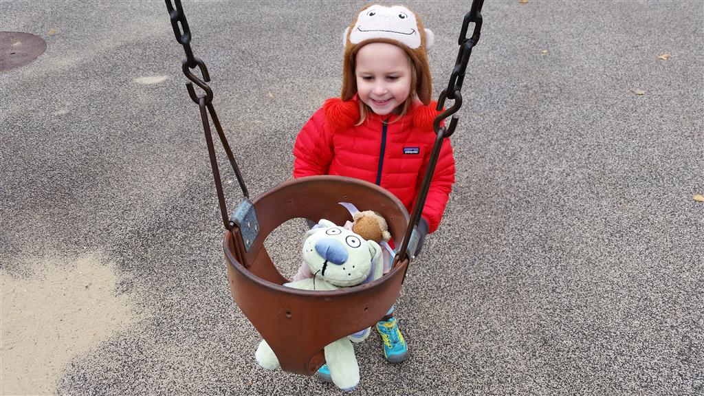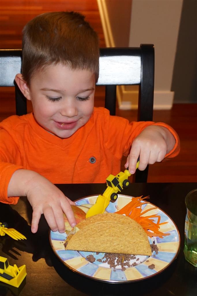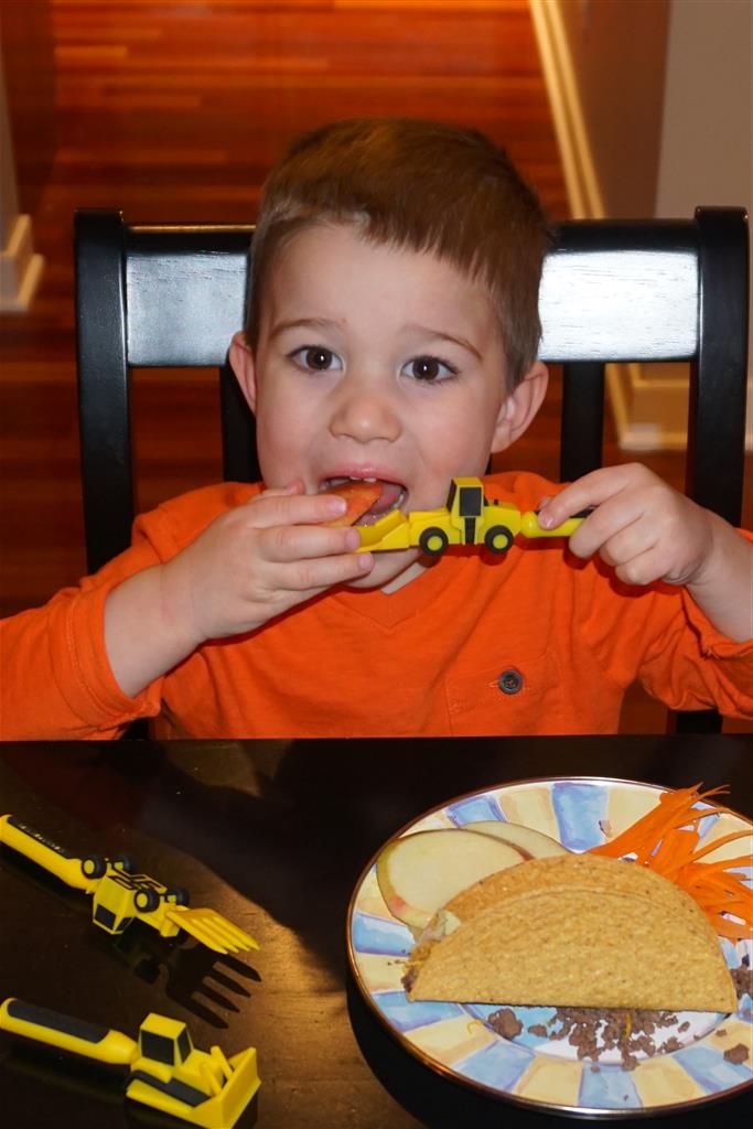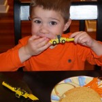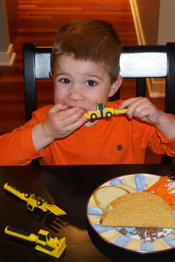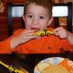 Eleanor and Henry enjoyed a visit from Grandma and Grandpa this weekend. Both kids really wanted to take Grandma and Grandpa to the planetarium, so that was first on our list on Saturday. Uncle B joined us and we had fun launching rockets, watching the Sesame Street movie, and exploring the rest of the great exhibits. After that, we headed to Smash Burger for a yummy lunch including milkshakes. Uncle B and Henry did a little “Lady and the Tramp” recreation with sweet potato fries instead of spaghetti. We spent the rest of the day relaxing and playing at home. The previous day we took Grandma and Grandpa to “Orange Swing Park” with the “Travelling Friend” from Eleanor’s school. This weekend was her turn to take the friend, and then on Tuesday she will get to take in pictures of the weekend and tell her class about all the fun activities that “Knuffle Bunny” joined in on. We got a fun surprise from Uncle B on Saturday, some new eating utensils in the form of construction vehicles. Henry really liked eating his taco and apple with the bulldozer pusher and excavator fork.
