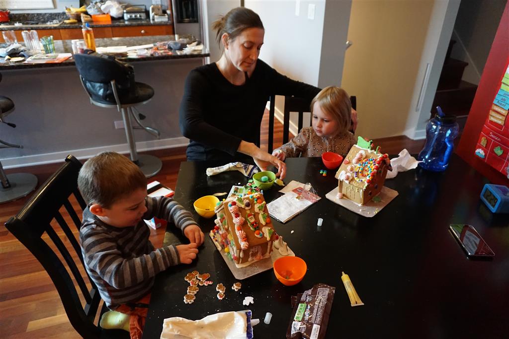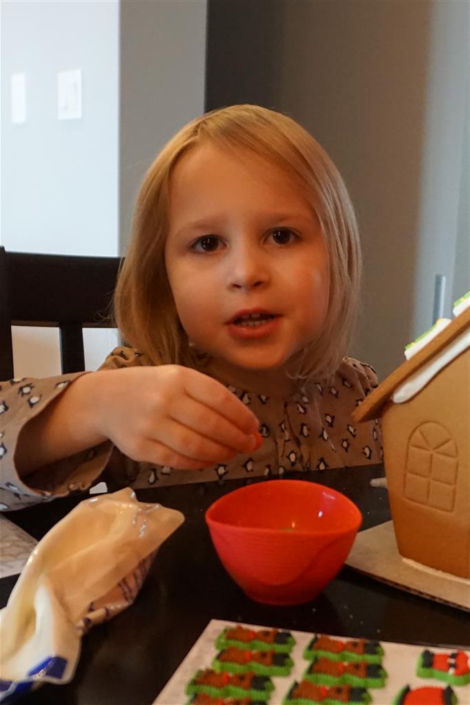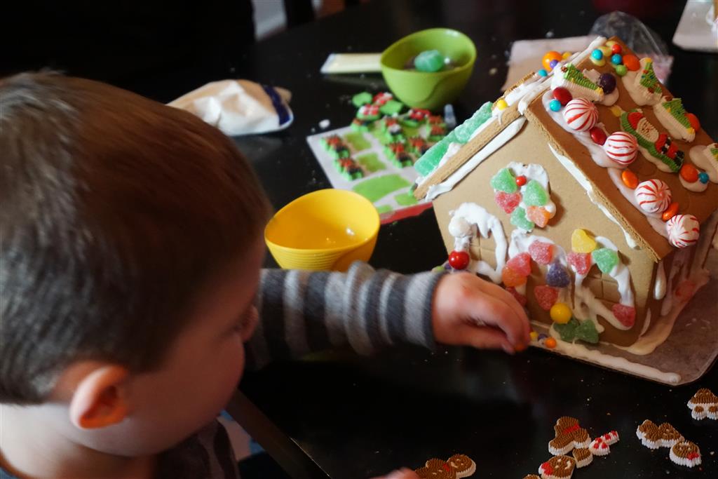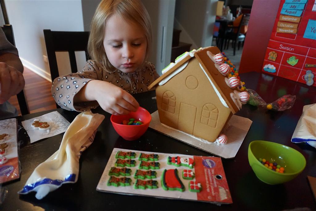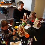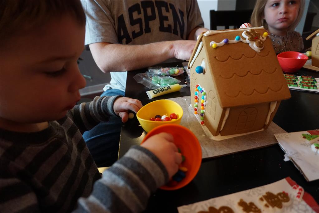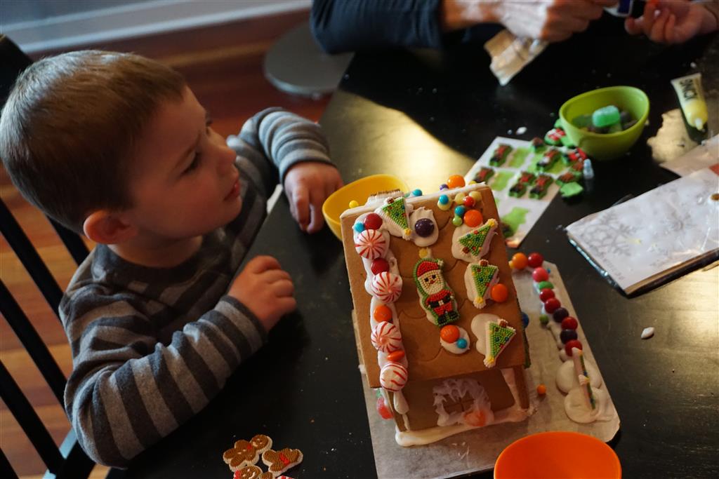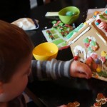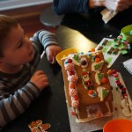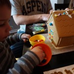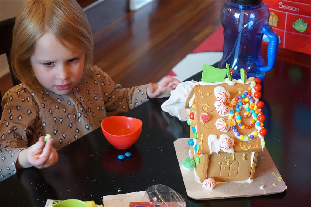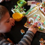 Saturday we did our annual ginger bread houses – and this year the house was pre-constructed! It was a bit of a purchasing mistake, but it actually worked out really well and then kids could just focus on decorating. You have to keep a close eye on Henry or else more of the decorations will end up in his tummy than on the house! We also had a fun visit from Uncle B, and Eleanor showed him the houses and our tree, and he and Henry played trains for a solid hour.