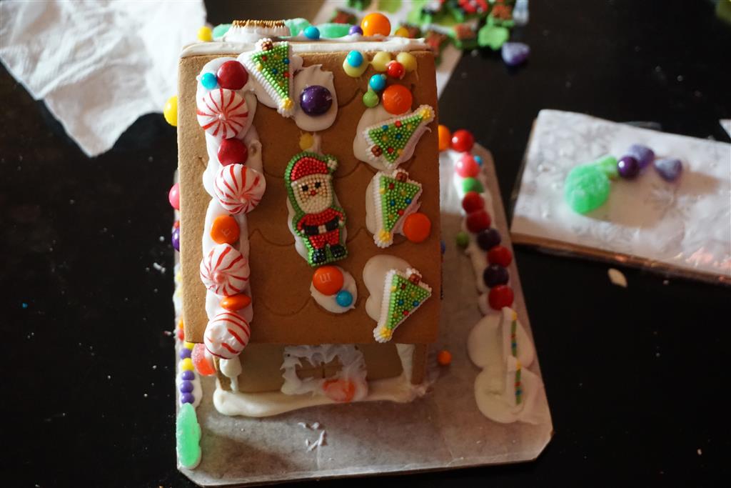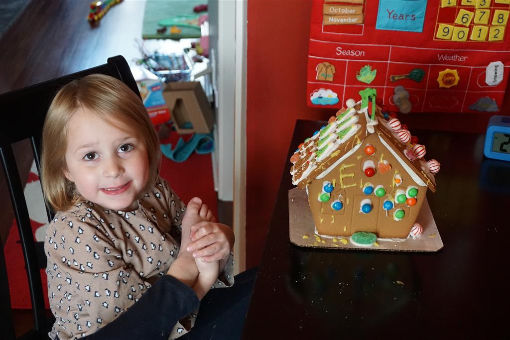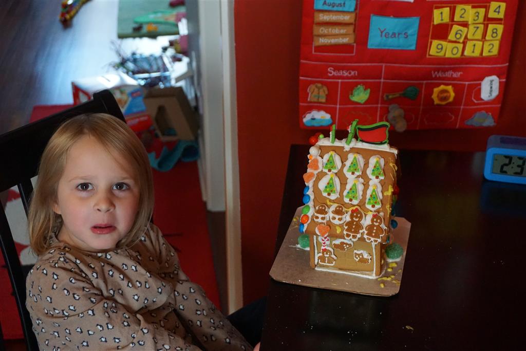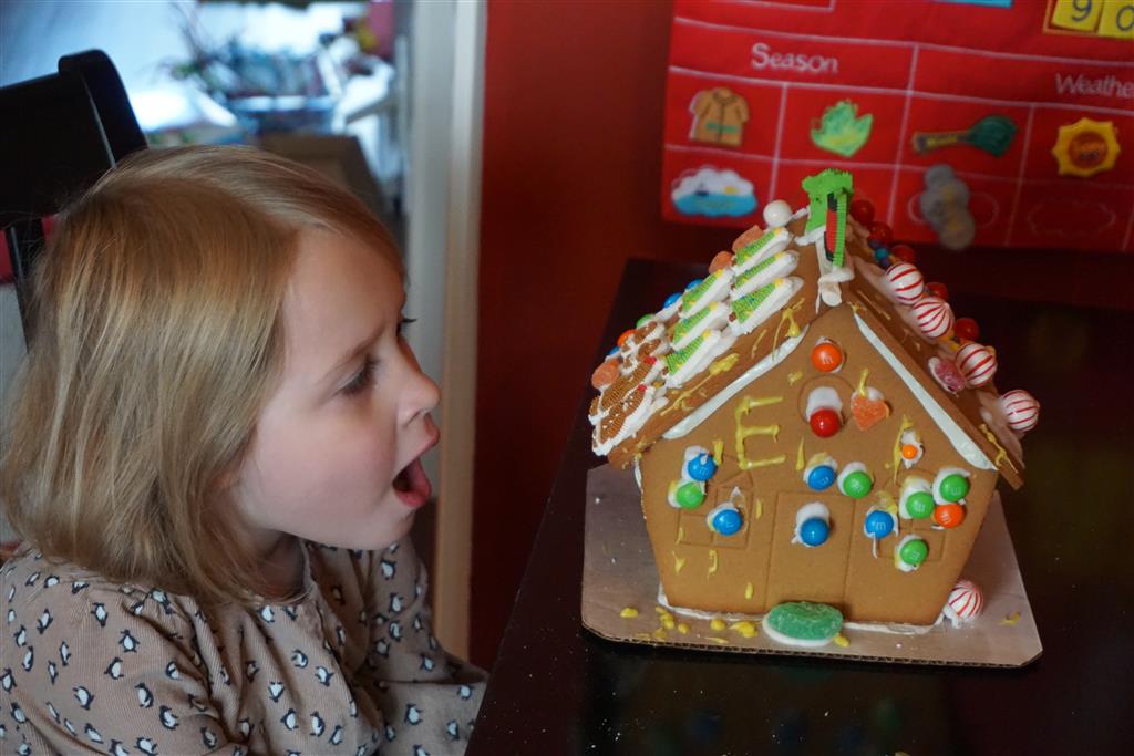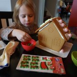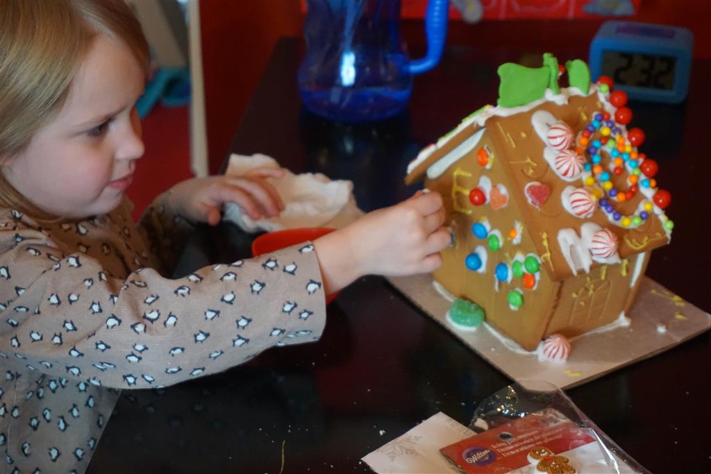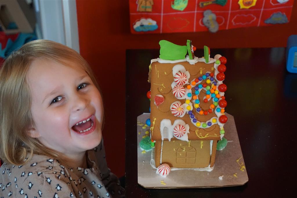 Saturday we did our annual ginger bread houses – and this year the house was pre-constructed! It was a bit of a purchasing mistake, but it actually worked out really well and then kids could just focus on decorating. You have to keep a close eye on Henry or else more of the decorations will end up in his tummy than on the house! We also had a fun visit from Uncle B, and Eleanor showed him the houses and our tree, and he and Henry played trains for a solid hour.