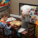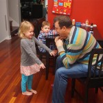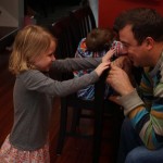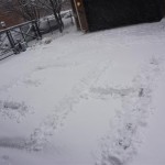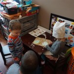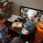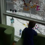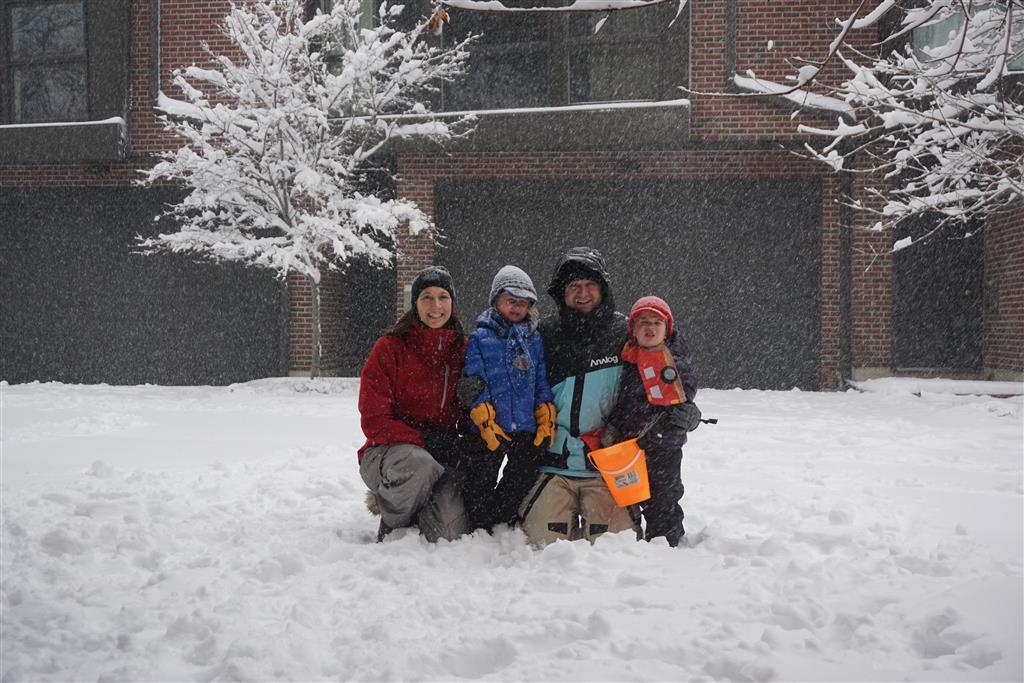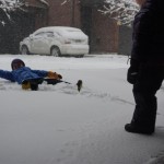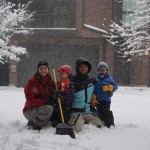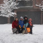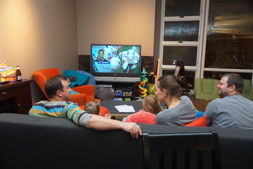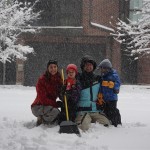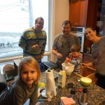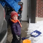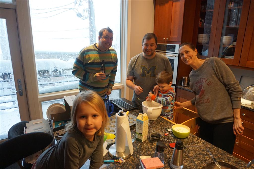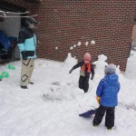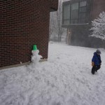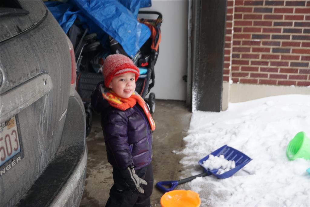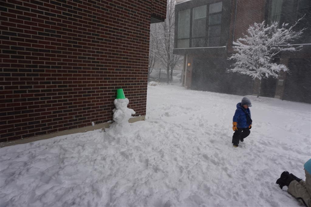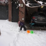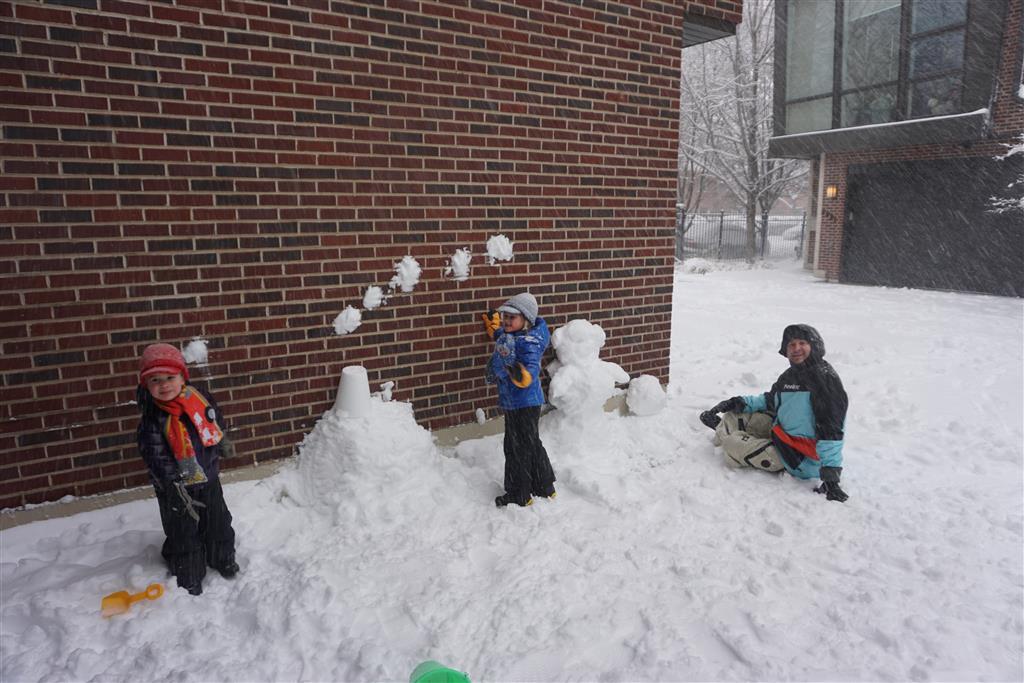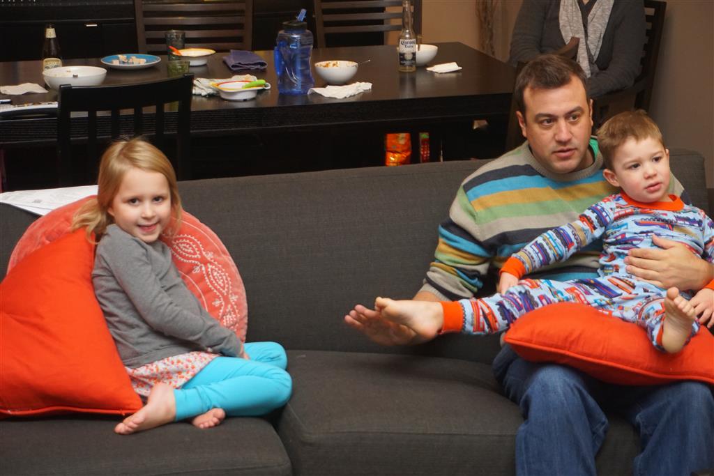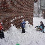 Henry and Eleanor capped off a fun week with a Super Bowl party. Lala and Uncle B came over, and we made our traditional chili dinner. Eleanor was especially excited about the prospect of watching football, and she and Henry were both glued to the TV for the first few minutes. She quickly started complaining that there was too much time between football (referring to the commercials and the commentary) and finally said, “We’ve been doing this for too long”, at which point we moved on to puzzles and games with the football on in the background. Neither of the kids were very into the chili, Eleanor only tried one bite before declaring it no good, and Henry made faces with each spoonful. They did enjoy the chips, oyster cracker and cornbread muffins. Prior to the game we had lots of fun in the snow, with about a foot of excellent snowman making snow arriving the previous night. We had a snow monkey, snow train and snow bunny, and Eleanor spend a good half hour just shoveling snow.