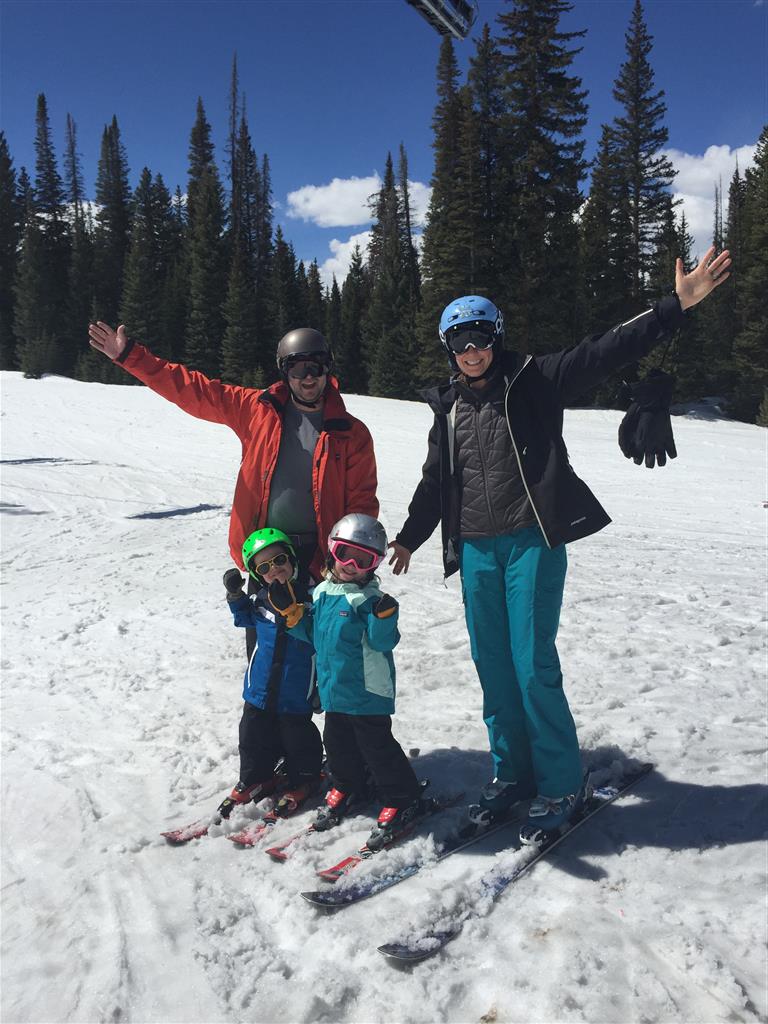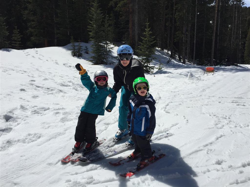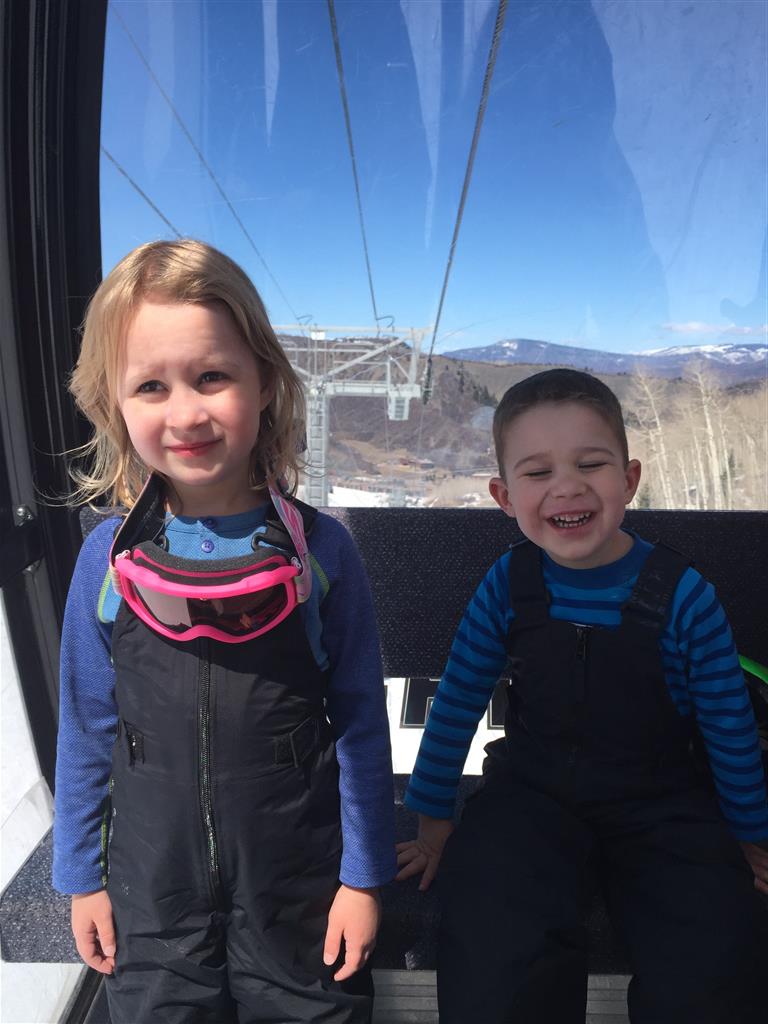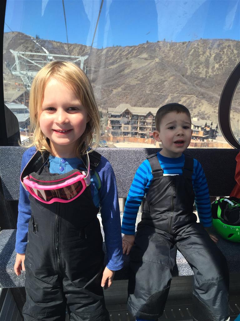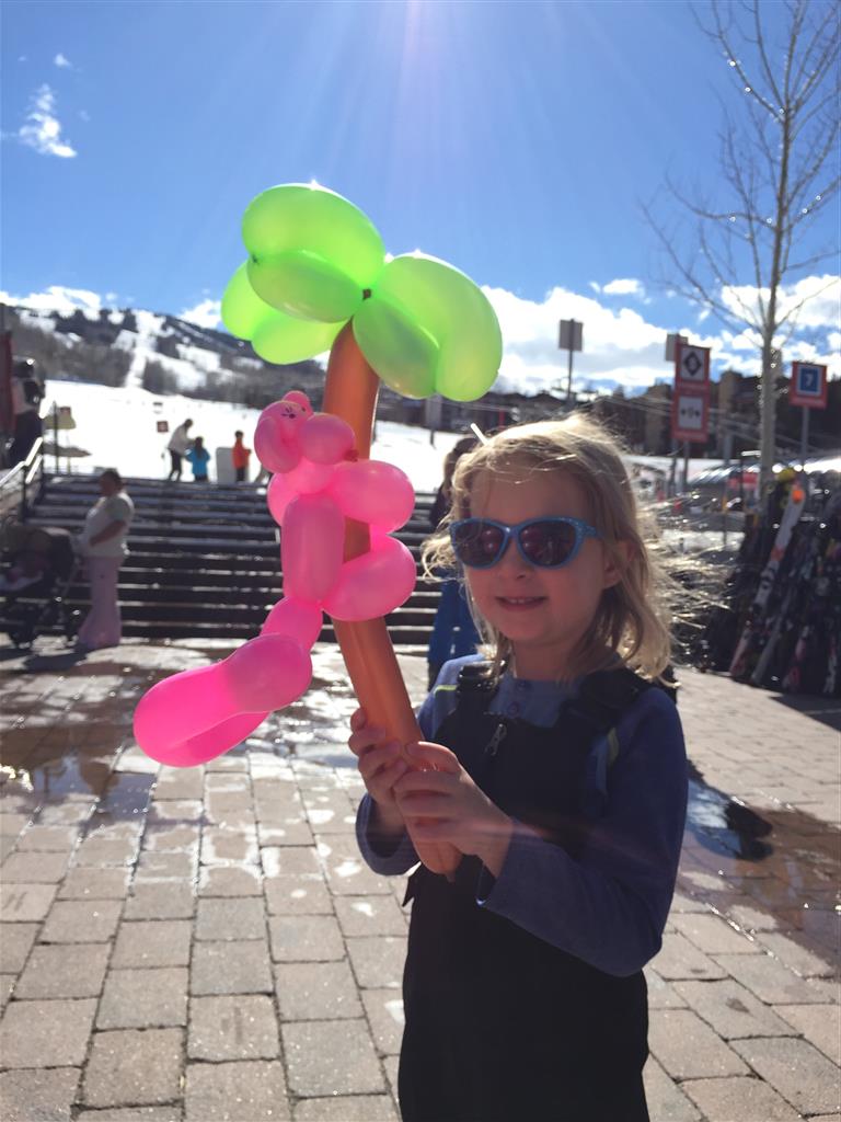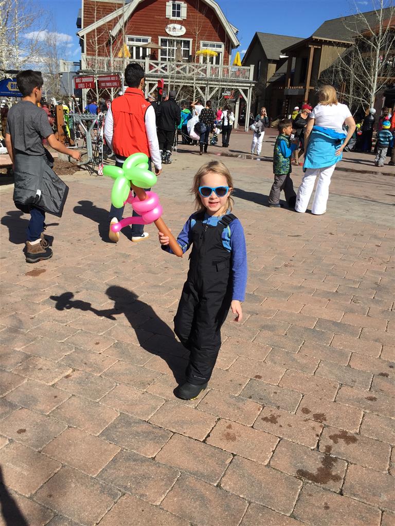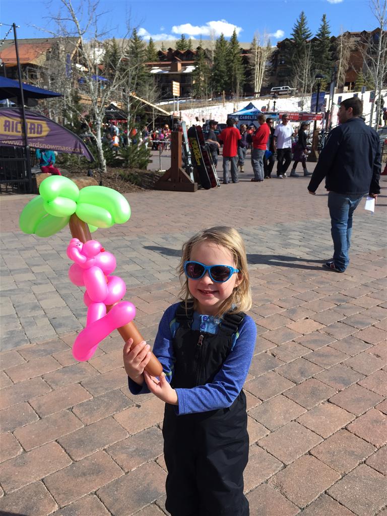 Eleanor and Henry hit the slopes this week for some spring skiing. They have both tried skiing before, but this year was the first time that they really seemed to “get” it. By the second day, they were both coming down the bunny hill with minimal help, and by the end Eleanor was had totally conquered it. She could get down the hill all by herself, making awesome “s” turns and turning to a stop at the bottom. Henry had good balance and could make turns by himself, but sometimes got a little distracted and needed some help slowing down. They were both really excited about riding the chair lift, and by the end they were both getting off without falling. We had a couple of great instructors, and Eleanor really opened up to both of them, telling them all about her school, her cousins and her stuffed friends. She and Henry apparently loved to sing songs while riding the chair lift. Mom, Dad and Lala and Uncle B got to ski a few runs with the kiddos, and it was awesome to see how excited they were. From the top of the lift, they both announced “Follow Me!” and took off down the hill! Eleanor had been a bit apprehensive about the ski trip, but one night she described the trip like this, “I thought it was going to be the worst day ever, but it turned out to be the best day ever!”. In addition to skiing, the kids got to go tubing down the hill, and enjoyed a really fun climbing gym at the bottom of the mountain. One night, we went back up the mountain for dinner and smores, and Henry slid down a covered tube slide that dumped him out so he slid across the snow. One day after skiing, there was a clown doing “free” balloon animals, and of course Eleanor and Henry both wanted one. Thirty minutes later, they each had a cool balloon monkey in a tree. Eleanor requested a pink monkey, and Henry initially requested a train, but when the clown couldn’t do that, he asked for a brown monkey. We also got to meet up with Aunt Jane, cousin Adam, and soon-to-be-cousin-in-law Begonia for a relaxing carry out dinner.