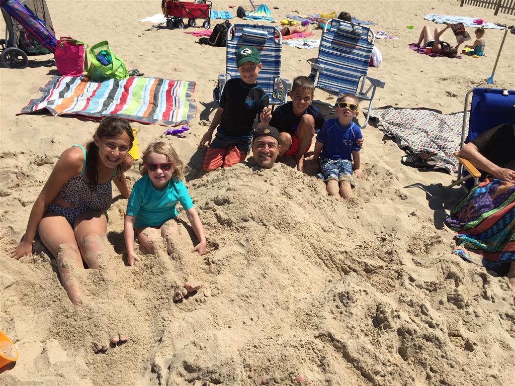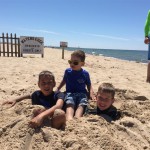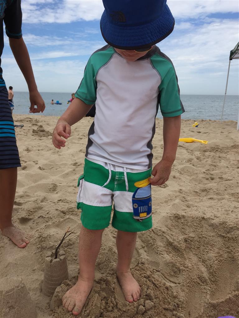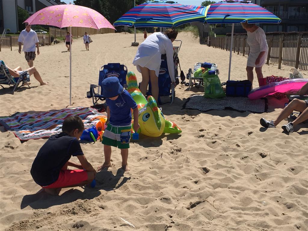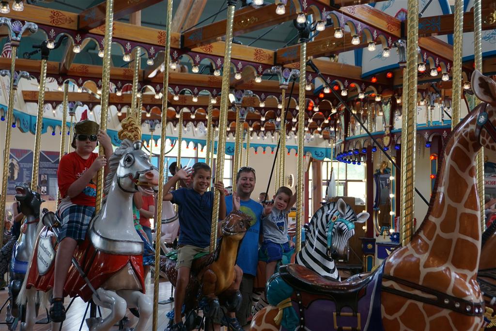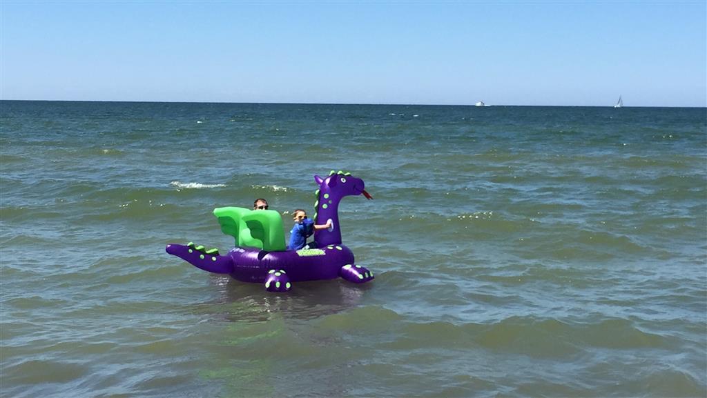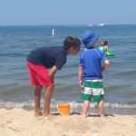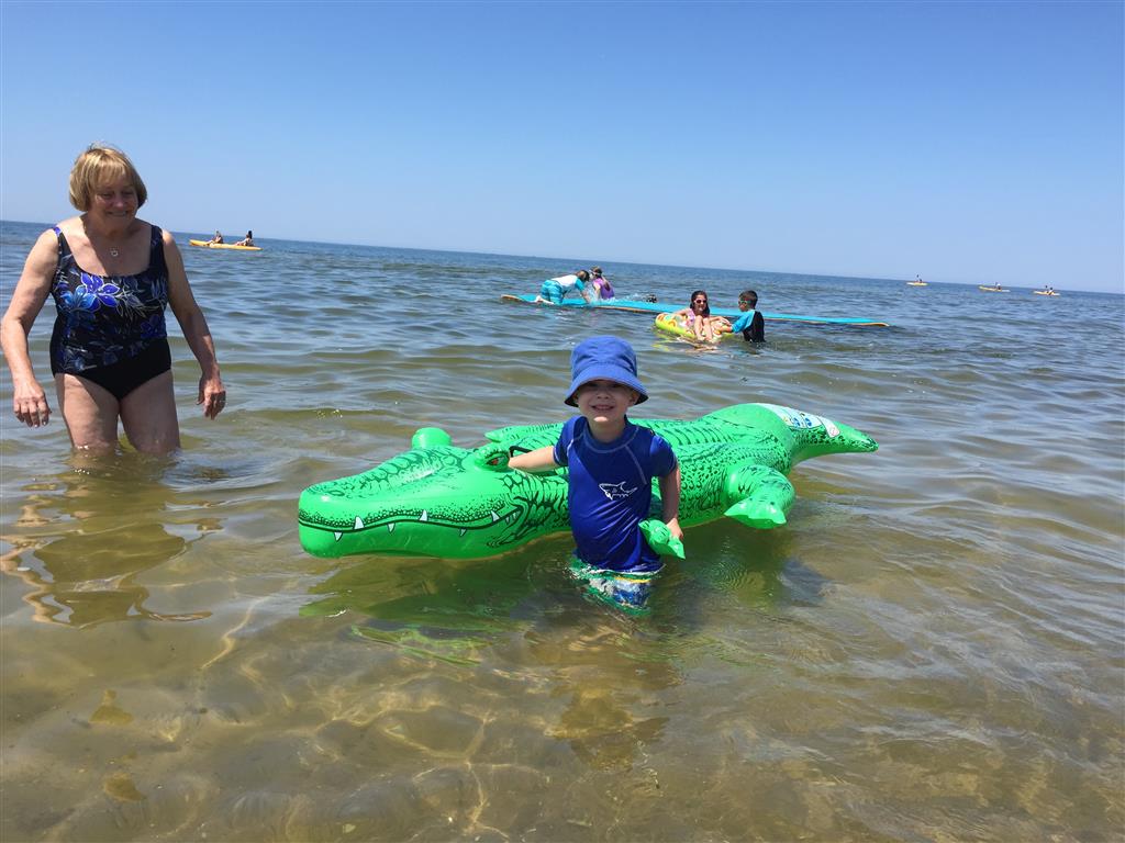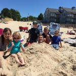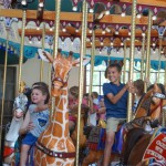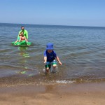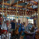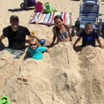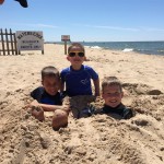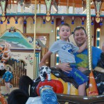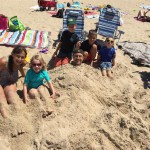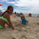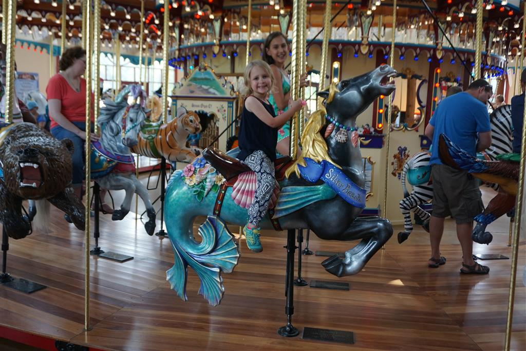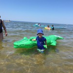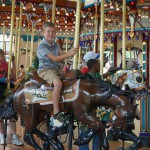 Eleanor and Henry had a fantastic trip to the beach this week with Grandma, Grandpa, Mackenzie, Jack, Ben, Auntie Susan, Uncle Gabe and Uncle B. Both kids ended up having a lot of fun in the water, which was great to see. Eleanor really liked riding on the inflatable dragon with Mackenzie, and also did some swimming by herself with her arm floaties on. Henry didn’t spend as much time on the rafts, but loved running in and out of the waves and on the second to last day got comfortable enough to swim by himself with his floaties on. We also had lots of fun building and burying in the sand, and made a trip to see the carousel. I asked the kids what their favorite part of the trip was, and Eleanor said “Playing dolls with Mackenzie”, and Henry said “Having a sleepover with Jack and Ben”. While Elanor slept with Mackenzie all week, Henry slept with Mom for the first part of the week. We decided to finally give him a shot at sleeping in the same room as Jack and Ben – and it turned out to be quite the crazy event. They had so much fun that Mom and Dad had to keep coming down to remind them to get some sleep. Finally, after a spilled water bottle necessitated a change of sheets, we had to get a threaten an end to the sleepover. Fortunately, they got right to sleep after that – and Auntie Susan heard Henry say as he woke up the next morning, “Jack, we made it! We had a sleepover!”.