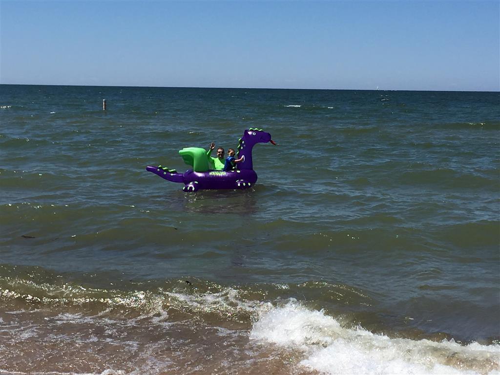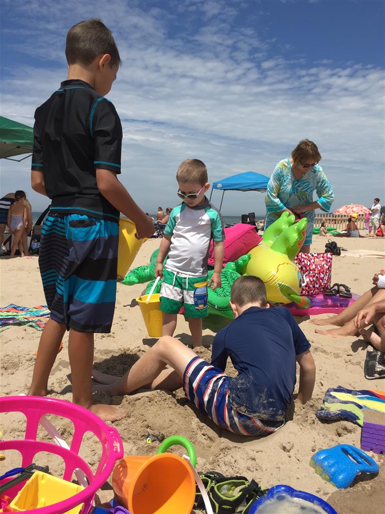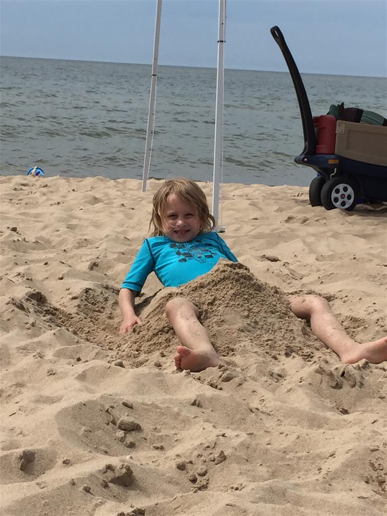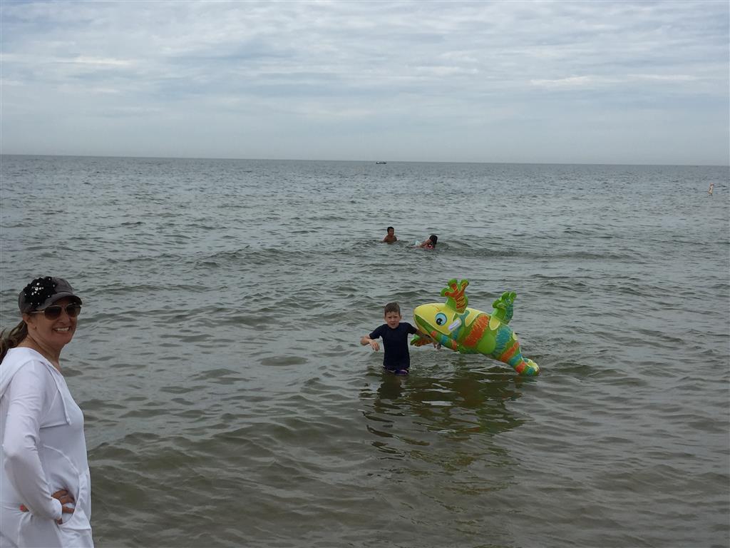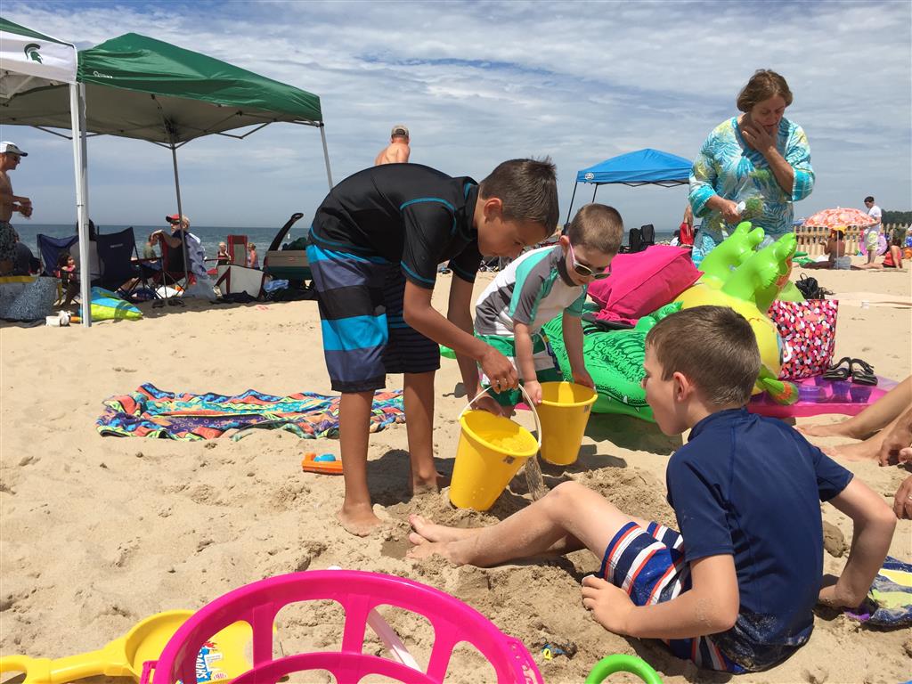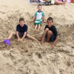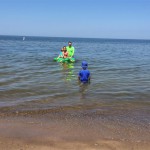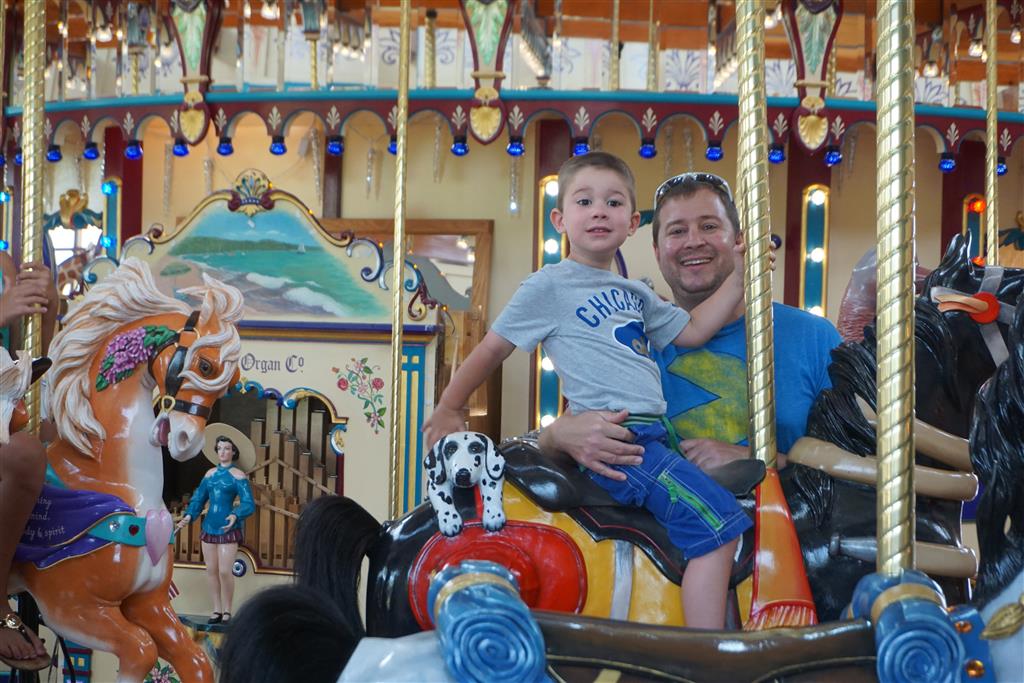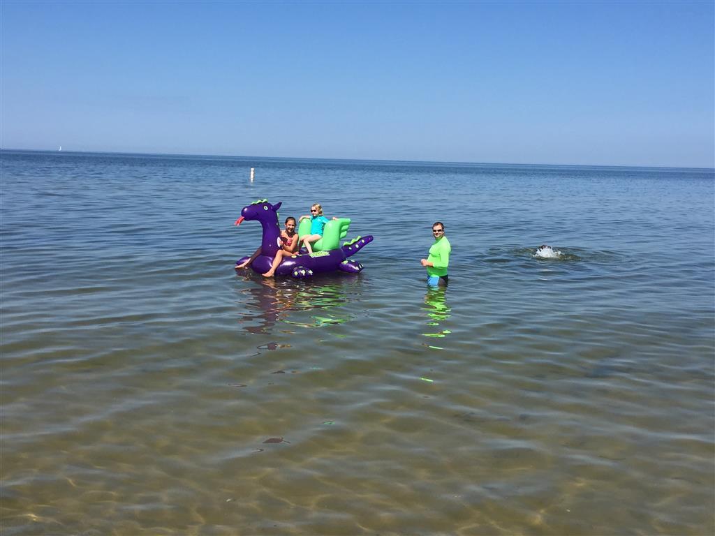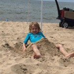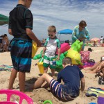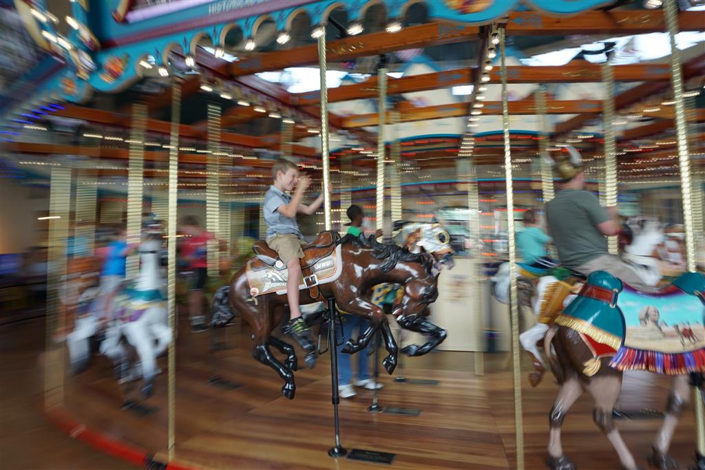 Eleanor and Henry had a fantastic trip to the beach this week with Grandma, Grandpa, Mackenzie, Jack, Ben, Auntie Susan, Uncle Gabe and Uncle B. Both kids ended up having a lot of fun in the water, which was great to see. Eleanor really liked riding on the inflatable dragon with Mackenzie, and also did some swimming by herself with her arm floaties on. Henry didn’t spend as much time on the rafts, but loved running in and out of the waves and on the second to last day got comfortable enough to swim by himself with his floaties on. We also had lots of fun building and burying in the sand, and made a trip to see the carousel. I asked the kids what their favorite part of the trip was, and Eleanor said “Playing dolls with Mackenzie”, and Henry said “Having a sleepover with Jack and Ben”. While Elanor slept with Mackenzie all week, Henry slept with Mom for the first part of the week. We decided to finally give him a shot at sleeping in the same room as Jack and Ben – and it turned out to be quite the crazy event. They had so much fun that Mom and Dad had to keep coming down to remind them to get some sleep. Finally, after a spilled water bottle necessitated a change of sheets, we had to get a threaten an end to the sleepover. Fortunately, they got right to sleep after that – and Auntie Susan heard Henry say as he woke up the next morning, “Jack, we made it! We had a sleepover!”.