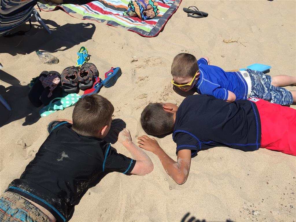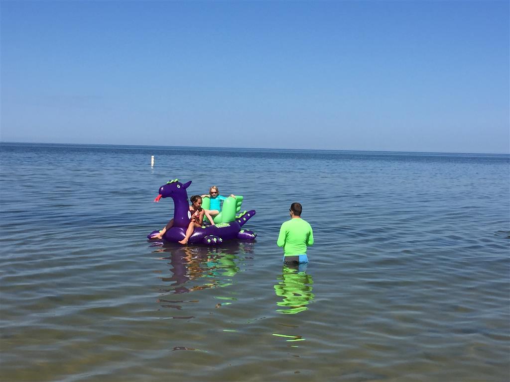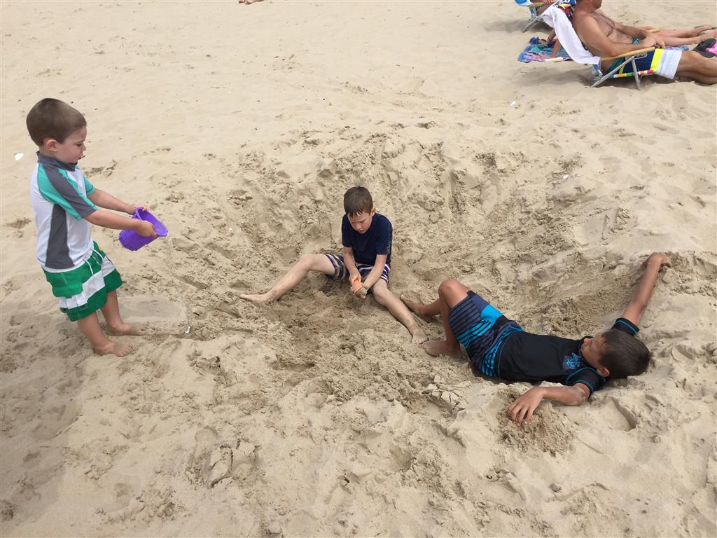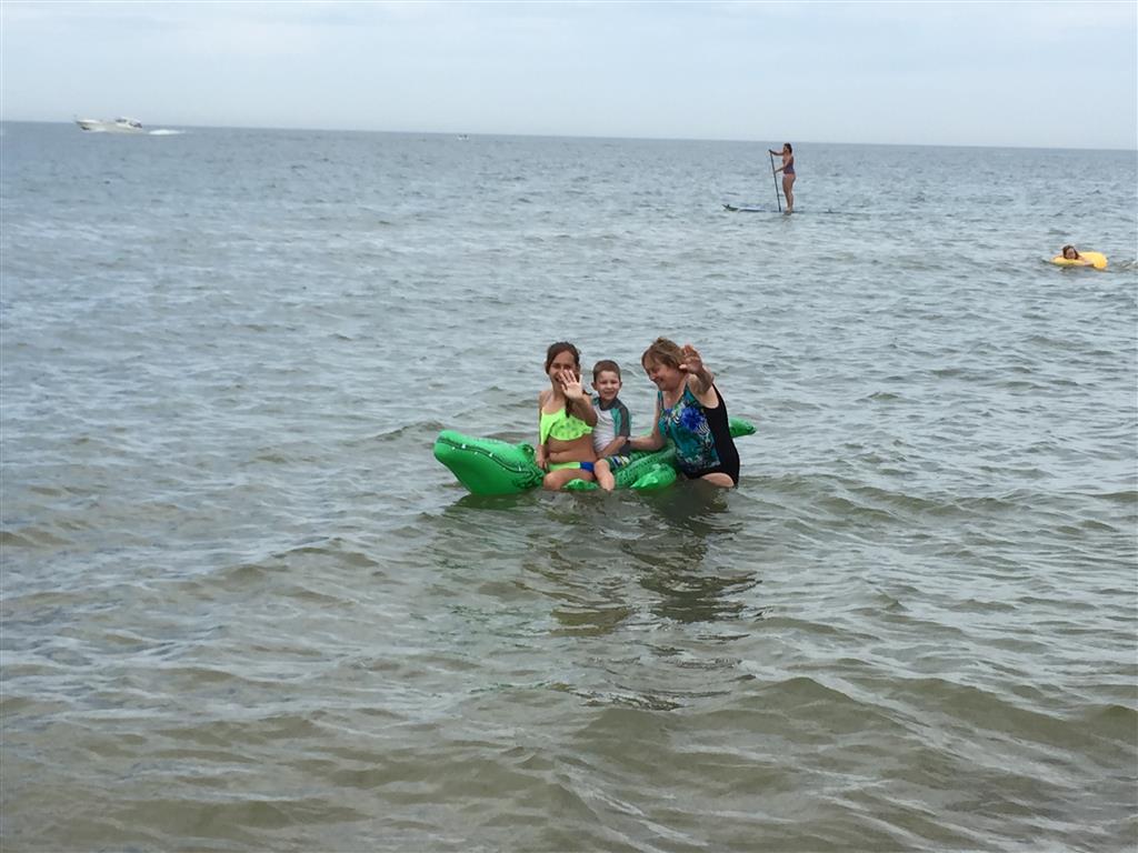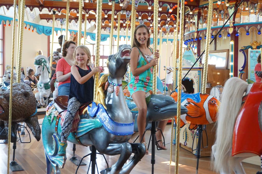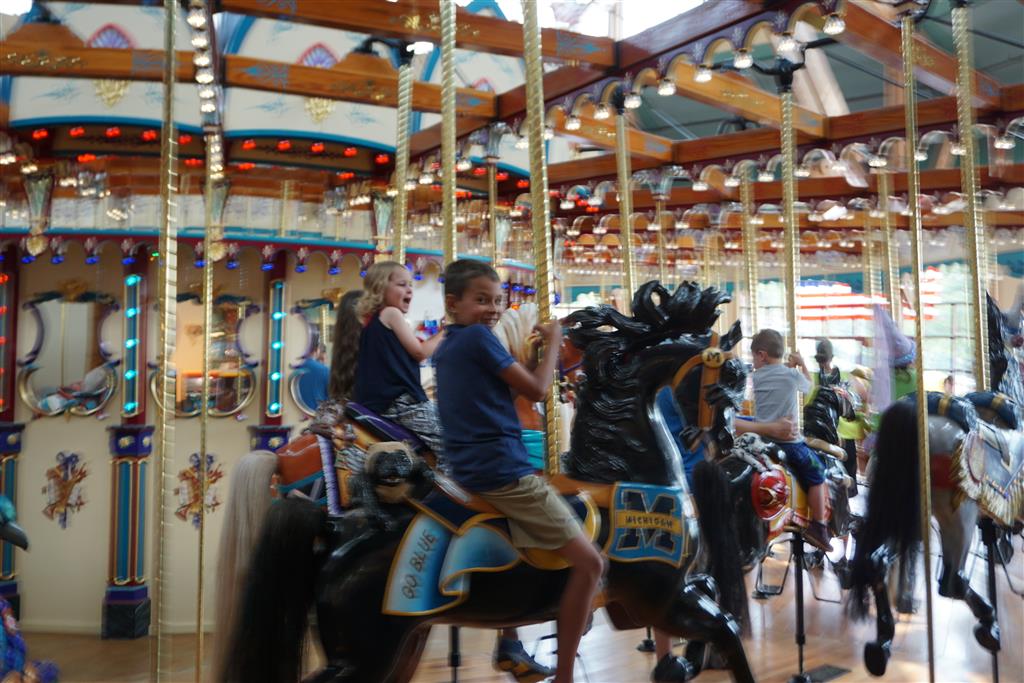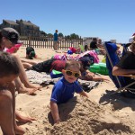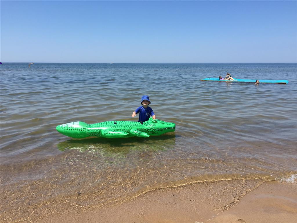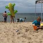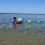 Eleanor and Henry had a fantastic trip to the beach this week with Grandma, Grandpa, Mackenzie, Jack, Ben, Auntie Susan, Uncle Gabe and Uncle B. Both kids ended up having a lot of fun in the water, which was great to see. Eleanor really liked riding on the inflatable dragon with Mackenzie, and also did some swimming by herself with her arm floaties on. Henry didn’t spend as much time on the rafts, but loved running in and out of the waves and on the second to last day got comfortable enough to swim by himself with his floaties on. We also had lots of fun building and burying in the sand, and made a trip to see the carousel. I asked the kids what their favorite part of the trip was, and Eleanor said “Playing dolls with Mackenzie”, and Henry said “Having a sleepover with Jack and Ben”. While Elanor slept with Mackenzie all week, Henry slept with Mom for the first part of the week. We decided to finally give him a shot at sleeping in the same room as Jack and Ben – and it turned out to be quite the crazy event. They had so much fun that Mom and Dad had to keep coming down to remind them to get some sleep. Finally, after a spilled water bottle necessitated a change of sheets, we had to get a threaten an end to the sleepover. Fortunately, they got right to sleep after that – and Auntie Susan heard Henry say as he woke up the next morning, “Jack, we made it! We had a sleepover!”.