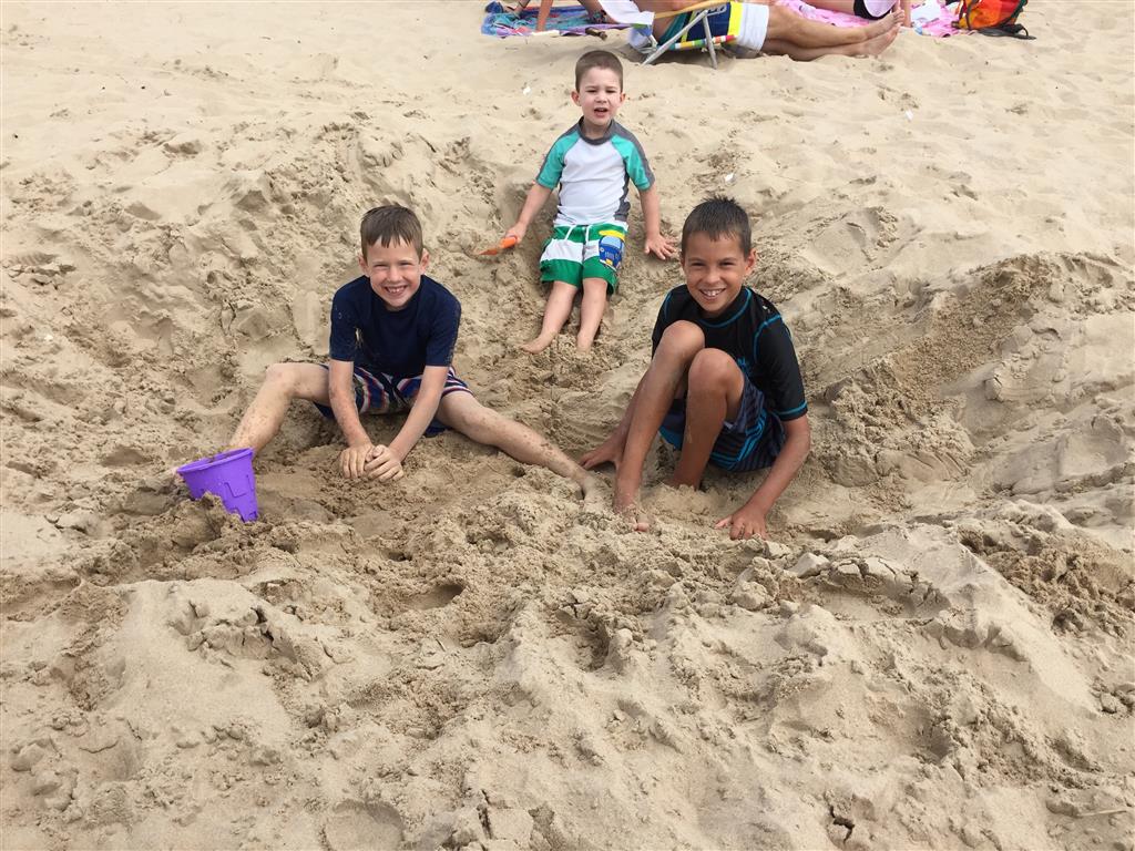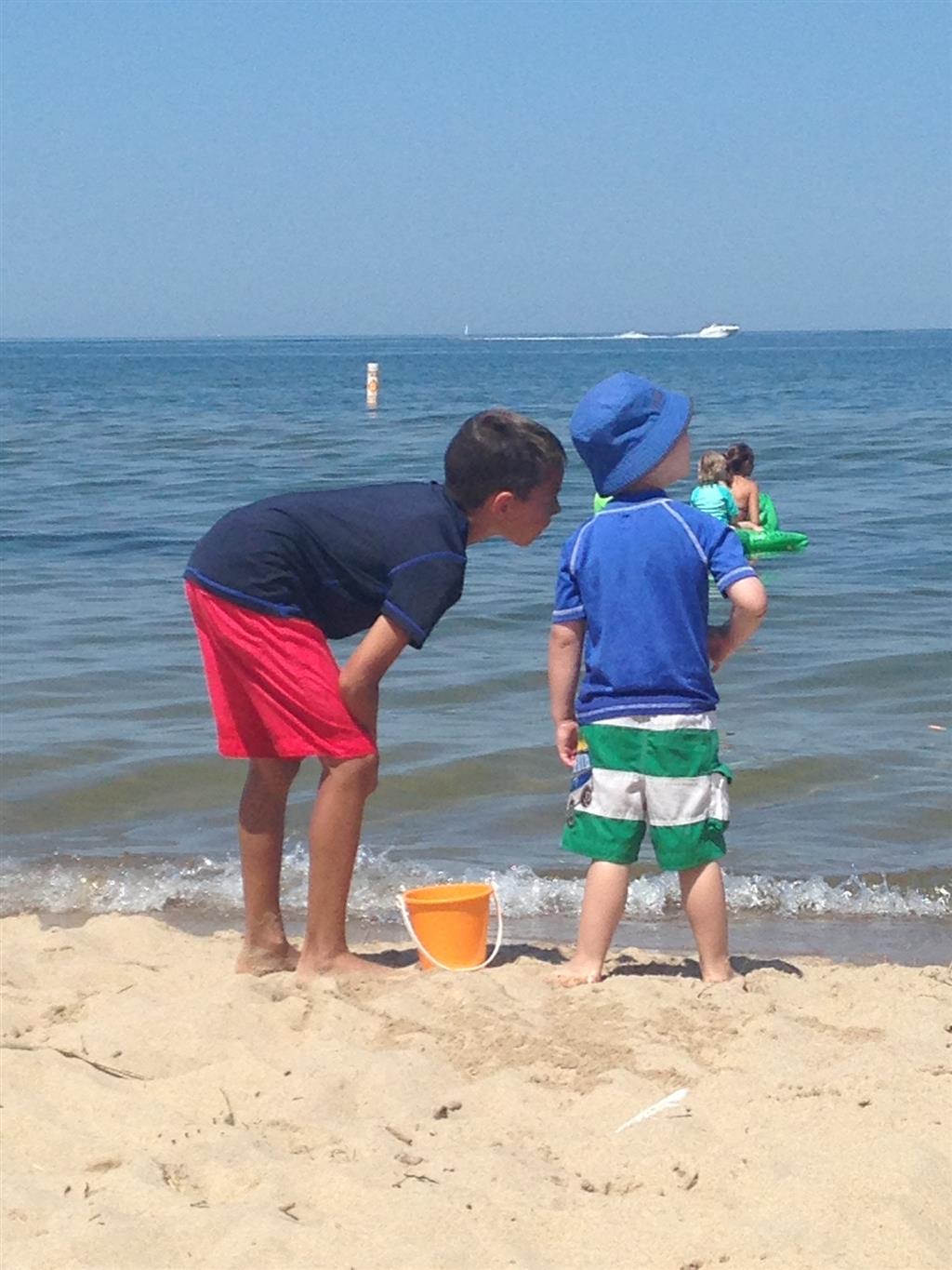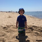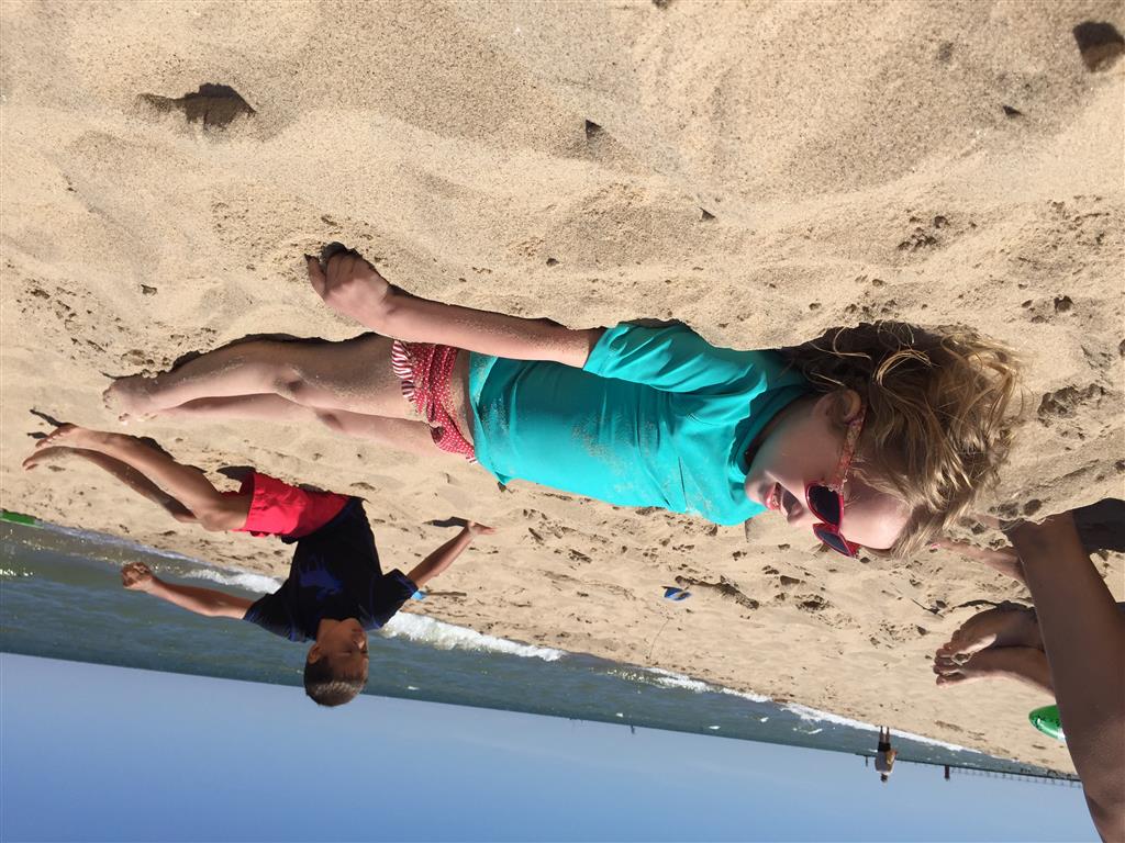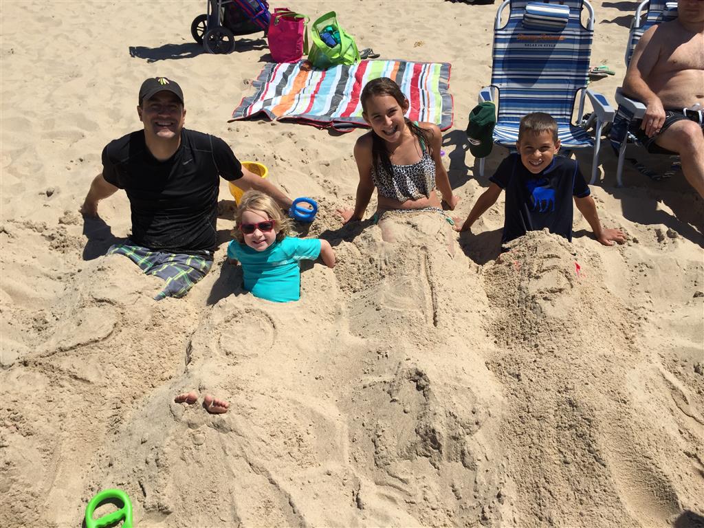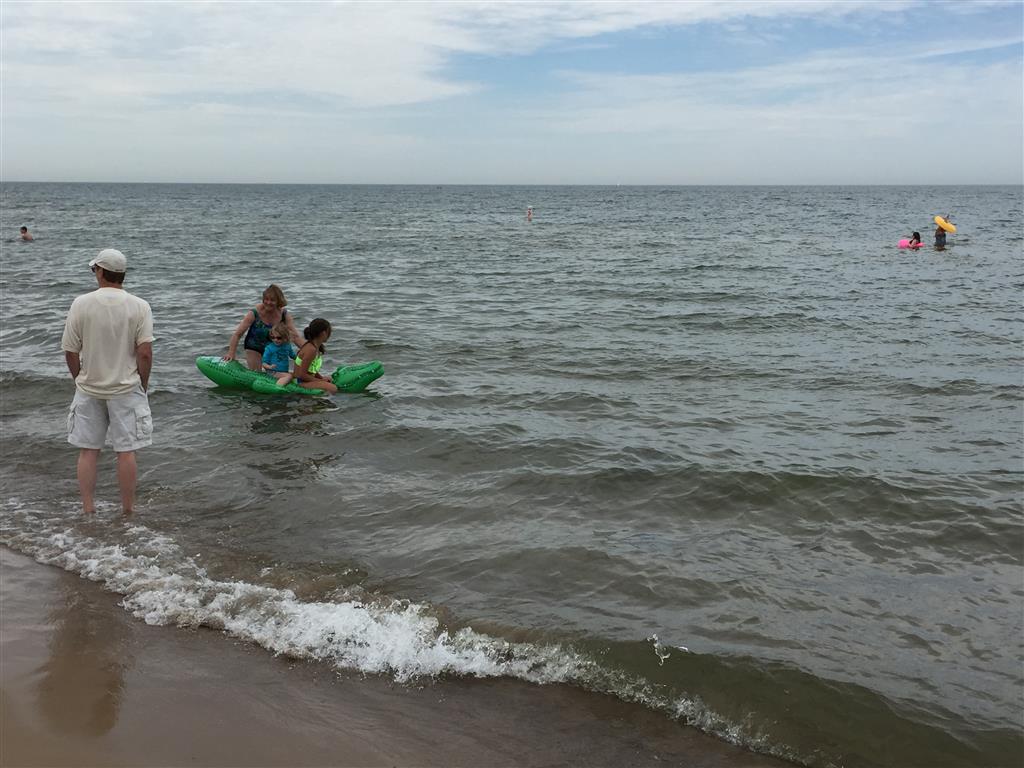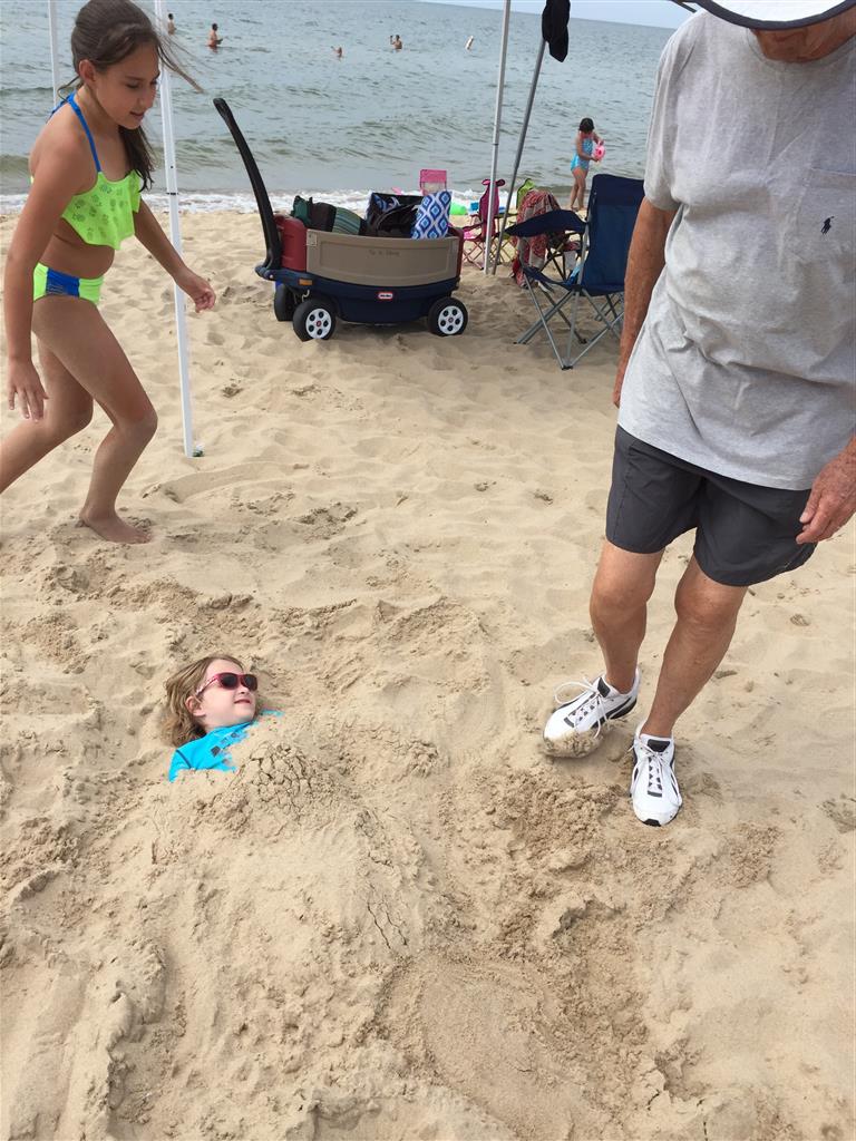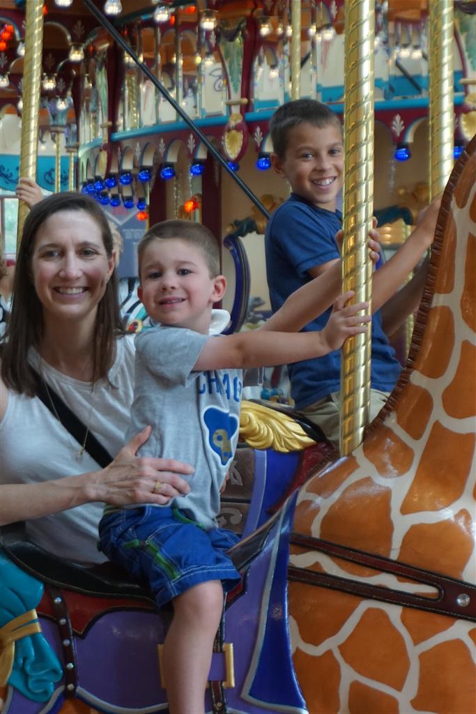 Eleanor and Henry had a fantastic trip to the beach this week with Grandma, Grandpa, Mackenzie, Jack, Ben, Auntie Susan, Uncle Gabe and Uncle B. Both kids ended up having a lot of fun in the water, which was great to see. Eleanor really liked riding on the inflatable dragon with Mackenzie, and also did some swimming by herself with her arm floaties on. Henry didn’t spend as much time on the rafts, but loved running in and out of the waves and on the second to last day got comfortable enough to swim by himself with his floaties on. We also had lots of fun building and burying in the sand, and made a trip to see the carousel. I asked the kids what their favorite part of the trip was, and Eleanor said “Playing dolls with Mackenzie”, and Henry said “Having a sleepover with Jack and Ben”. While Elanor slept with Mackenzie all week, Henry slept with Mom for the first part of the week. We decided to finally give him a shot at sleeping in the same room as Jack and Ben – and it turned out to be quite the crazy event. They had so much fun that Mom and Dad had to keep coming down to remind them to get some sleep. Finally, after a spilled water bottle necessitated a change of sheets, we had to get a threaten an end to the sleepover. Fortunately, they got right to sleep after that – and Auntie Susan heard Henry say as he woke up the next morning, “Jack, we made it! We had a sleepover!”.