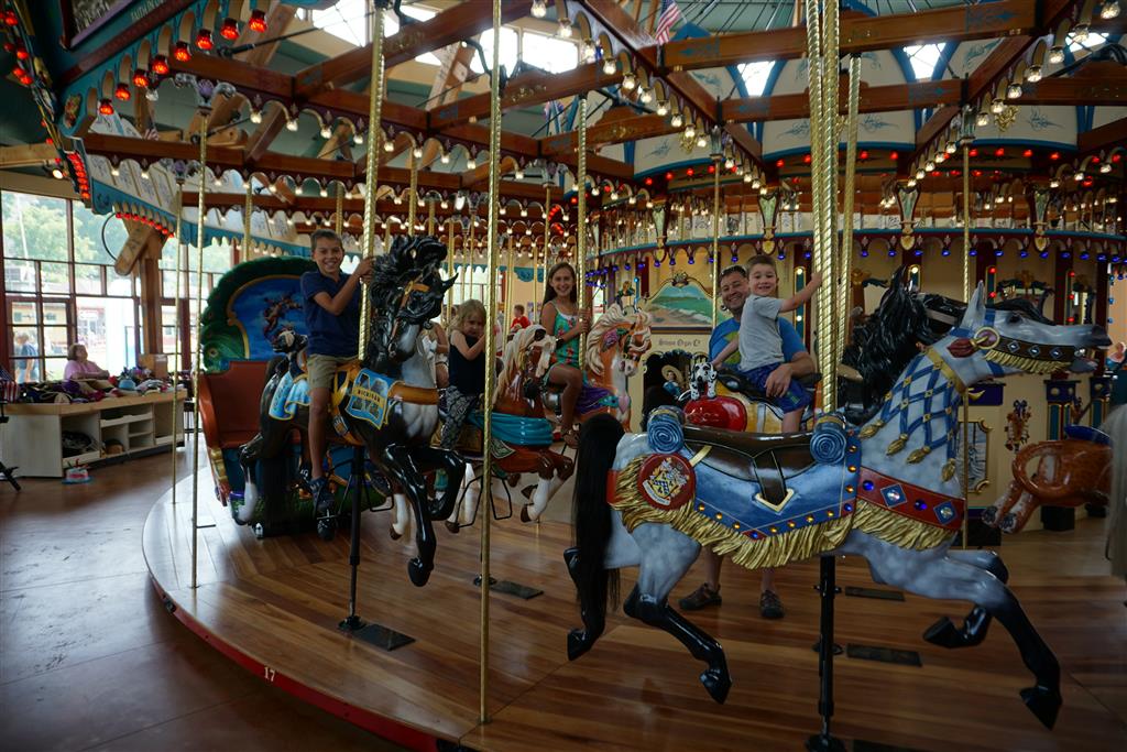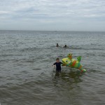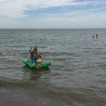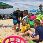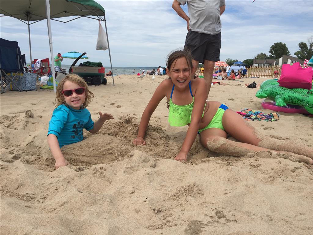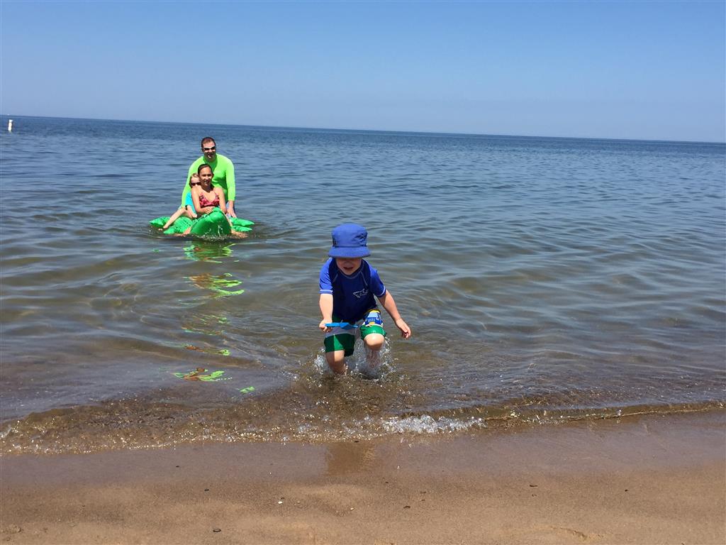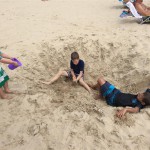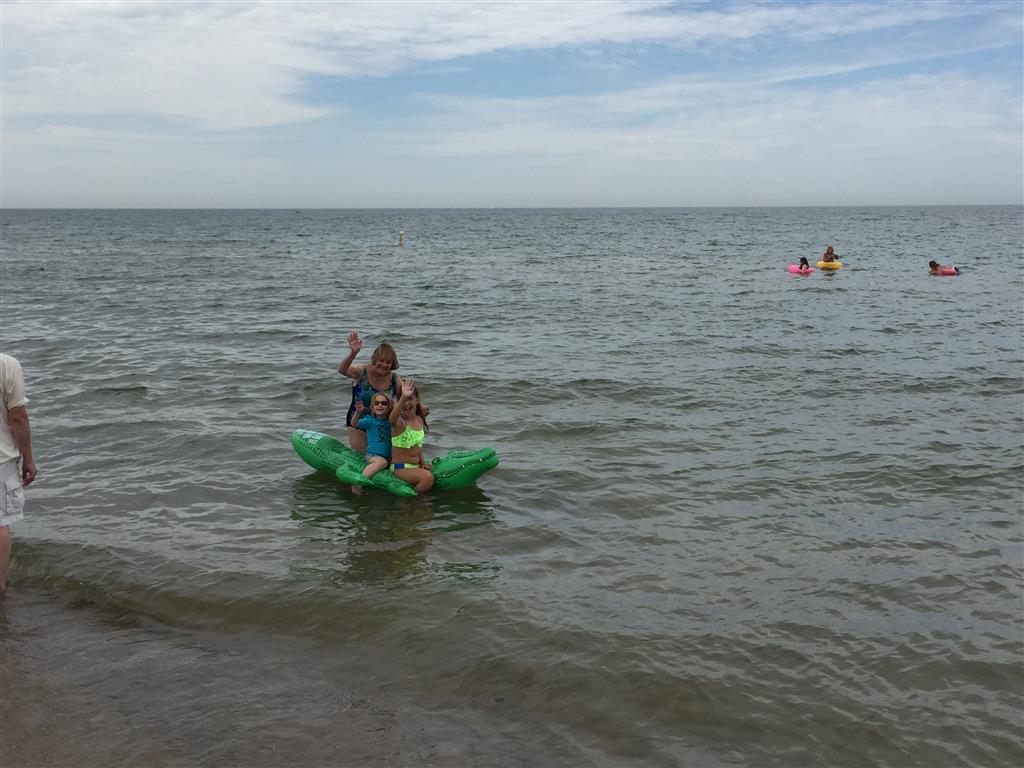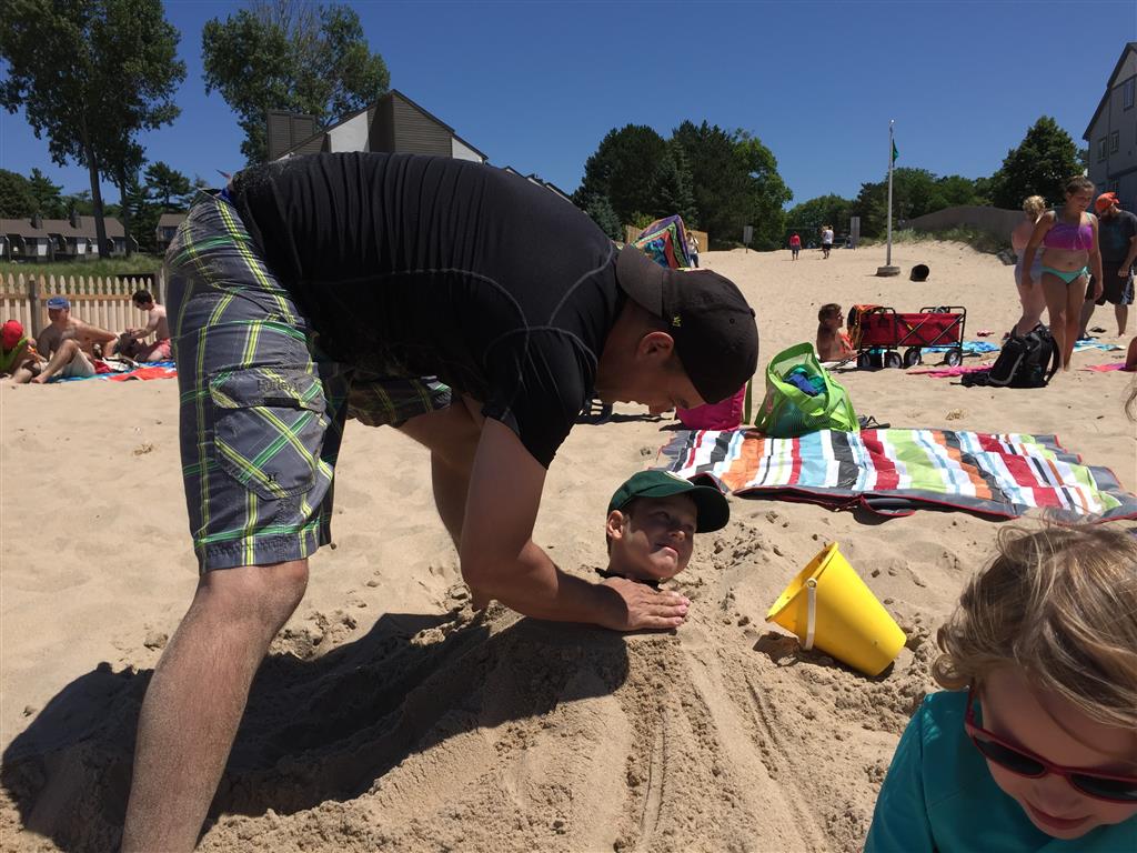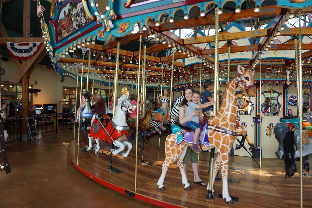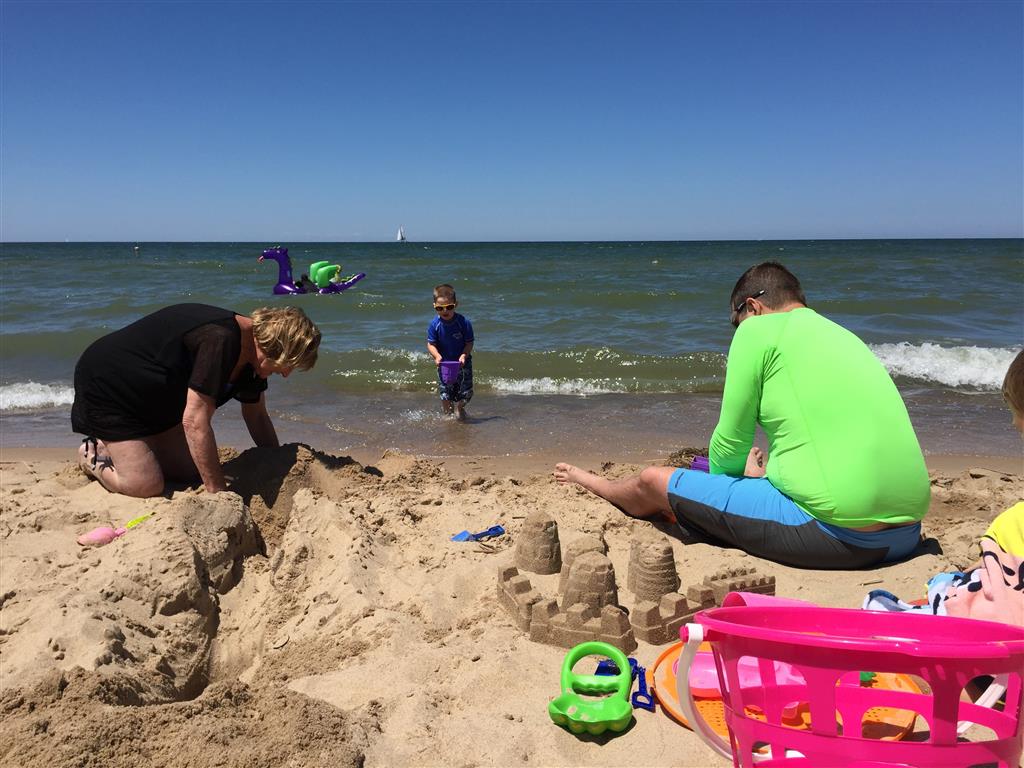 Eleanor and Henry had a fantastic trip to the beach this week with Grandma, Grandpa, Mackenzie, Jack, Ben, Auntie Susan, Uncle Gabe and Uncle B. Both kids ended up having a lot of fun in the water, which was great to see. Eleanor really liked riding on the inflatable dragon with Mackenzie, and also did some swimming by herself with her arm floaties on. Henry didn’t spend as much time on the rafts, but loved running in and out of the waves and on the second to last day got comfortable enough to swim by himself with his floaties on. We also had lots of fun building and burying in the sand, and made a trip to see the carousel. I asked the kids what their favorite part of the trip was, and Eleanor said “Playing dolls with Mackenzie”, and Henry said “Having a sleepover with Jack and Ben”. While Elanor slept with Mackenzie all week, Henry slept with Mom for the first part of the week. We decided to finally give him a shot at sleeping in the same room as Jack and Ben – and it turned out to be quite the crazy event. They had so much fun that Mom and Dad had to keep coming down to remind them to get some sleep. Finally, after a spilled water bottle necessitated a change of sheets, we had to get a threaten an end to the sleepover. Fortunately, they got right to sleep after that – and Auntie Susan heard Henry say as he woke up the next morning, “Jack, we made it! We had a sleepover!”.