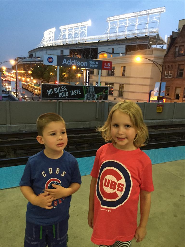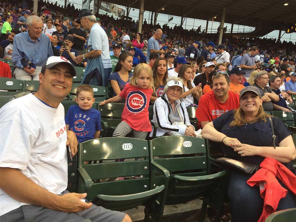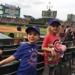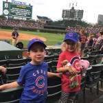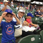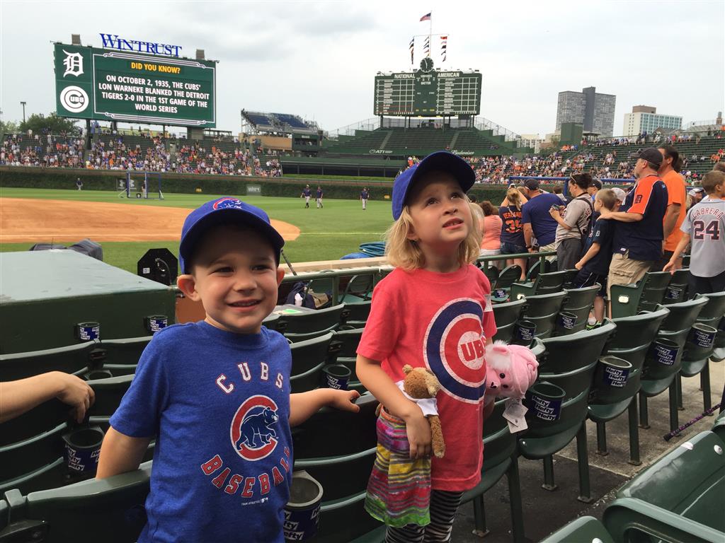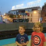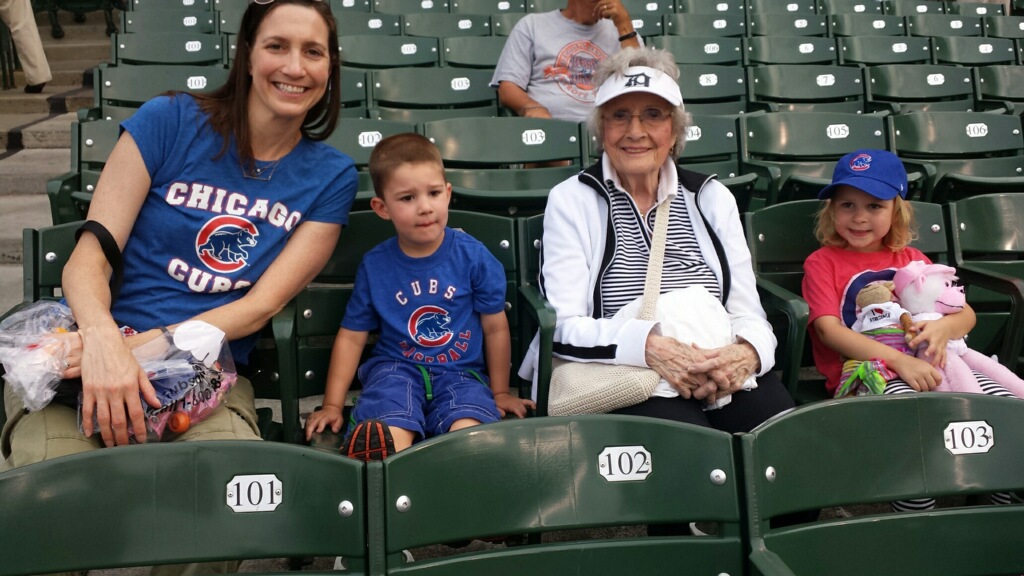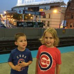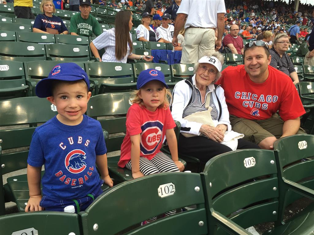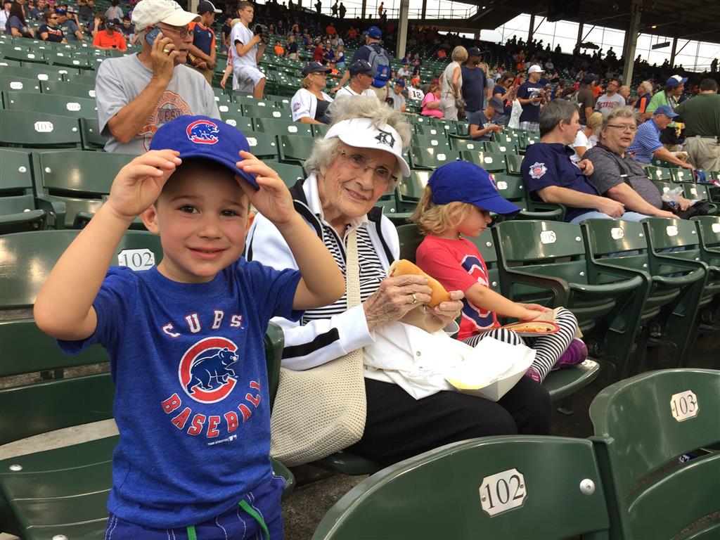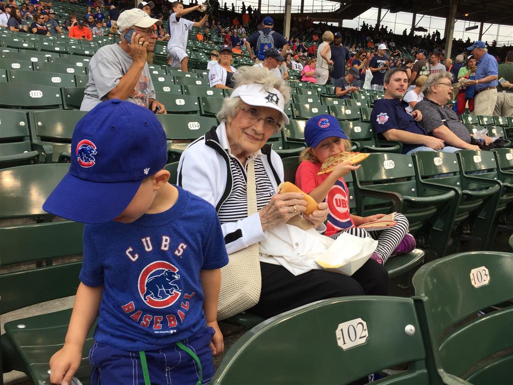 This week Great Grandma came for a visit to Wrigley Field to see the Cubs play the Tigers. Unfortunately for us, we were rained out early in the game, although we did get to see three home runs! They eventually finished the game after a 2+ hour rain delay, but we had elected to leave well before then. We did have a great visit, and got to show Great Grandma lots of our favorite games and toys, as well as Oz Park and Uncle B’s house. We’ll have to have her back next year and hope for better weather! Eleanor and Henry were most excited about the food options, and less excited about the baseball game – Eleanor went for the pizza and Henry had a cheeseburger.