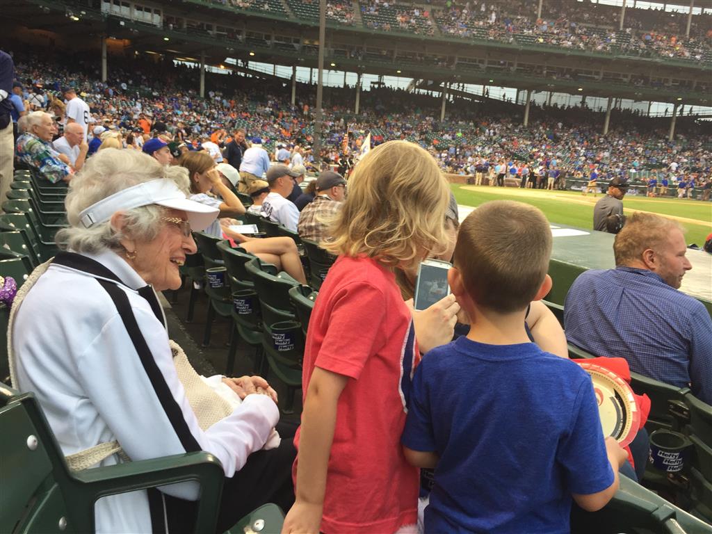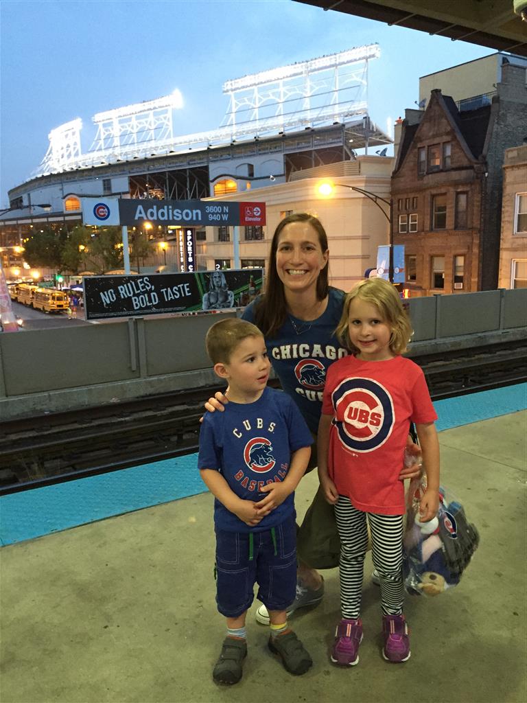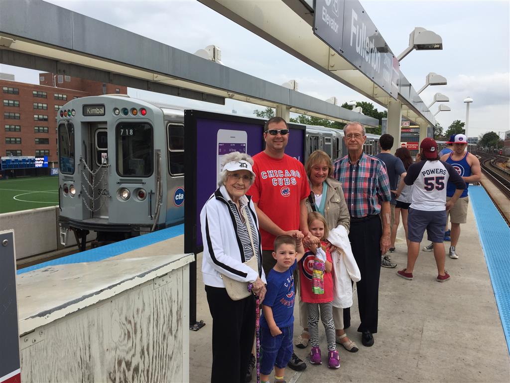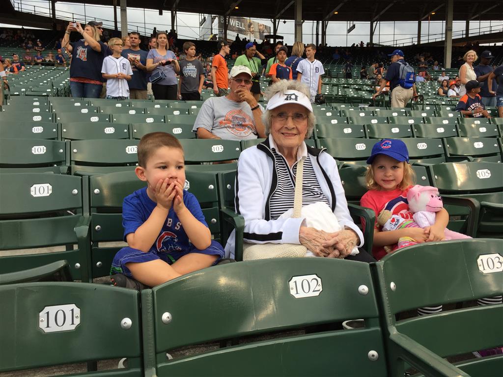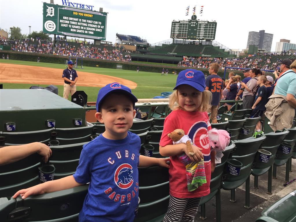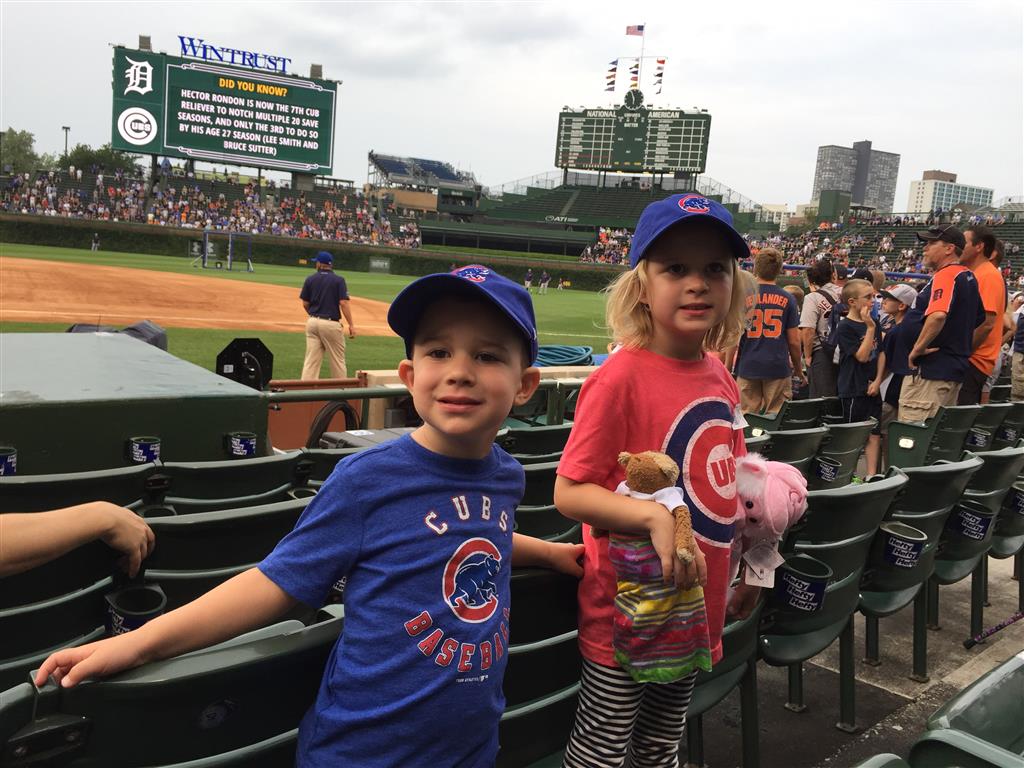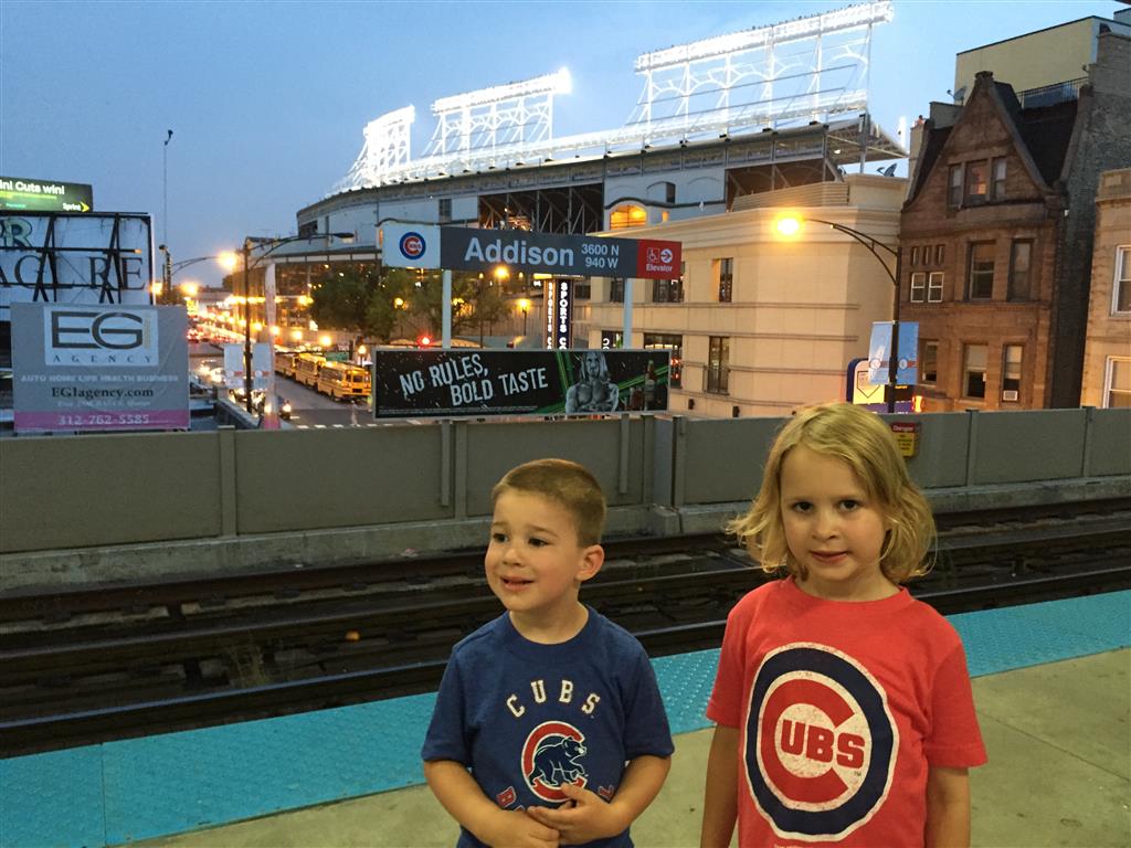 This week Great Grandma came for a visit to Wrigley Field to see the Cubs play the Tigers. Unfortunately for us, we were rained out early in the game, although we did get to see three home runs! They eventually finished the game after a 2+ hour rain delay, but we had elected to leave well before then. We did have a great visit, and got to show Great Grandma lots of our favorite games and toys, as well as Oz Park and Uncle B’s house. We’ll have to have her back next year and hope for better weather! Eleanor and Henry were most excited about the food options, and less excited about the baseball game – Eleanor went for the pizza and Henry had a cheeseburger.