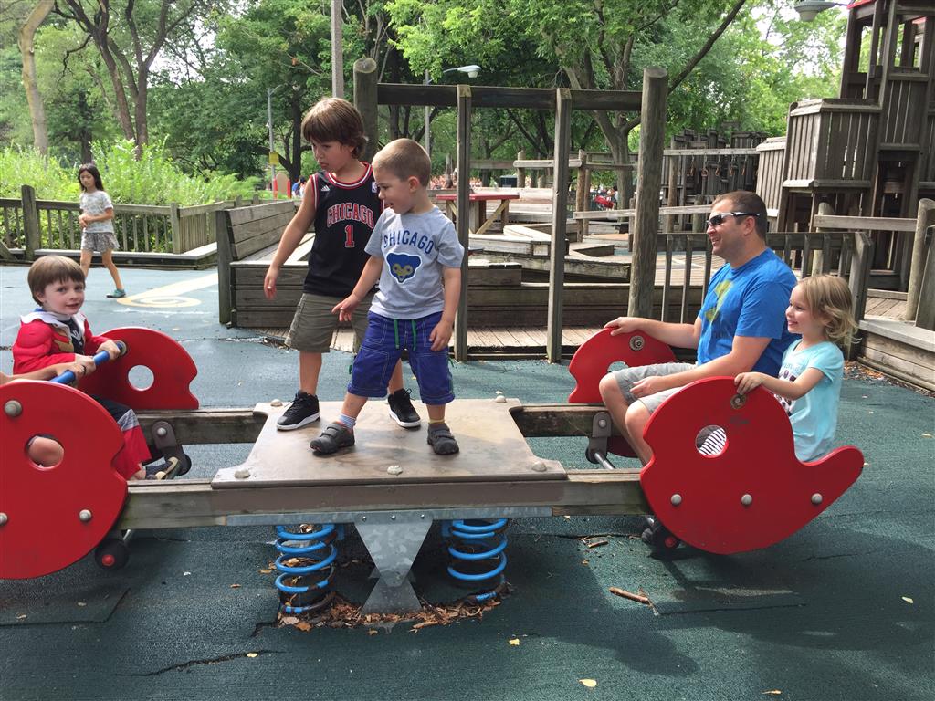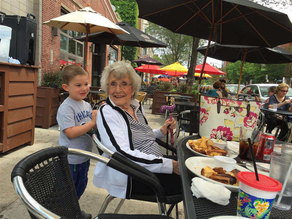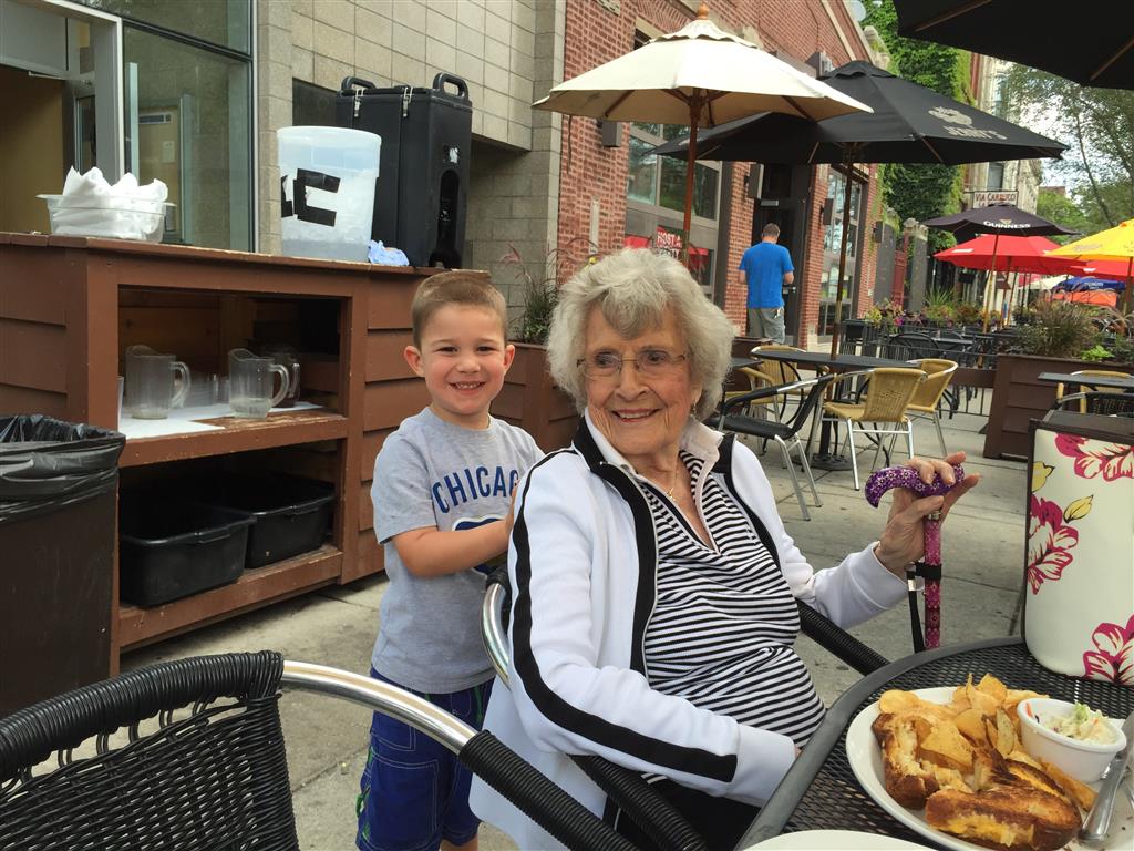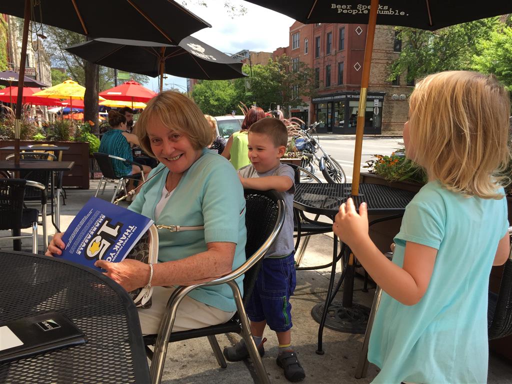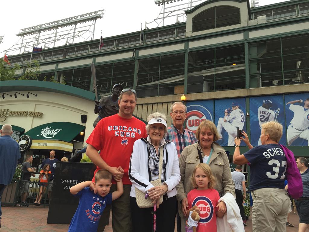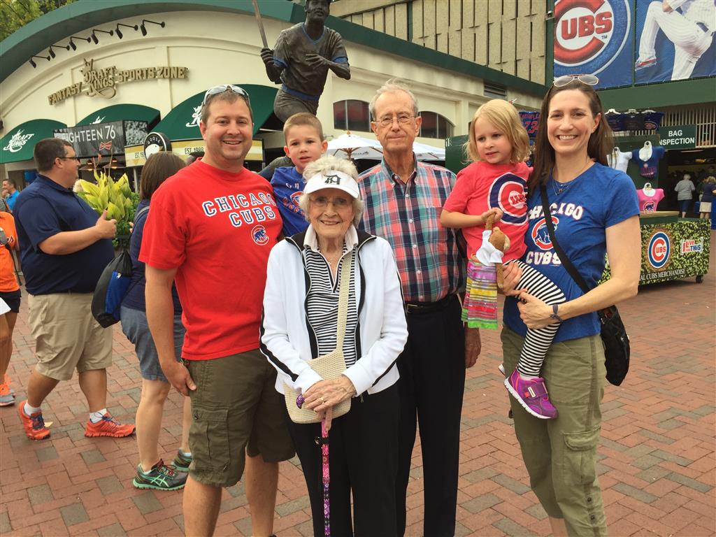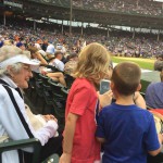 This week Great Grandma came for a visit to Wrigley Field to see the Cubs play the Tigers. Unfortunately for us, we were rained out early in the game, although we did get to see three home runs! They eventually finished the game after a 2+ hour rain delay, but we had elected to leave well before then. We did have a great visit, and got to show Great Grandma lots of our favorite games and toys, as well as Oz Park and Uncle B’s house. We’ll have to have her back next year and hope for better weather! Eleanor and Henry were most excited about the food options, and less excited about the baseball game – Eleanor went for the pizza and Henry had a cheeseburger.