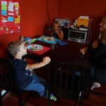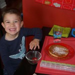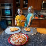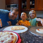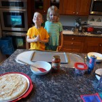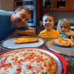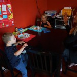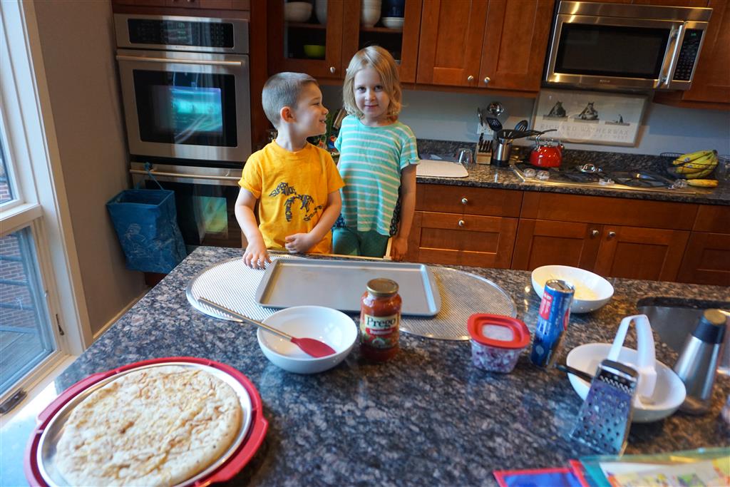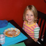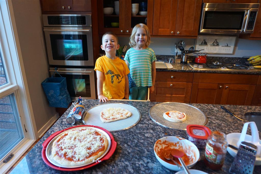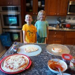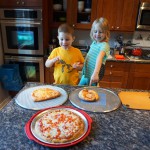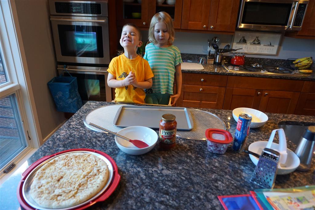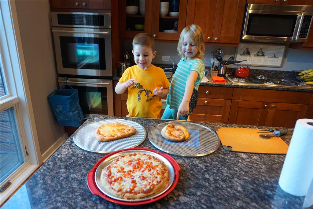 Saturday was a lazy morning – Henry slept in till almost 9. Making the pancakes was fun, but Eleanor didn’t love the way they tasted, and proclaimed them “not the best ever”. I had to agree – I think it was the whole wheat batter that we purchased. Eleanor was so upset about how they tasted that she even tried some maple syrup on them, but after tasting the first bite, and then pouring it all over the pancake, she decided she didn’t like that either. They must not have been too bad though, because the kids ended up eating three each. After lots of playtime and a long trip to Oz park to check out the new finished resurface, we started in on make your own pizza. Unfortunately, Eleanor ended up not loving her meal again – she wanted to make a very small thick pizza, which looked great going in the oven, but didn’t come out the way she wanted. She said it looked like a croissant. She had a few bits, and then I made her a quesadilla. Henry gobbled his down – and I have to admit his did look better.