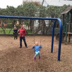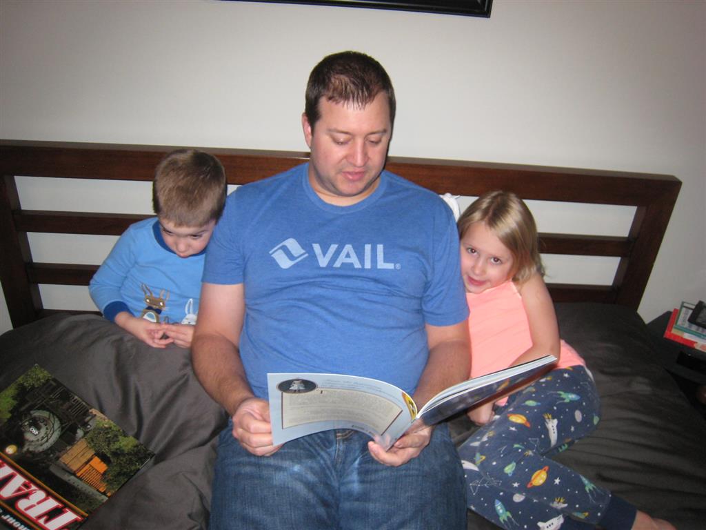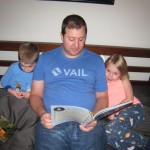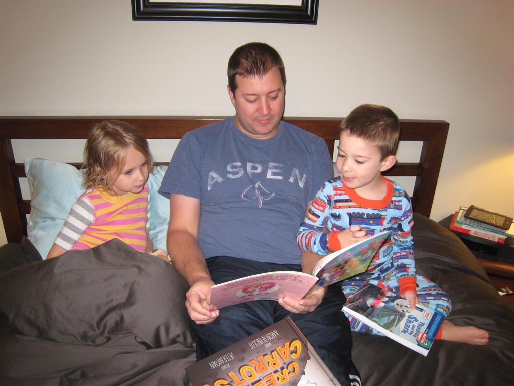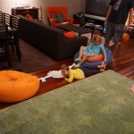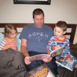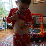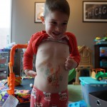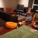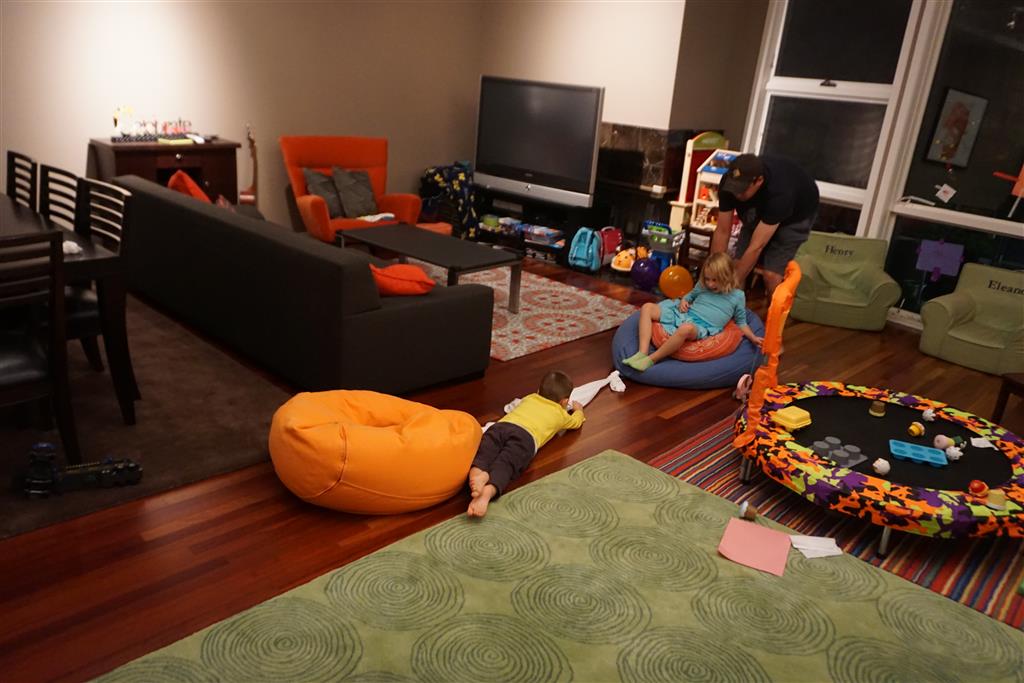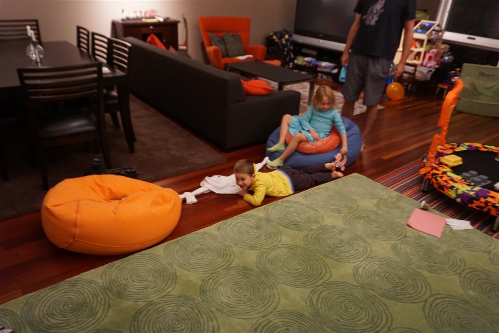 Uncle B got some babysitting time in this week – and the kids kept him going the whole time. Dad came home and found the giant bean bags tied together with a t-shirt and Uncle B pulling the whole thing as a train!