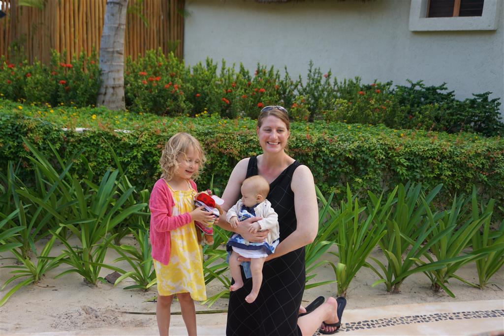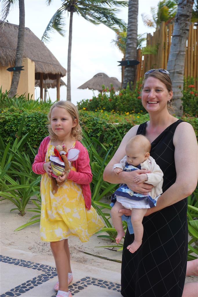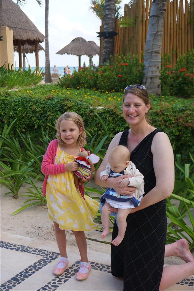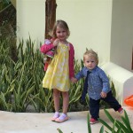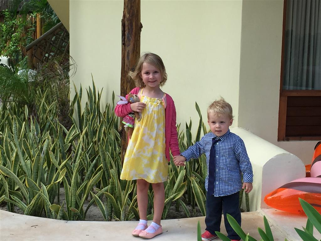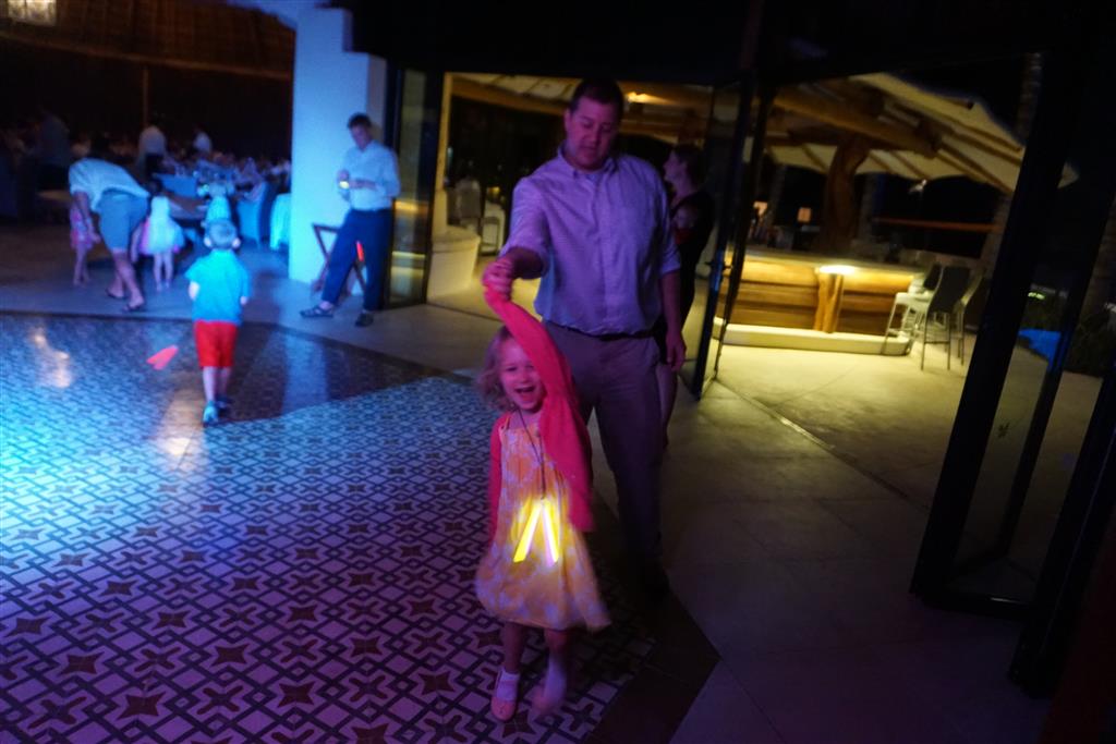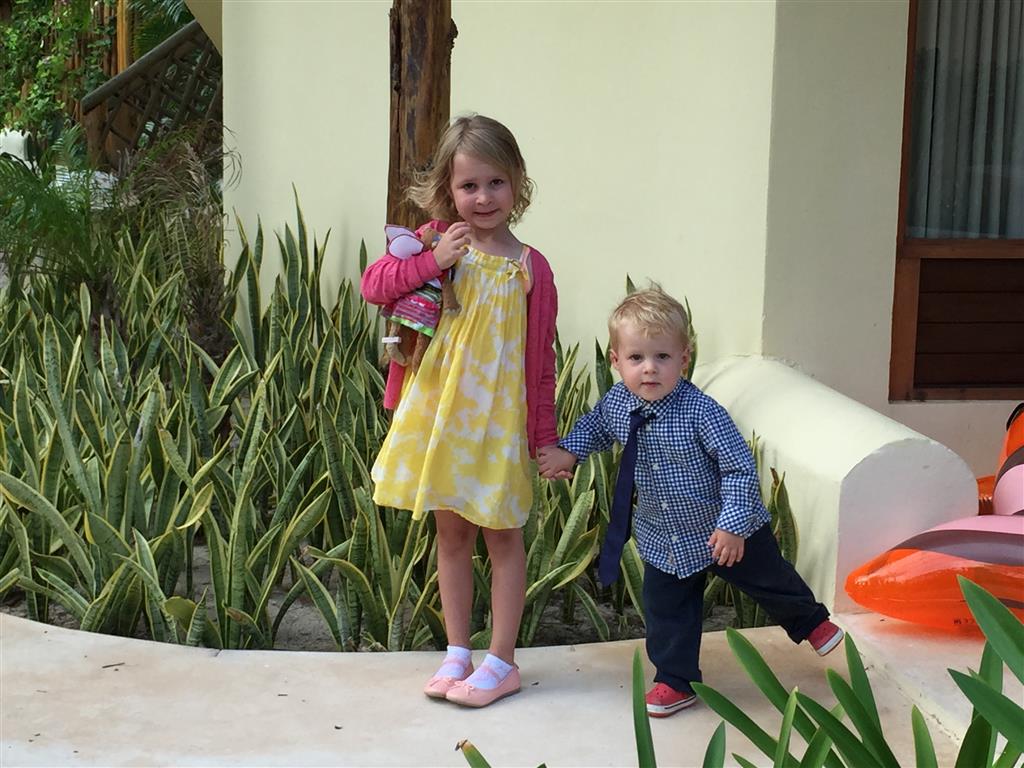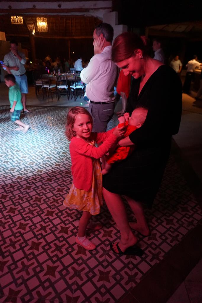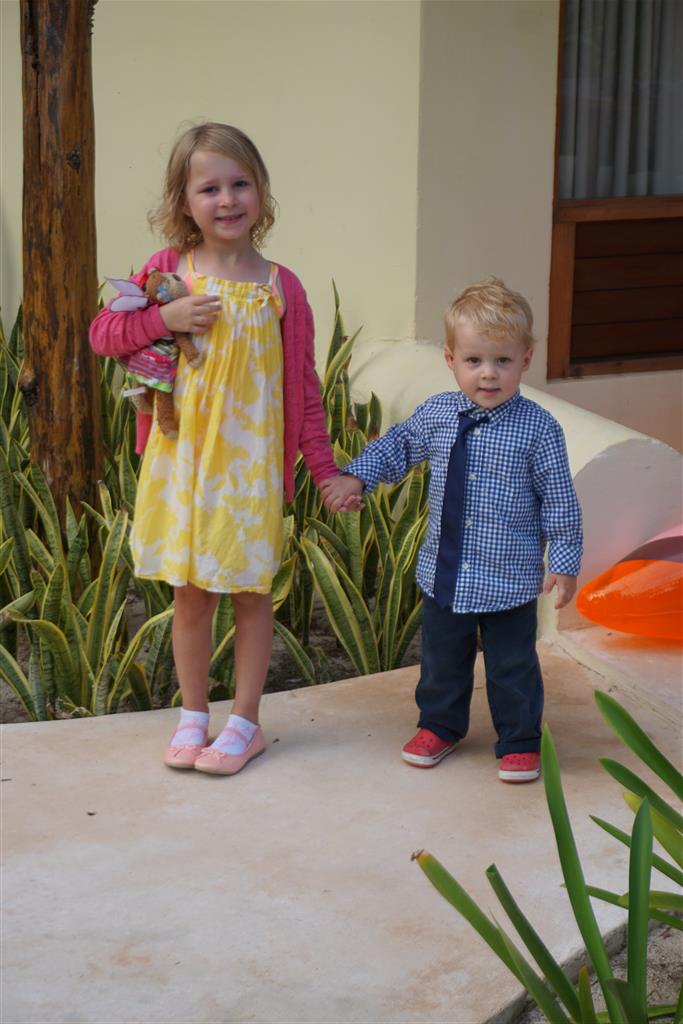 Last week Eleanor and Henry took a fun trip to attend Cousin Adam and Begonia’s wedding in sunny Mexico! We had a blast seeing so many family members there, especially getting to meet baby Simone for the first time! Eleanor and Henry really liked swimming in the pool, and Henry also enjoyed playing on the beach – although Eleanor wasn’t as excited about that. Unfortunately, Eleanor got a little sick for two days, which resulted in a lot of in the room time for her. Poor thing got sick right on her lunch plate, and then again at the dinner table. Of course, that was the one dinner that Dad was alone with the kids as Mom went to the bachelorette party. We had also chosen to leave the hotel and go to a pizza restaurant in town – but they were very nice and quickly boxed up our pizza to take back. The wedding was great fun – the kids sat at an all kids table complete with crafts – and then broke out the glow sticks for a super rave on the dance floor. Henry was especially excited about the crazy dancing, while Eleanor was very interested in helping baby Simone move her arms to the beat.