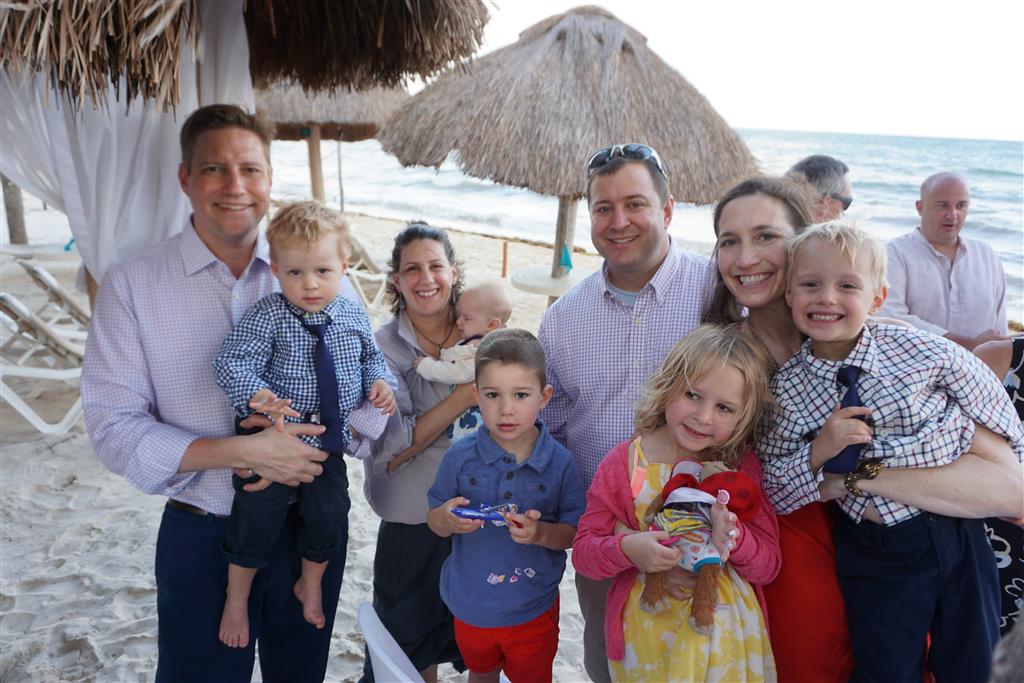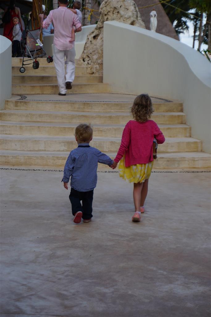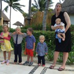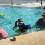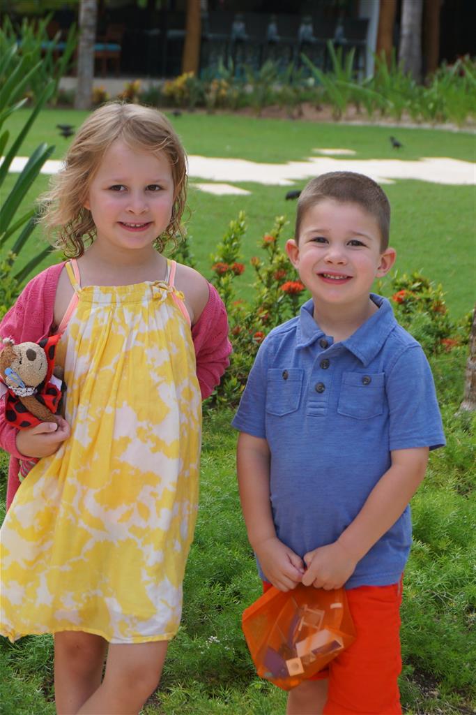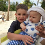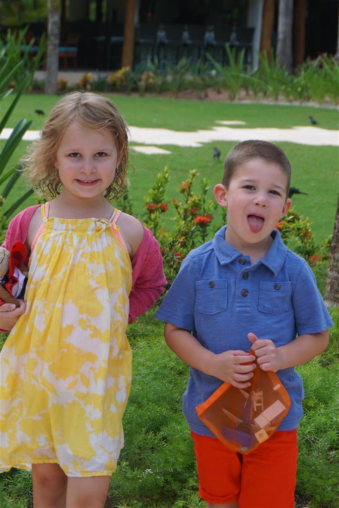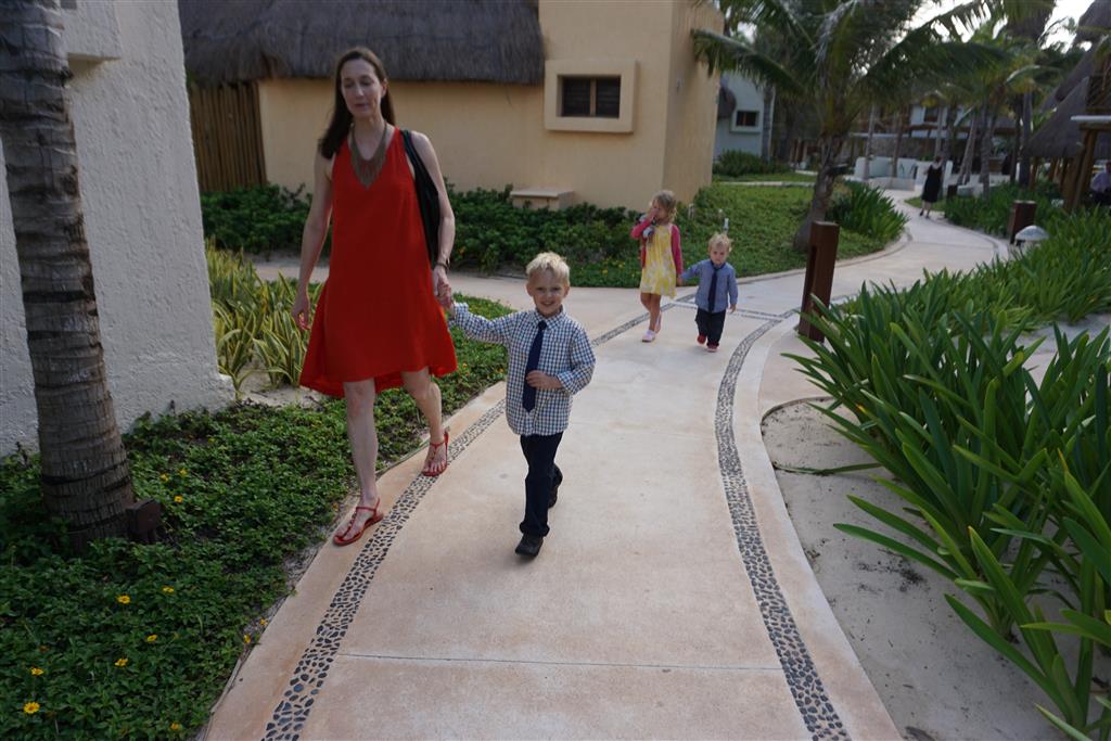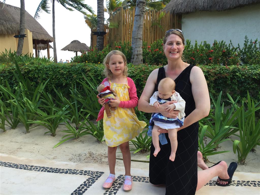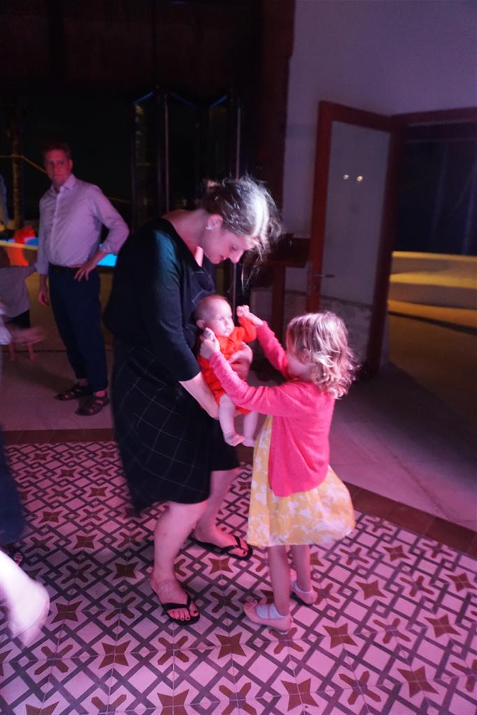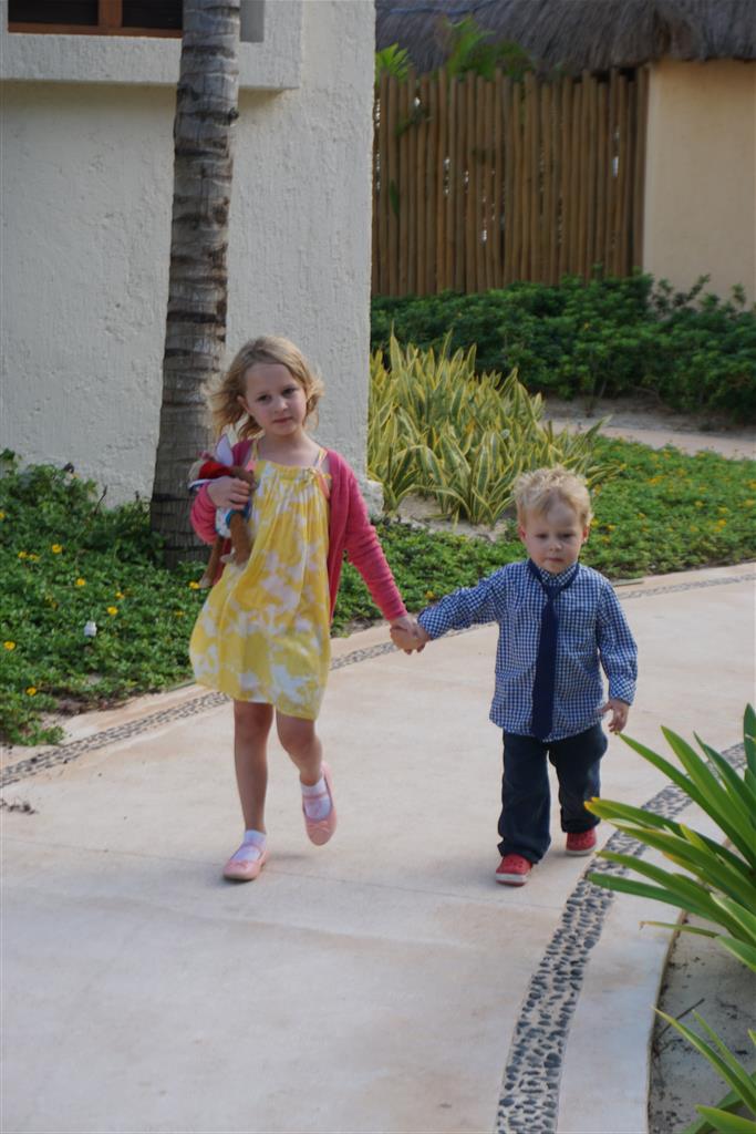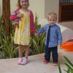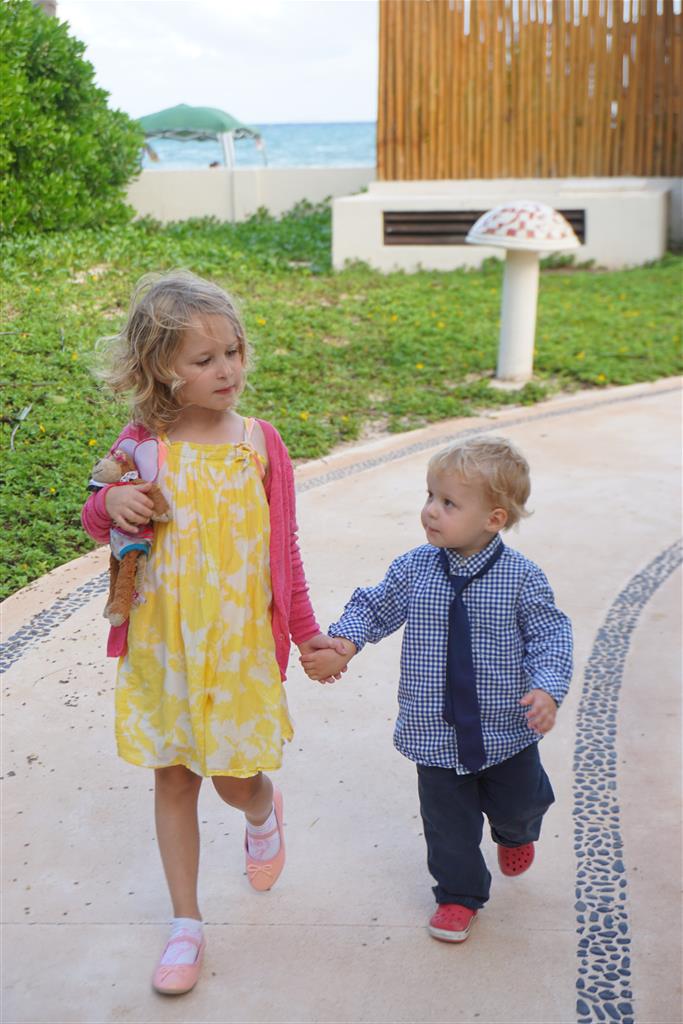 Last week Eleanor and Henry took a fun trip to attend Cousin Adam and Begonia’s wedding in sunny Mexico! We had a blast seeing so many family members there, especially getting to meet baby Simone for the first time! Eleanor and Henry really liked swimming in the pool, and Henry also enjoyed playing on the beach – although Eleanor wasn’t as excited about that. Unfortunately, Eleanor got a little sick for two days, which resulted in a lot of in the room time for her. Poor thing got sick right on her lunch plate, and then again at the dinner table. Of course, that was the one dinner that Dad was alone with the kids as Mom went to the bachelorette party. We had also chosen to leave the hotel and go to a pizza restaurant in town – but they were very nice and quickly boxed up our pizza to take back. The wedding was great fun – the kids sat at an all kids table complete with crafts – and then broke out the glow sticks for a super rave on the dance floor. Henry was especially excited about the crazy dancing, while Eleanor was very interested in helping baby Simone move her arms to the beat.
