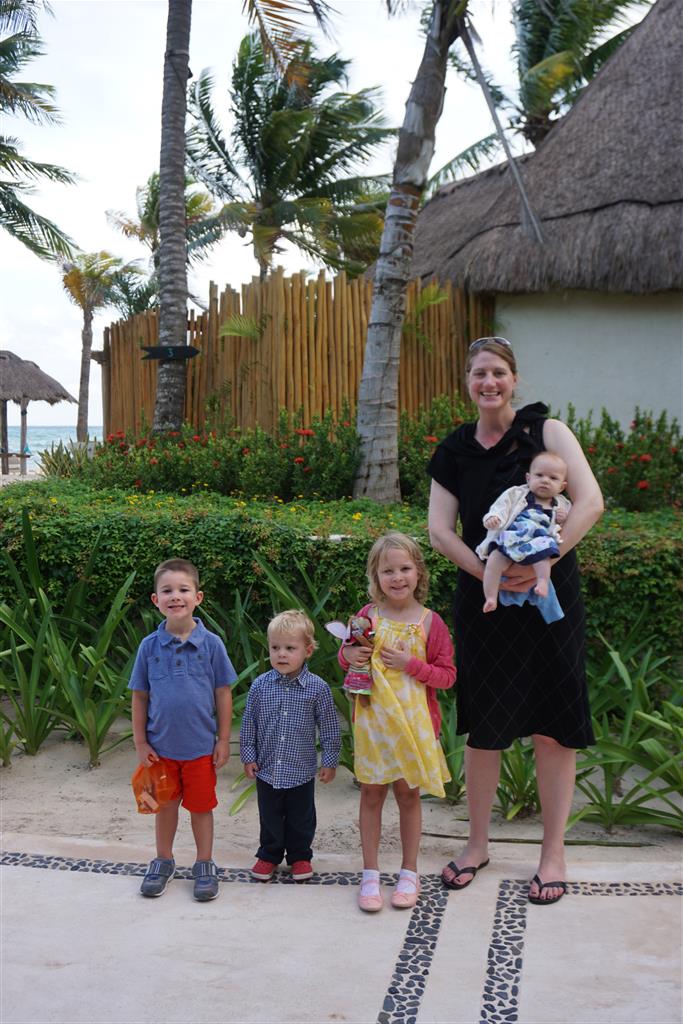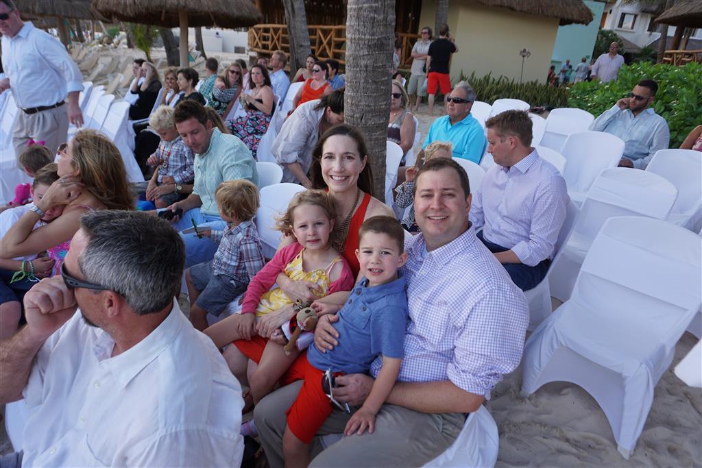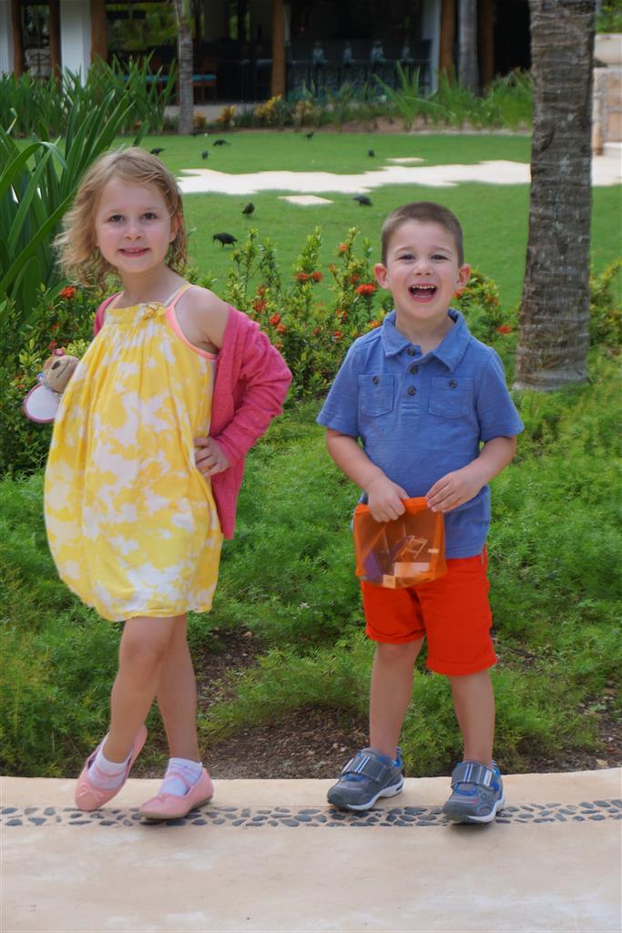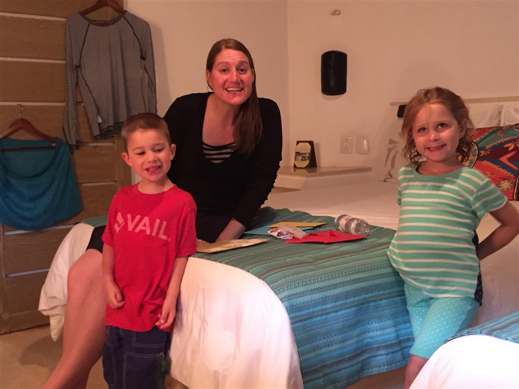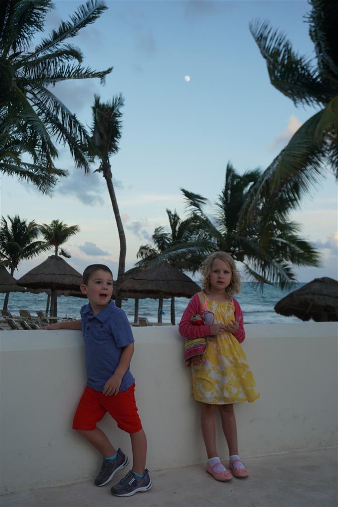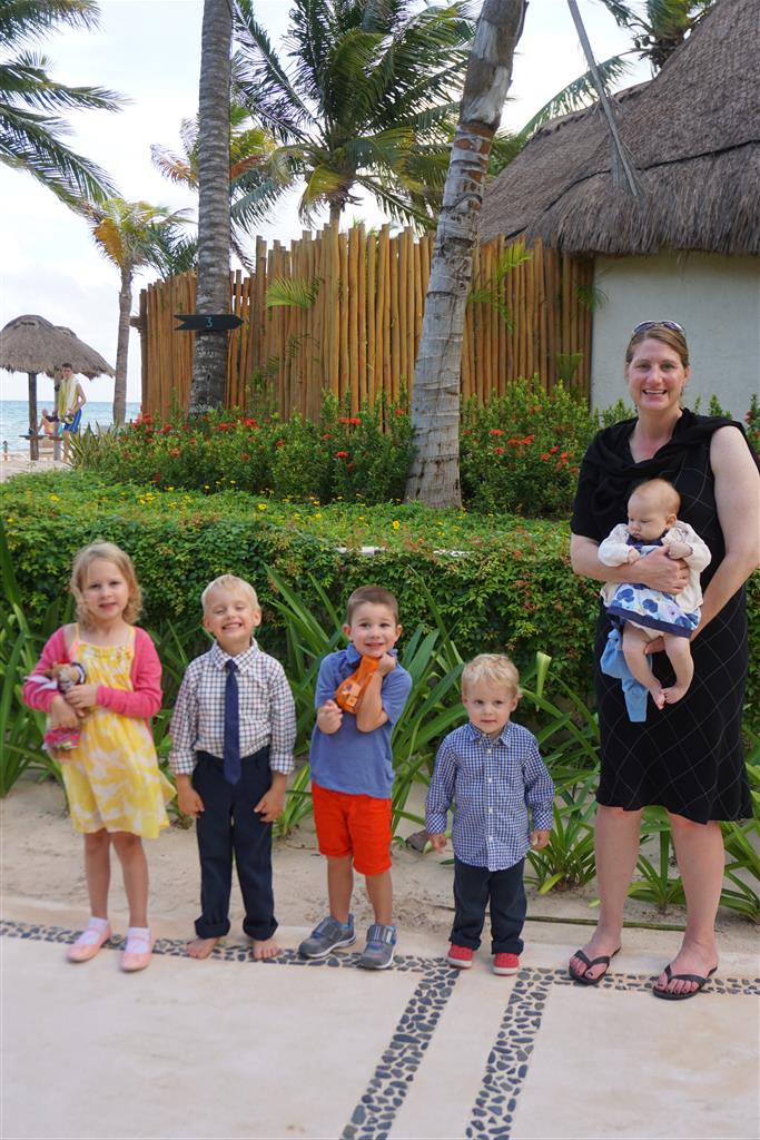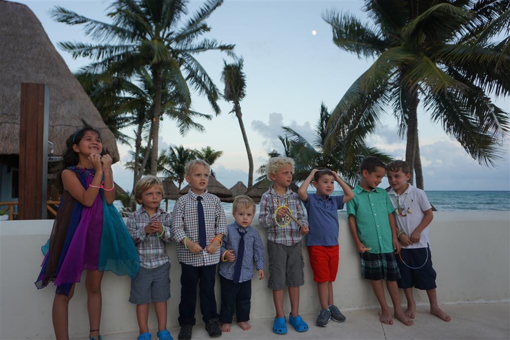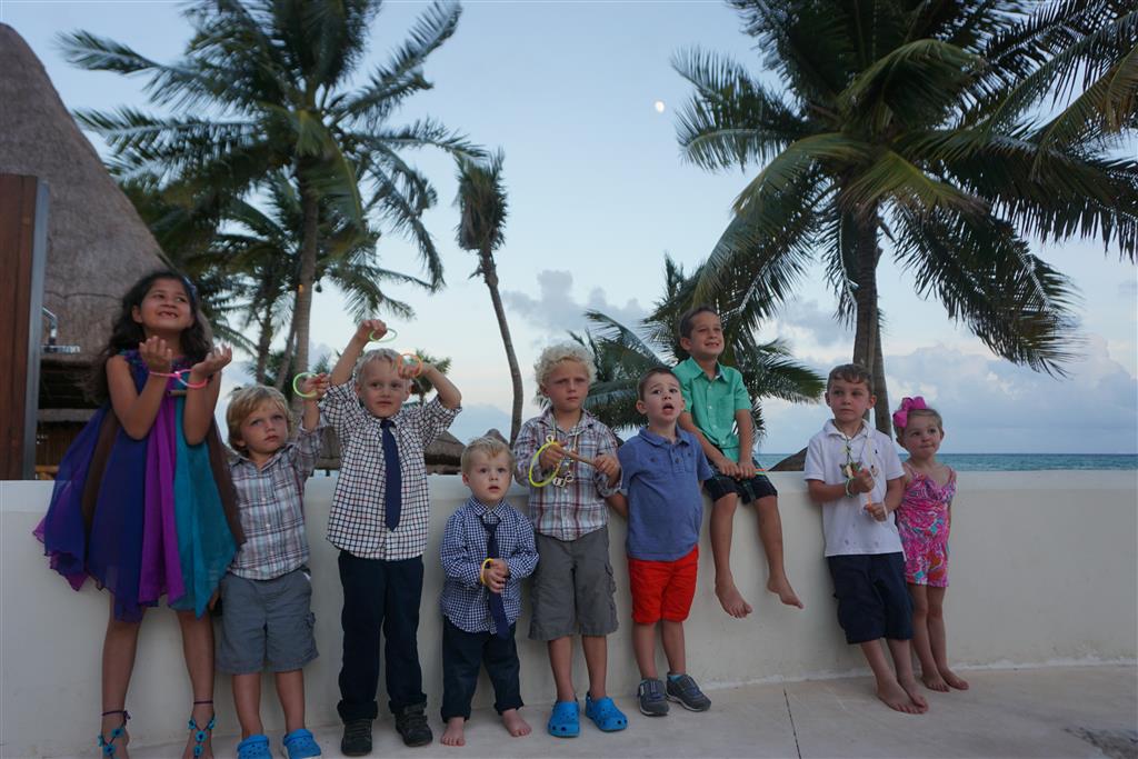 Last week Eleanor and Henry took a fun trip to attend Cousin Adam and Begonia’s wedding in sunny Mexico! We had a blast seeing so many family members there, especially getting to meet baby Simone for the first time! Eleanor and Henry really liked swimming in the pool, and Henry also enjoyed playing on the beach – although Eleanor wasn’t as excited about that. Unfortunately, Eleanor got a little sick for two days, which resulted in a lot of in the room time for her. Poor thing got sick right on her lunch plate, and then again at the dinner table. Of course, that was the one dinner that Dad was alone with the kids as Mom went to the bachelorette party. We had also chosen to leave the hotel and go to a pizza restaurant in town – but they were very nice and quickly boxed up our pizza to take back. The wedding was great fun – the kids sat at an all kids table complete with crafts – and then broke out the glow sticks for a super rave on the dance floor. Henry was especially excited about the crazy dancing, while Eleanor was very interested in helping baby Simone move her arms to the beat.