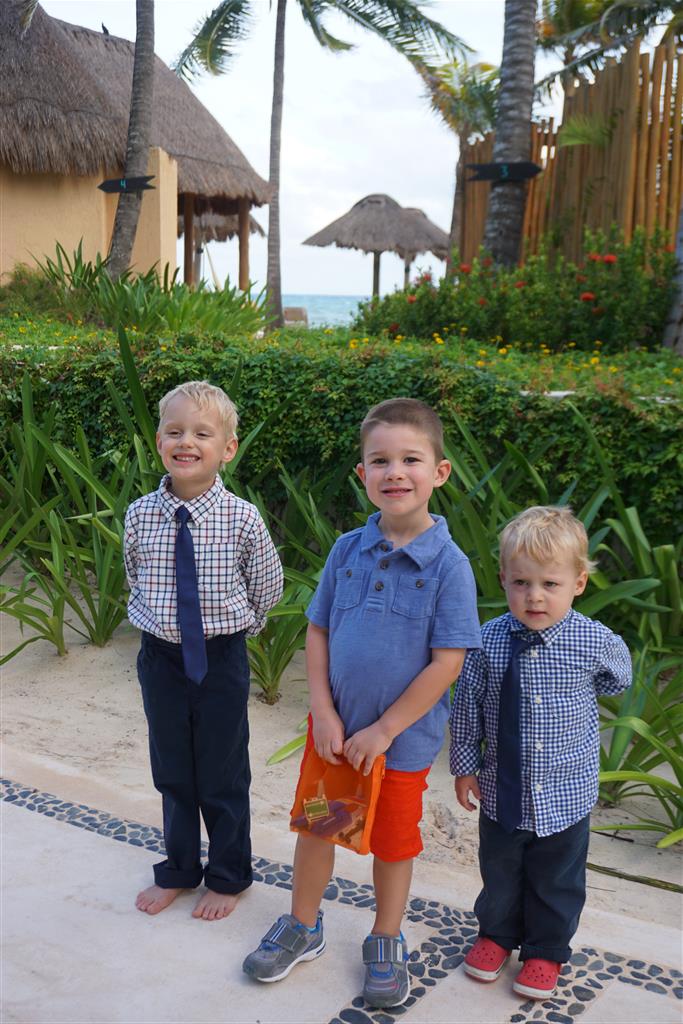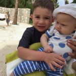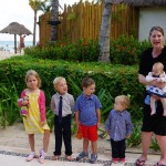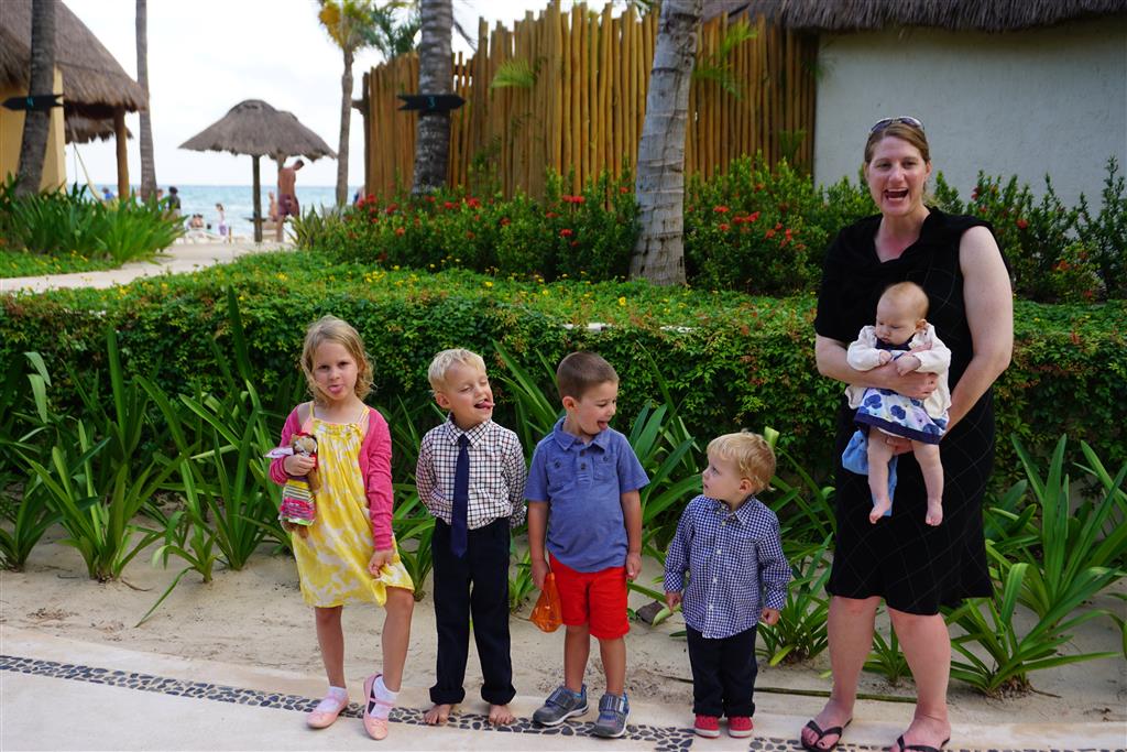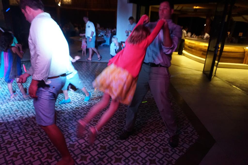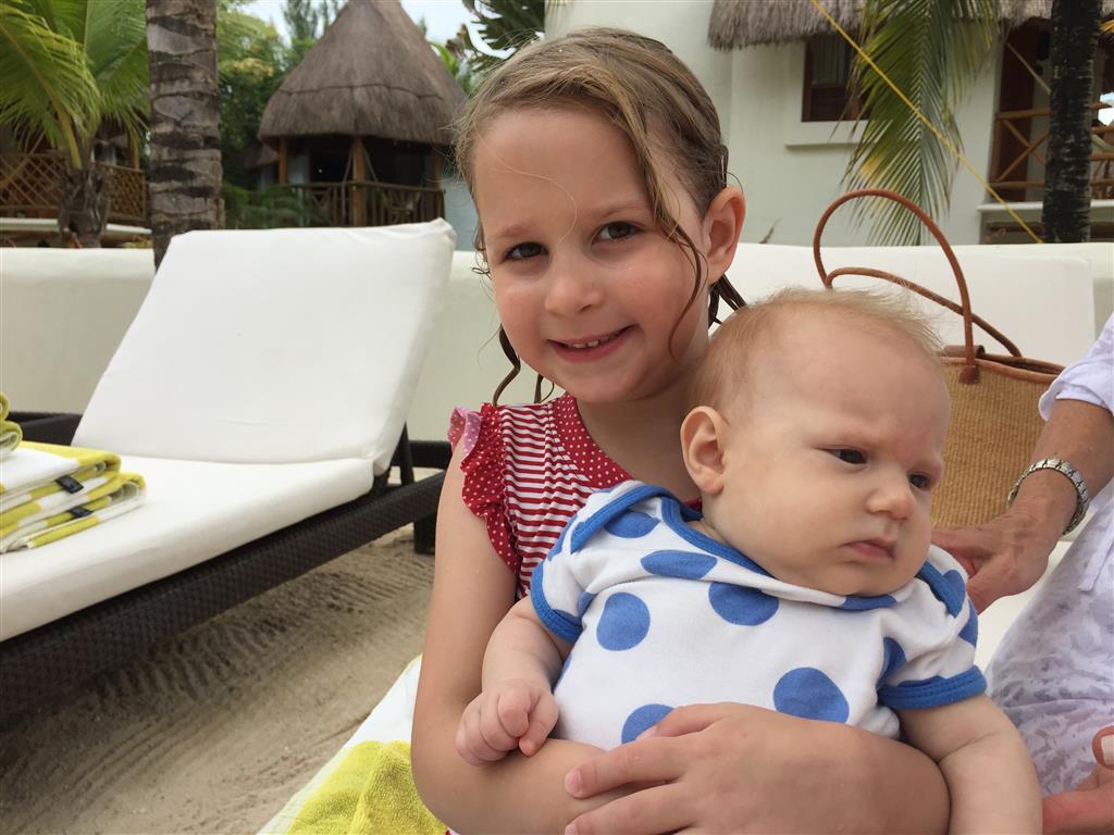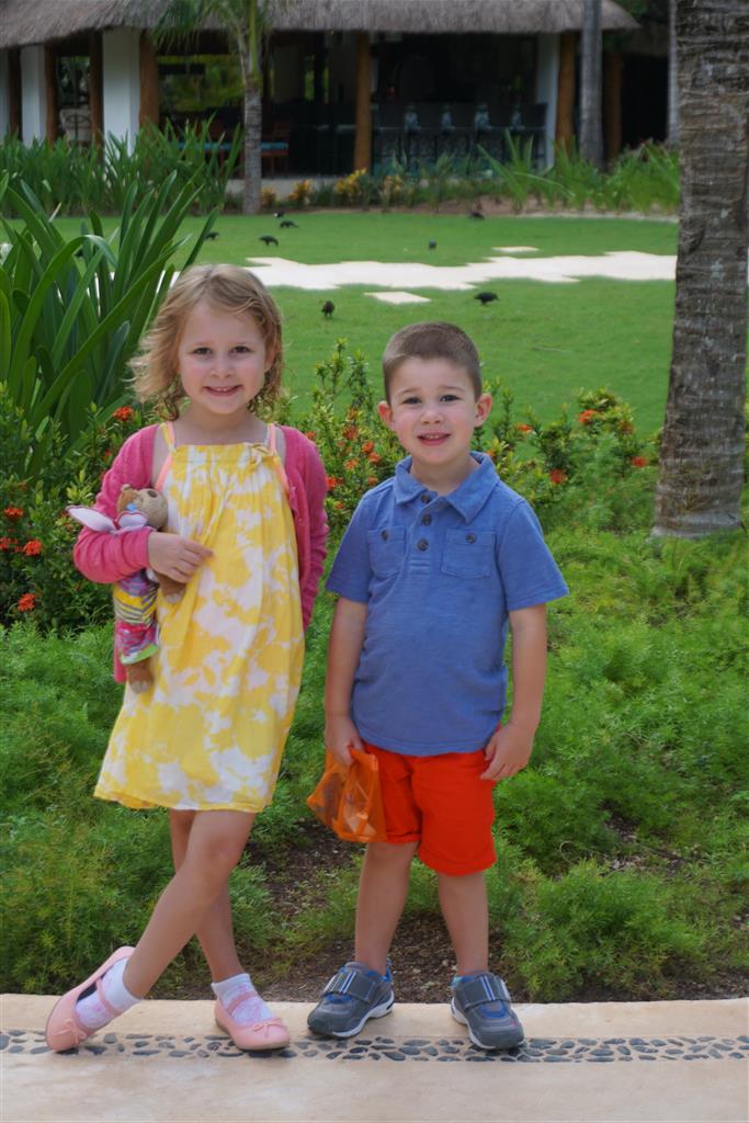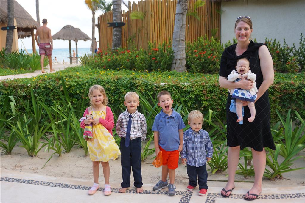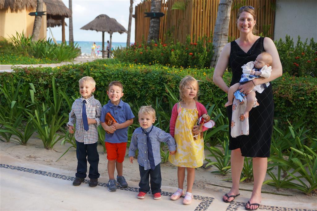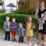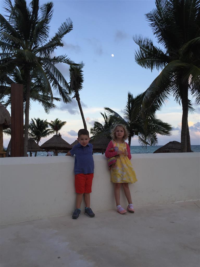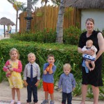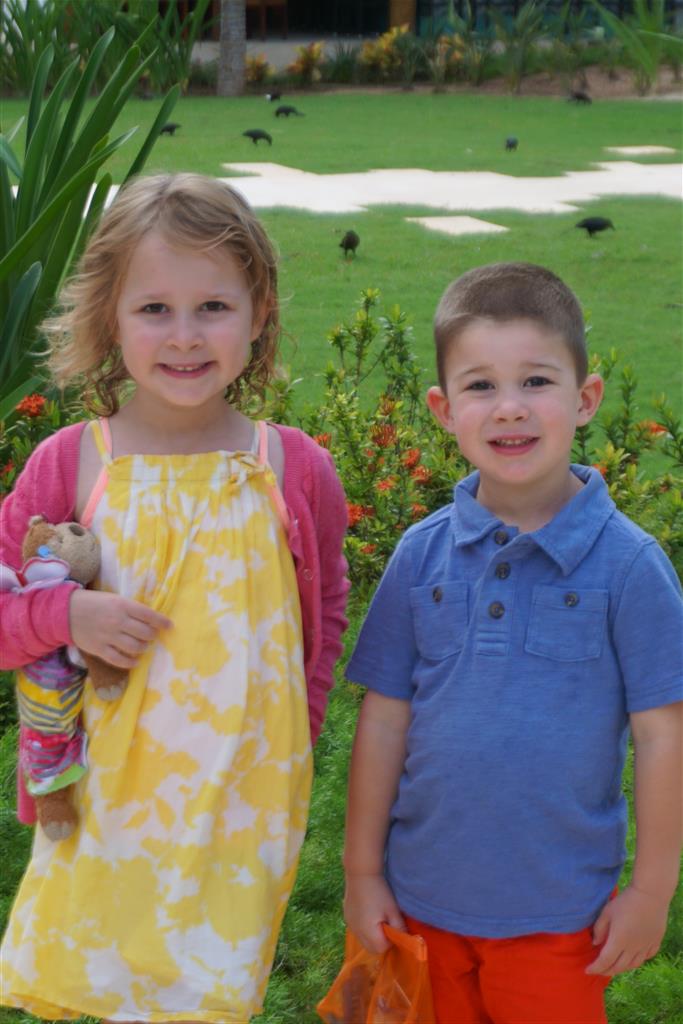 Last week Eleanor and Henry took a fun trip to attend Cousin Adam and Begonia’s wedding in sunny Mexico! We had a blast seeing so many family members there, especially getting to meet baby Simone for the first time! Eleanor and Henry really liked swimming in the pool, and Henry also enjoyed playing on the beach – although Eleanor wasn’t as excited about that. Unfortunately, Eleanor got a little sick for two days, which resulted in a lot of in the room time for her. Poor thing got sick right on her lunch plate, and then again at the dinner table. Of course, that was the one dinner that Dad was alone with the kids as Mom went to the bachelorette party. We had also chosen to leave the hotel and go to a pizza restaurant in town – but they were very nice and quickly boxed up our pizza to take back. The wedding was great fun – the kids sat at an all kids table complete with crafts – and then broke out the glow sticks for a super rave on the dance floor. Henry was especially excited about the crazy dancing, while Eleanor was very interested in helping baby Simone move her arms to the beat.