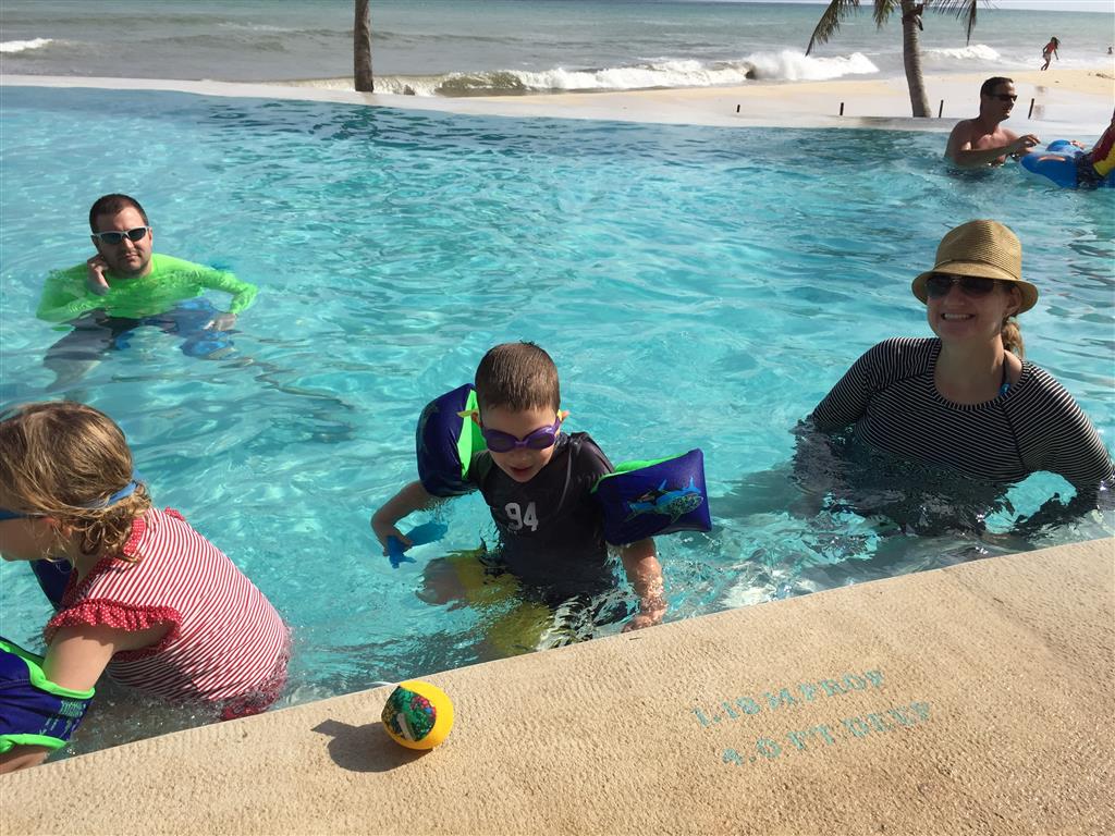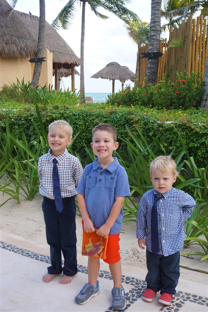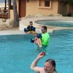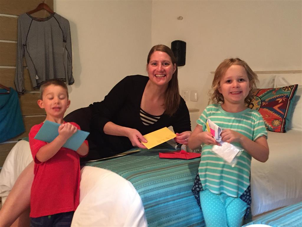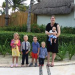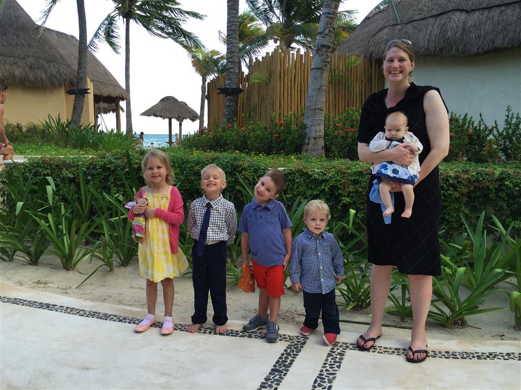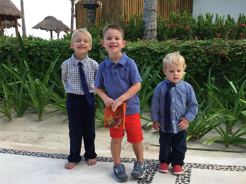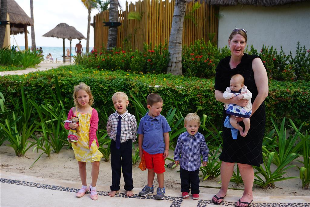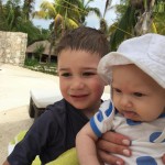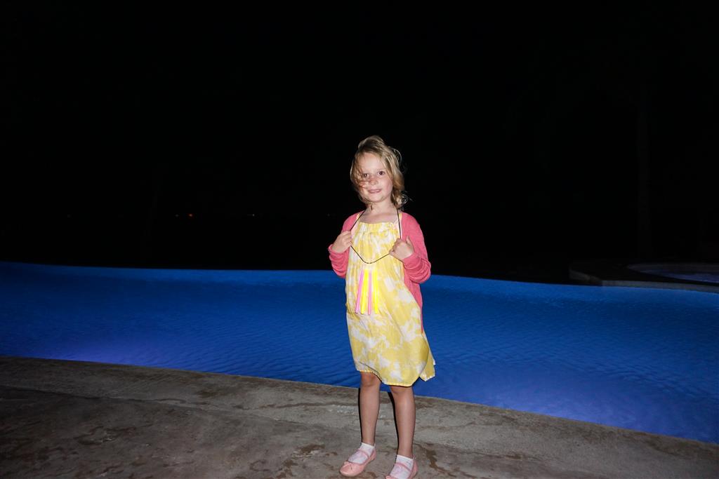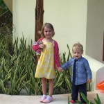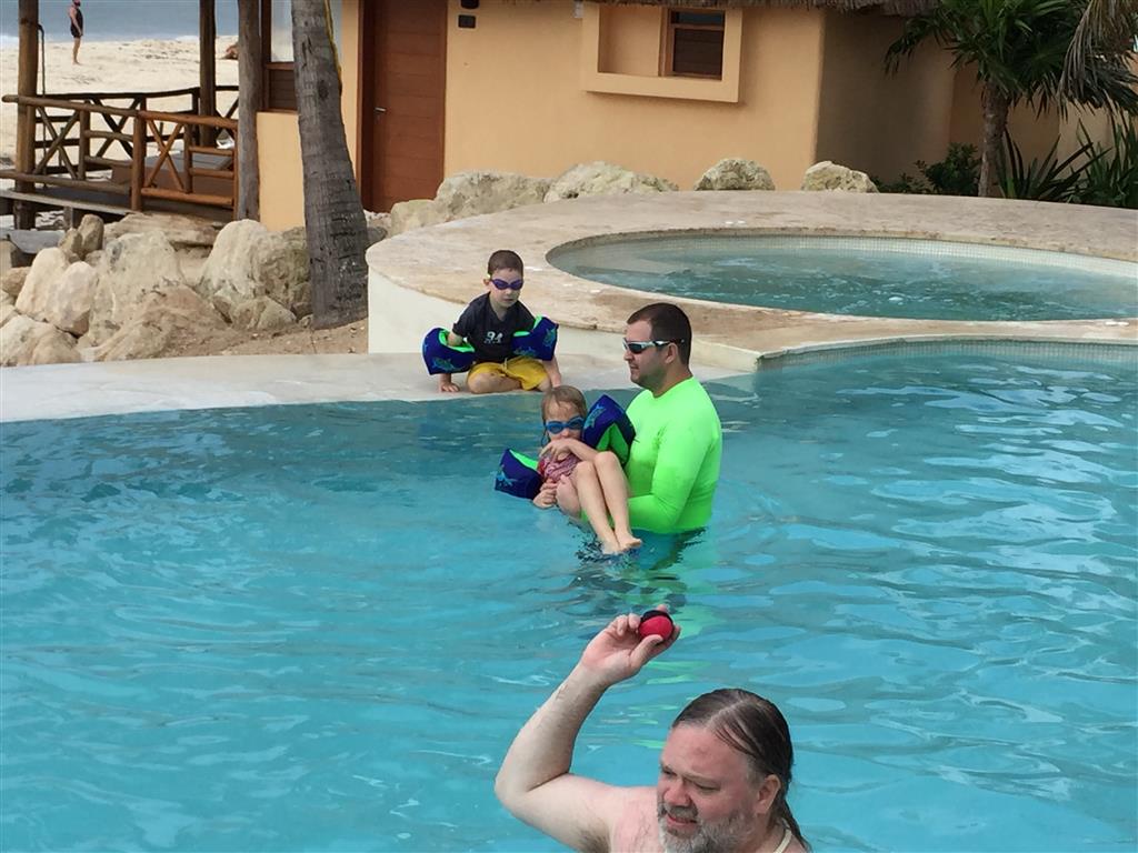 Last week Eleanor and Henry took a fun trip to attend Cousin Adam and Begonia’s wedding in sunny Mexico! We had a blast seeing so many family members there, especially getting to meet baby Simone for the first time! Eleanor and Henry really liked swimming in the pool, and Henry also enjoyed playing on the beach – although Eleanor wasn’t as excited about that. Unfortunately, Eleanor got a little sick for two days, which resulted in a lot of in the room time for her. Poor thing got sick right on her lunch plate, and then again at the dinner table. Of course, that was the one dinner that Dad was alone with the kids as Mom went to the bachelorette party. We had also chosen to leave the hotel and go to a pizza restaurant in town – but they were very nice and quickly boxed up our pizza to take back. The wedding was great fun – the kids sat at an all kids table complete with crafts – and then broke out the glow sticks for a super rave on the dance floor. Henry was especially excited about the crazy dancing, while Eleanor was very interested in helping baby Simone move her arms to the beat.