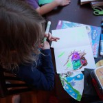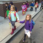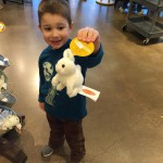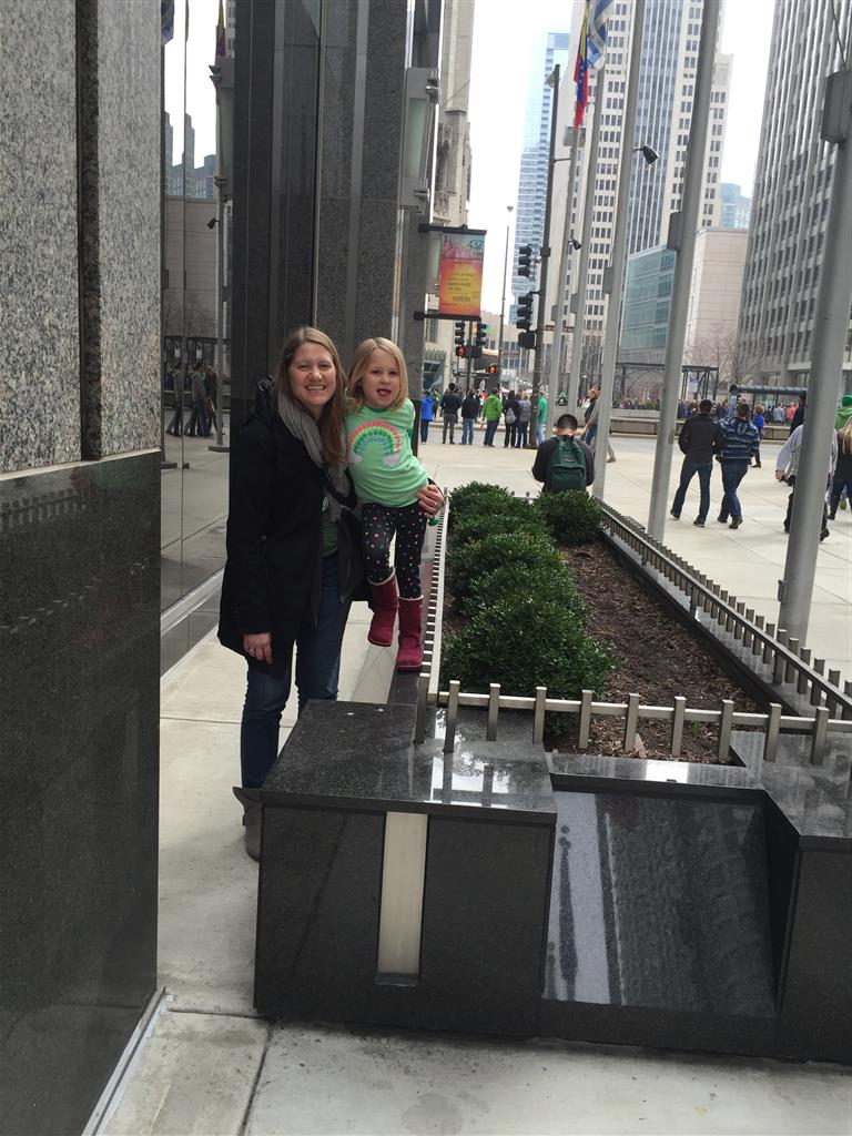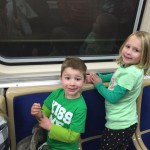 While we were downtown, Eleanor saw some people pushing giant carts full of St. Patrick’s Day trinkets for sale, and decided that she wanted to join in. She drew 8 pictures, mostly of rainbows, and then wanted to “Go out on the sidewalk and sell my art”. So, Dad took her out on the sidewalk and we gave away three pieces of art to passers by. Eleanor went up to each one and asked them if they wanted her art – at which point Dad had to explain that they were free St. Patrick’s Day pictures. It was a bit awkward for Dad, but super exciting to see Eleanor so excited about it, and talking so freely to strangers!