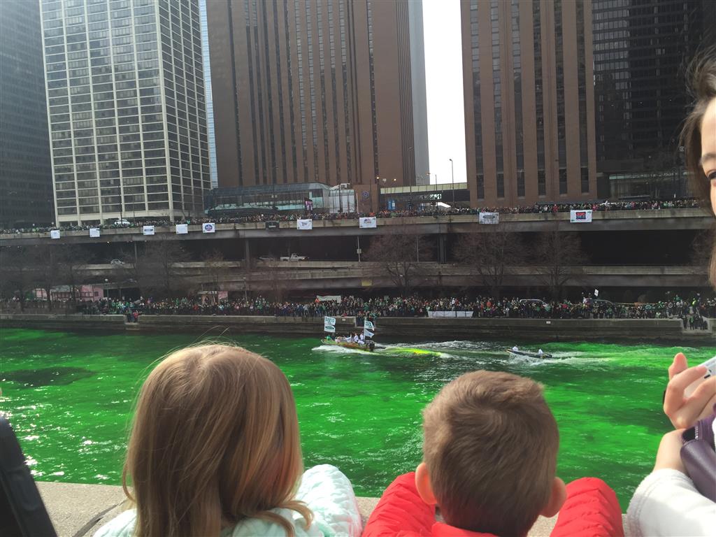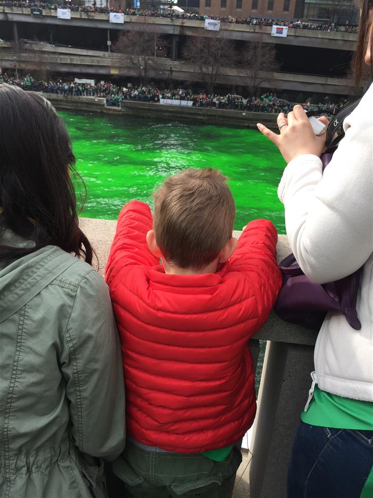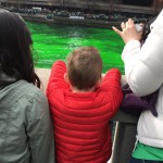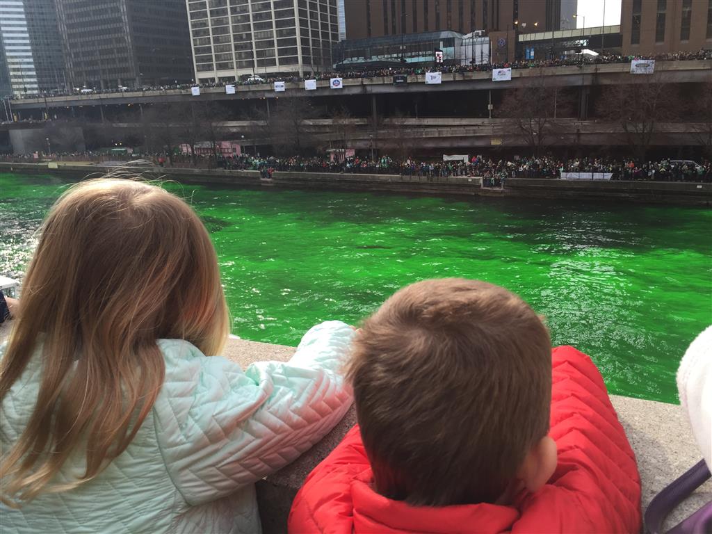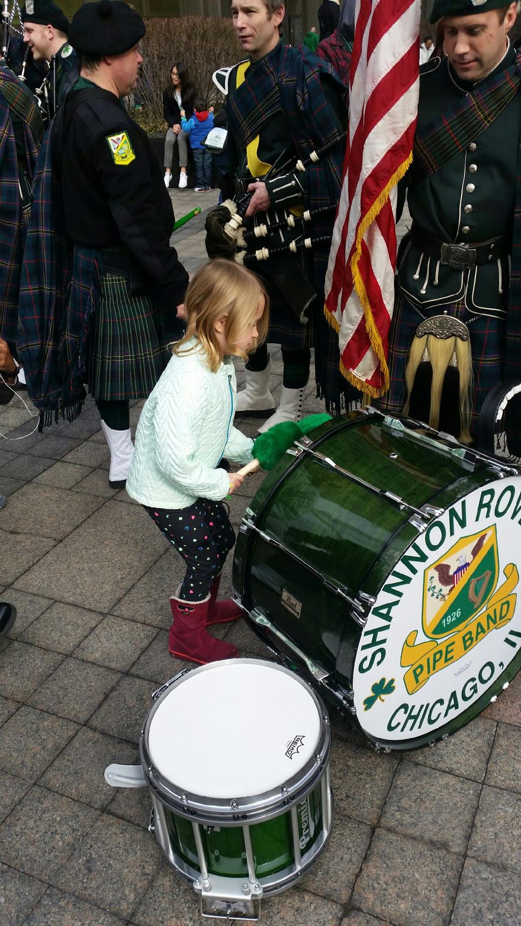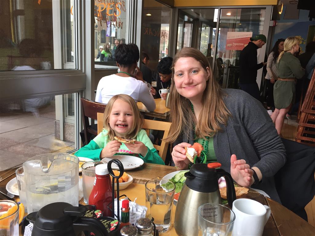 Eleanor and Henry celebrated St. Patrick’s Day this week by going downtown for the annual river dyeing. Henry was really excited to go again, but Eleanor wasn’t as excited. Turns out, she likes seeing the river green, but doesn’t like “all the waiting”. Fair enough. We had very nice weather for the morning, and were able to work our way up to the front row in time to see the actual dyeing. Eleanor also got to play the base drum for the Irish band that was playing nearby! This year was a little earlier than normal, so we decided to do breakfast after instead of before, which worked out nicely.