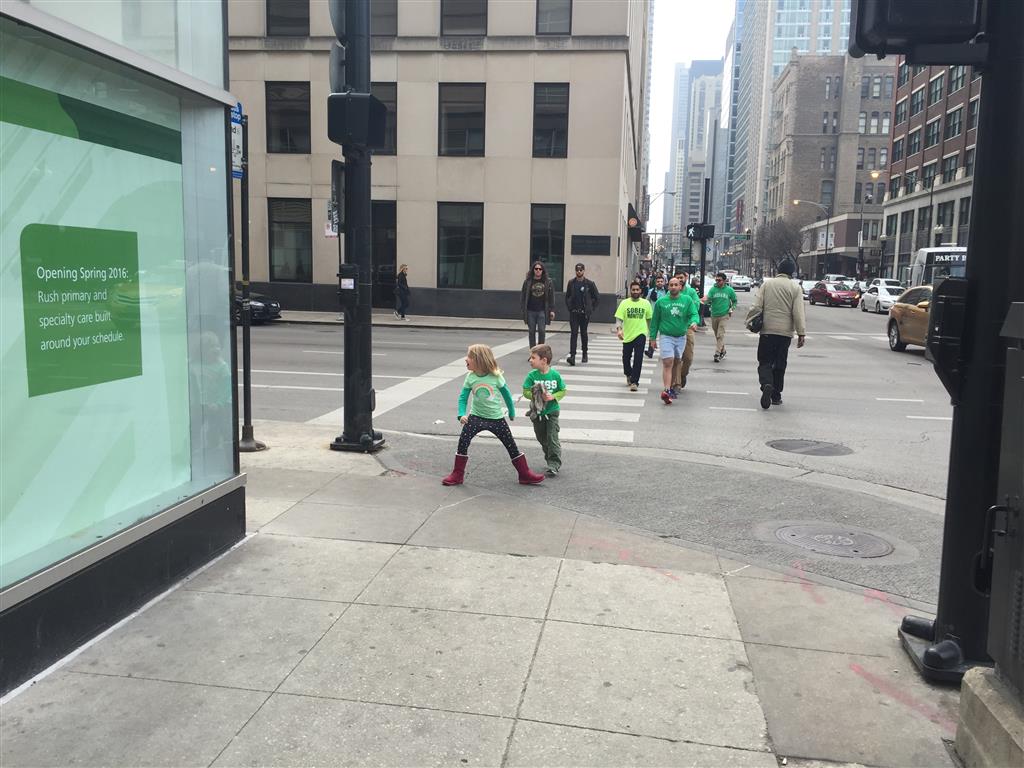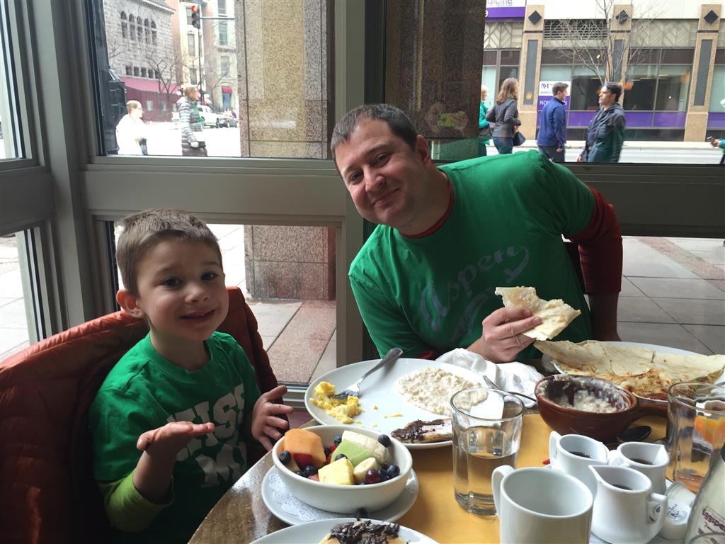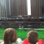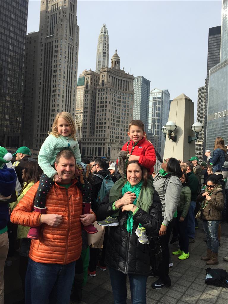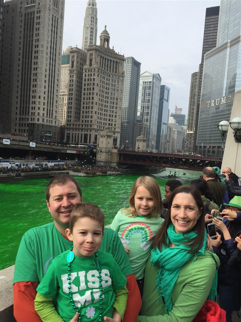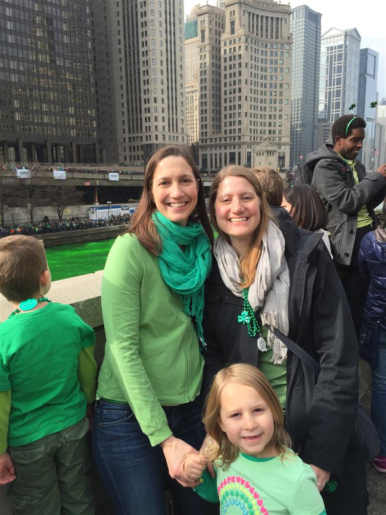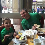 Eleanor and Henry celebrated St. Patrick’s Day this week by going downtown for the annual river dyeing. Henry was really excited to go again, but Eleanor wasn’t as excited. Turns out, she likes seeing the river green, but doesn’t like “all the waiting”. Fair enough. We had very nice weather for the morning, and were able to work our way up to the front row in time to see the actual dyeing. Eleanor also got to play the base drum for the Irish band that was playing nearby! This year was a little earlier than normal, so we decided to do breakfast after instead of before, which worked out nicely.