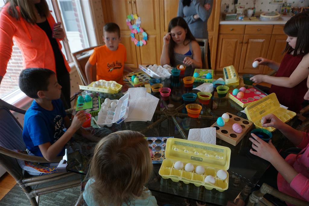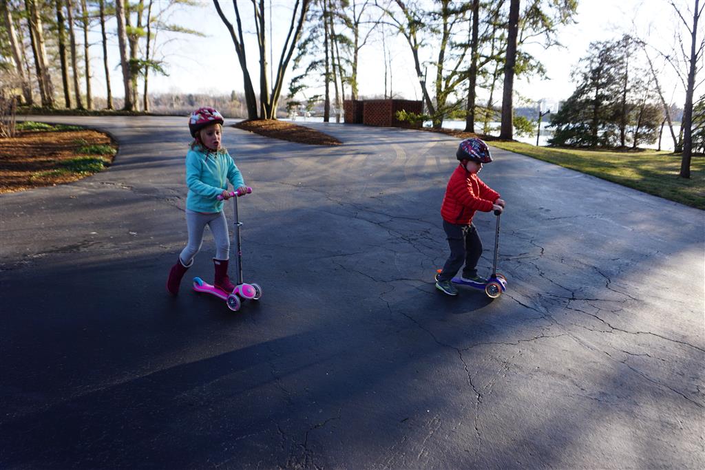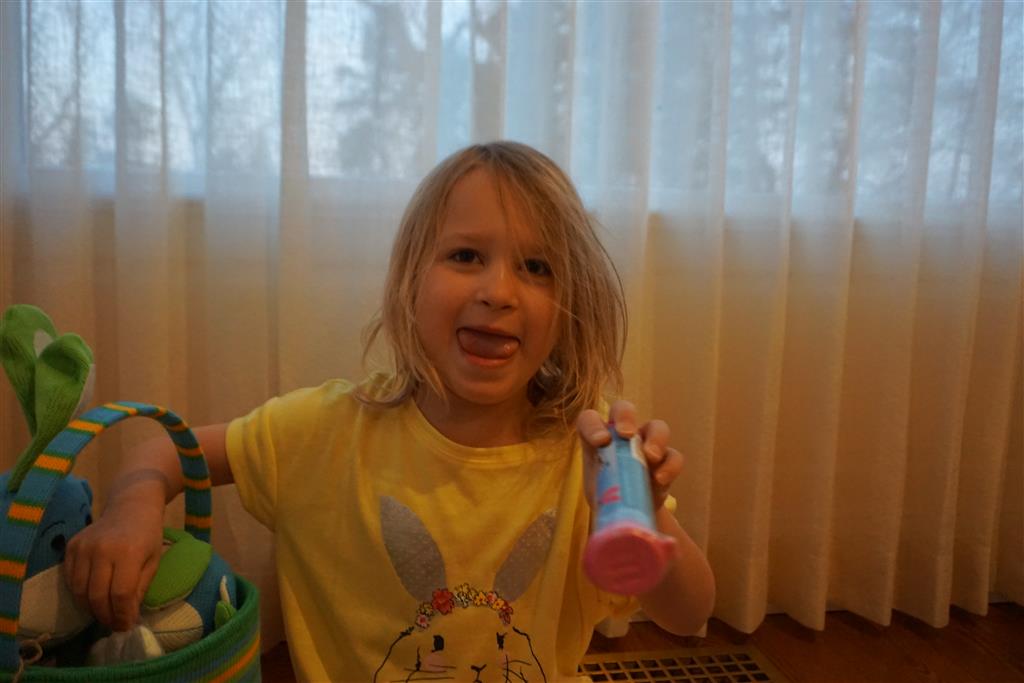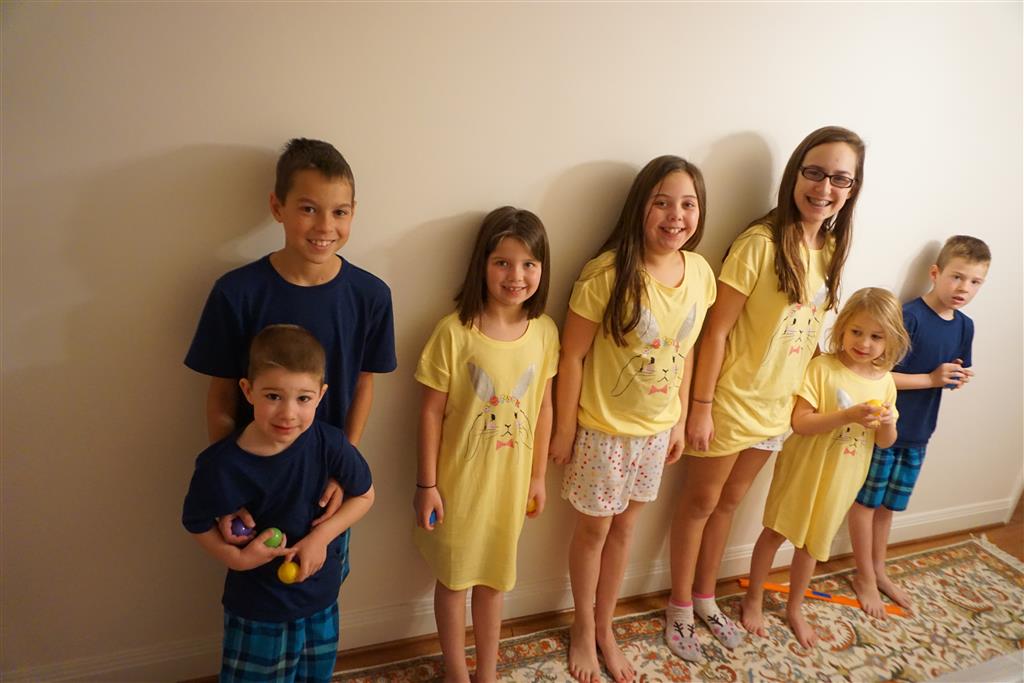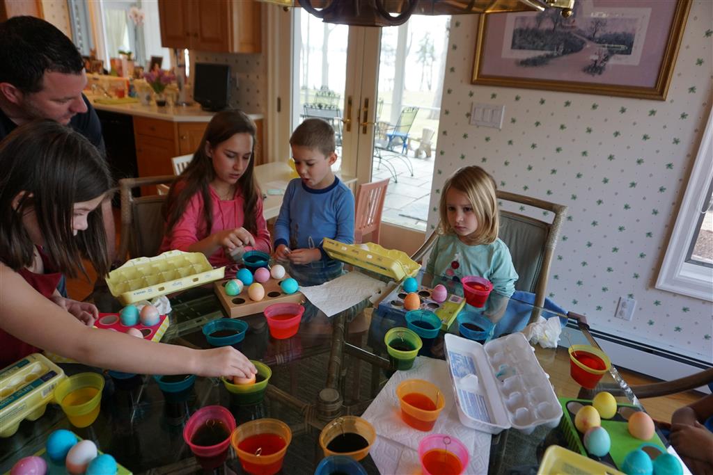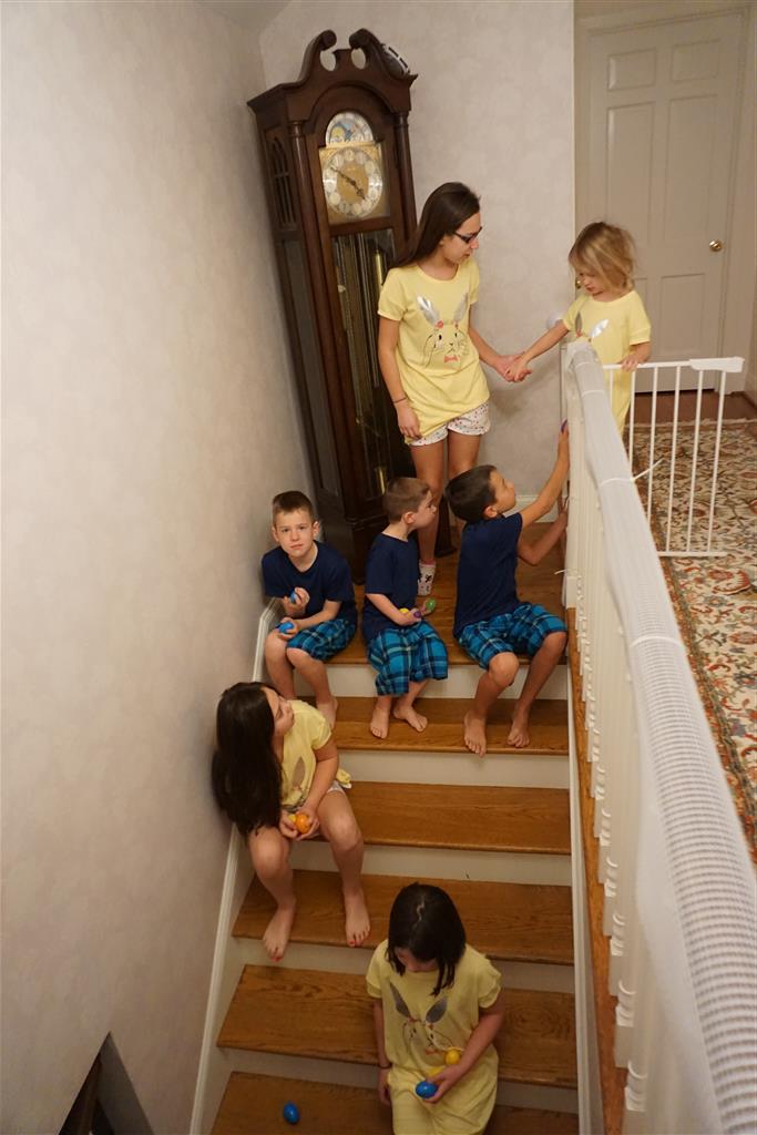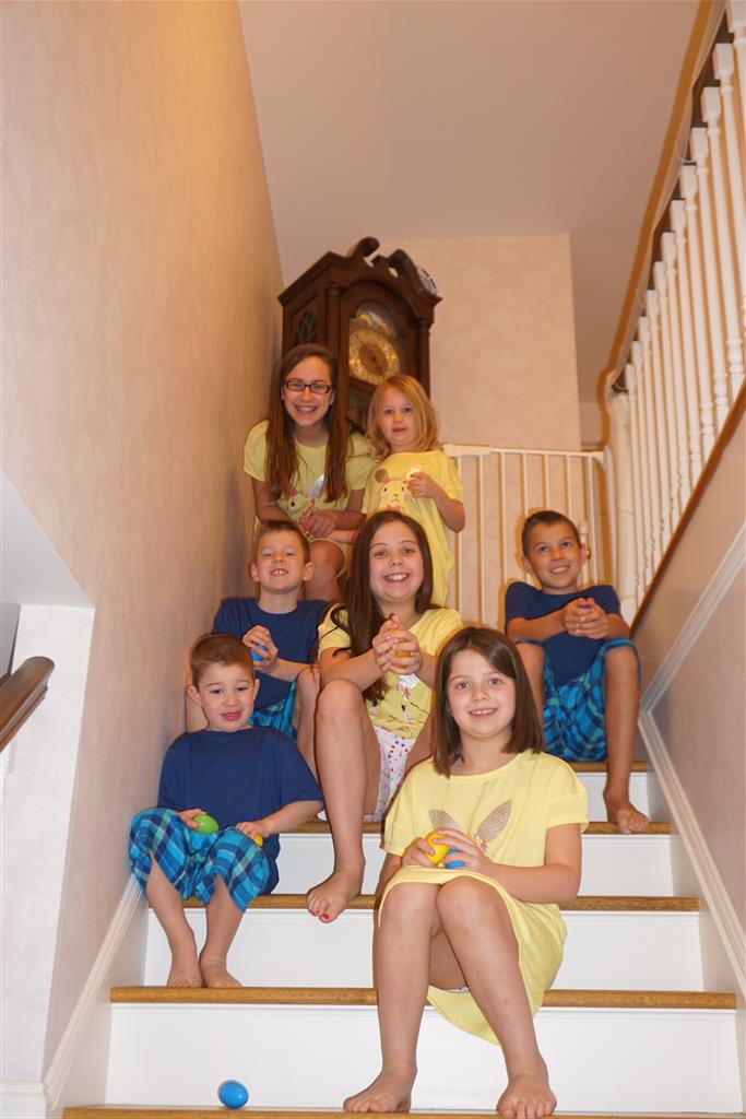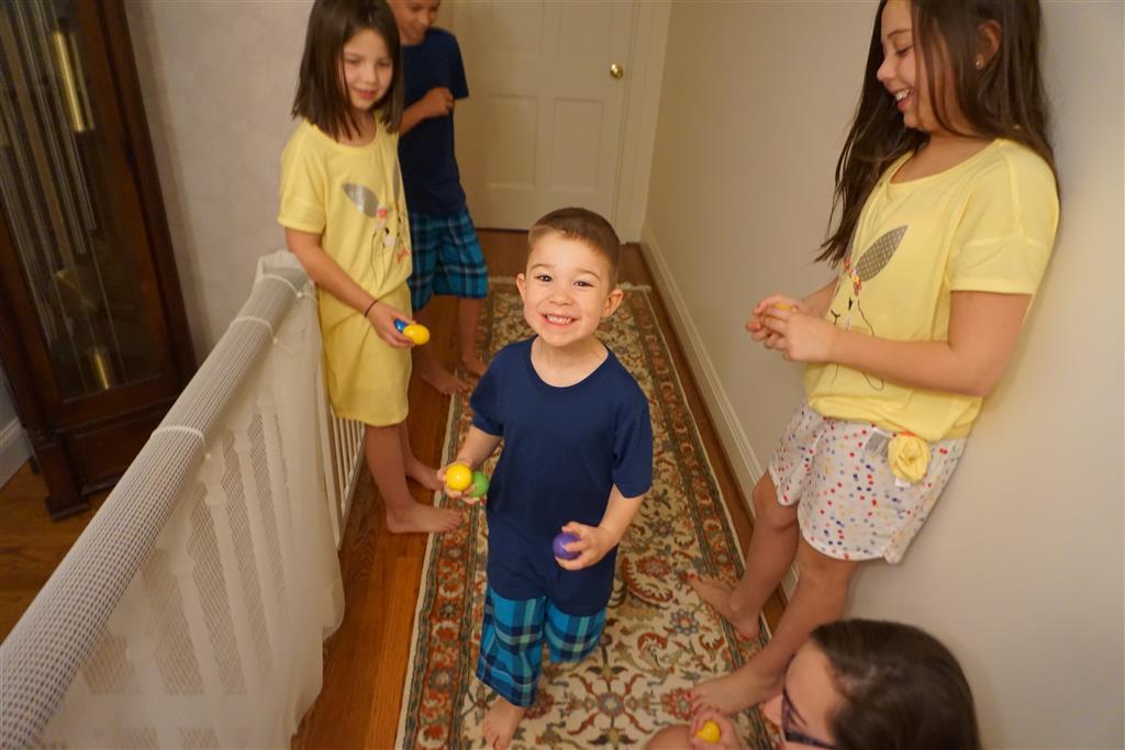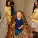 Eleanor and Henry had a blast visiting Grandma and Grandpa’s house for Easter. Cousins Mackenzie, Jack, Ben, Mahlia and Brooke all came as well to make it a fun full house. We had lots of fun doing crafts and dying Easter eggs, as well as launching some rockets and riding various wheeled machines up and down the driveway. We had just gotten a second scooter so that Eleanor and Henry could both ride at the same time, and it turned out to be perfect timing. Henry took off just as Dad finished putting his helmet on and went, in Dad’s opinion, way too fast down the first section of driveway. Stopping to Dad’s “Slow Down Henry!” calls, he looked back like “what’s wrong?” and from that point on Henry was a fearless speed demon on the scooter. He routinely was the fastest one down the hill and would even peddle with one foot down the hill to go faster. Both kids really improved their scooter skills in just a few days of riding. It was really fun to see all the cousin bonding that went on – on the last night, Easter Eve if you will, Eleanor did a sleepover with Mackenzie, Mahlia and Brooke, and Henry did a sleepover with Jack and Ben. There wasn’t a lot of actual sleeping, but boy did they have fun!