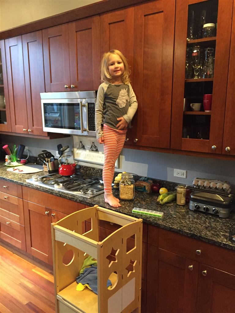 Eleanor also had her first swimming class at the next level – where they have a double wide land and pretty much swim constantly back and forth for the whole lesson. She nailed the “dolphin kick” on her first try, and also started to learn some underwater strokes. In another first for Eleanor, on Monday she woke up before Mom and Dad, got dressed, and went down stairs and started making breakfast. Mom went downstairs and found her standing on the counter getting down the jar of oats. Ha!
